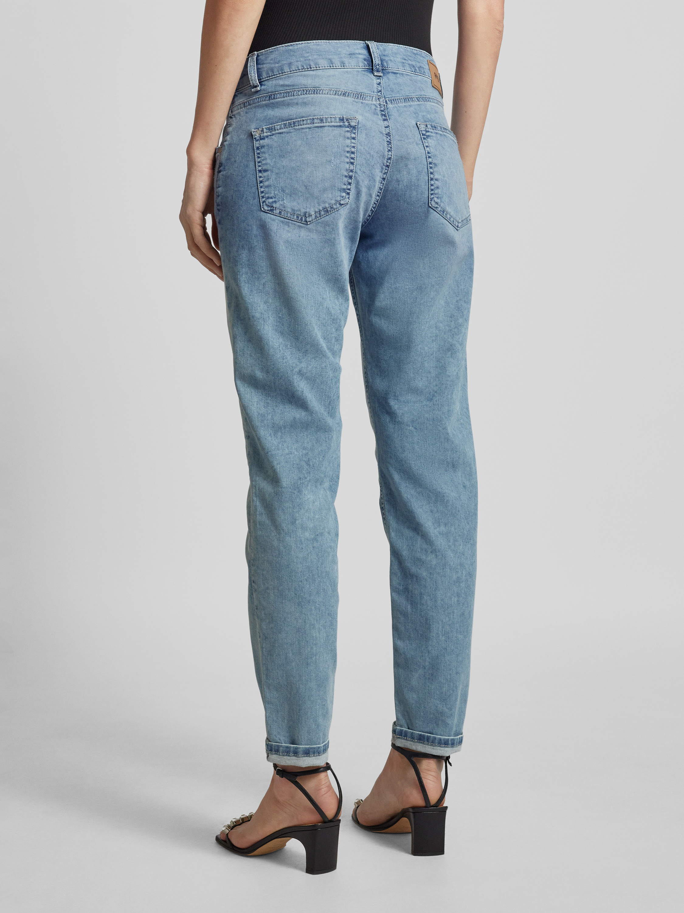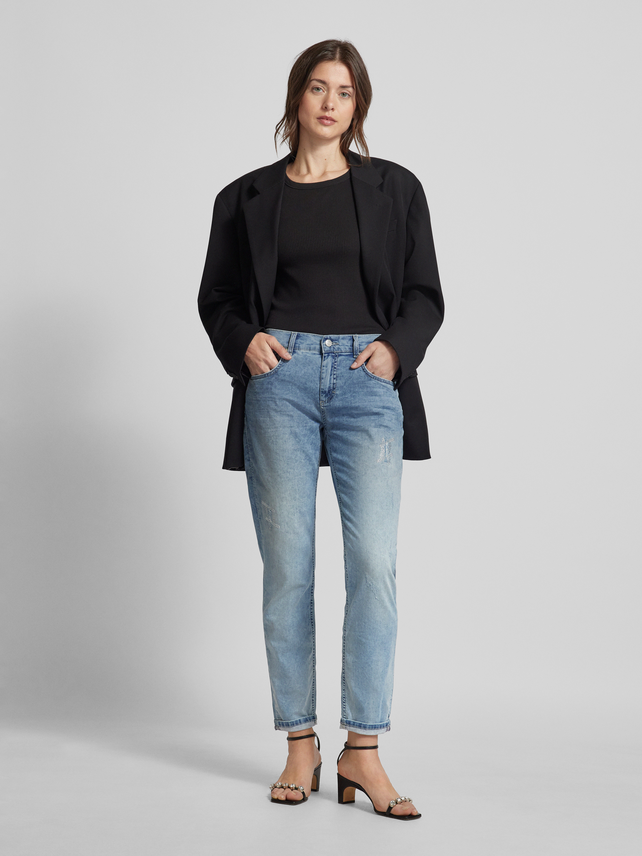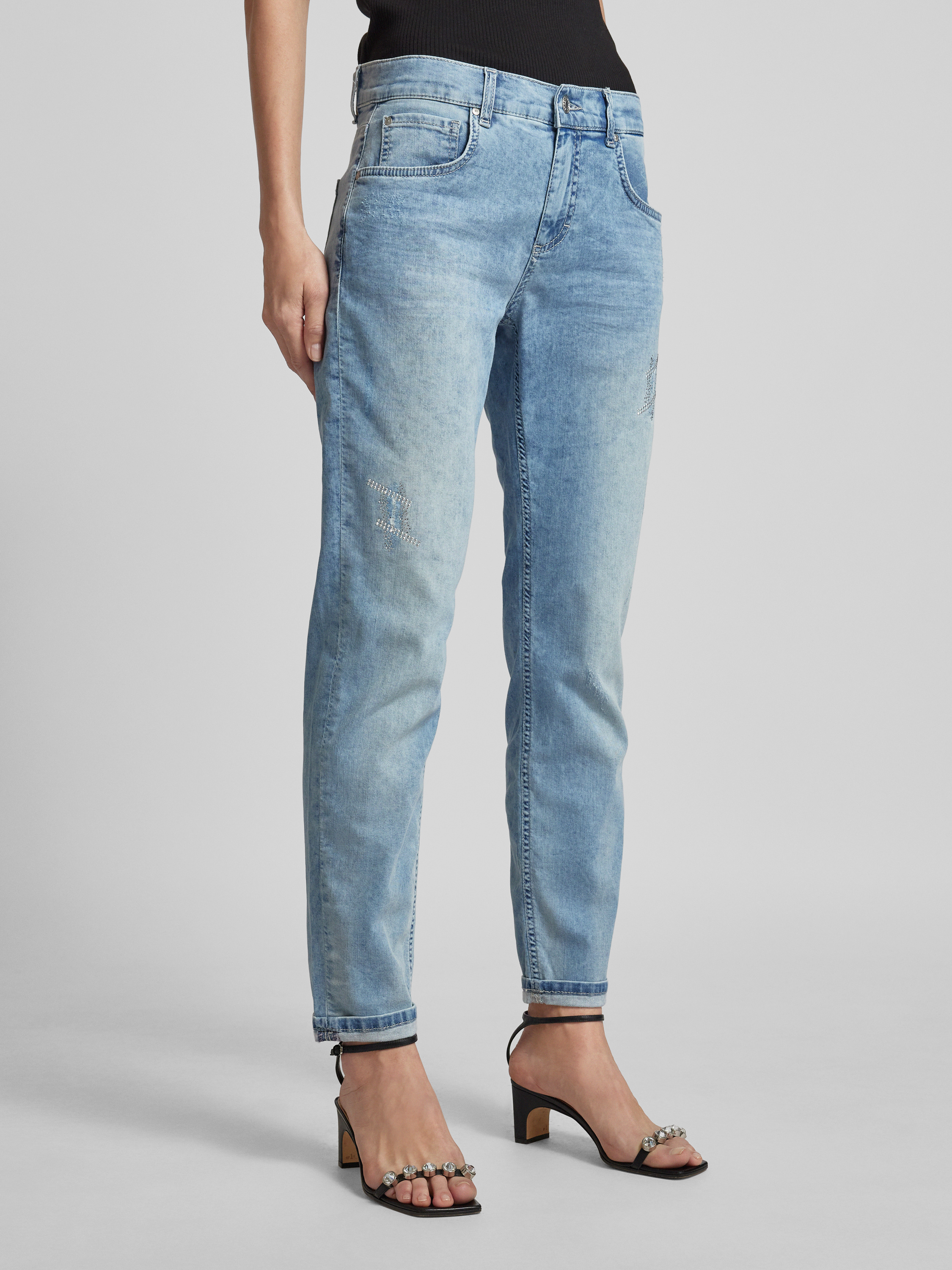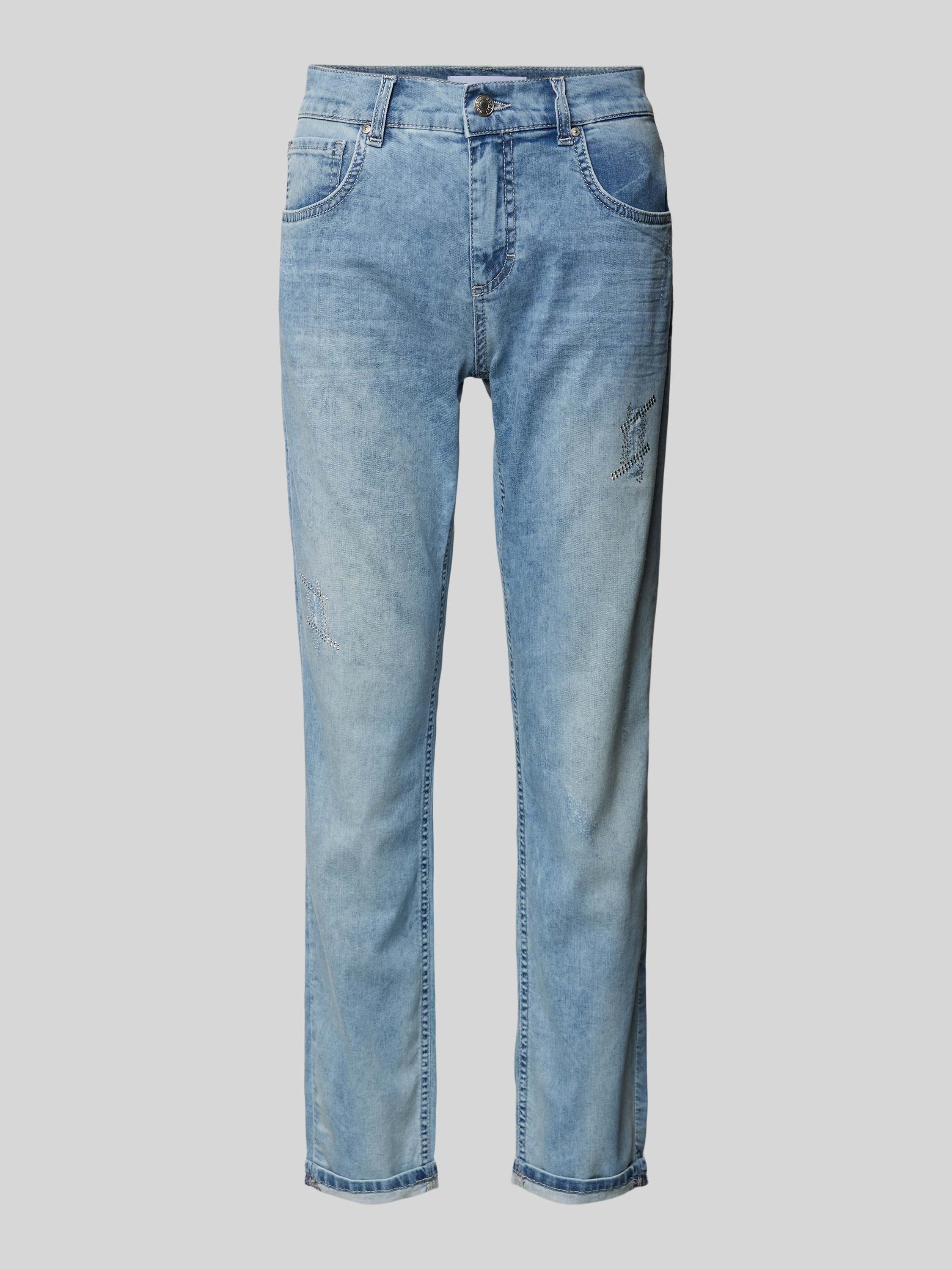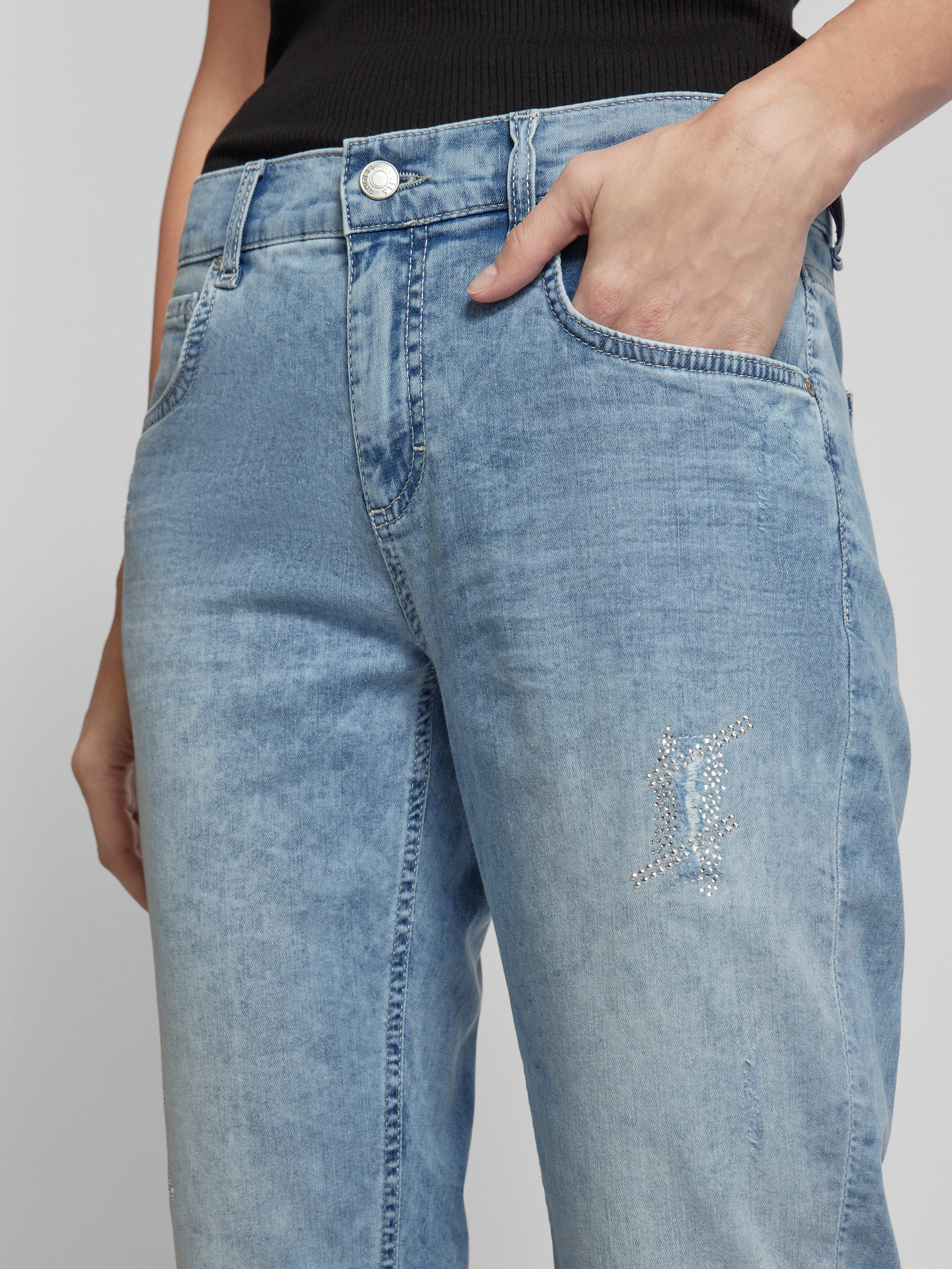 Jeansy o kroju mom z przetarciami i obszyciem ozdobnymi kamieniami - jasnoniebieski