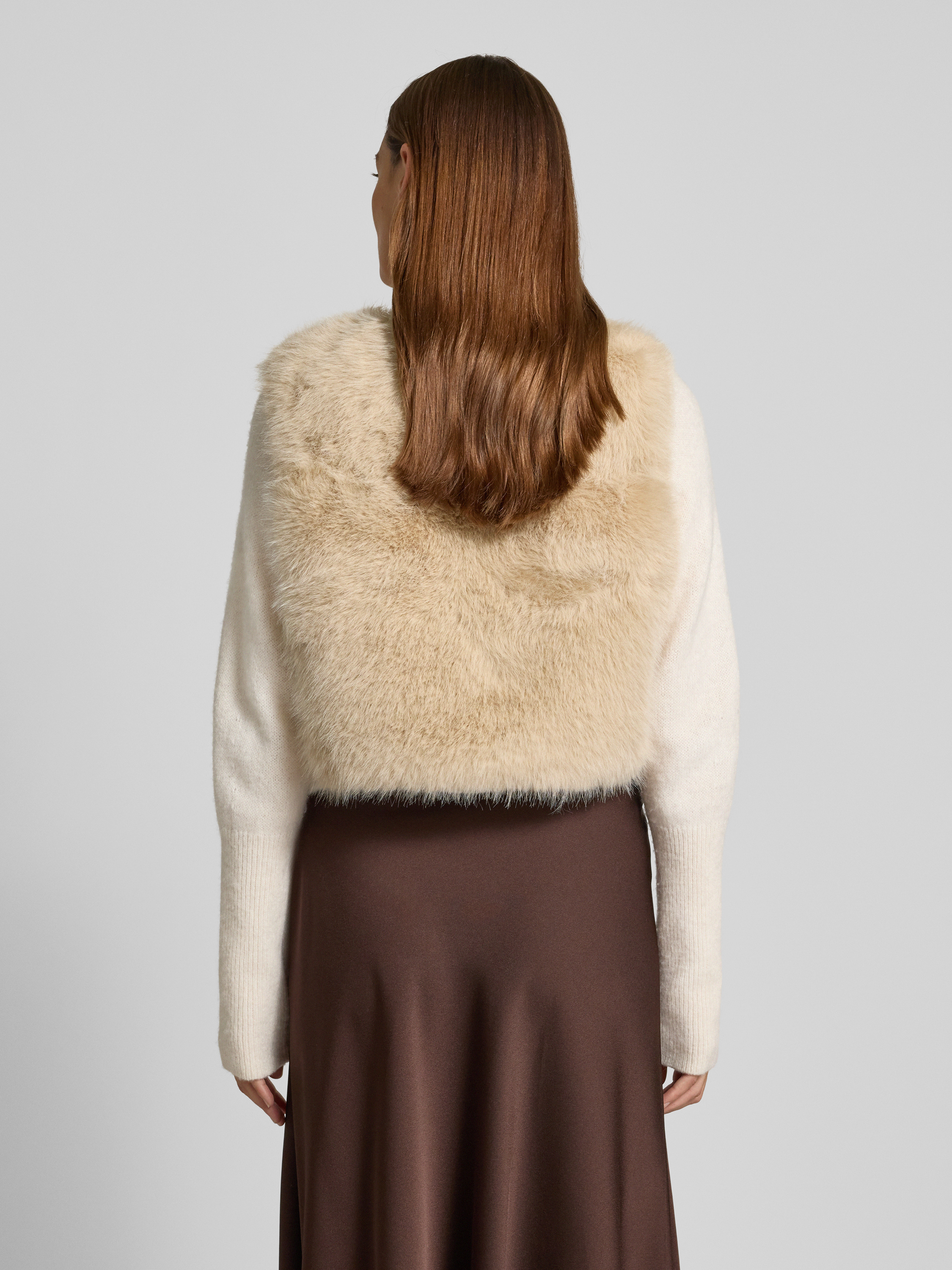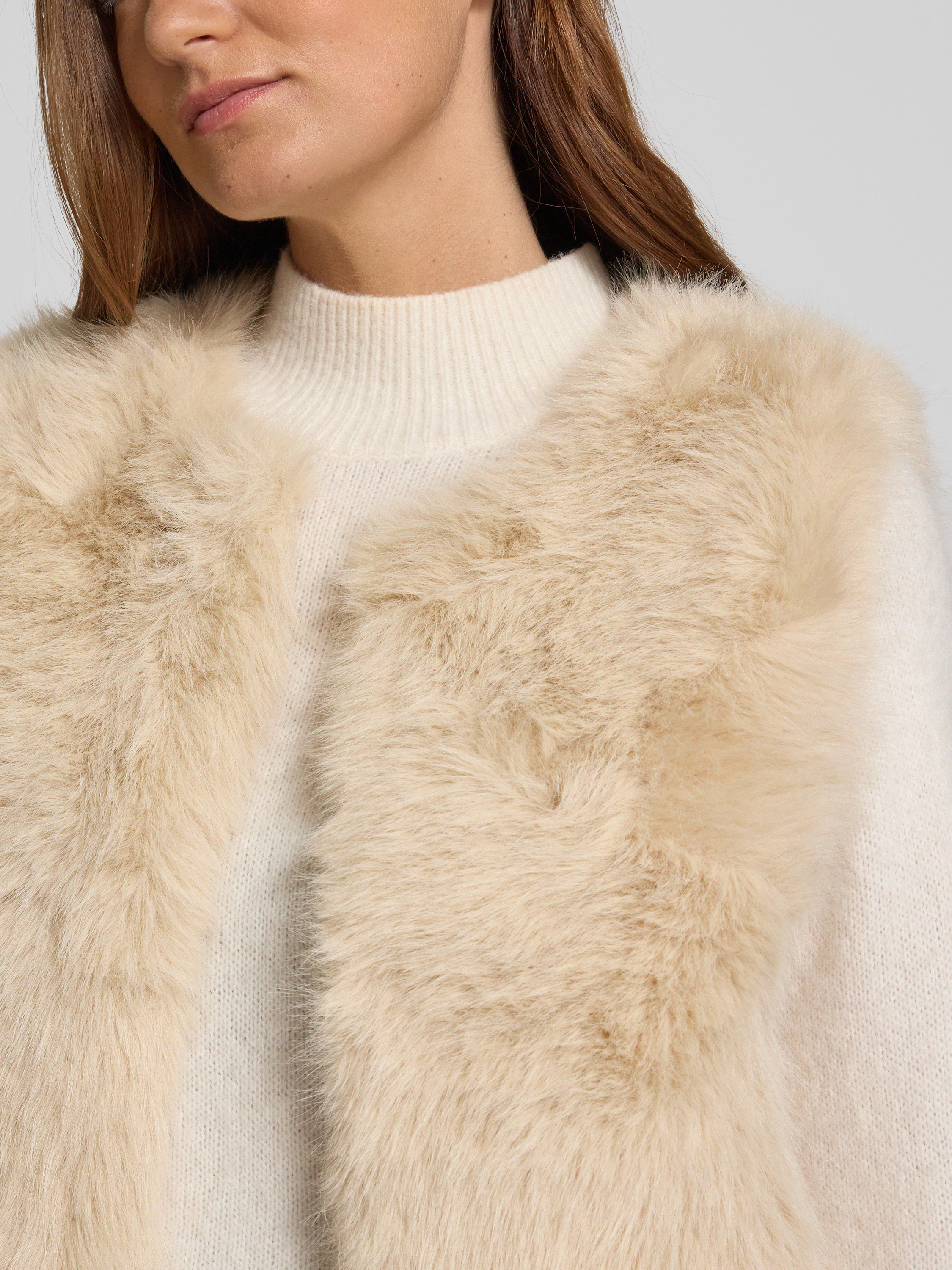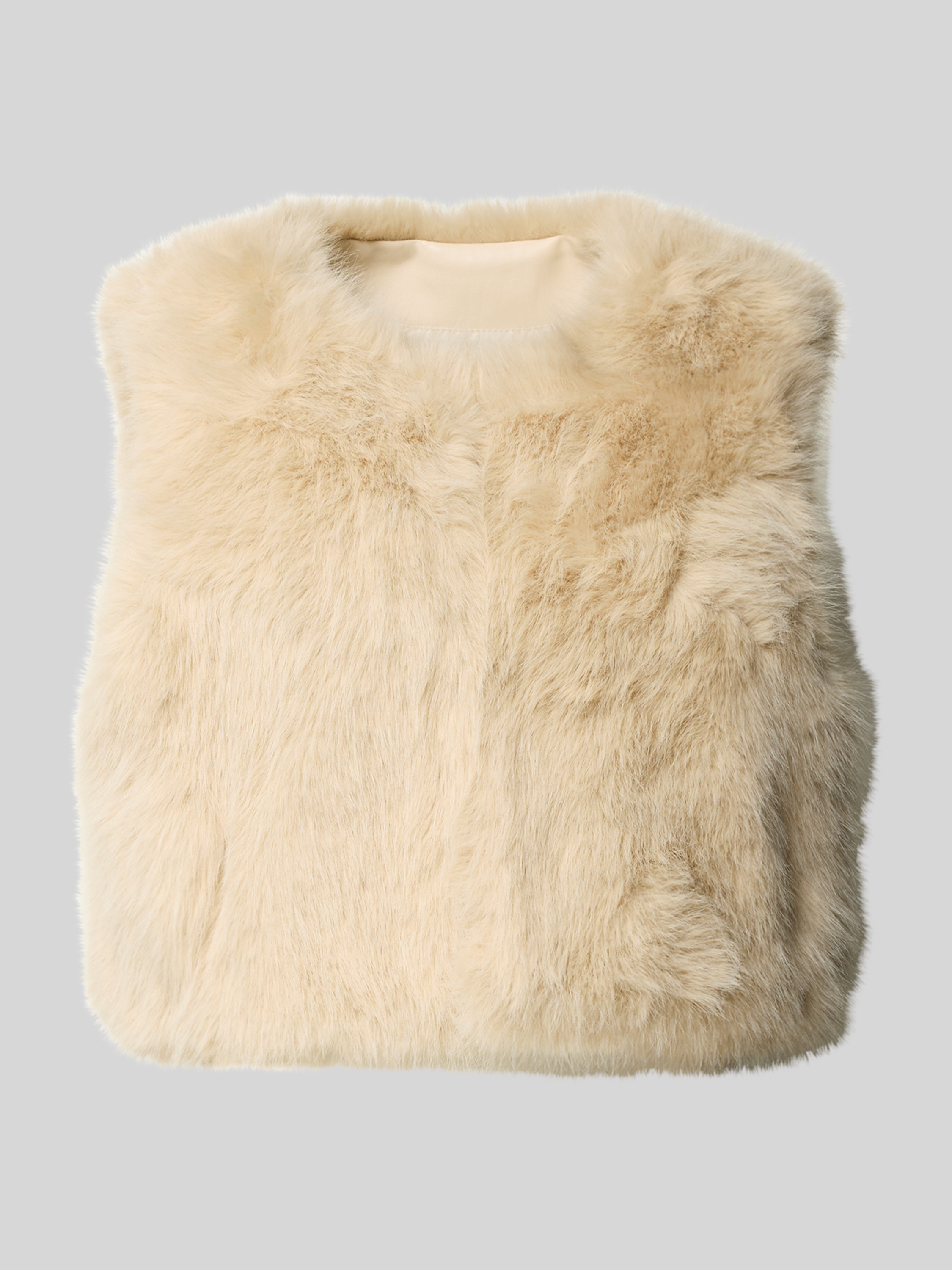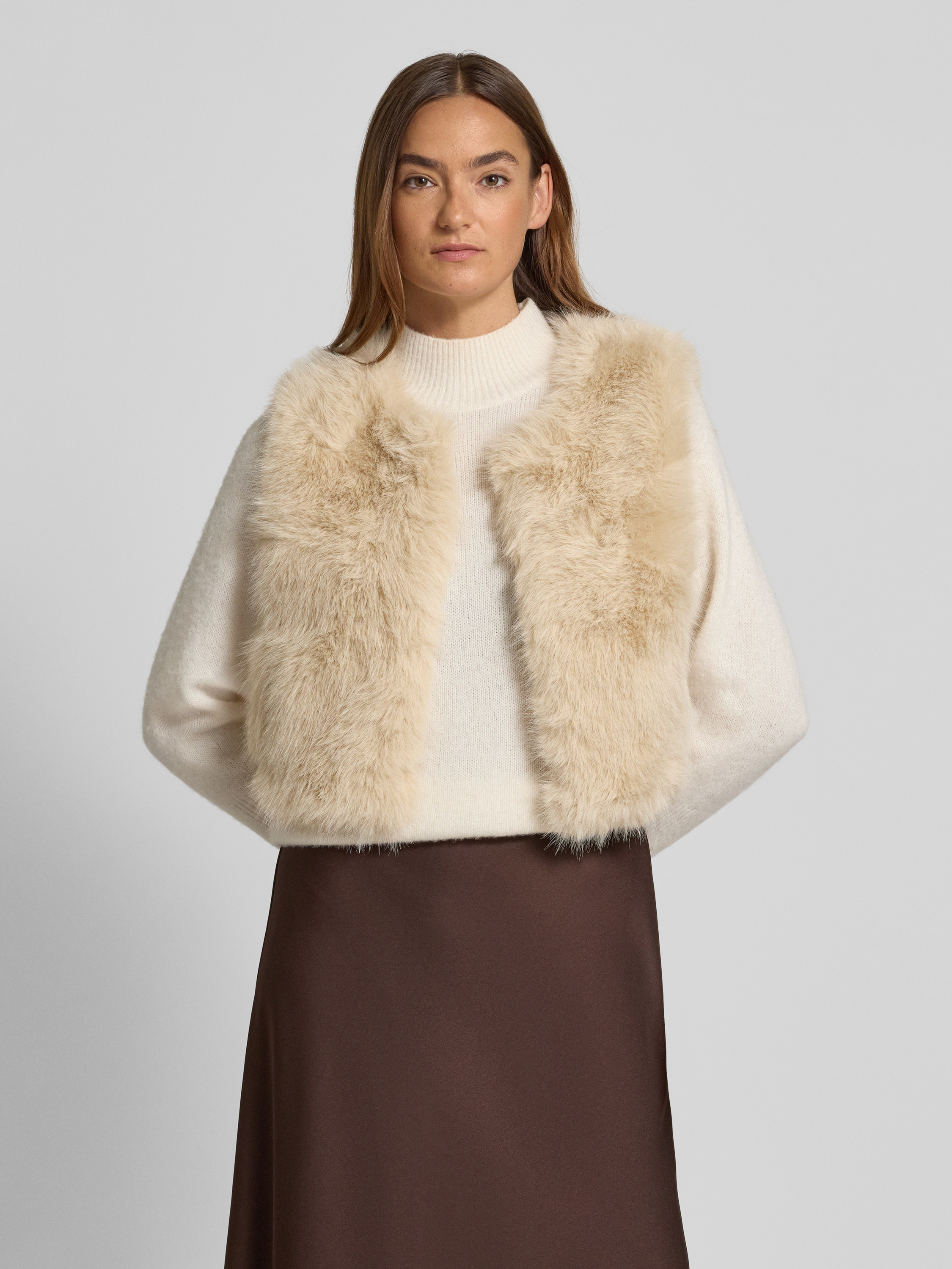 Kamizelka krótka ze sztucznego futra z okrągłym dekoltem - piaskowy