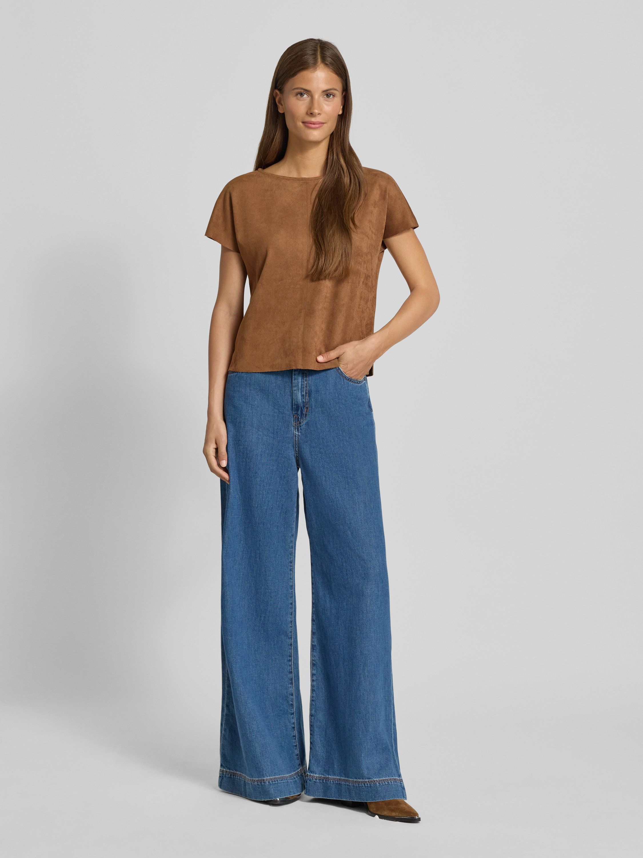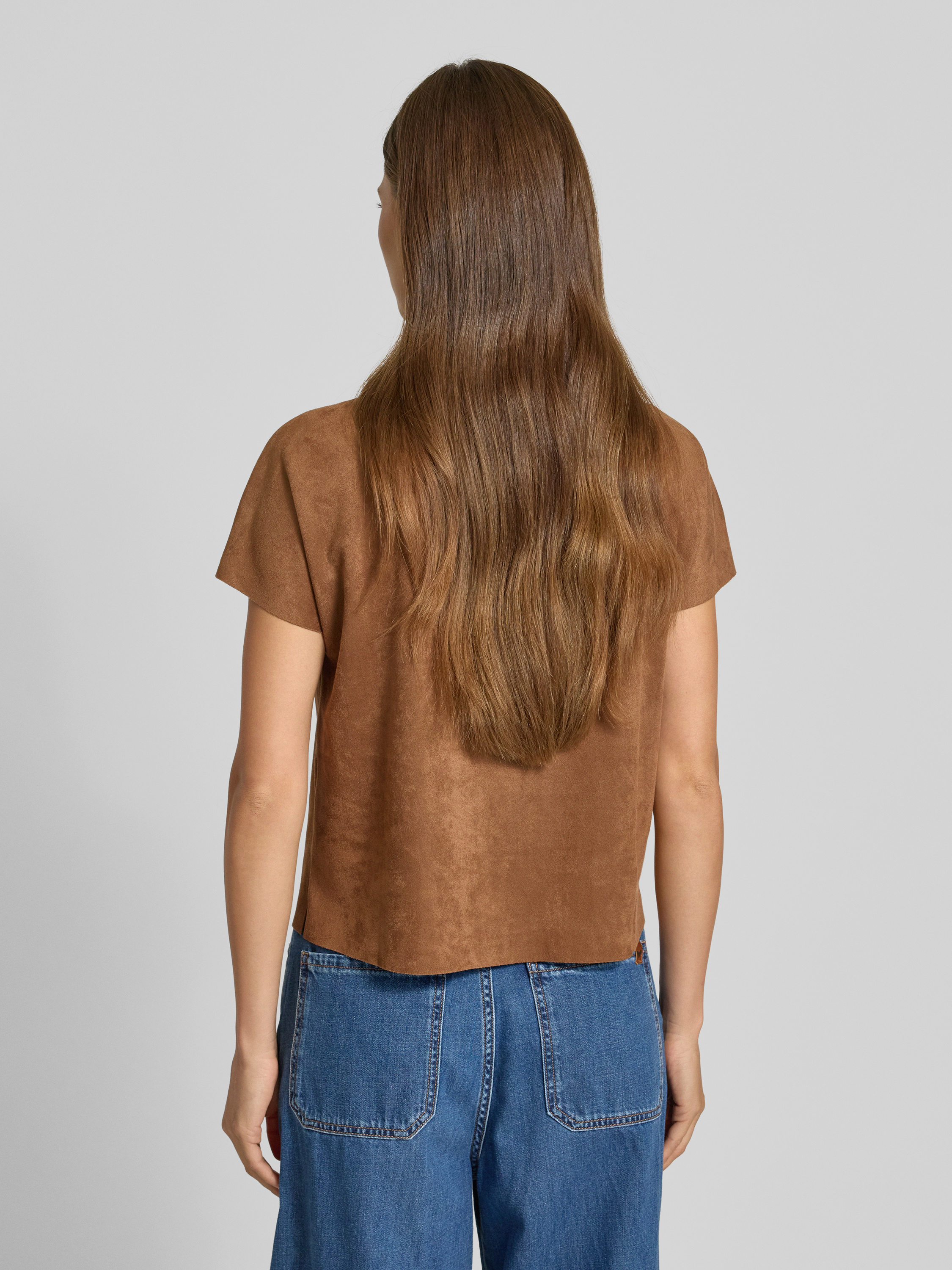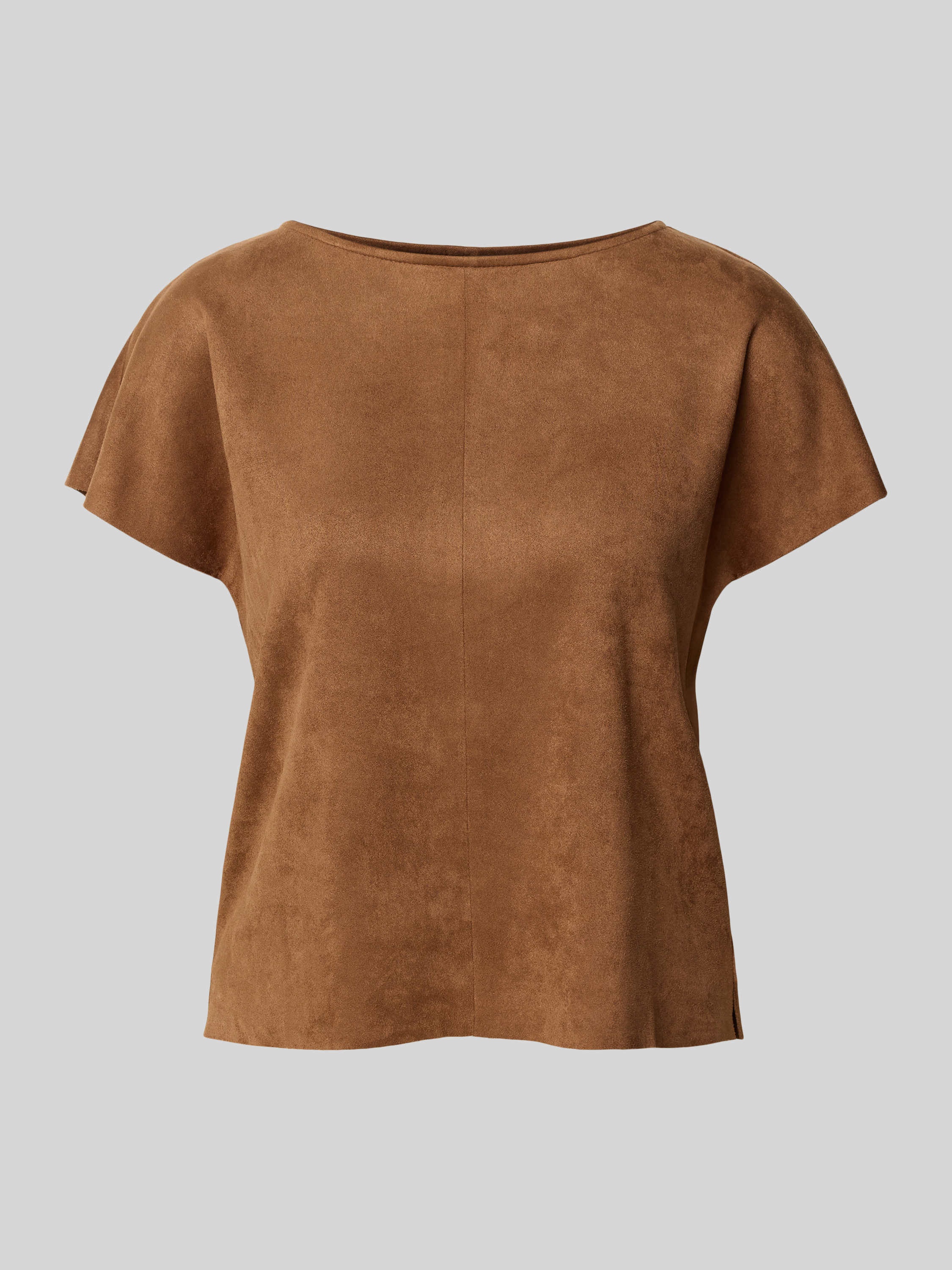 T-shirt z imitacji skóry z okrągłym dekoltem - koniakowy