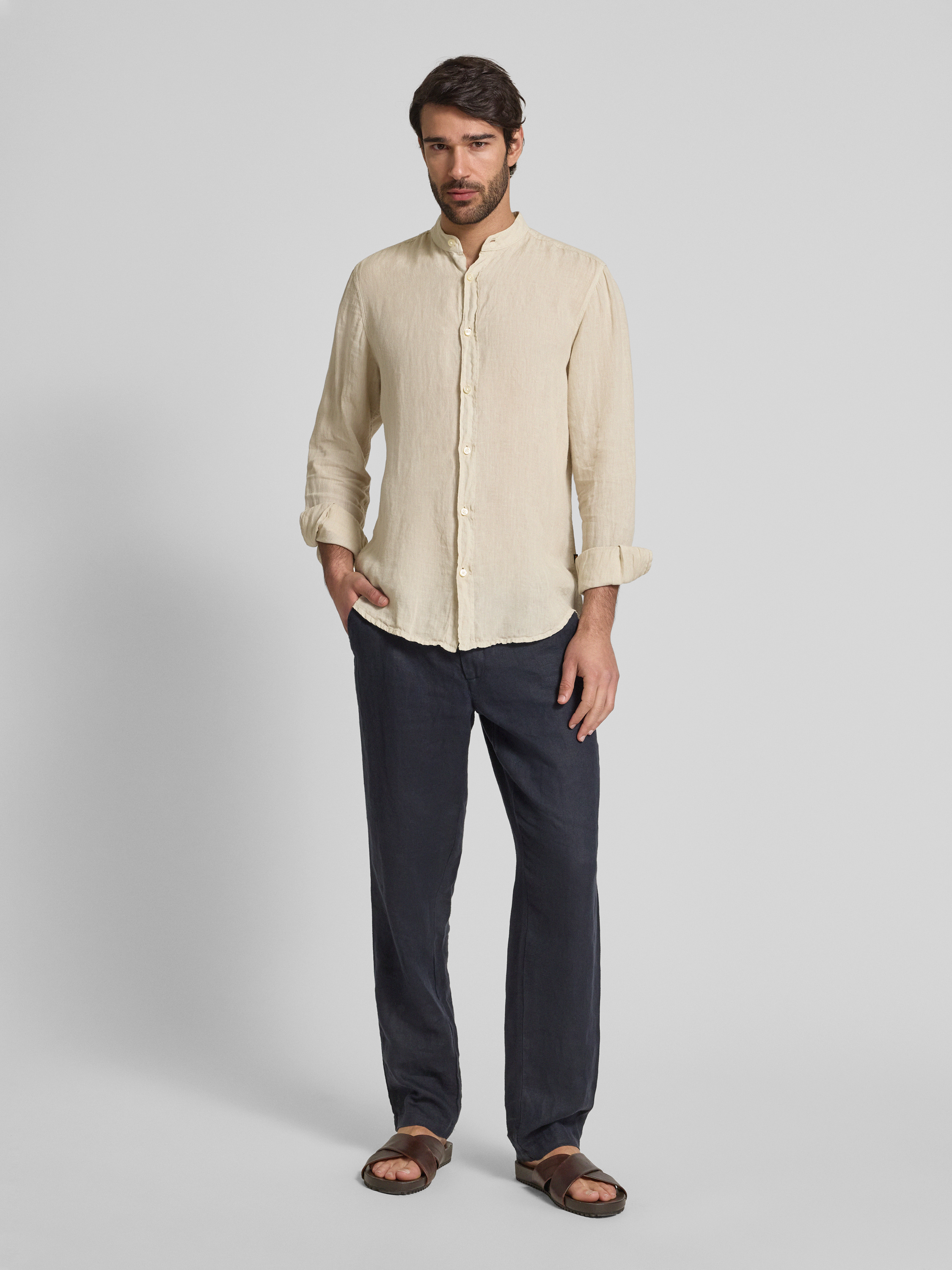 Koszula lniana o kroju regular fit ze stójką model ‘Race’ - piaskowy