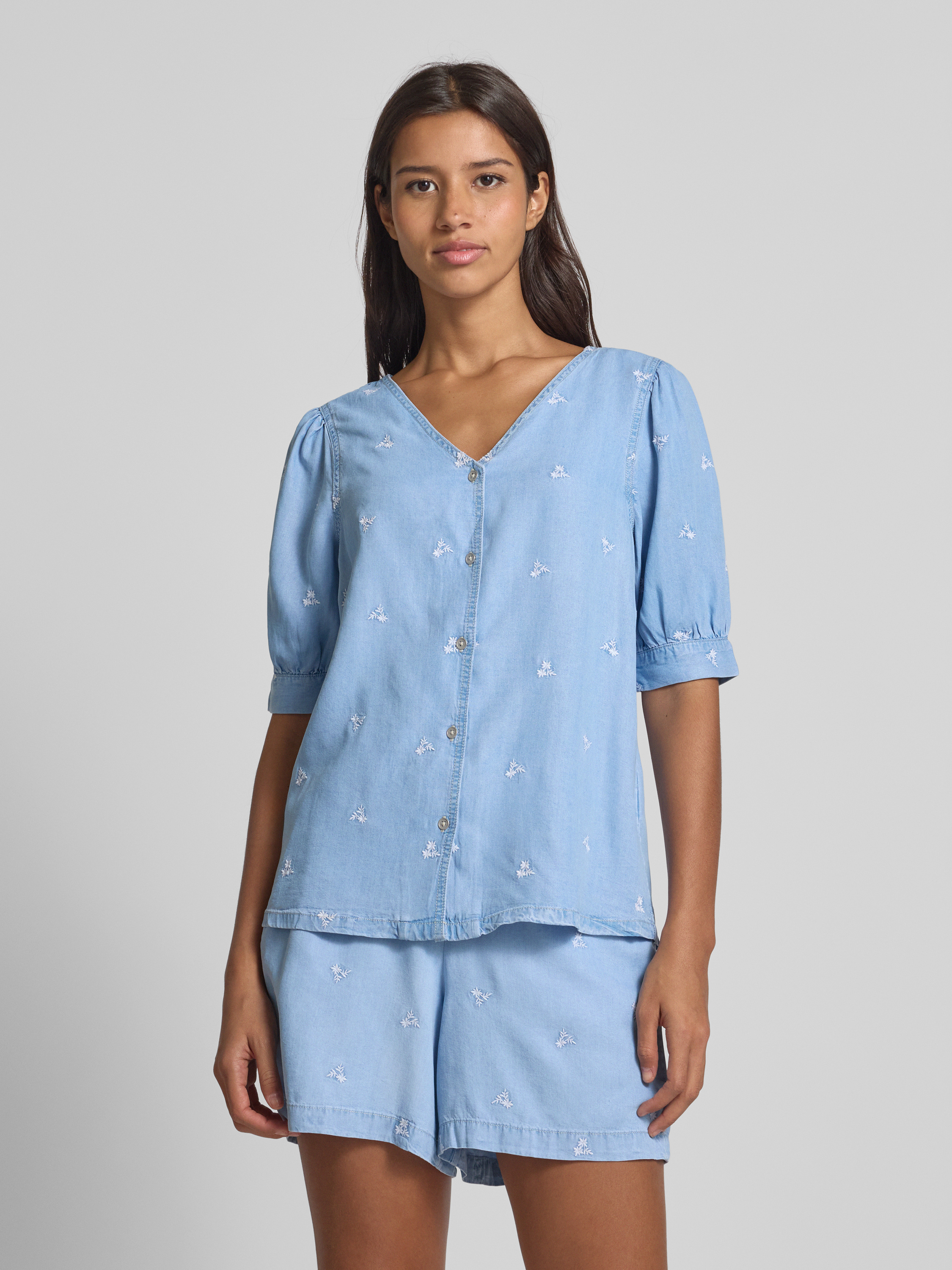 Bluzka jeansowa o kroju regular fit z dekoltem w serek model ‘KOSMO’ - niebieski