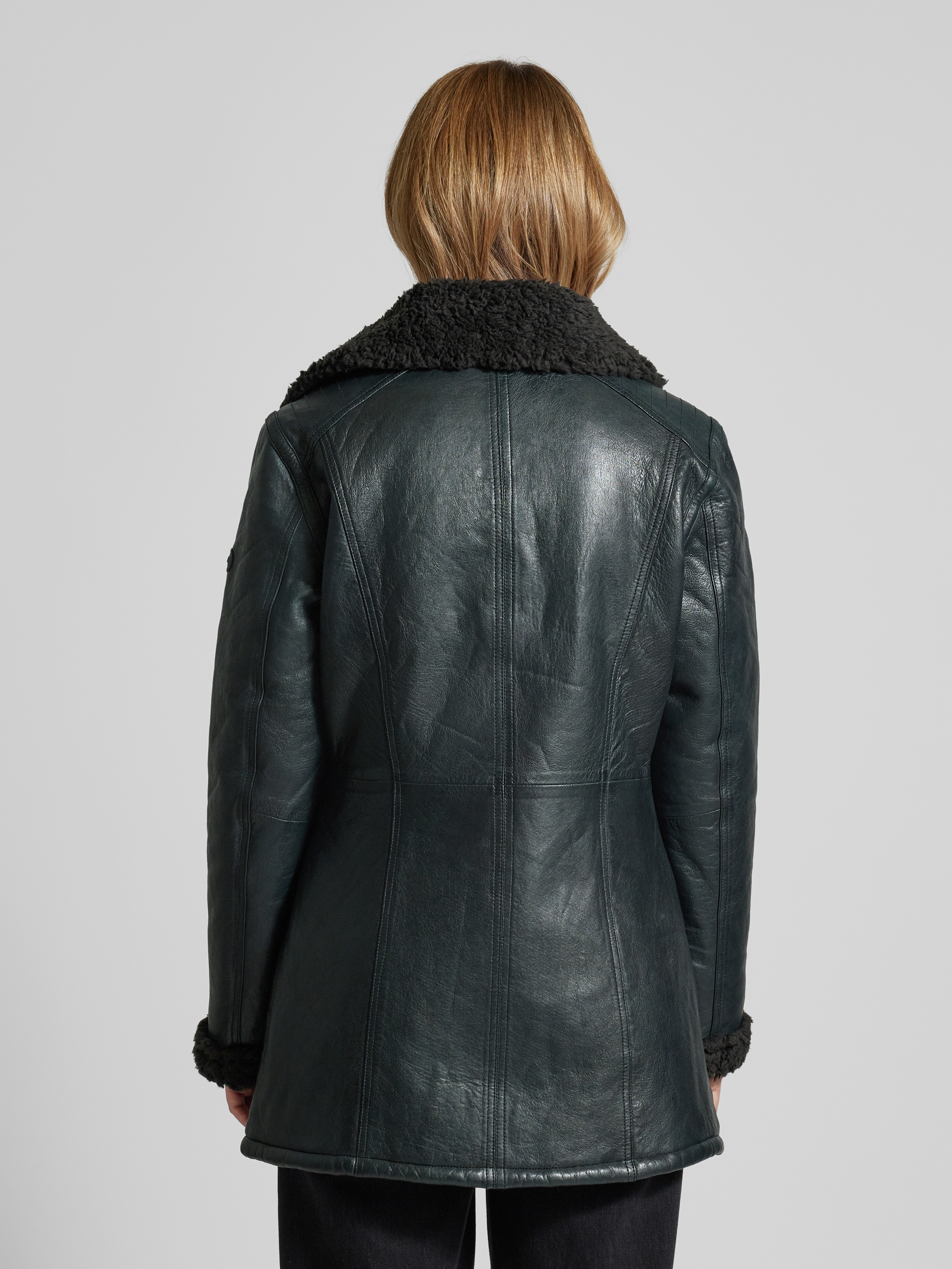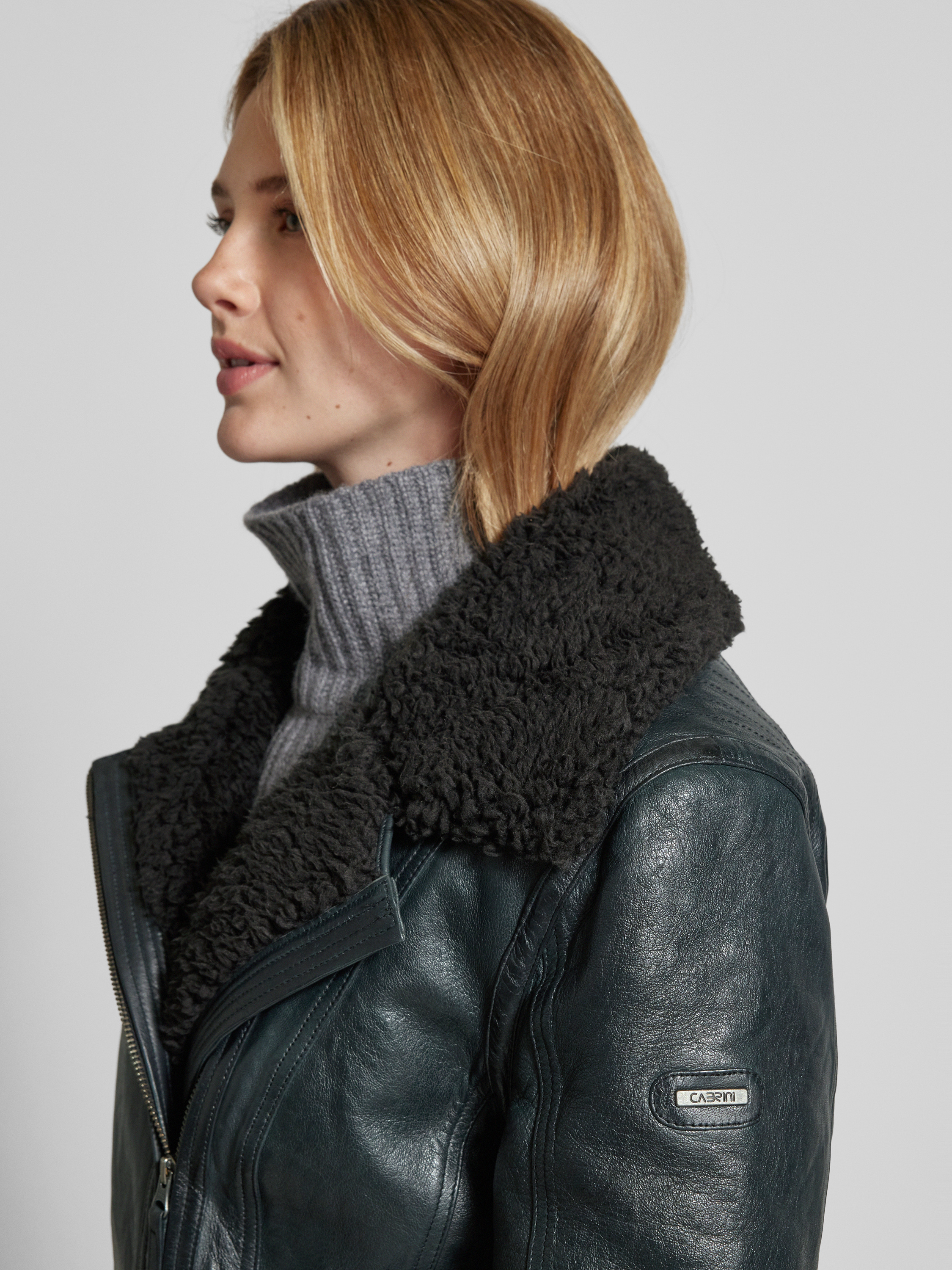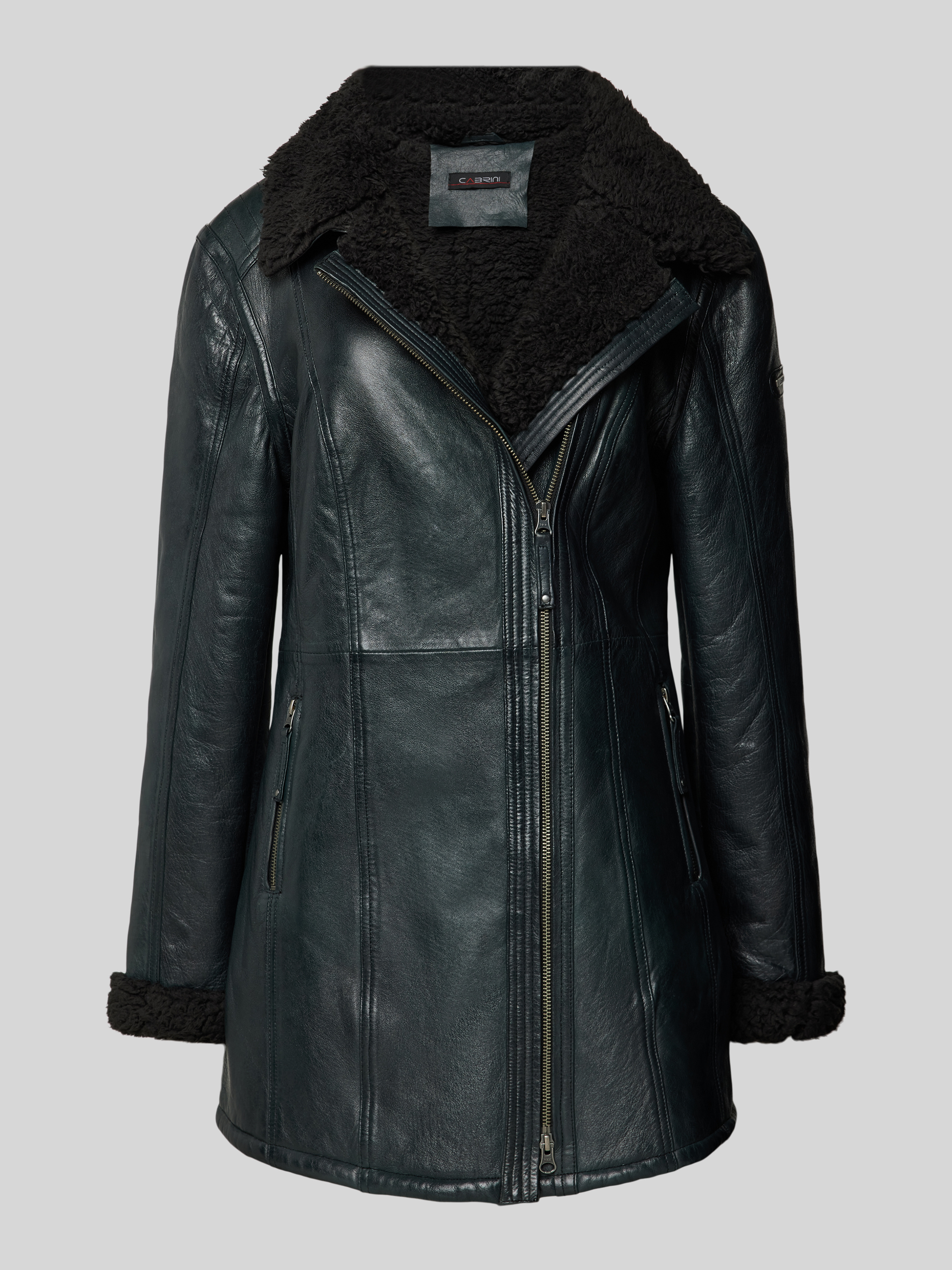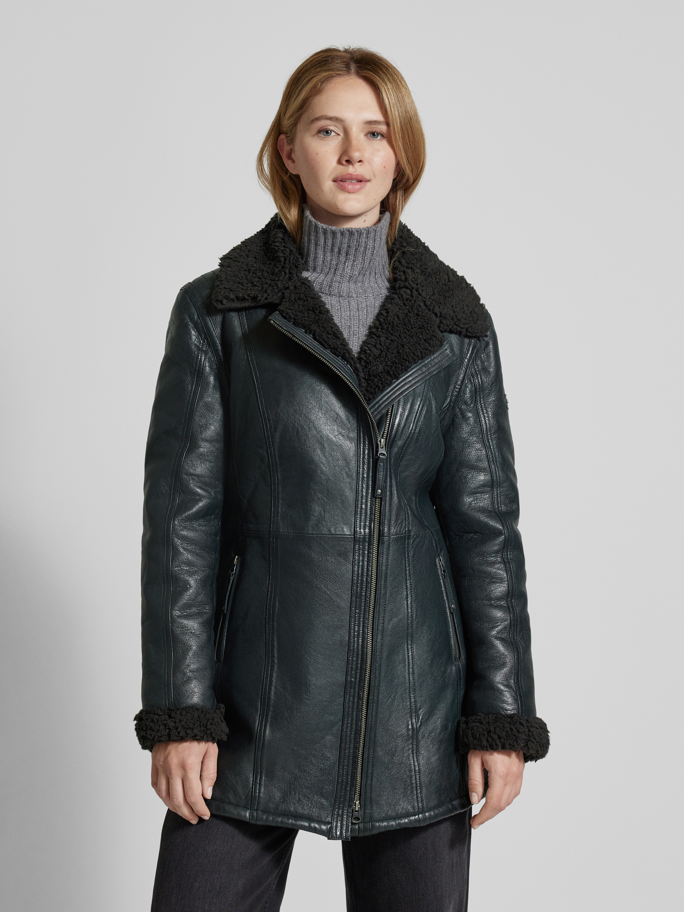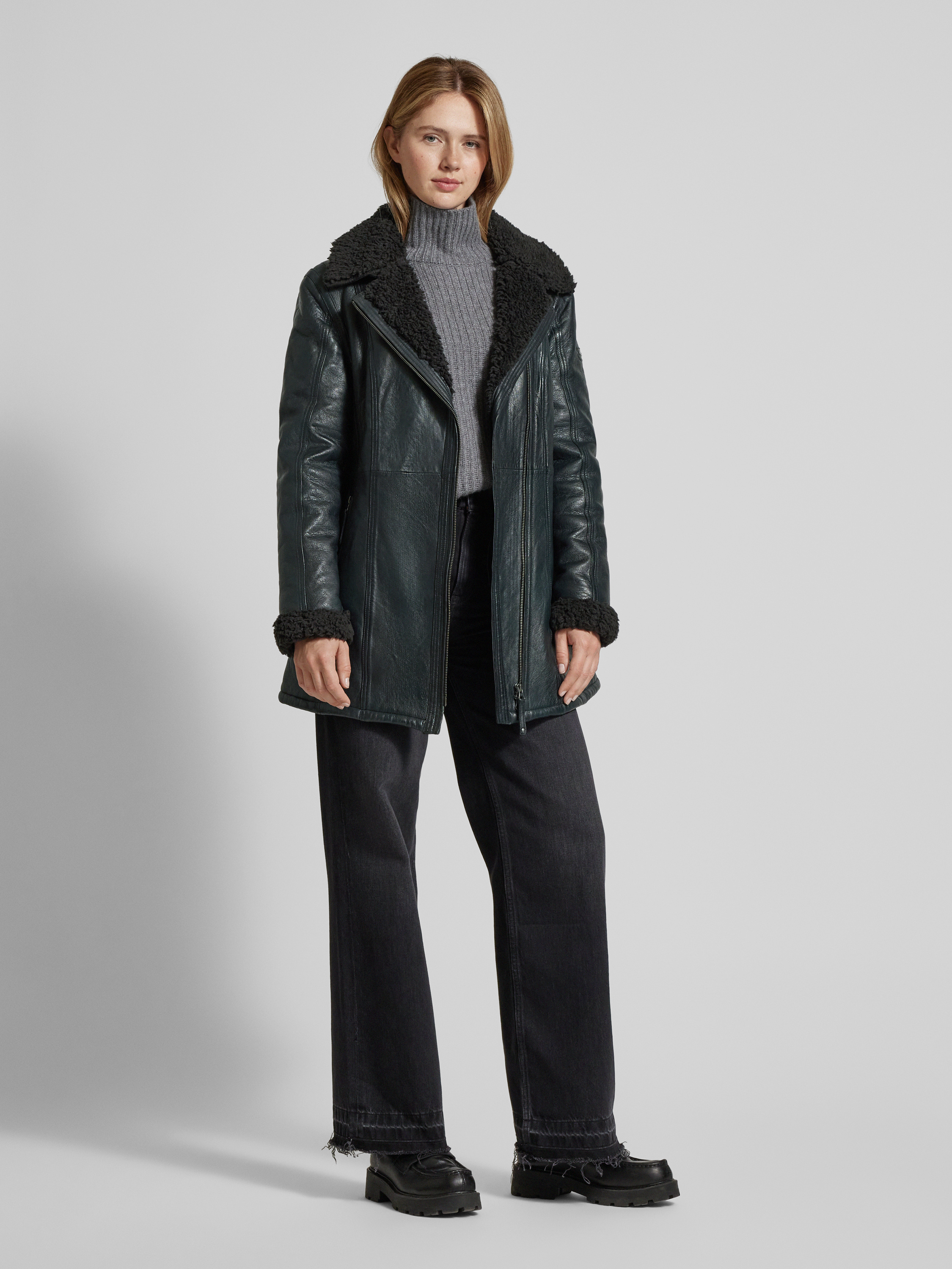 Płaszcz skórzany taliowany z naturalnej skóry jagnięcej nappa z podszewką ze sztucznego kożuszka - czarny