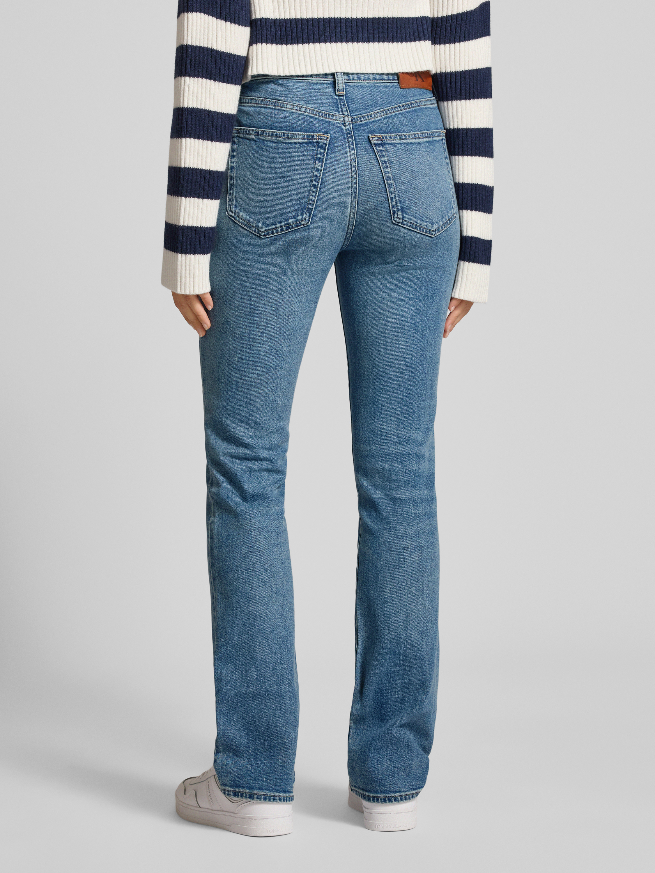 Jeansy o kroju skinny fit z poszerzaną nogawką, efektem znoszenia i detalem z logo - jeansowy niebieski