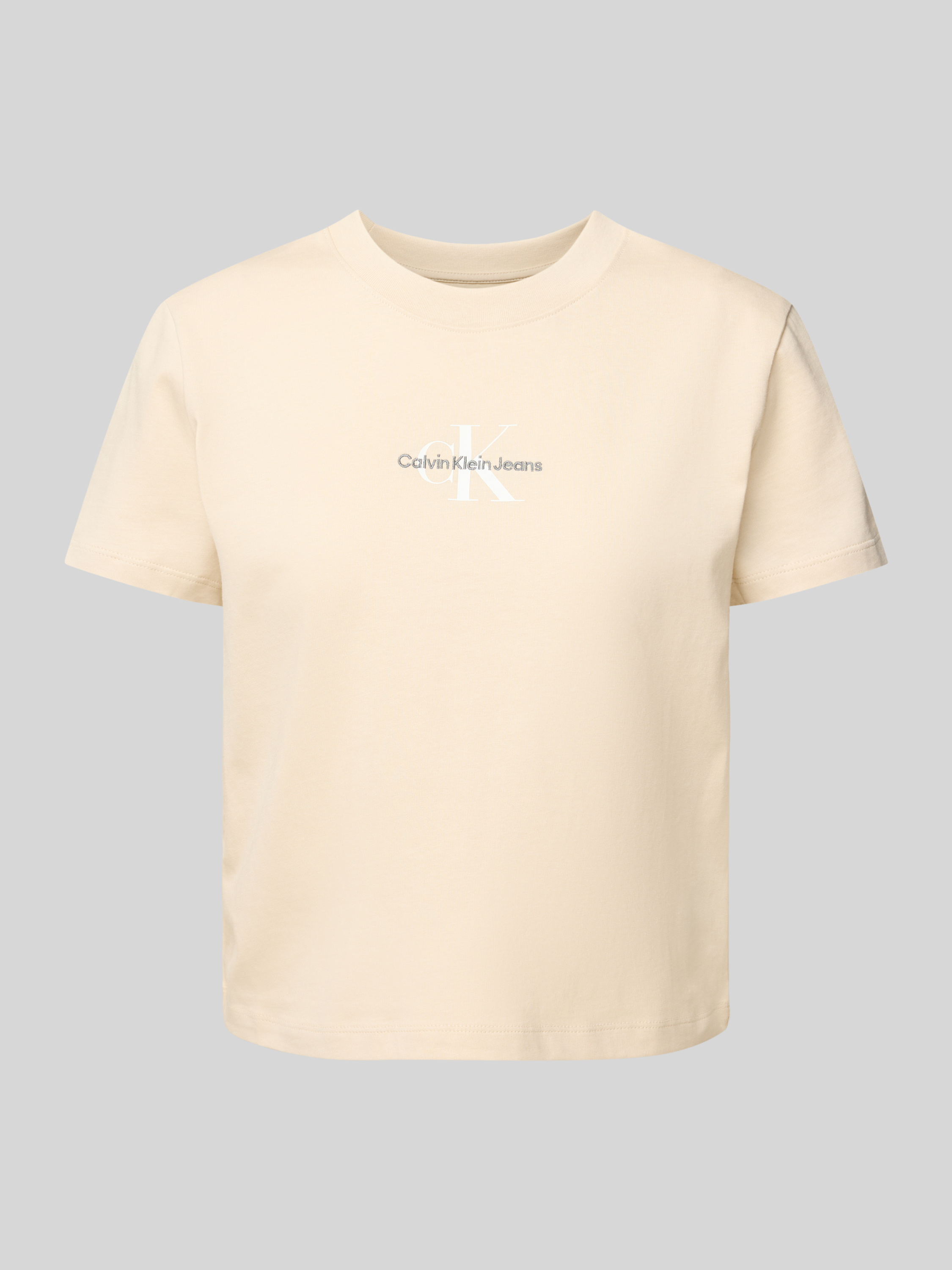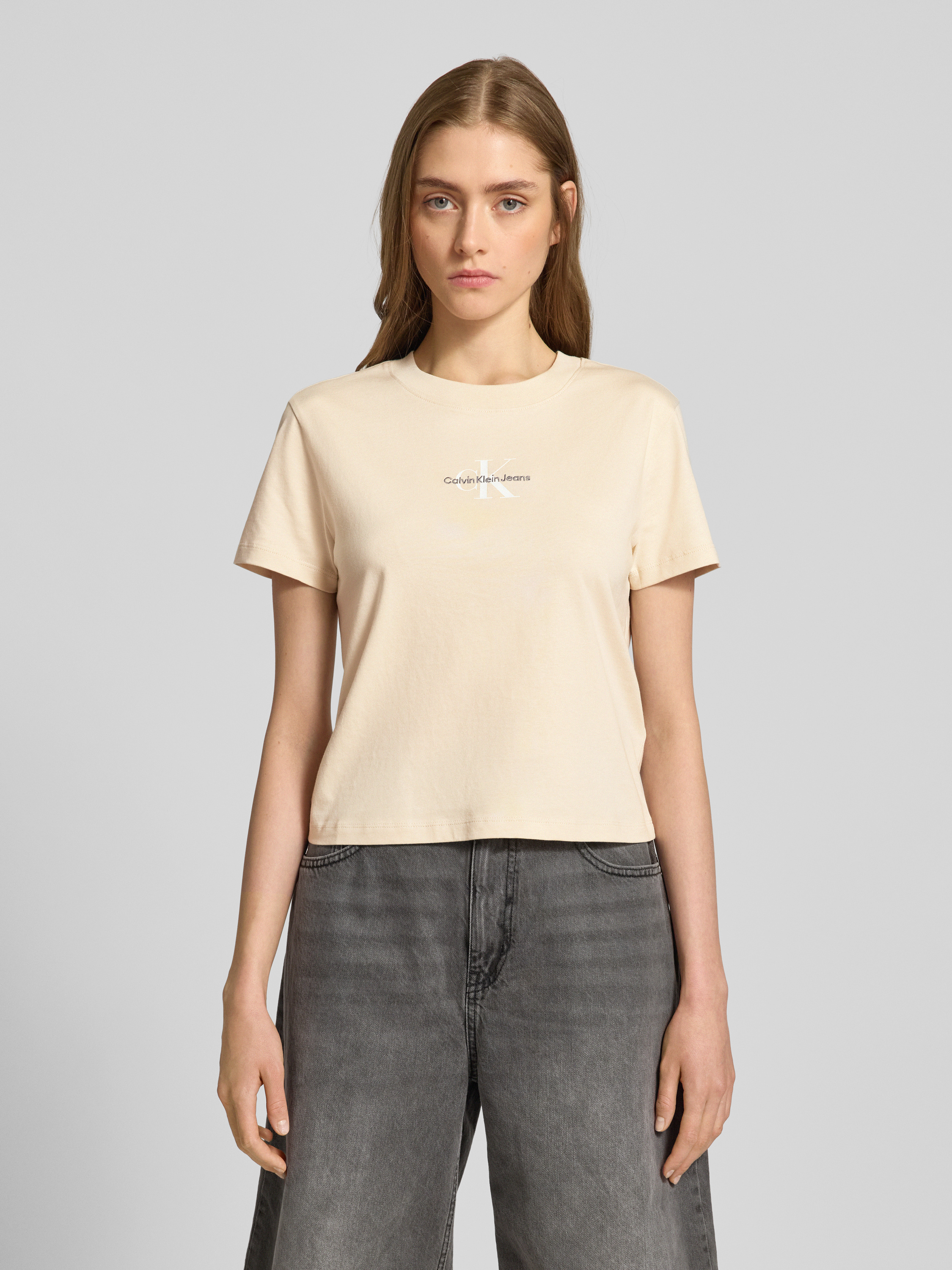 T-shirt z wyhaftowanym logo i okrągłym dekoltem - beżowy