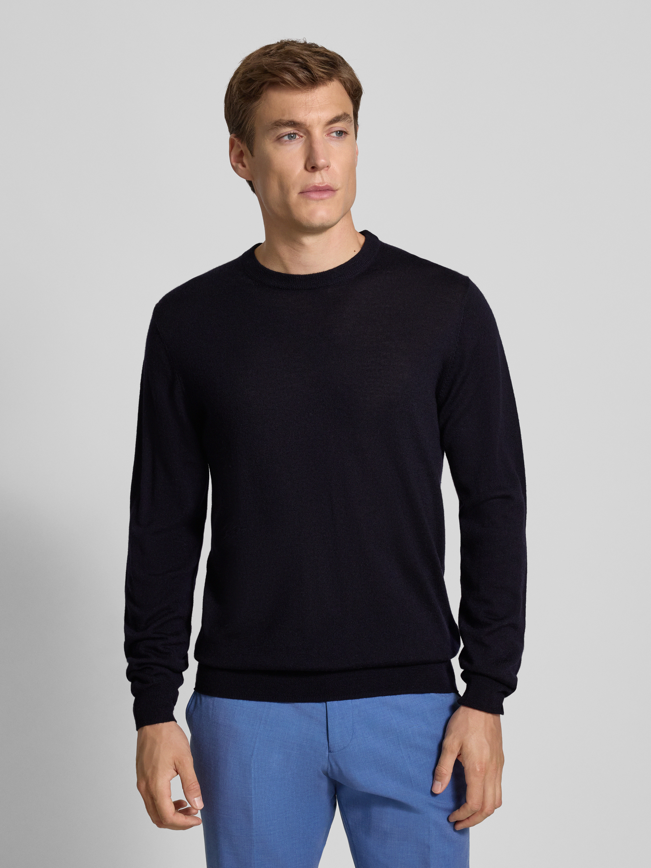 Sweter z dzianiny z wełny merino model ‘Dale’ - granatowy