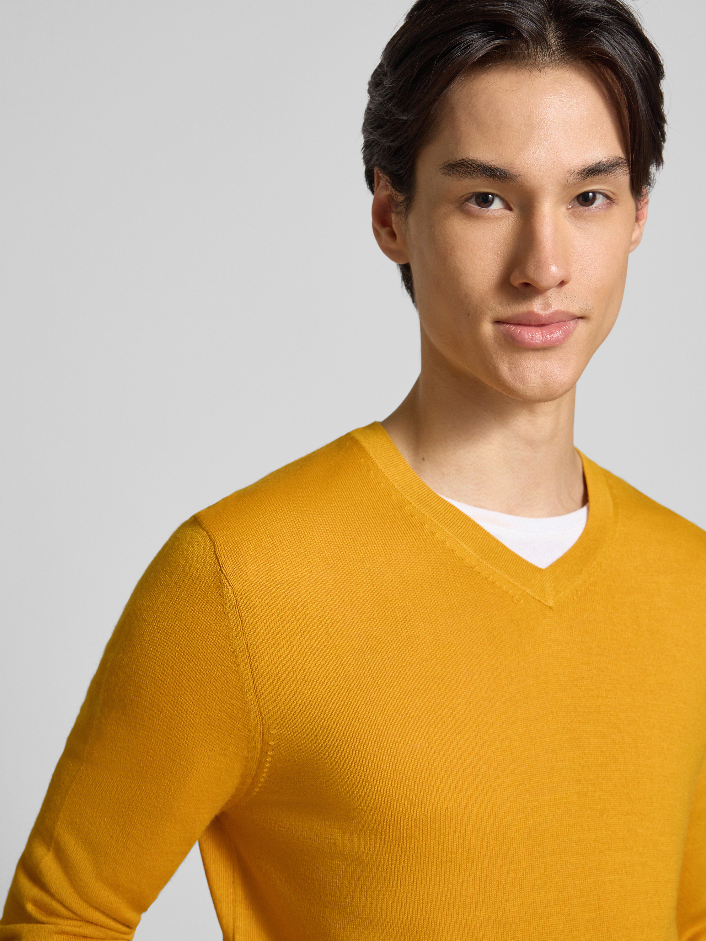 Sweter z dzianiny z mieszanki wełny merino z dekoltem w serek - żółty melanż