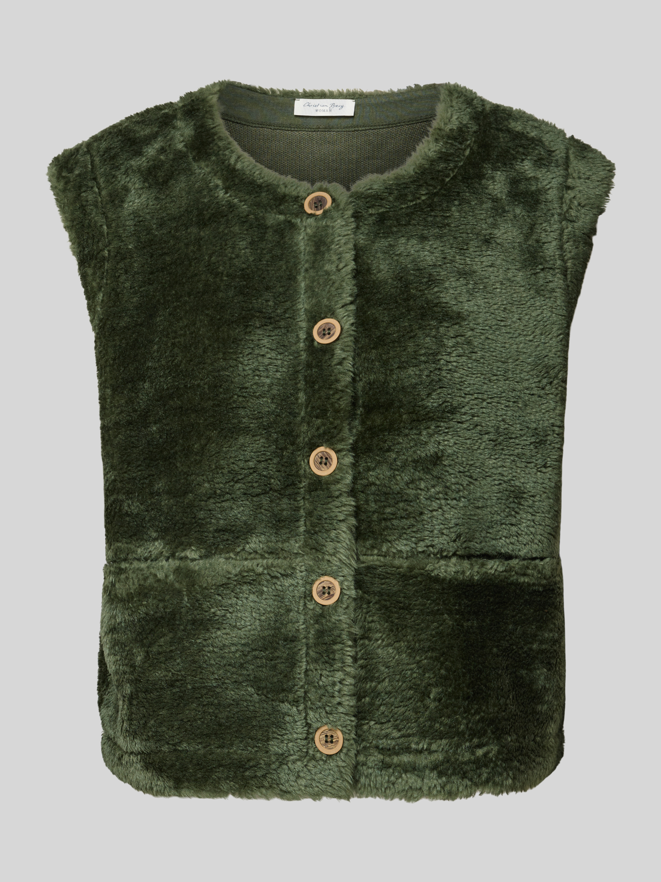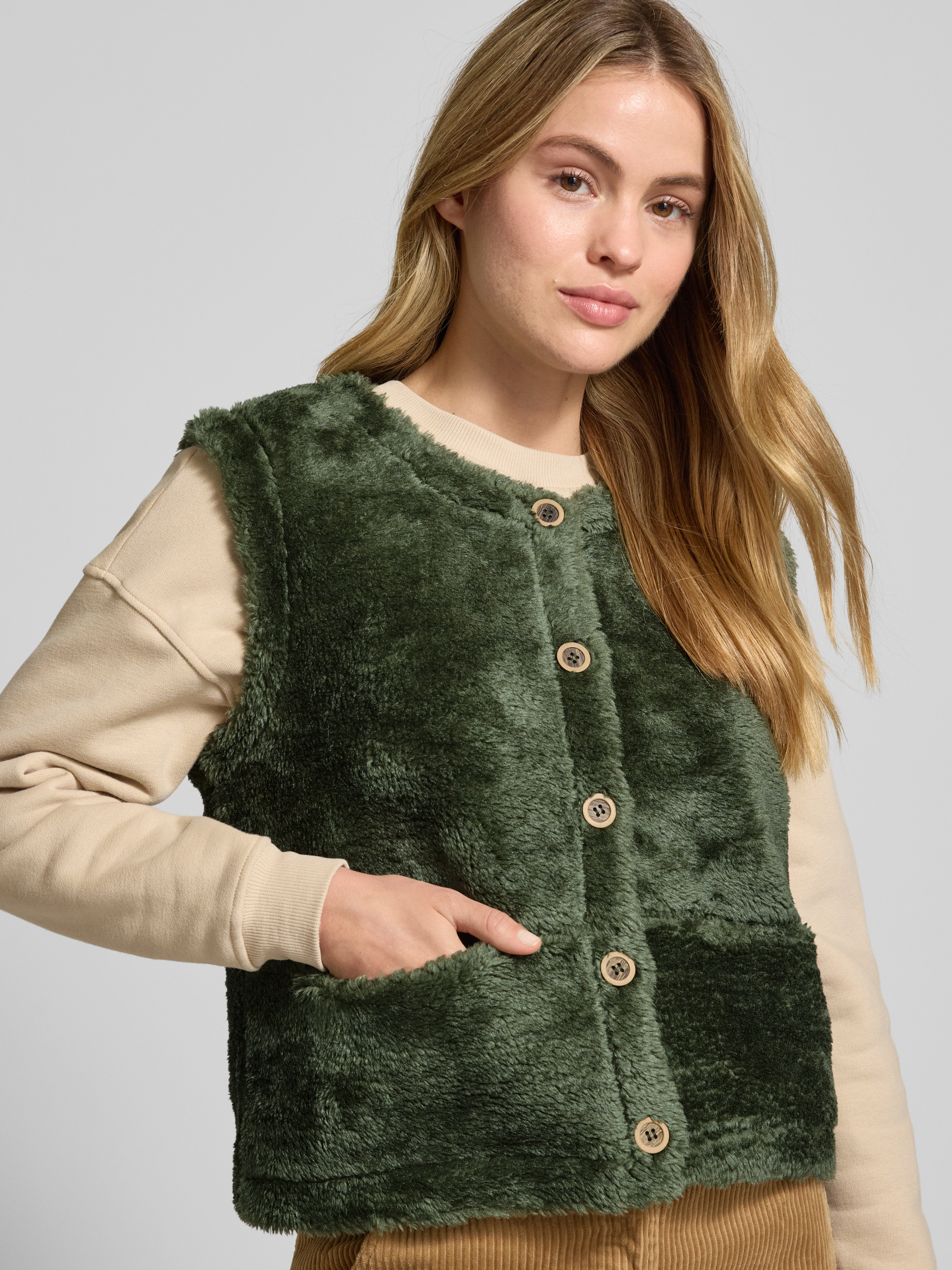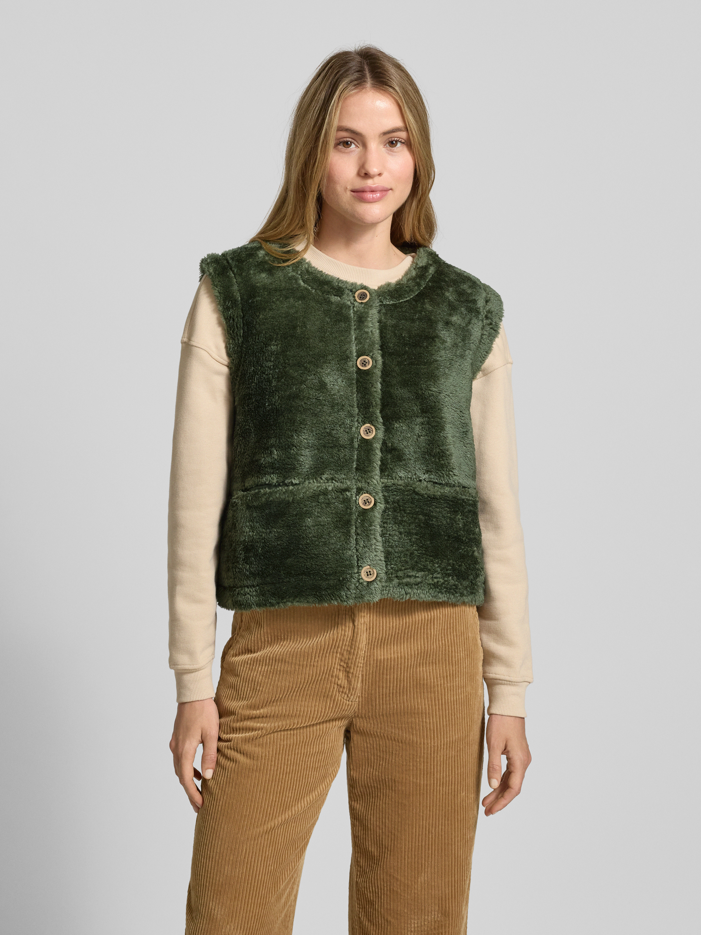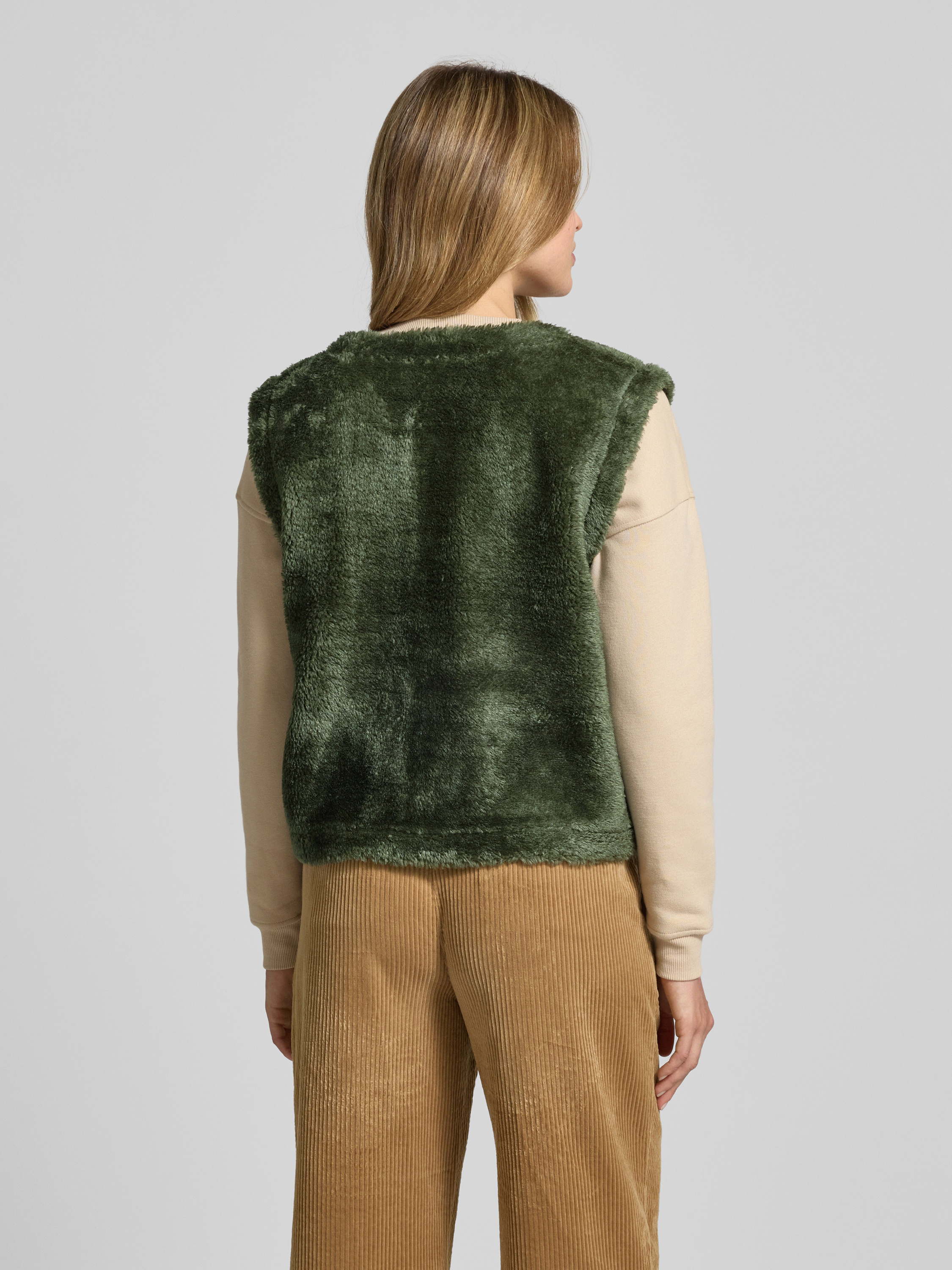 Kamizelka z sztucznego futra z okrągłym dekoltem - oliwkowy