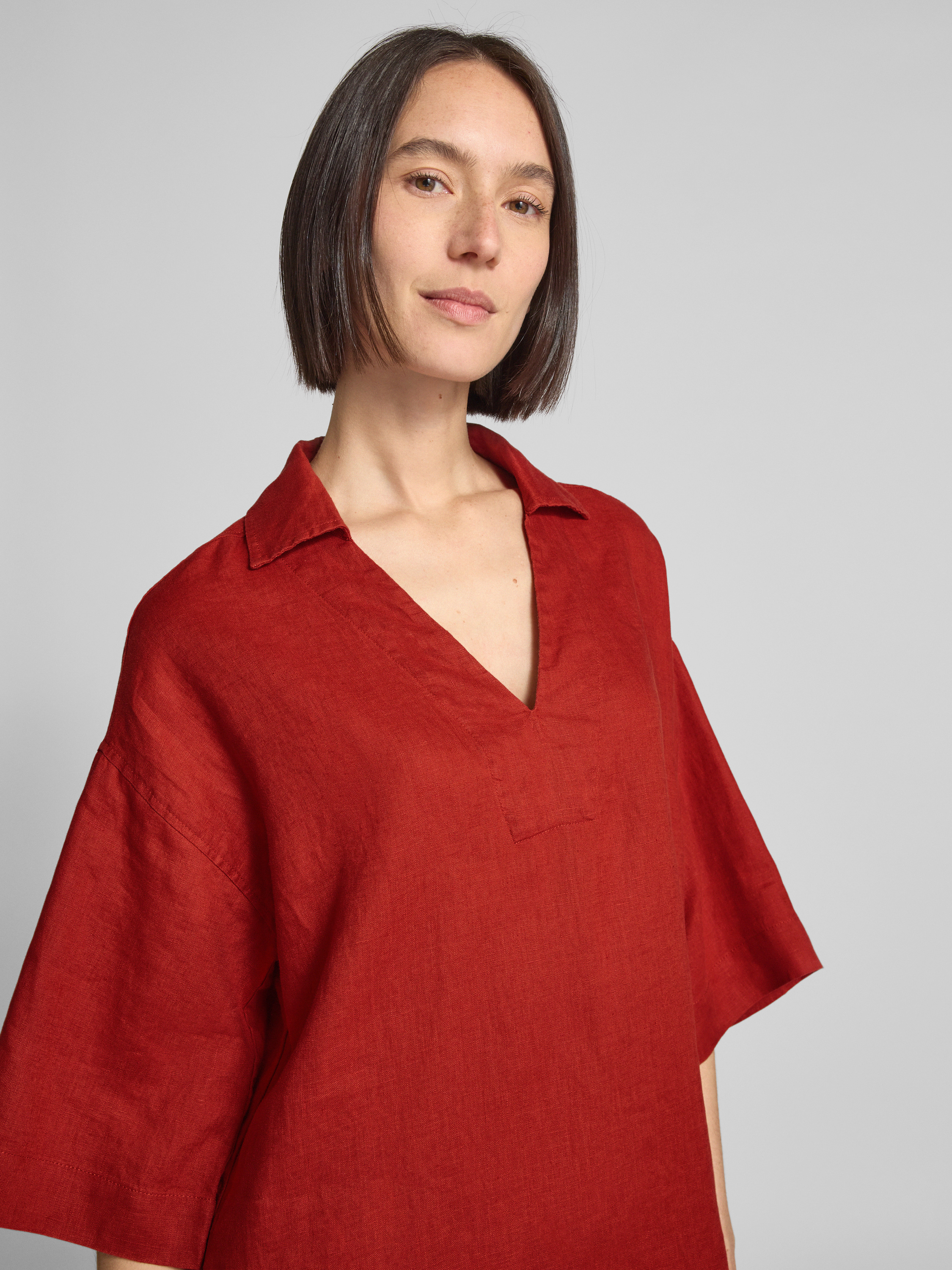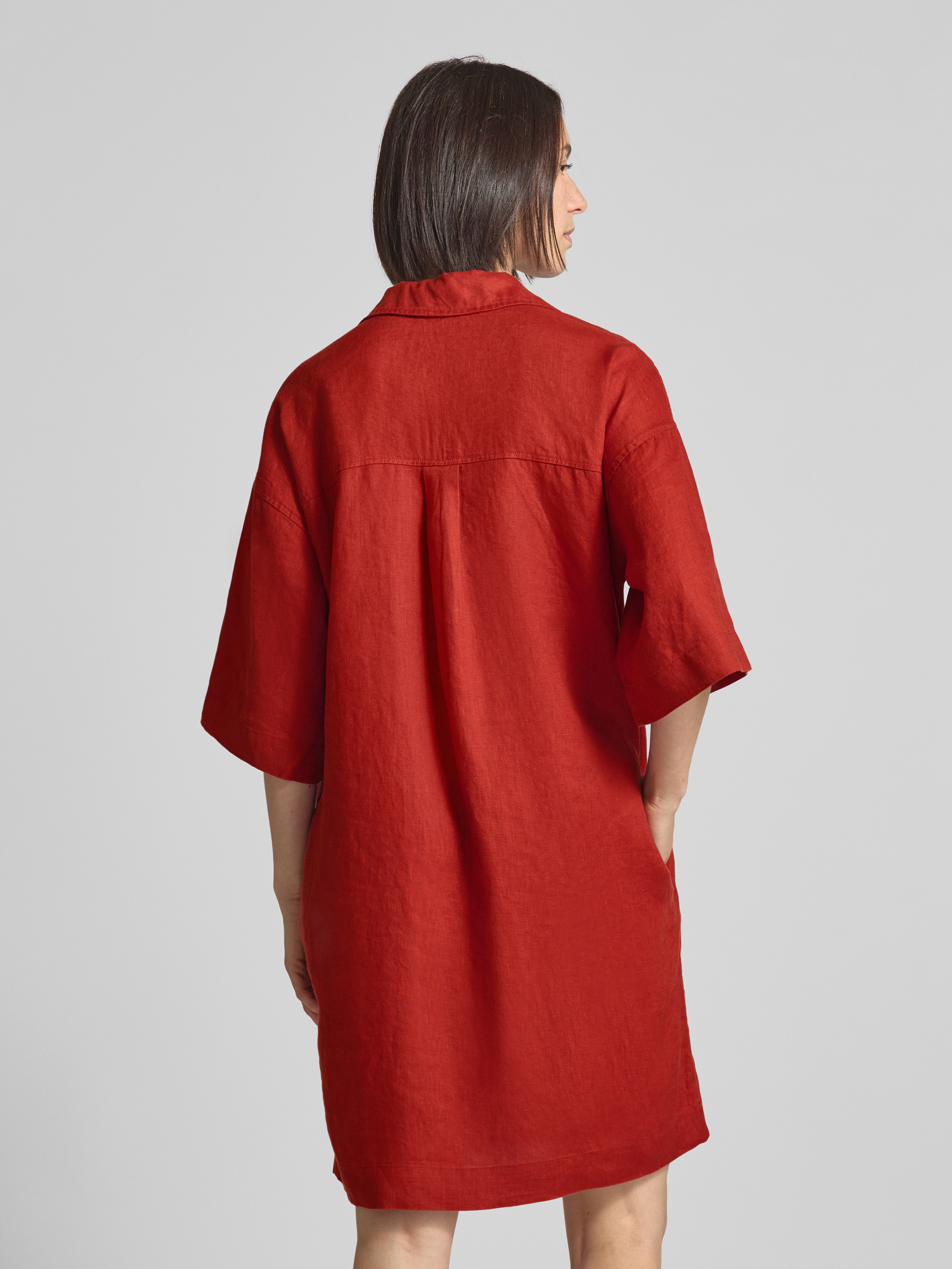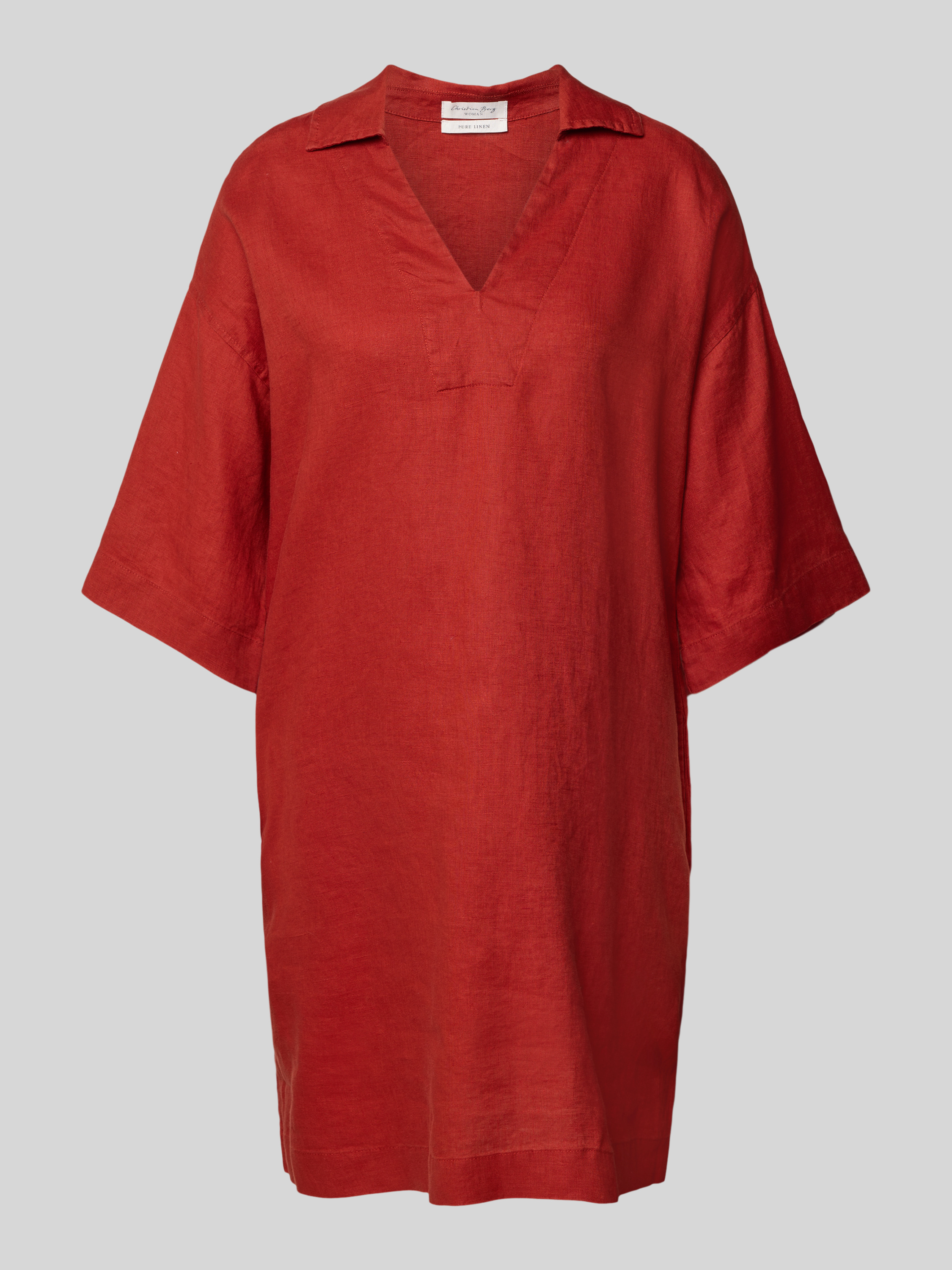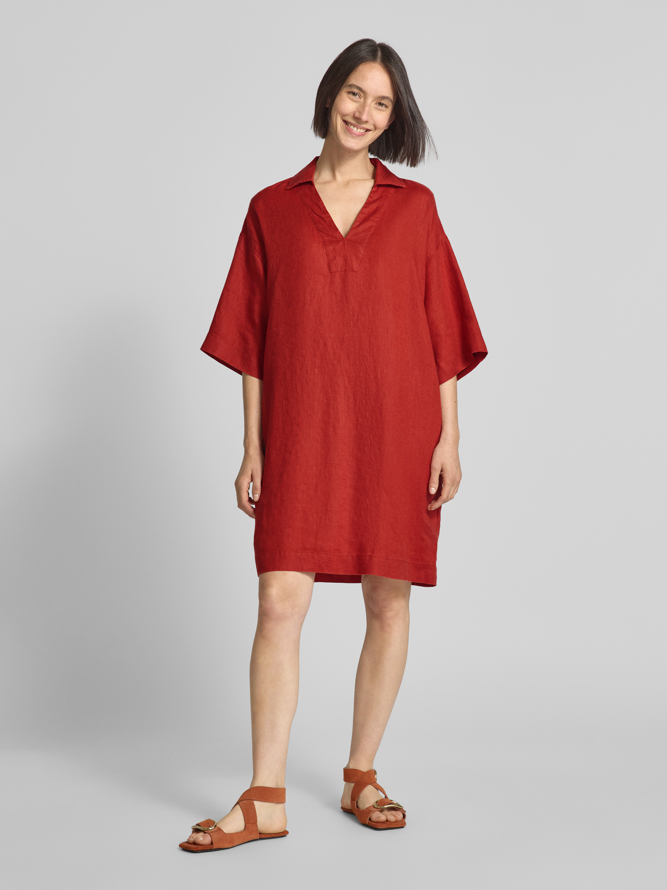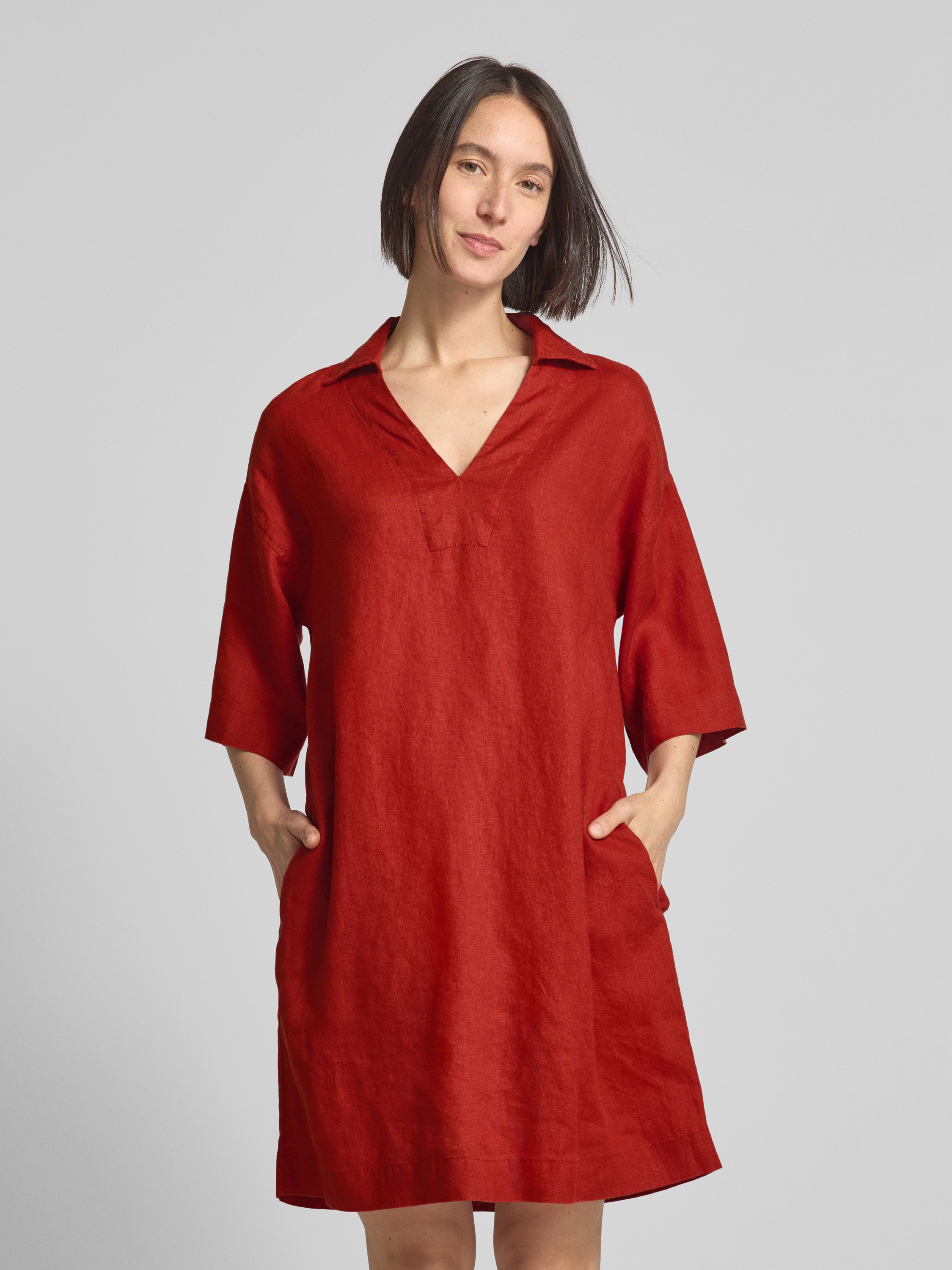Sukienka lniana o długości do kolan z dekoltem w serek - ciemnoczerwony