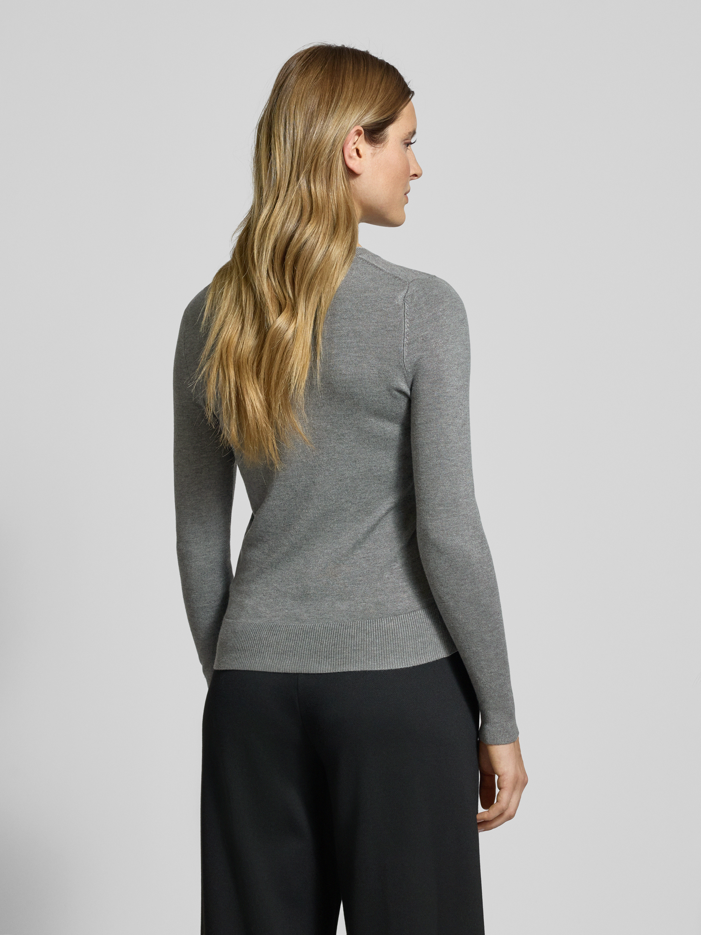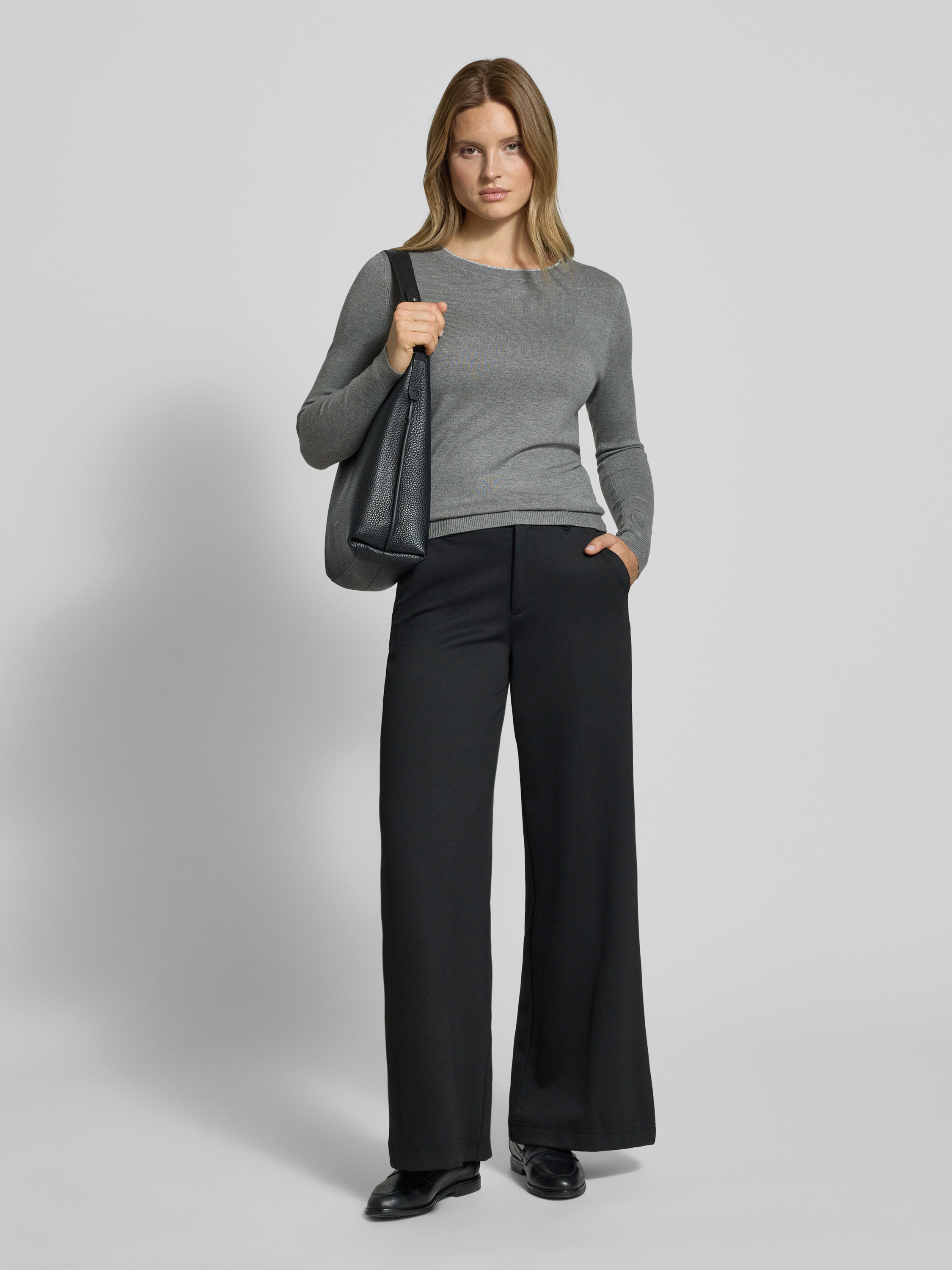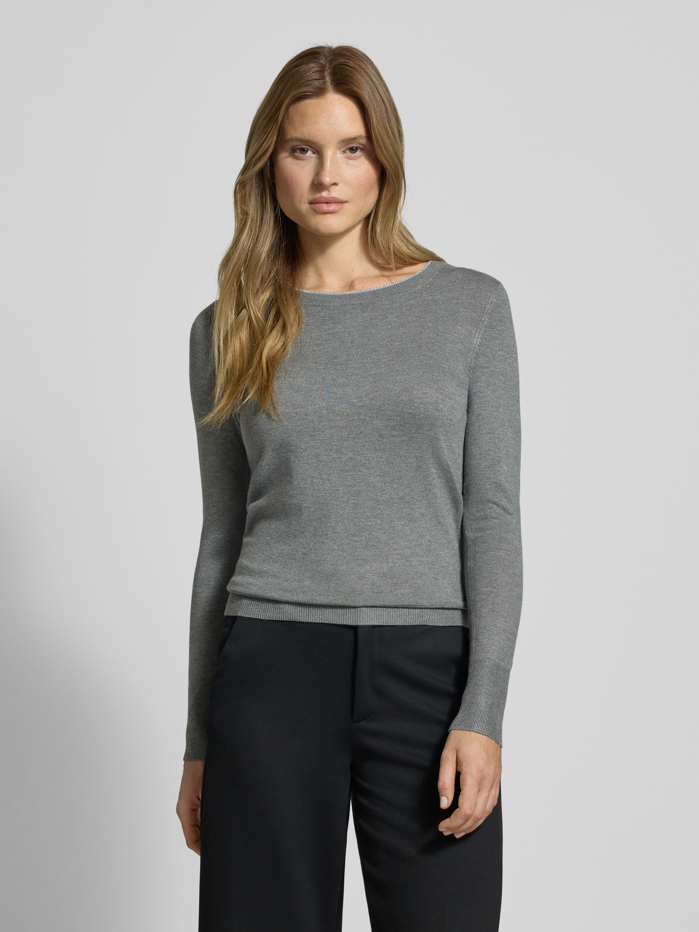 Sweter z dzianiny z prążkowanymi wykończeniami - srebrny melanż