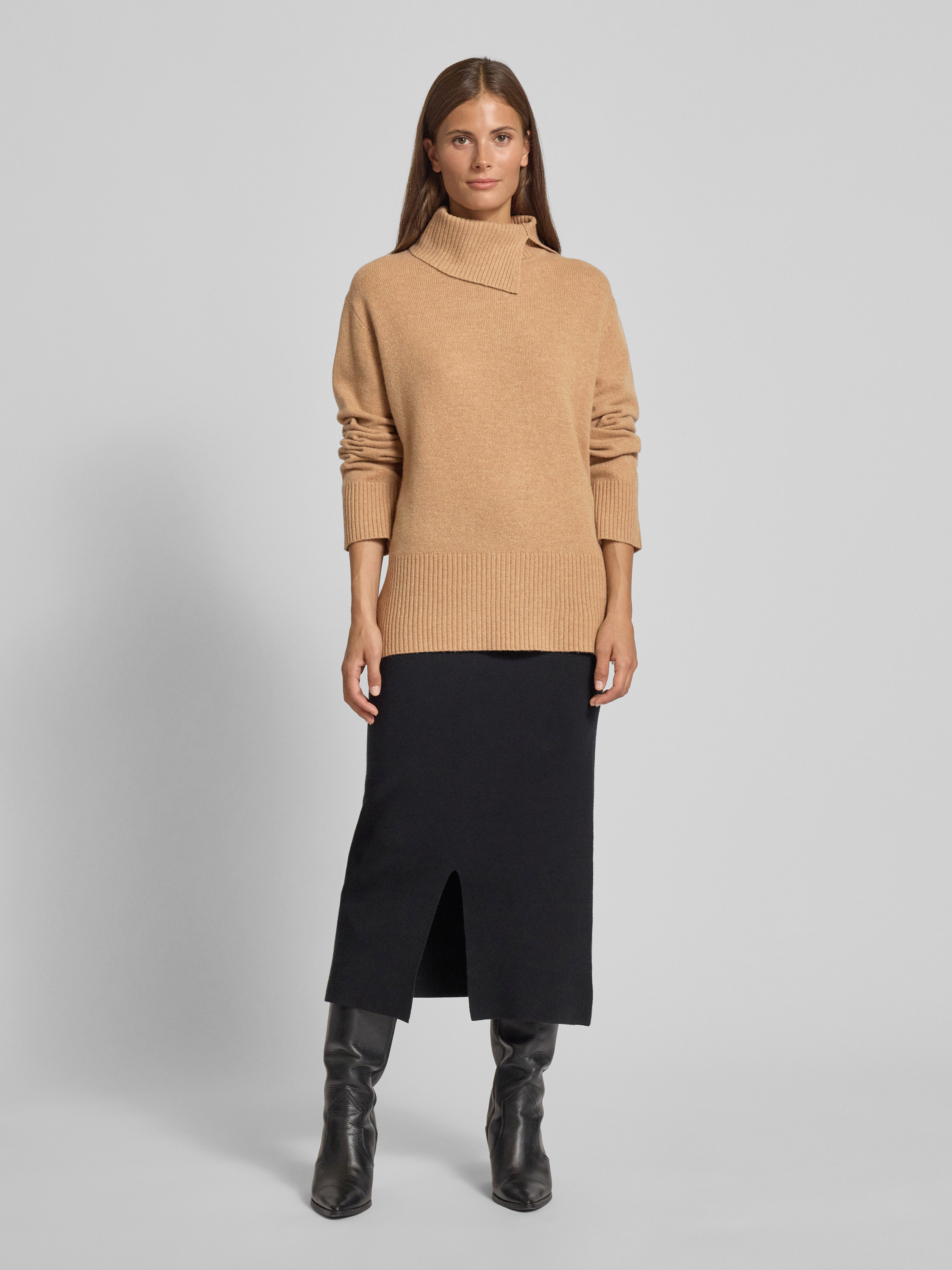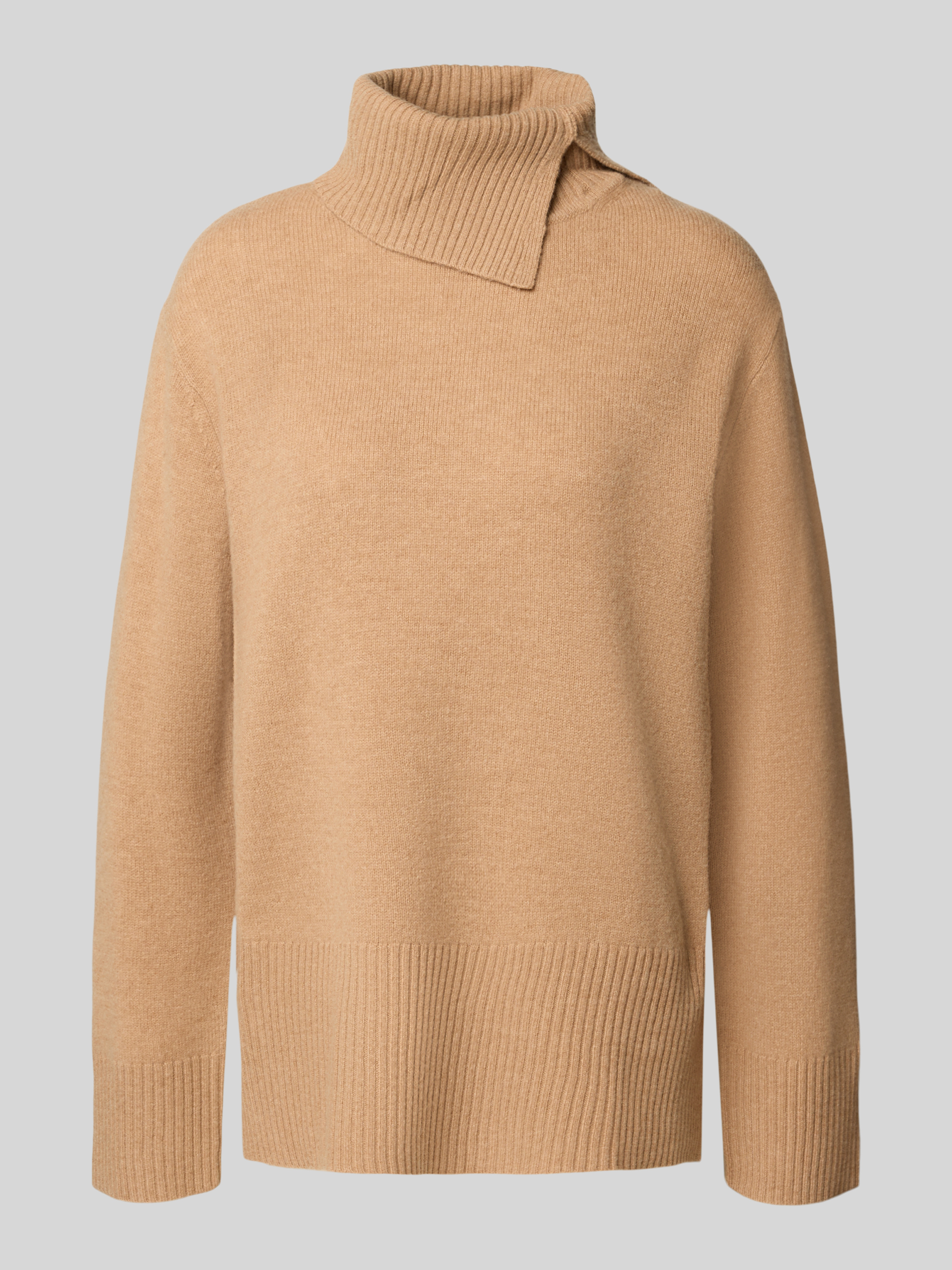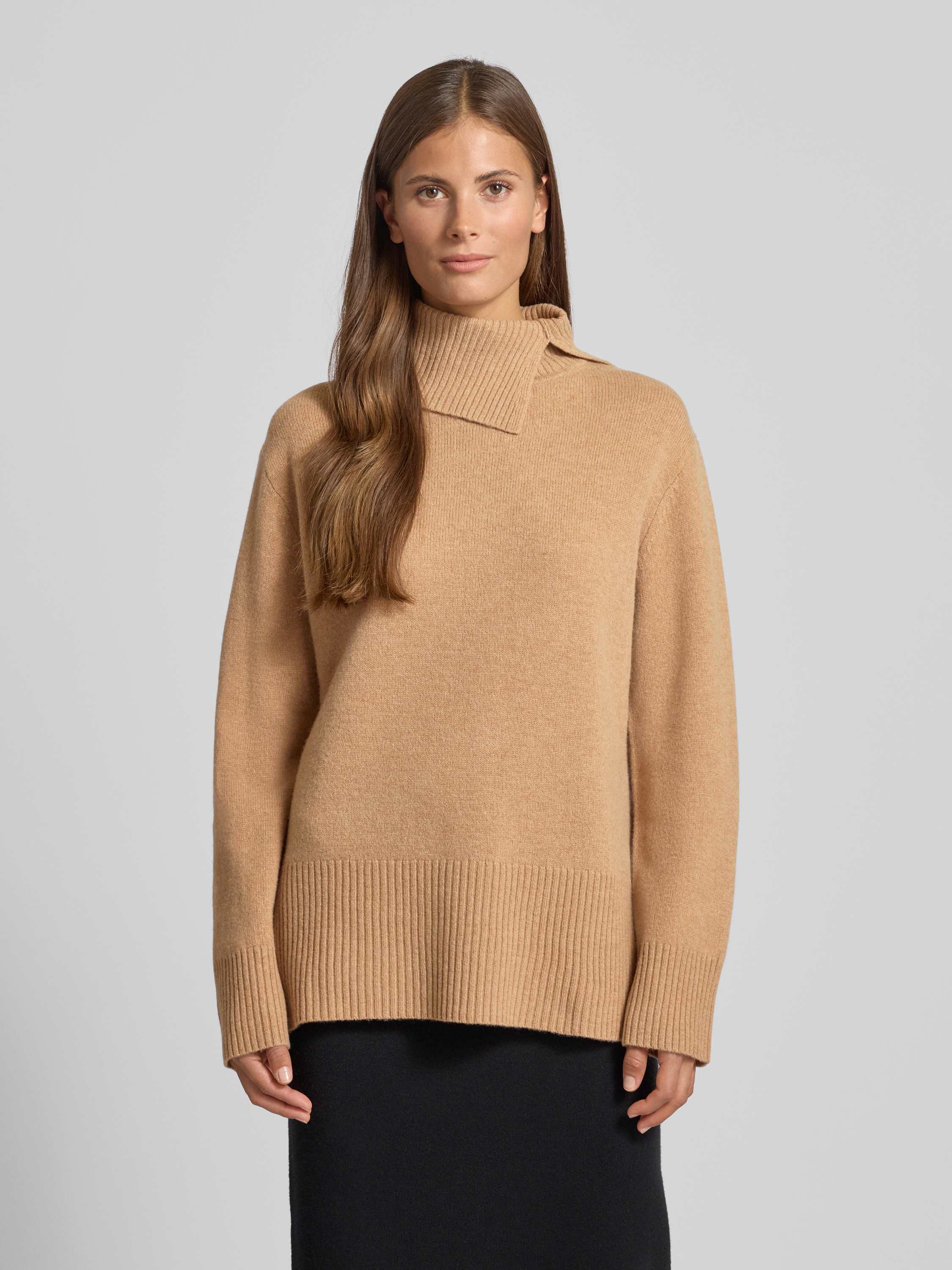 • Christian Berg Woman Sweter z dzianiny z wełny lana z golfem i bocznymi rozcięciami Camel