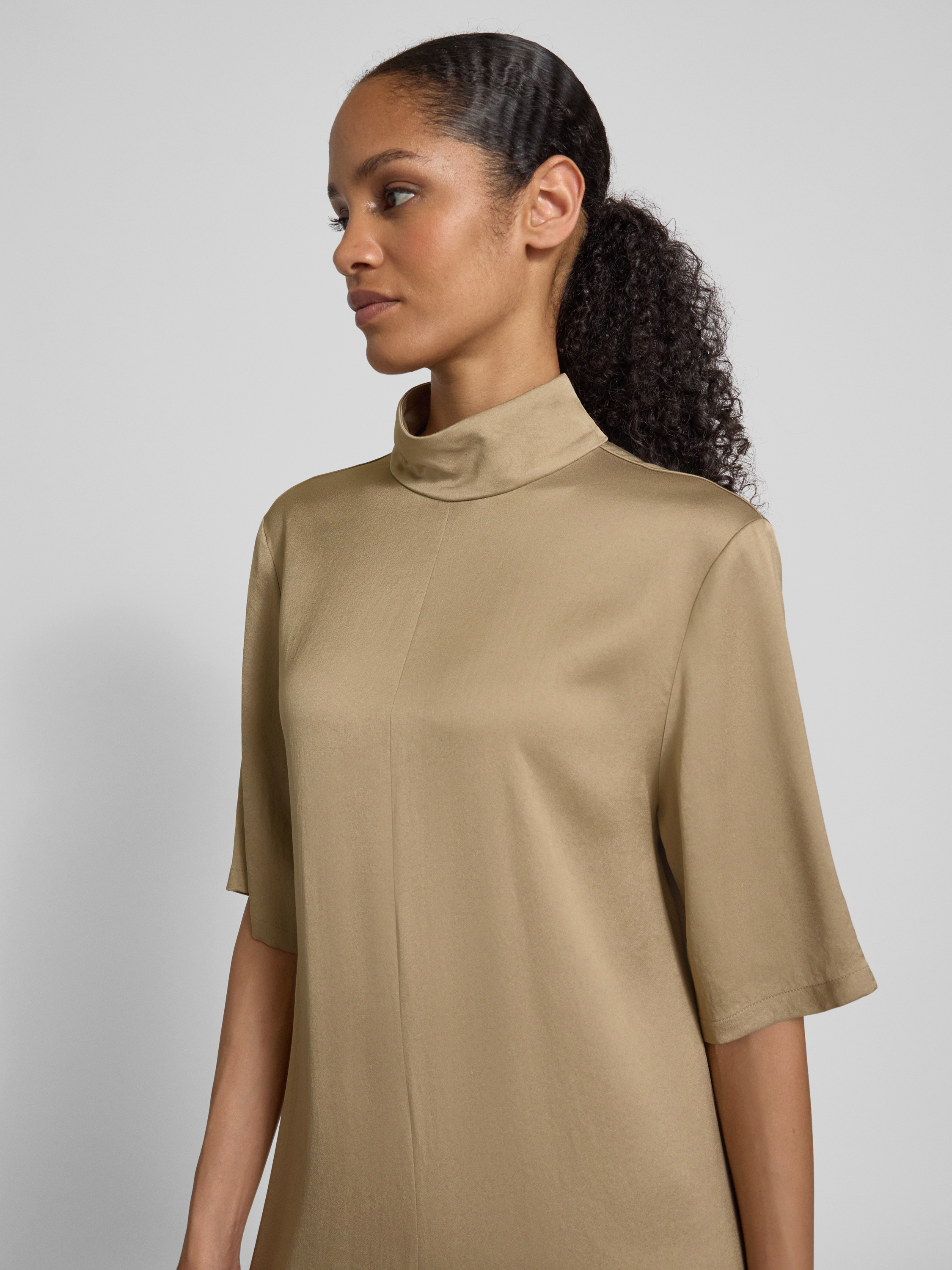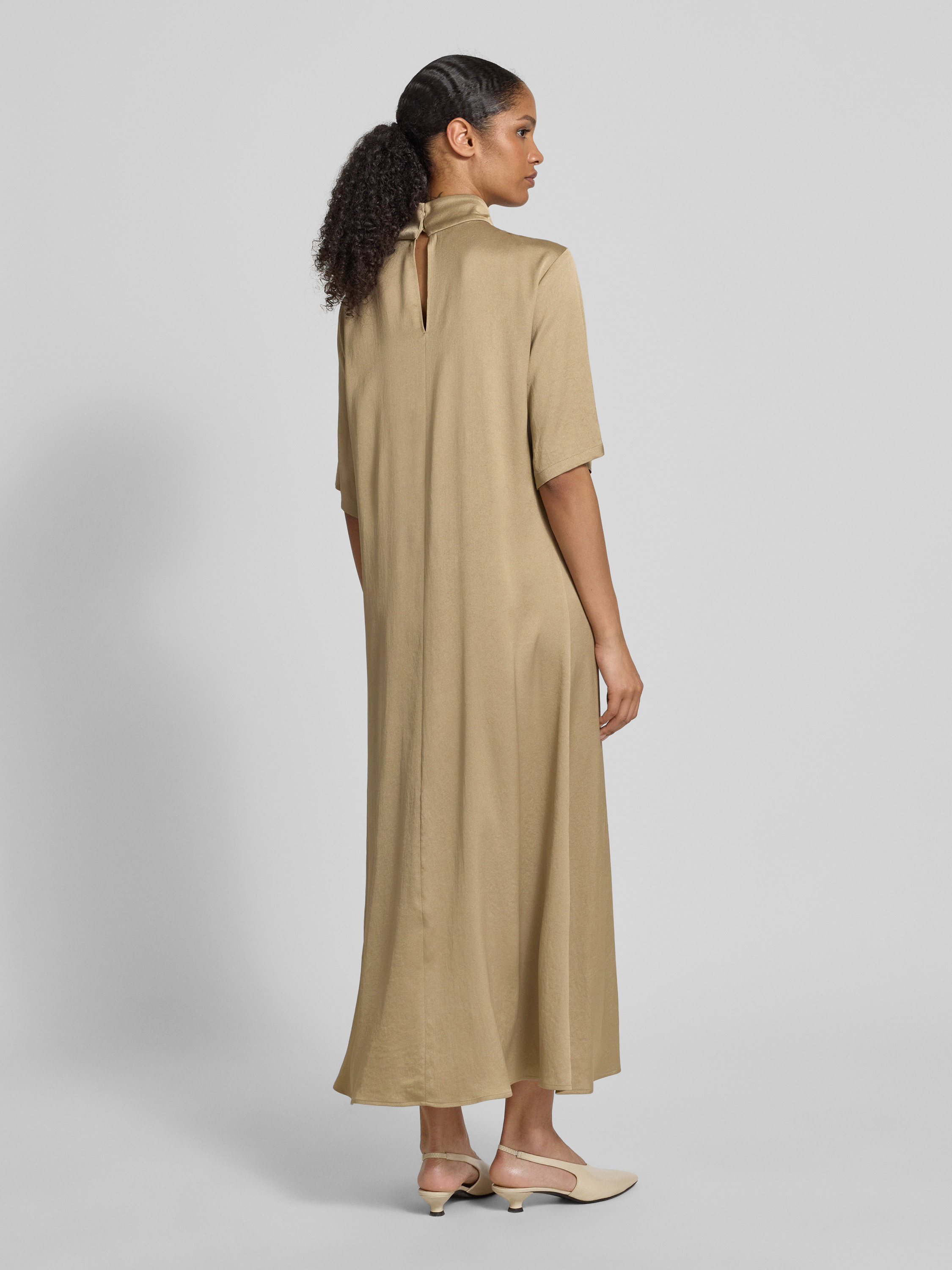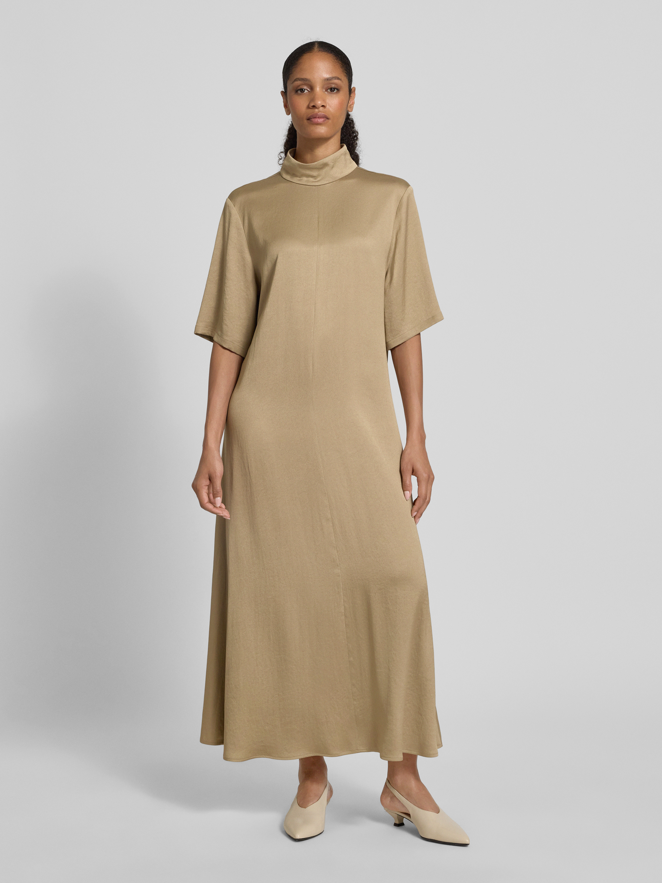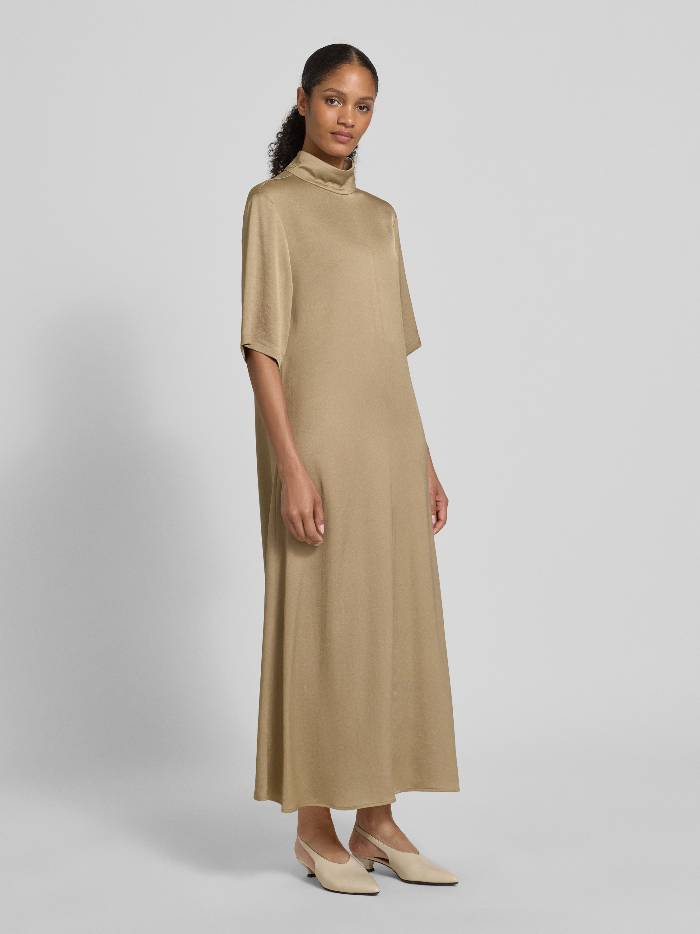 Długa sukienka ze stójką i rękawem o dł. 1/2 - camel