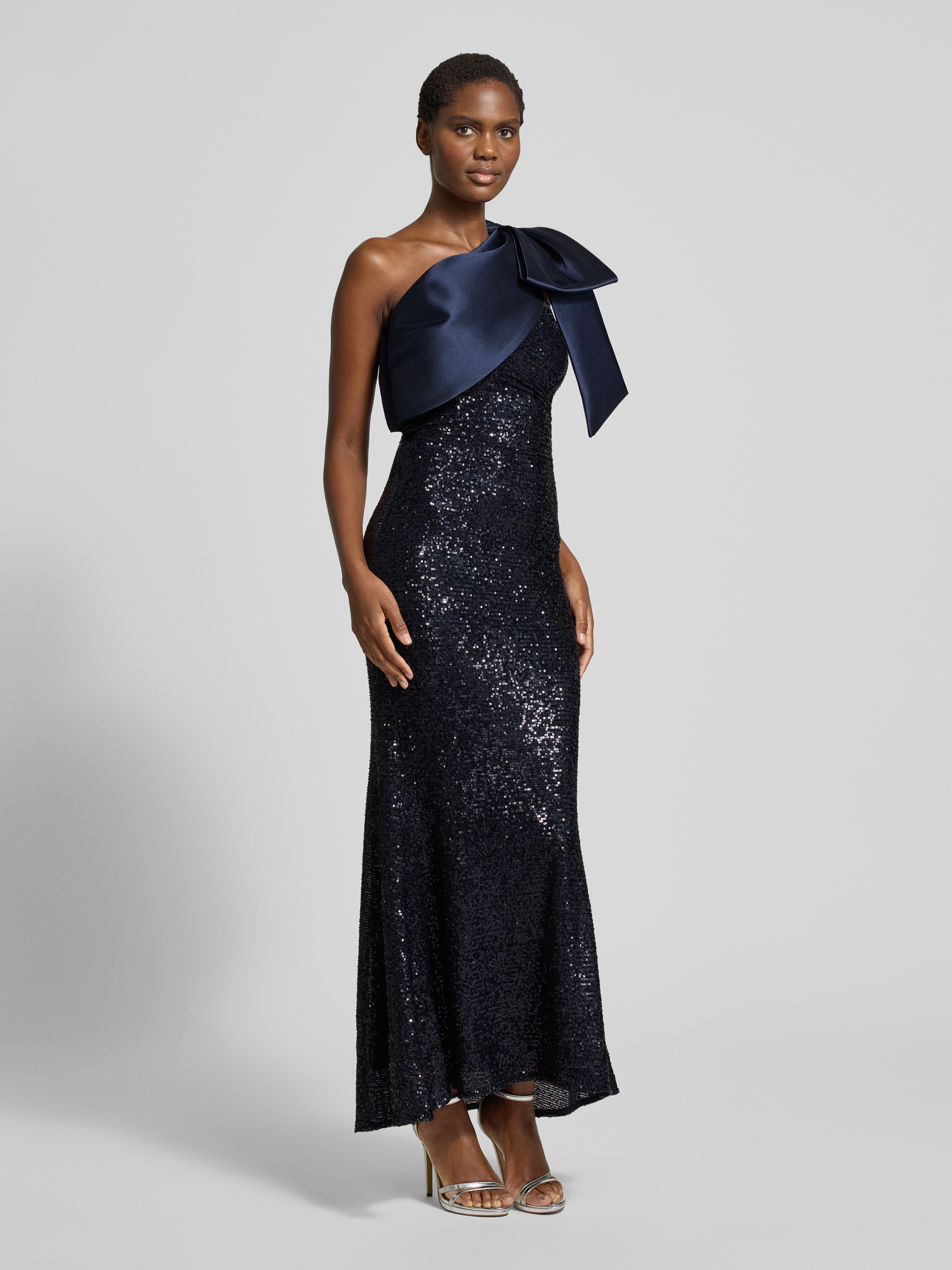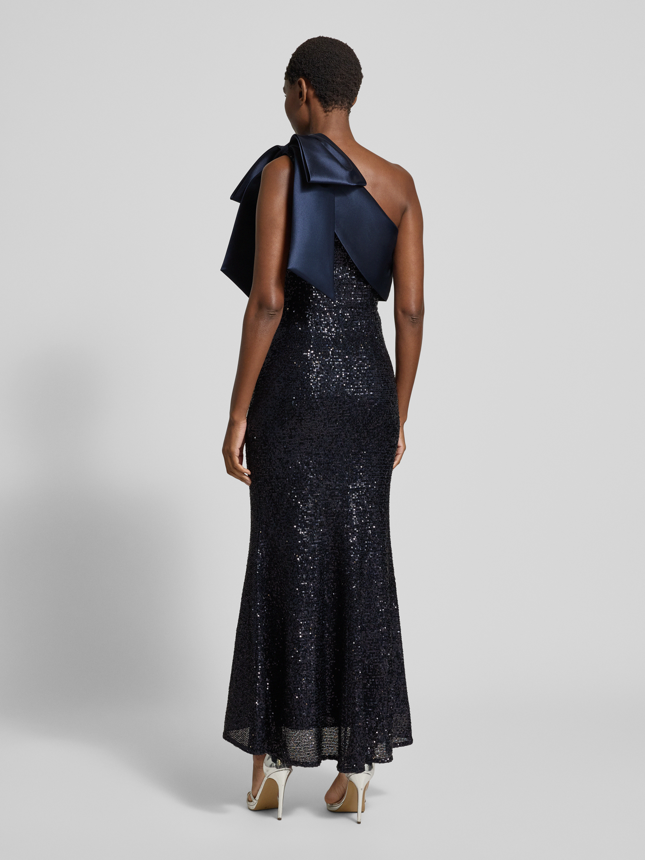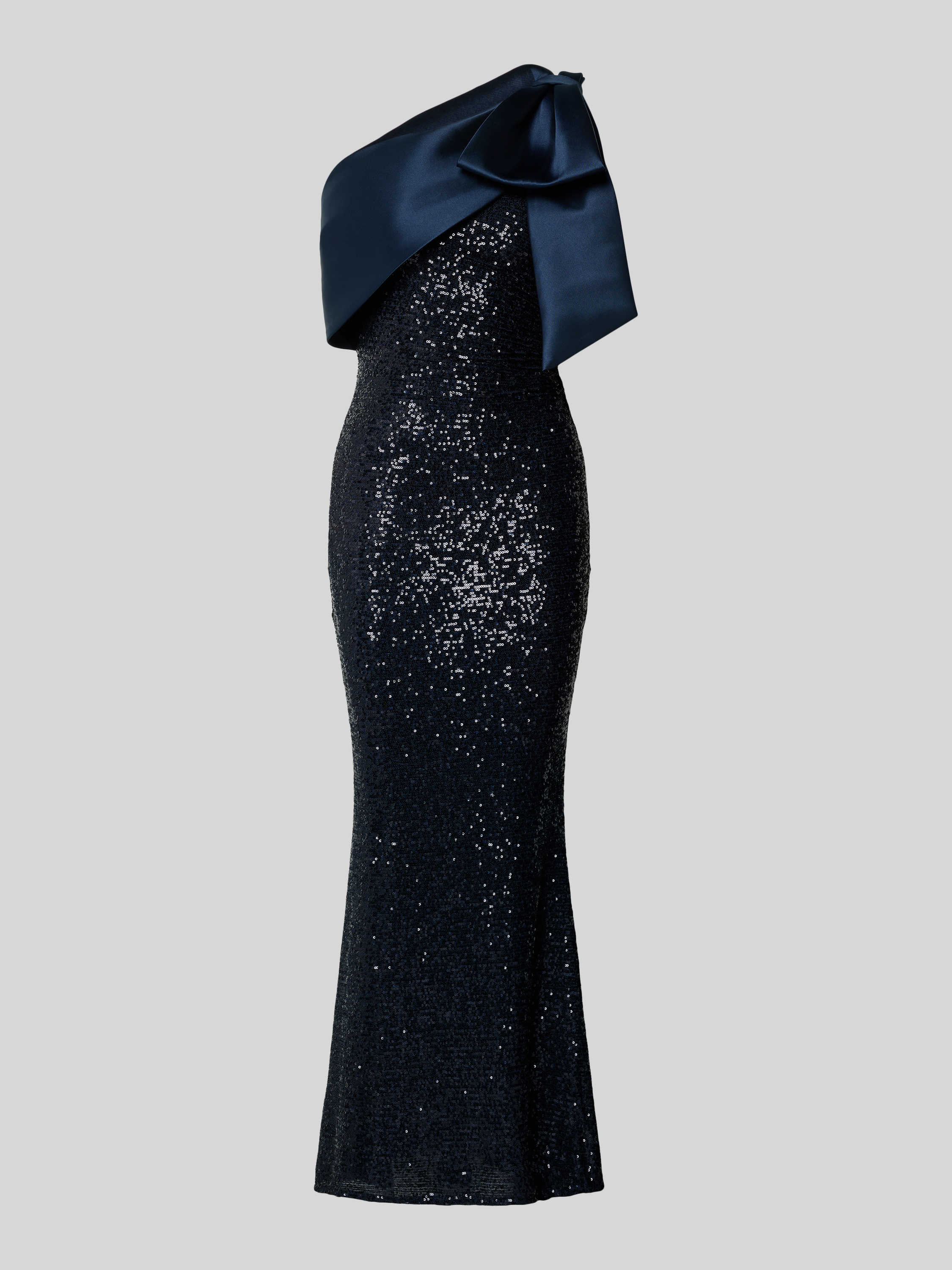 Sukienka wieczorowa o kroju slim fit z ozdobną kokardą model ‘Delta’ - ciemnoniebieski