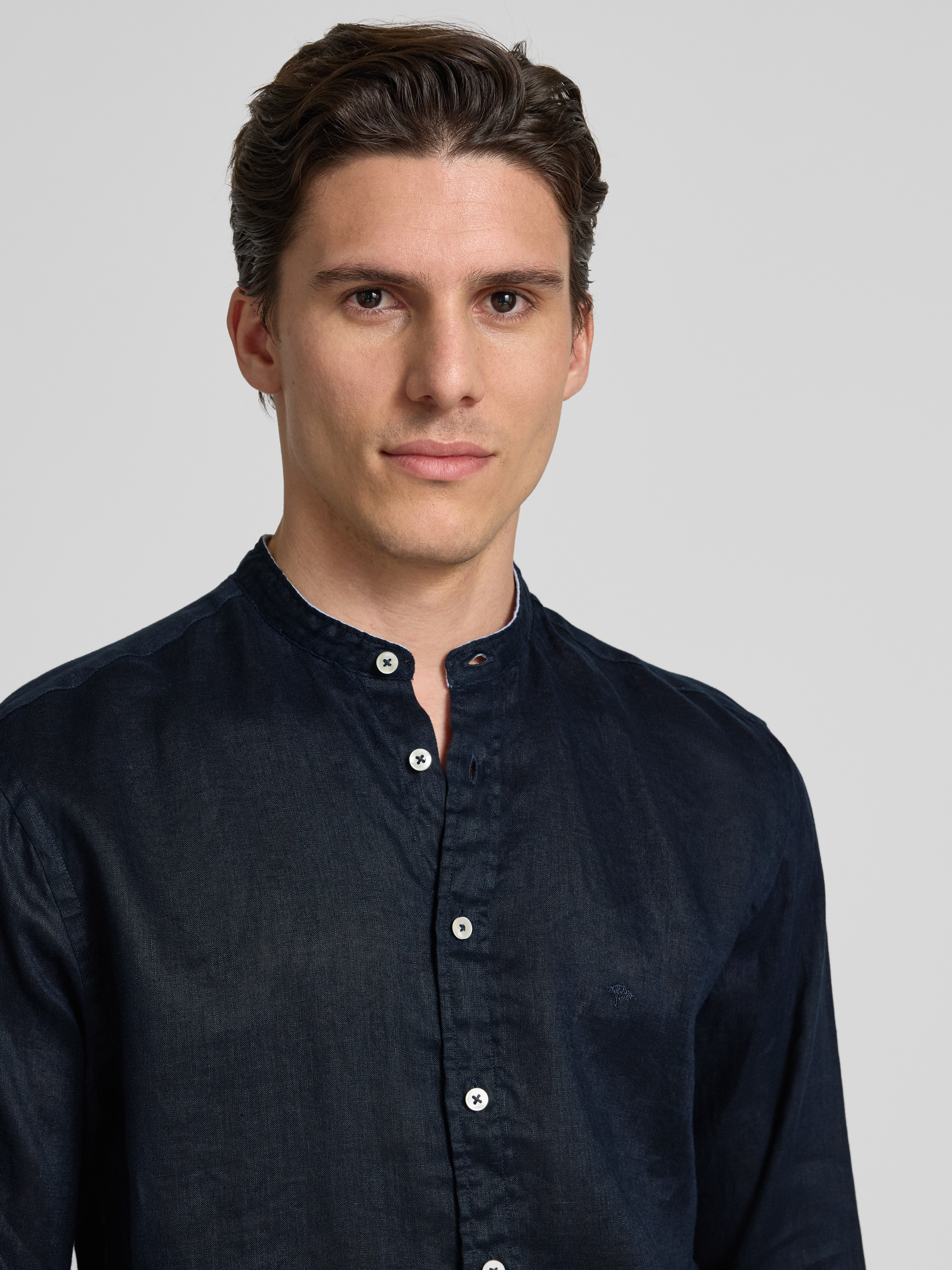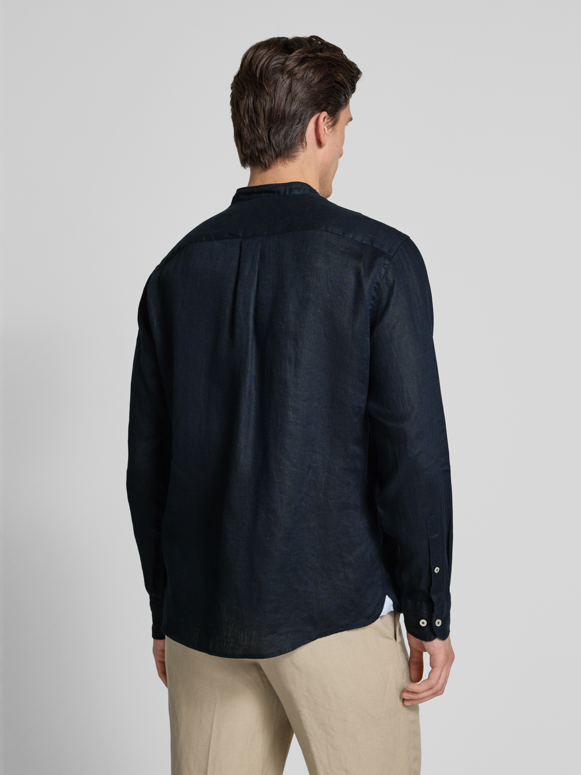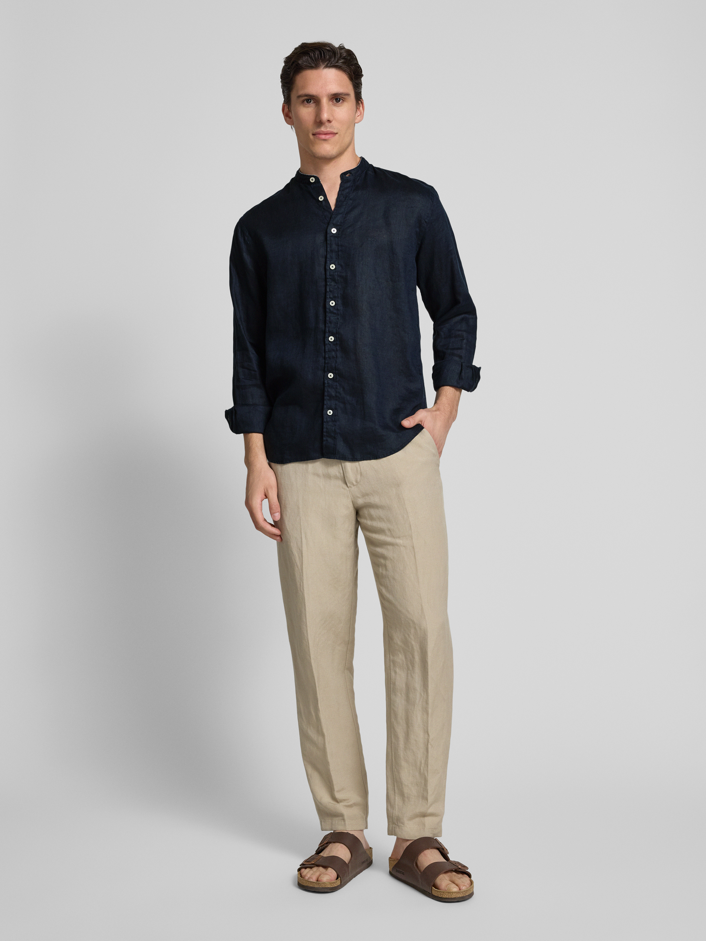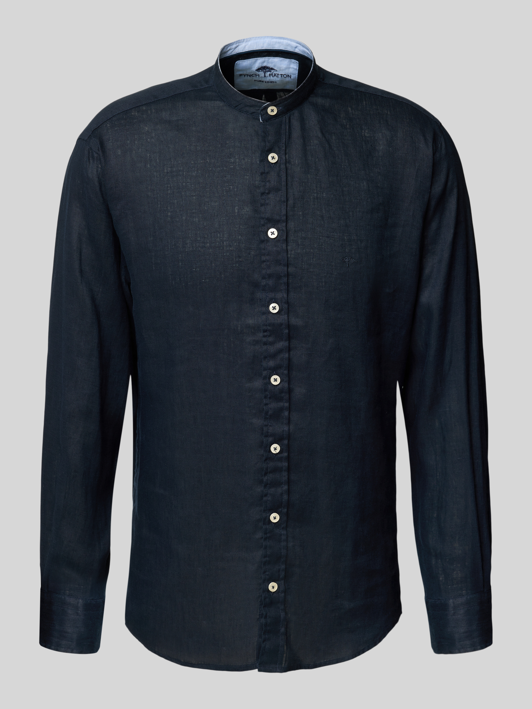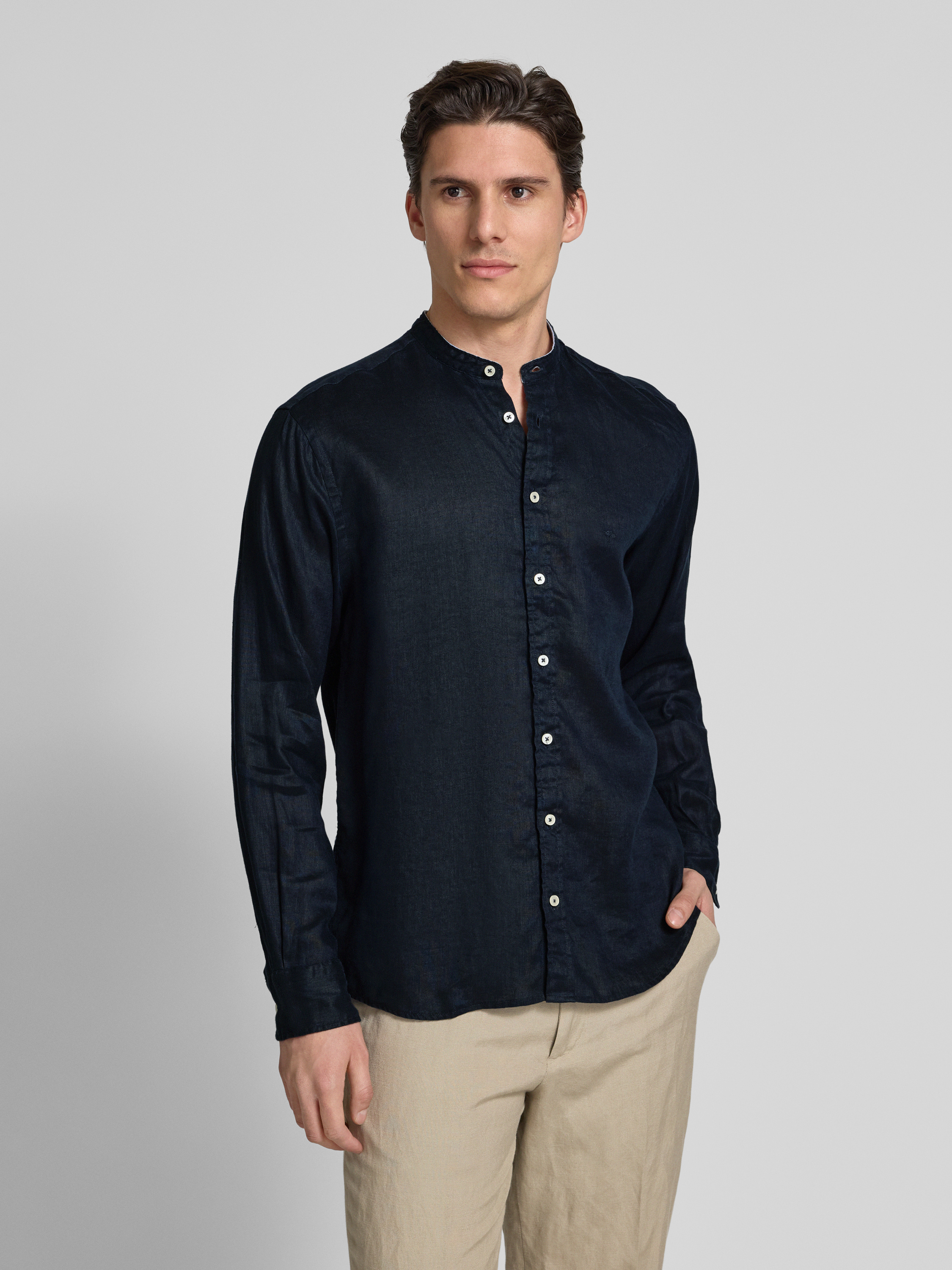 Koszula lniana o kroju regular fit ze stójką - granatowy