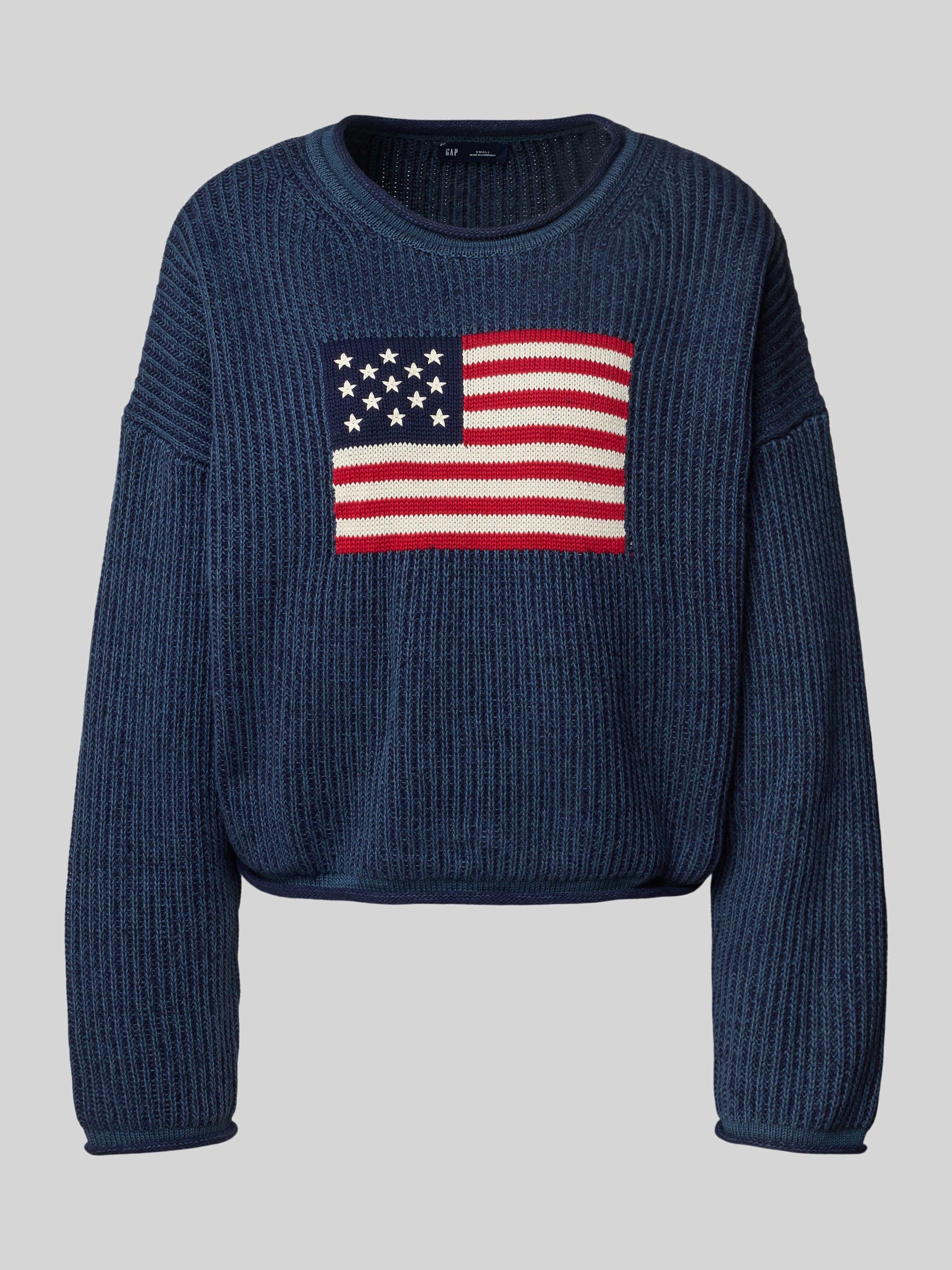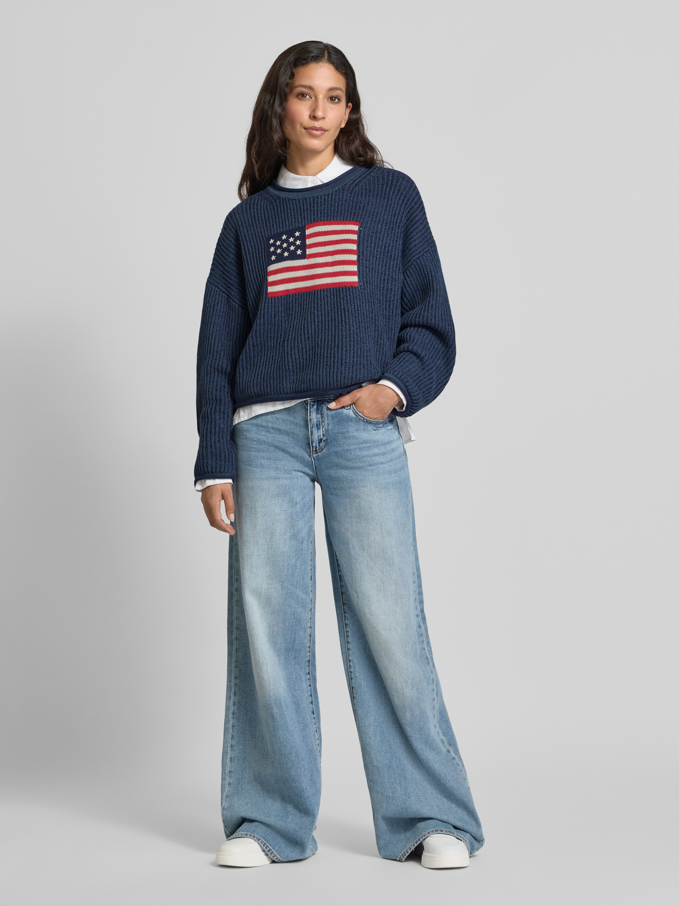 Sweter z dzianiny o kroju regular fit z wyhaftowanym motywem model ‘Americana’ - ciemnoniebieski