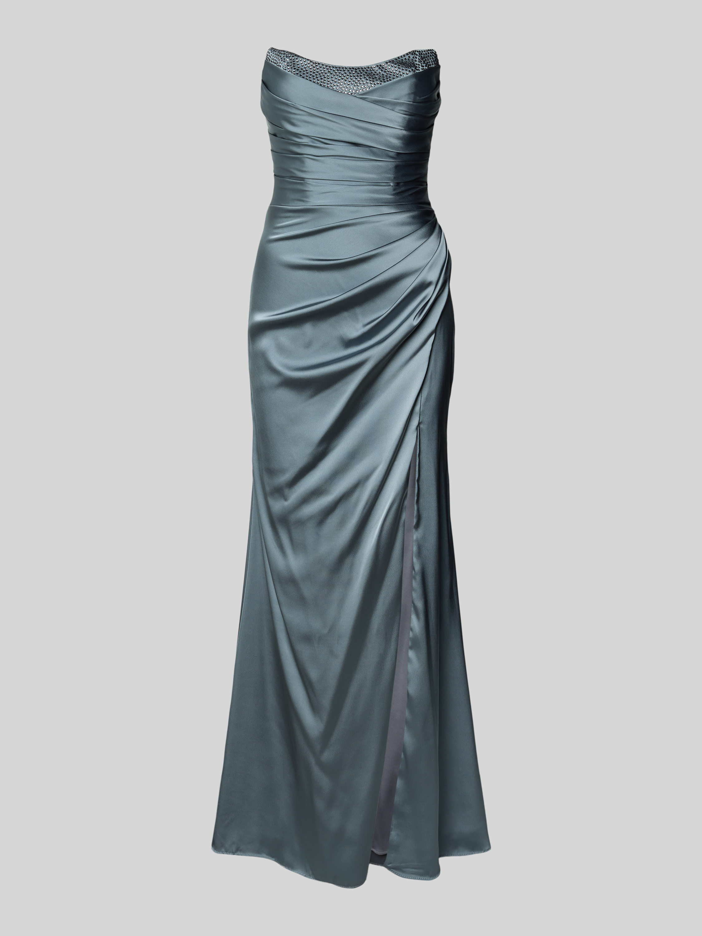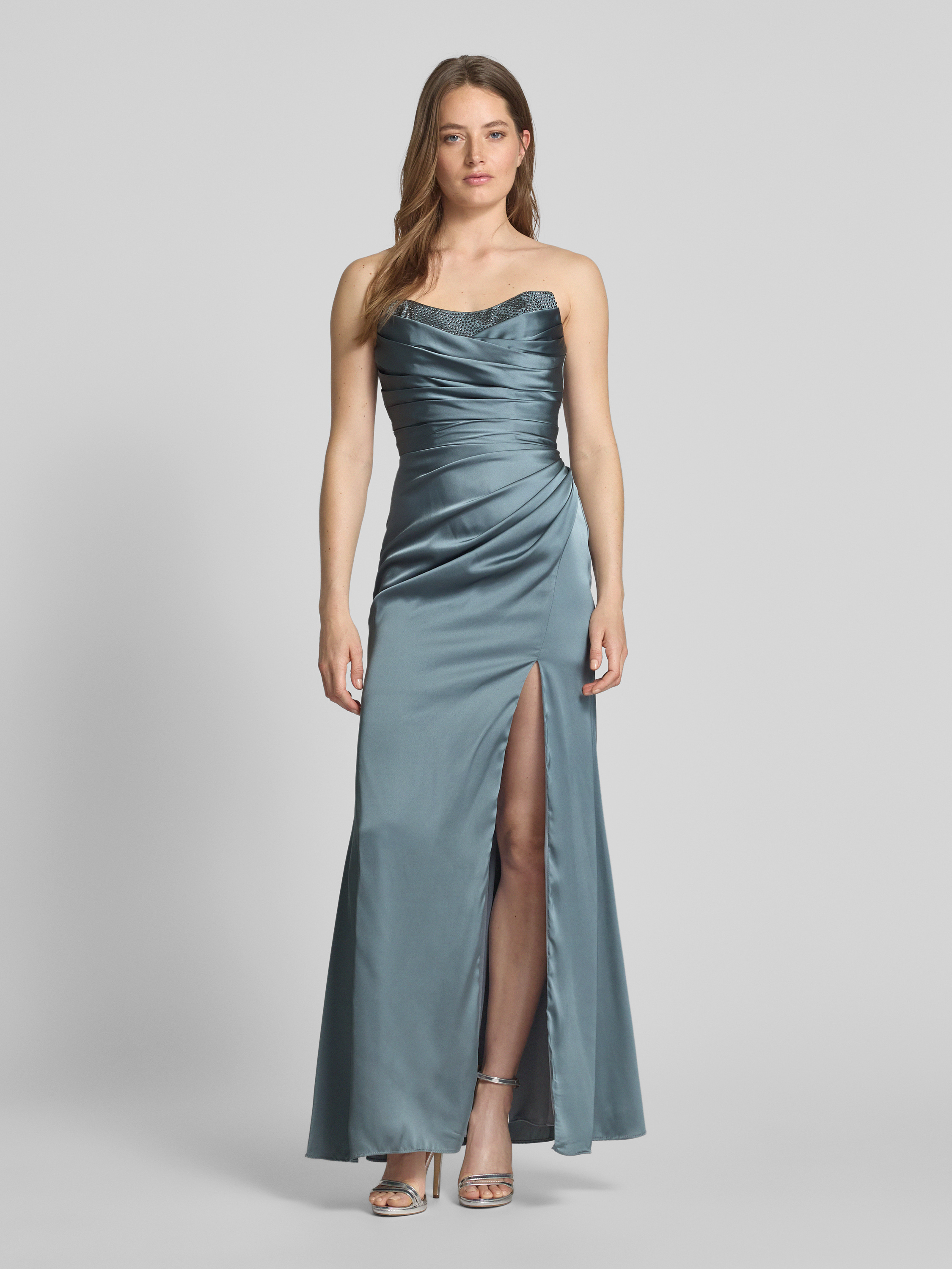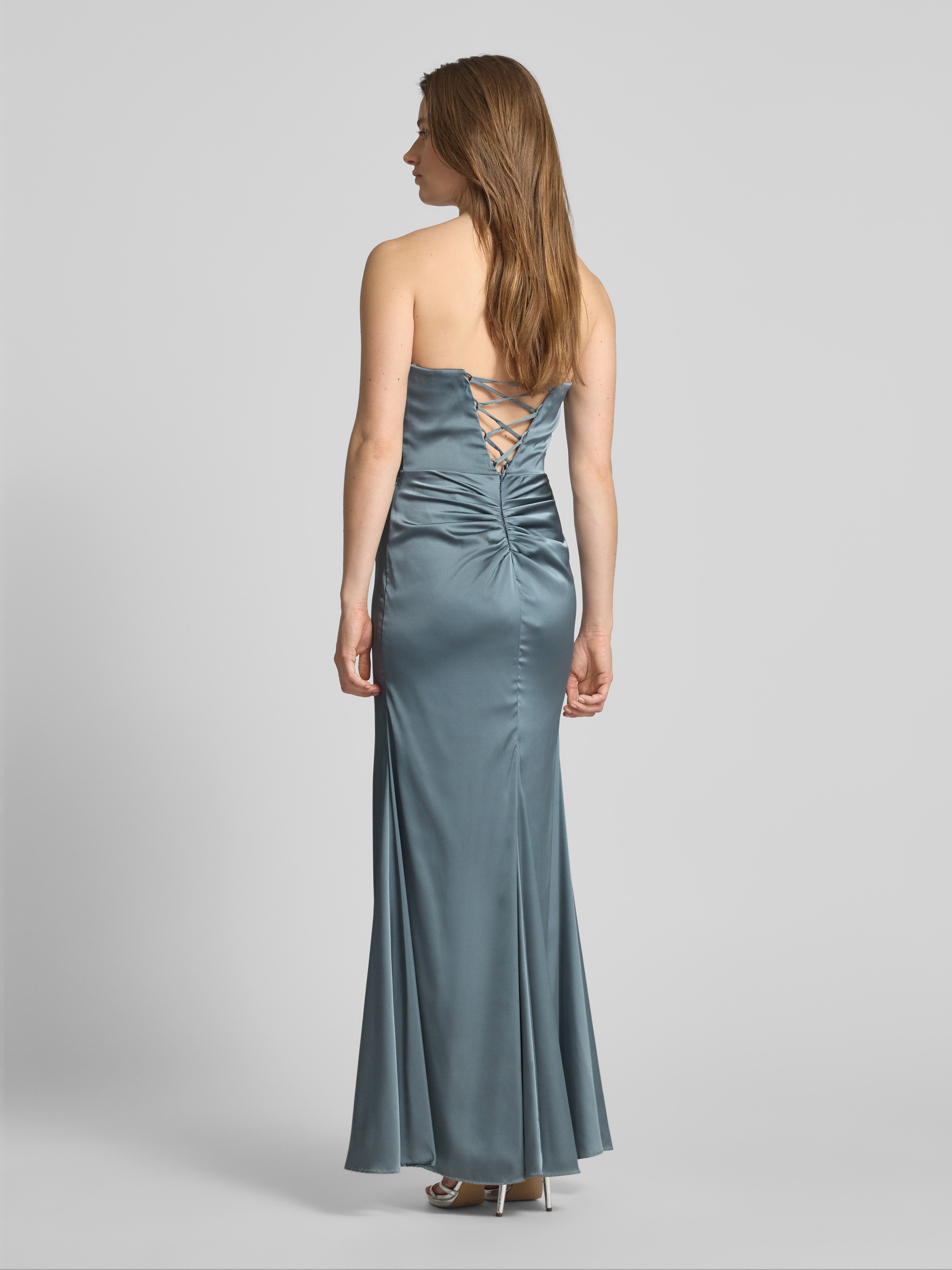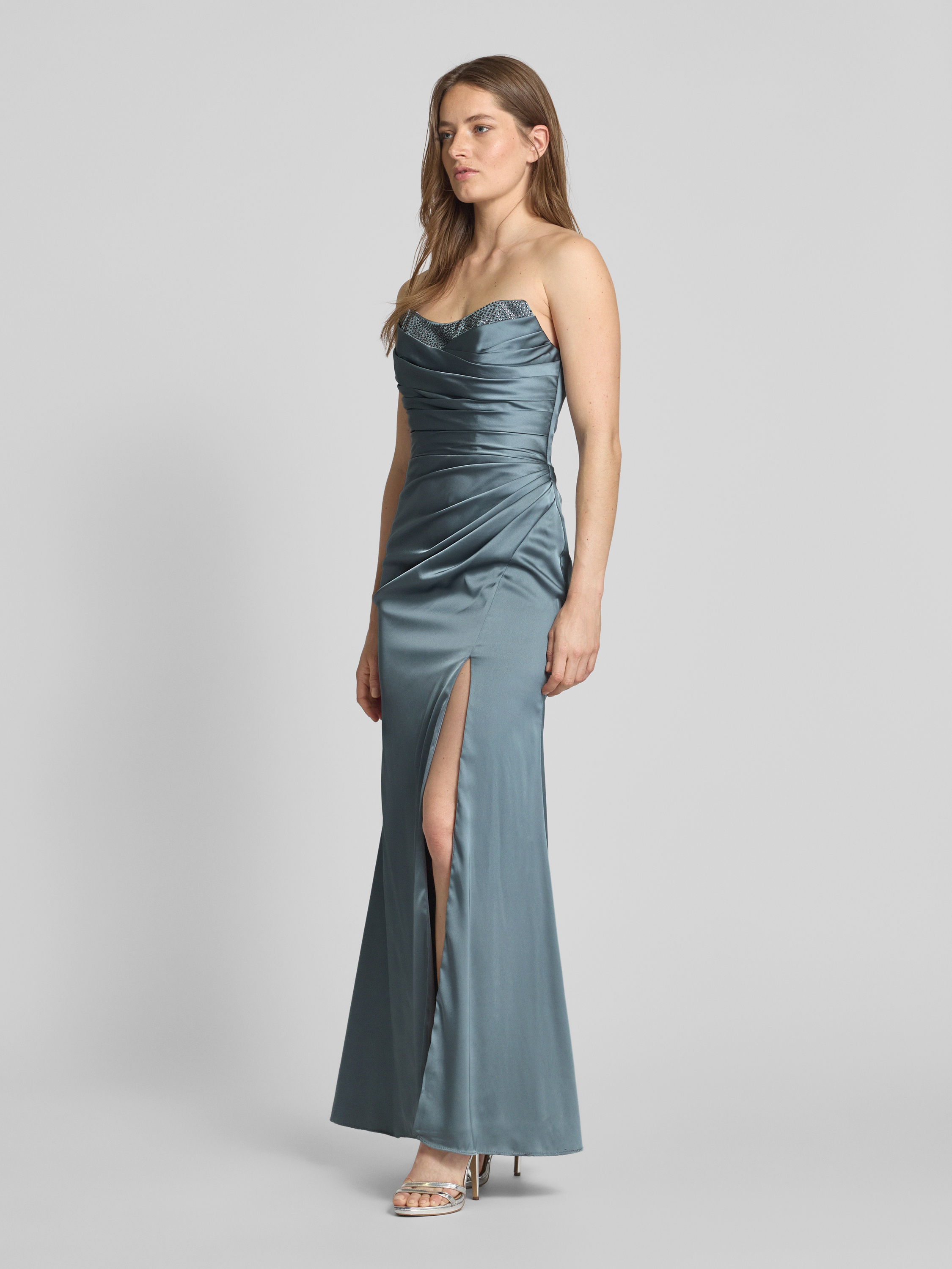 Sukienka z odkrytymi ramionami, obszyciem ozdobnymi kamieniami i marszczeniami - jasnoniebieski