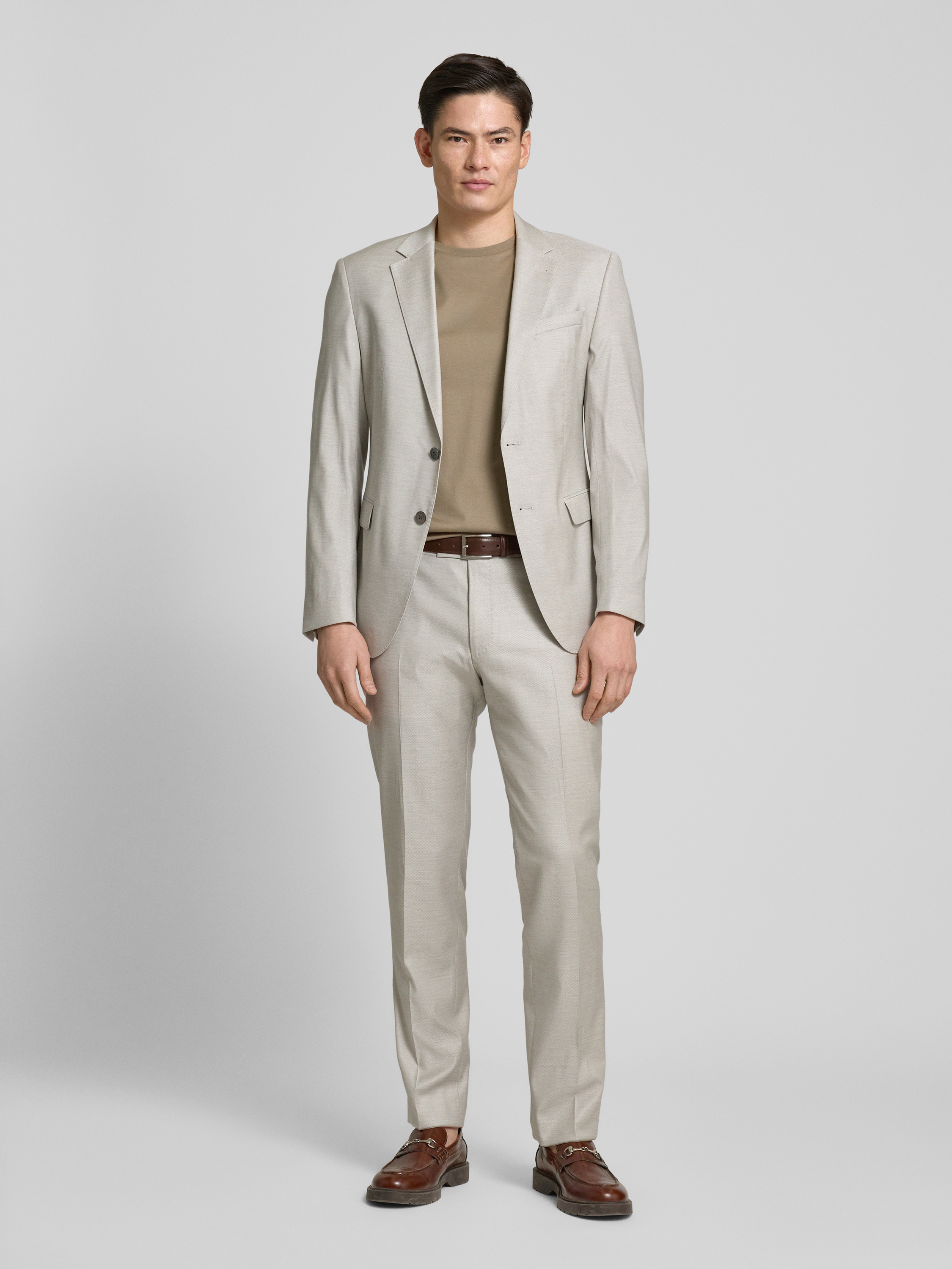 JOOP! CollectionSpodnie materiałowe męskie JOOP! Collection;Mieszanka wełny i wiskozy z dodatkiem streczu;Prosty krój;Model ‘Blayr’;Wpuszczane kieszenie w stylu francuskim;Zapięcie na haftkę i zamek błyskawiczny;Kieszenie z tyłu;Szerokość w pasie w rozmiarze 50: 45 cm;Długość wewnętrzna nogawki w rozmiarze 50: 80 cm