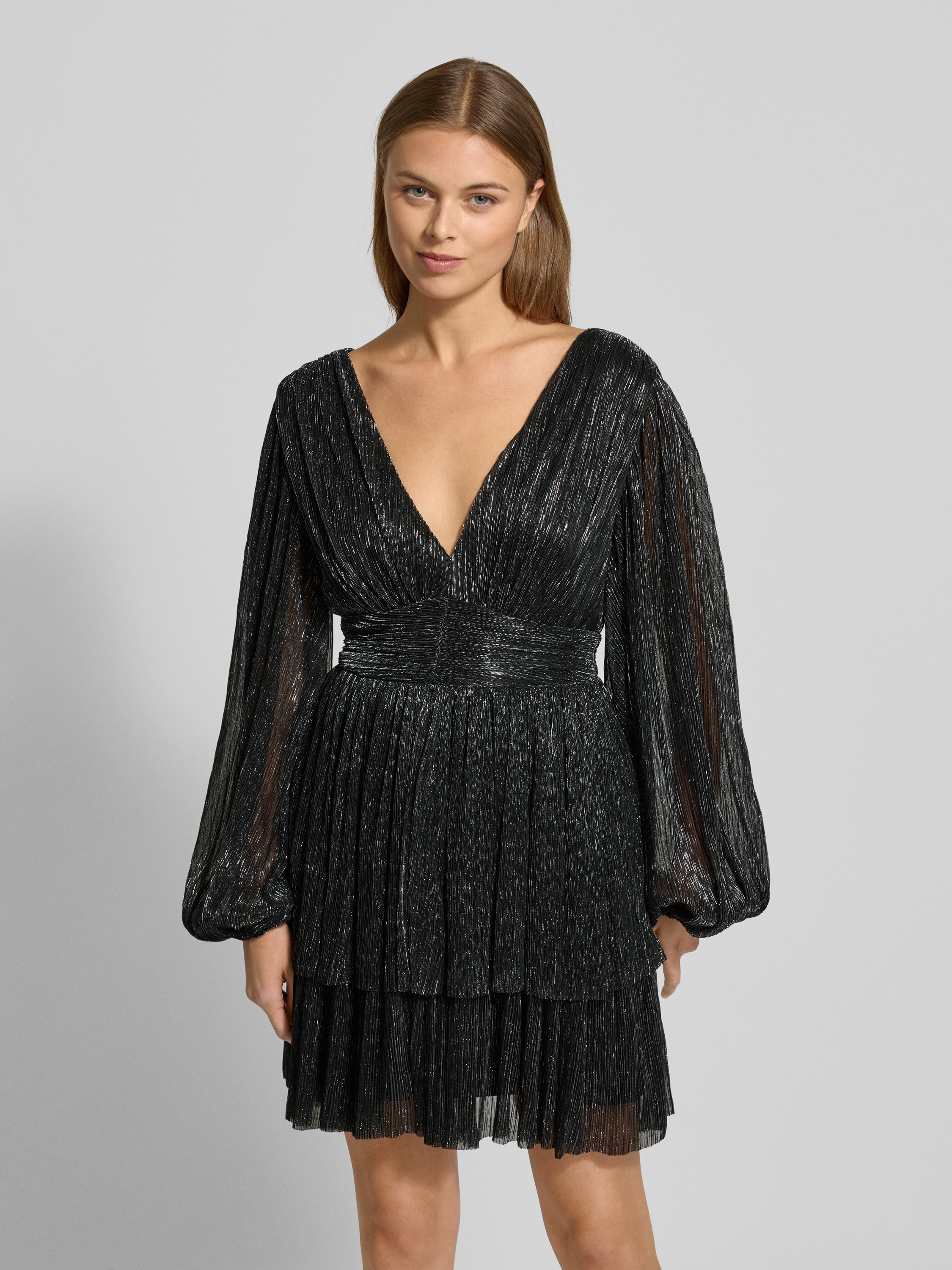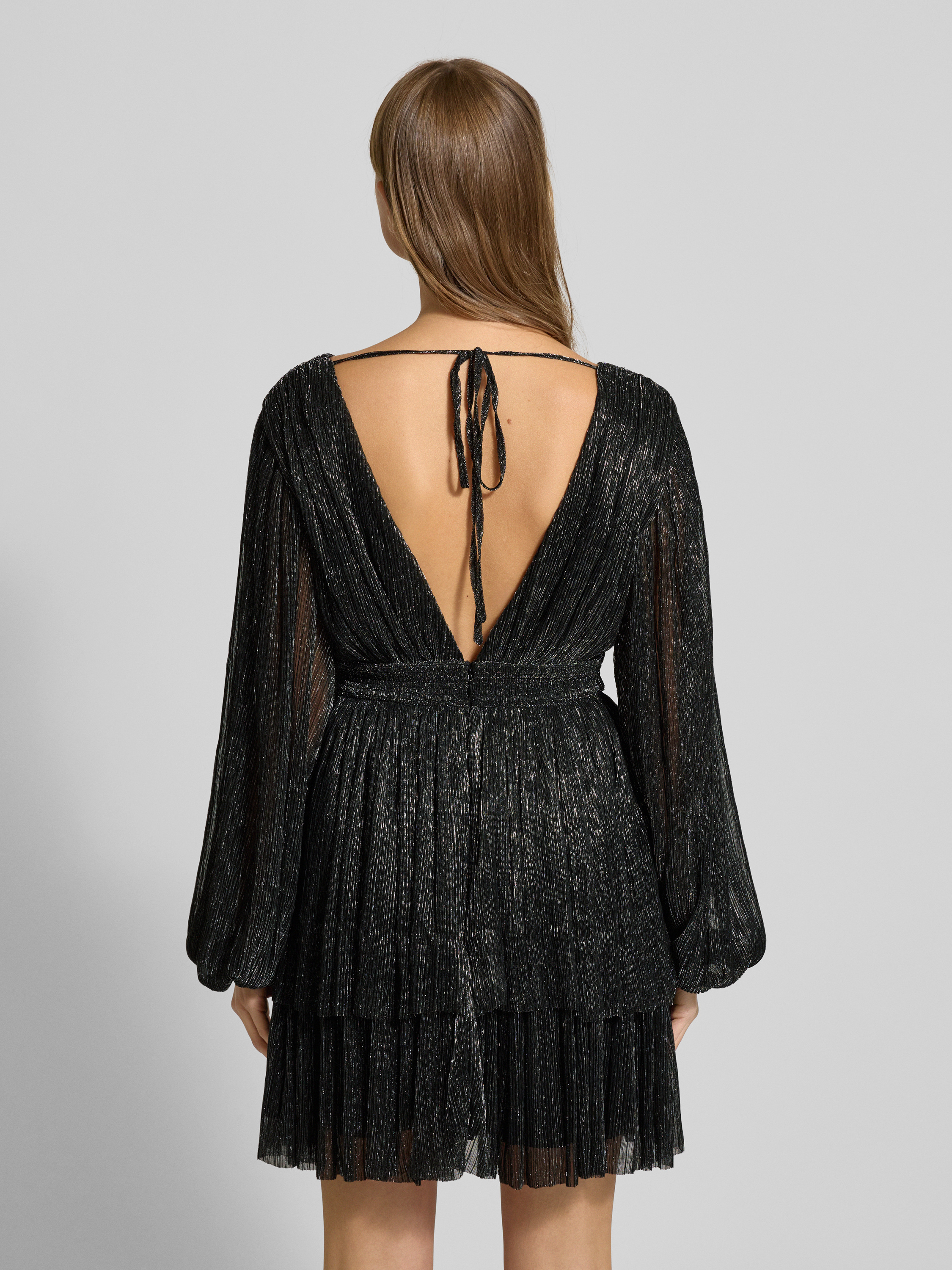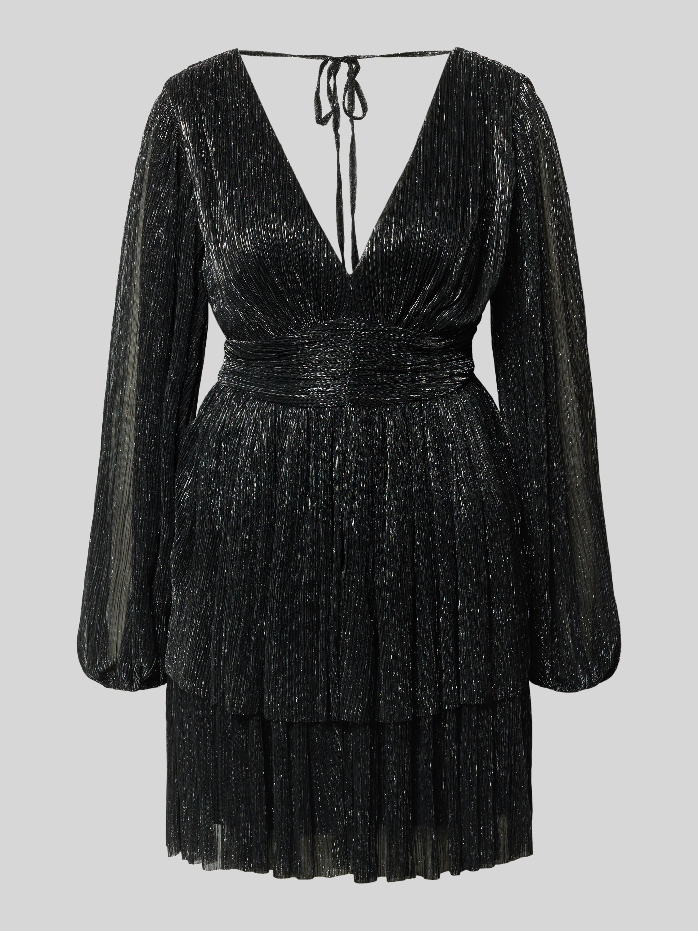 Sukienka koktajlowa błyszcząca z dekoltem w serek i tasiemką w talii - czarny
