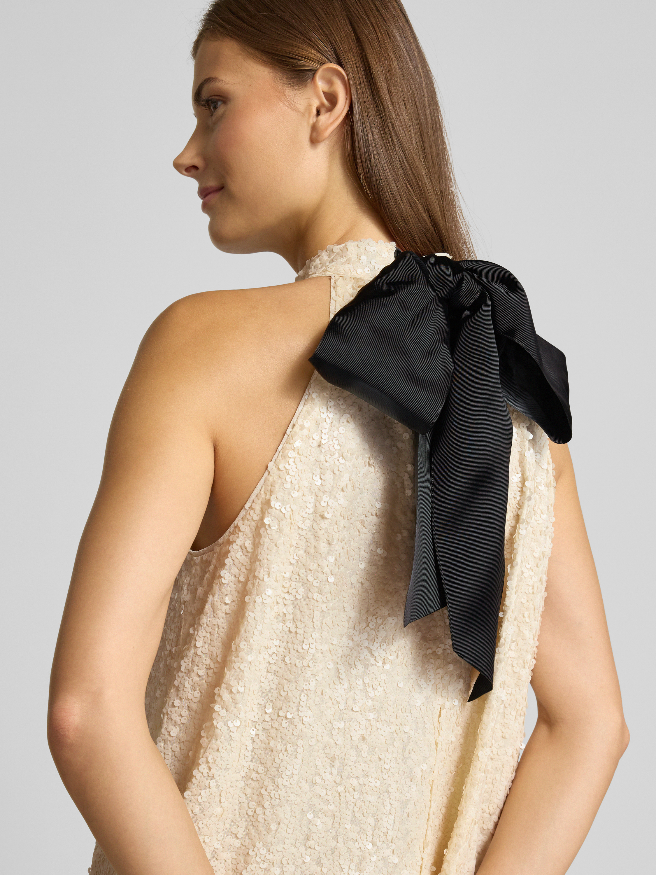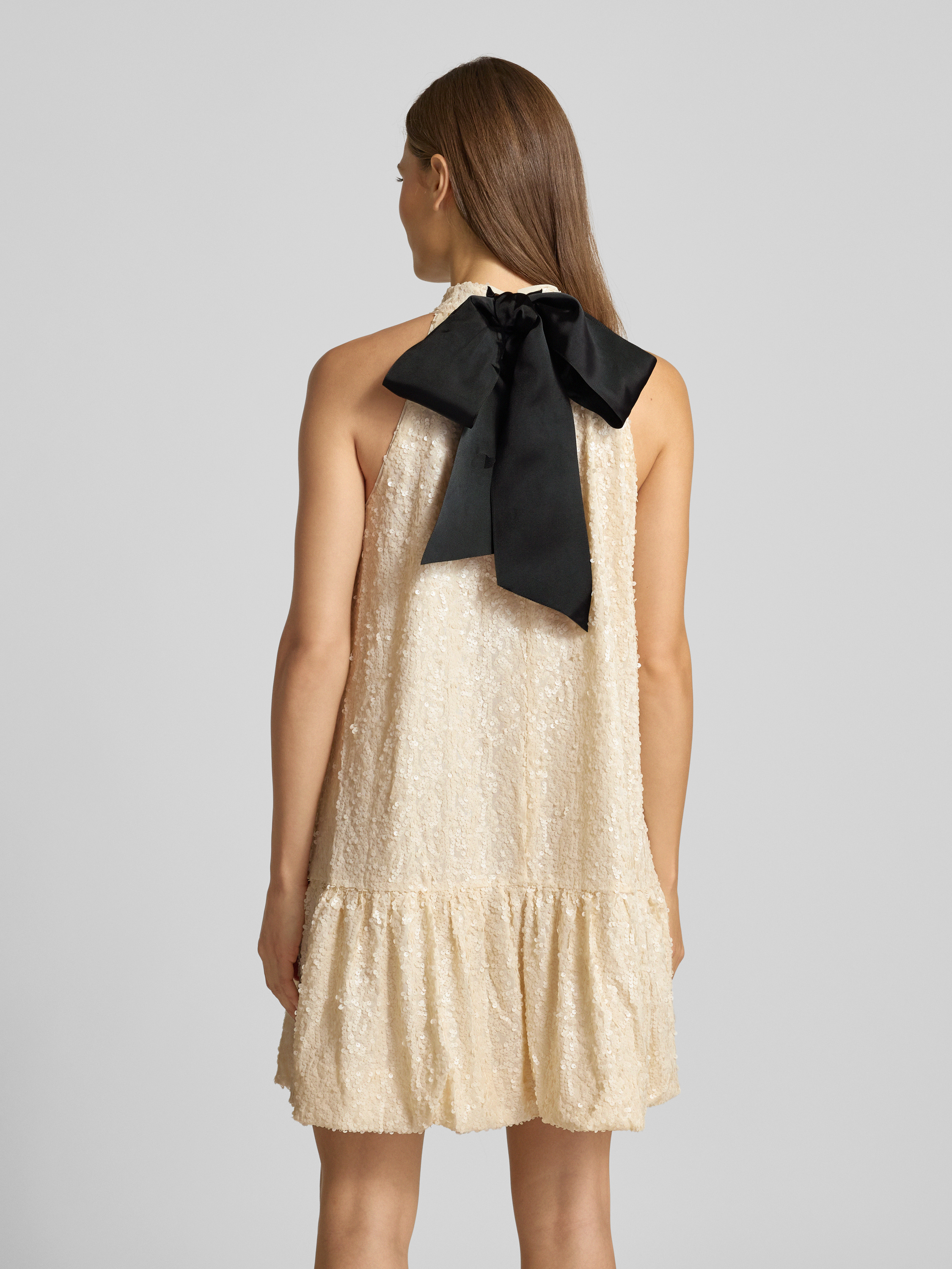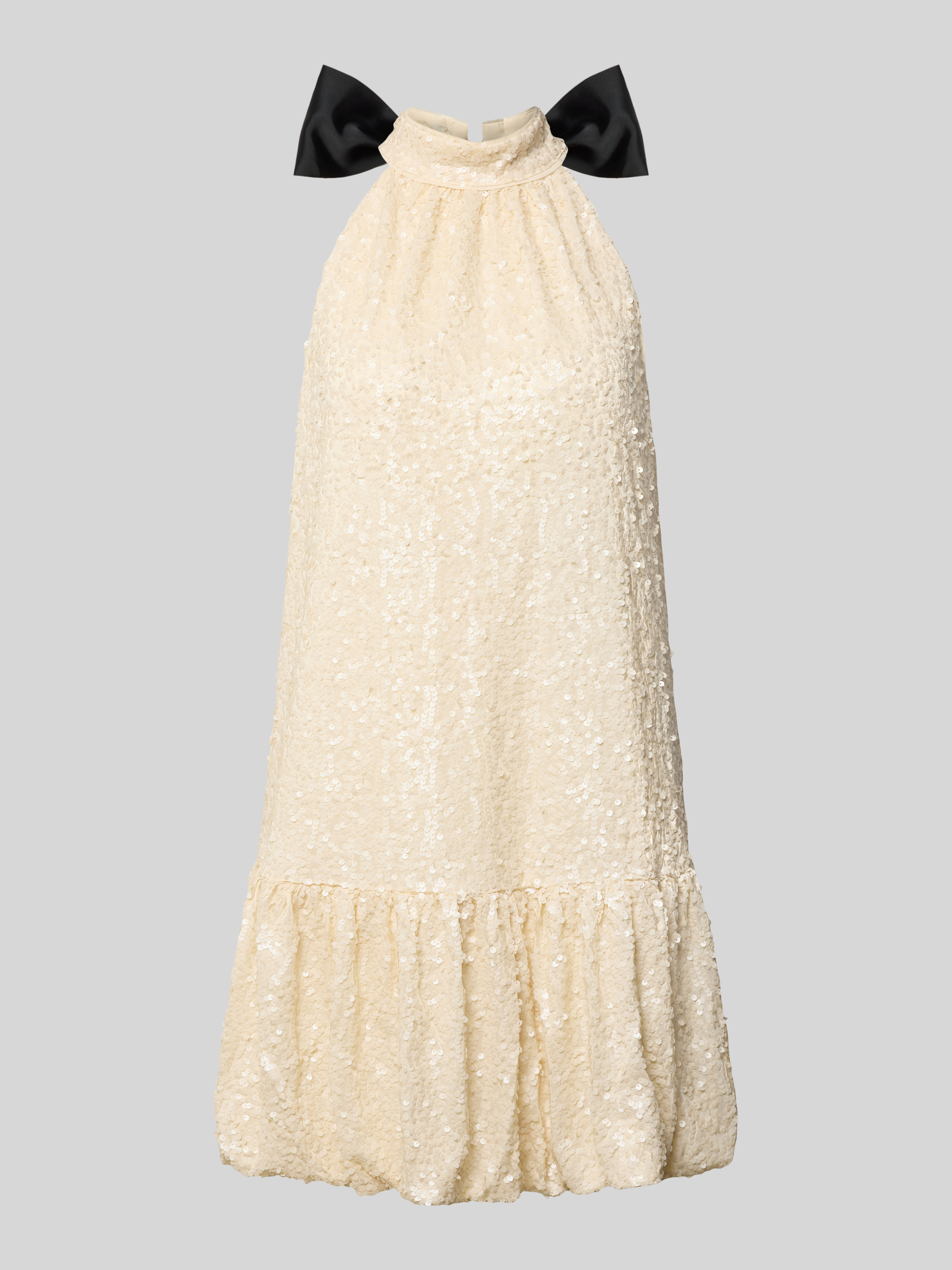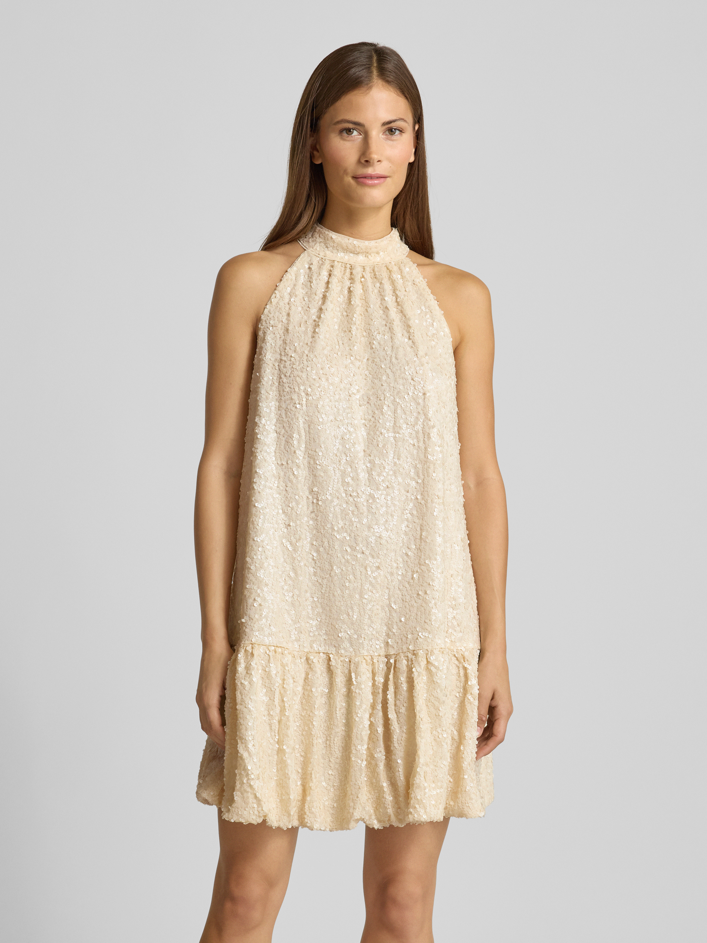 Sukienka koktajlowa z cekinami i stójką - beżowy melanż
