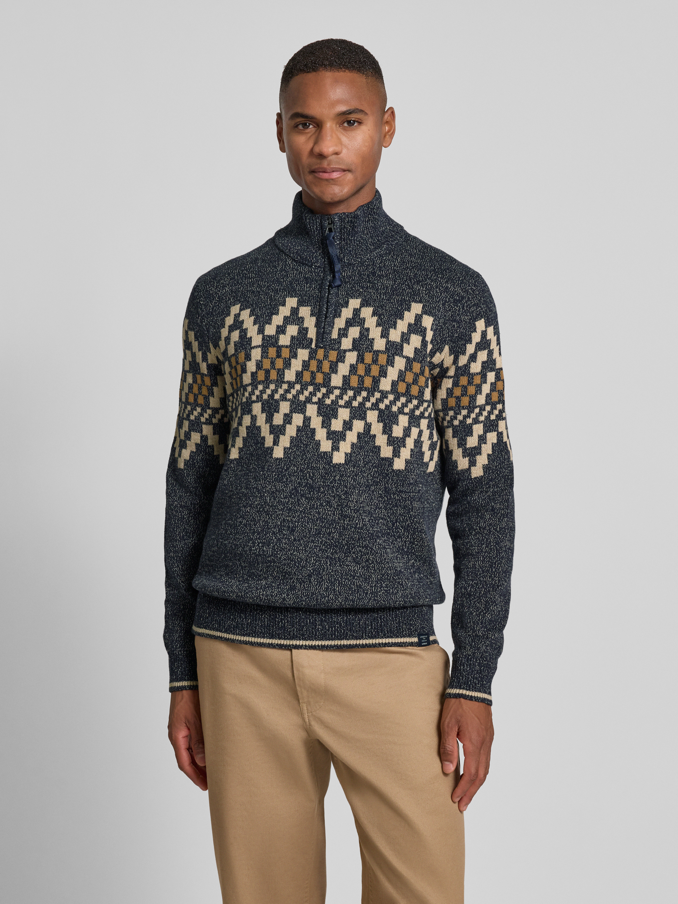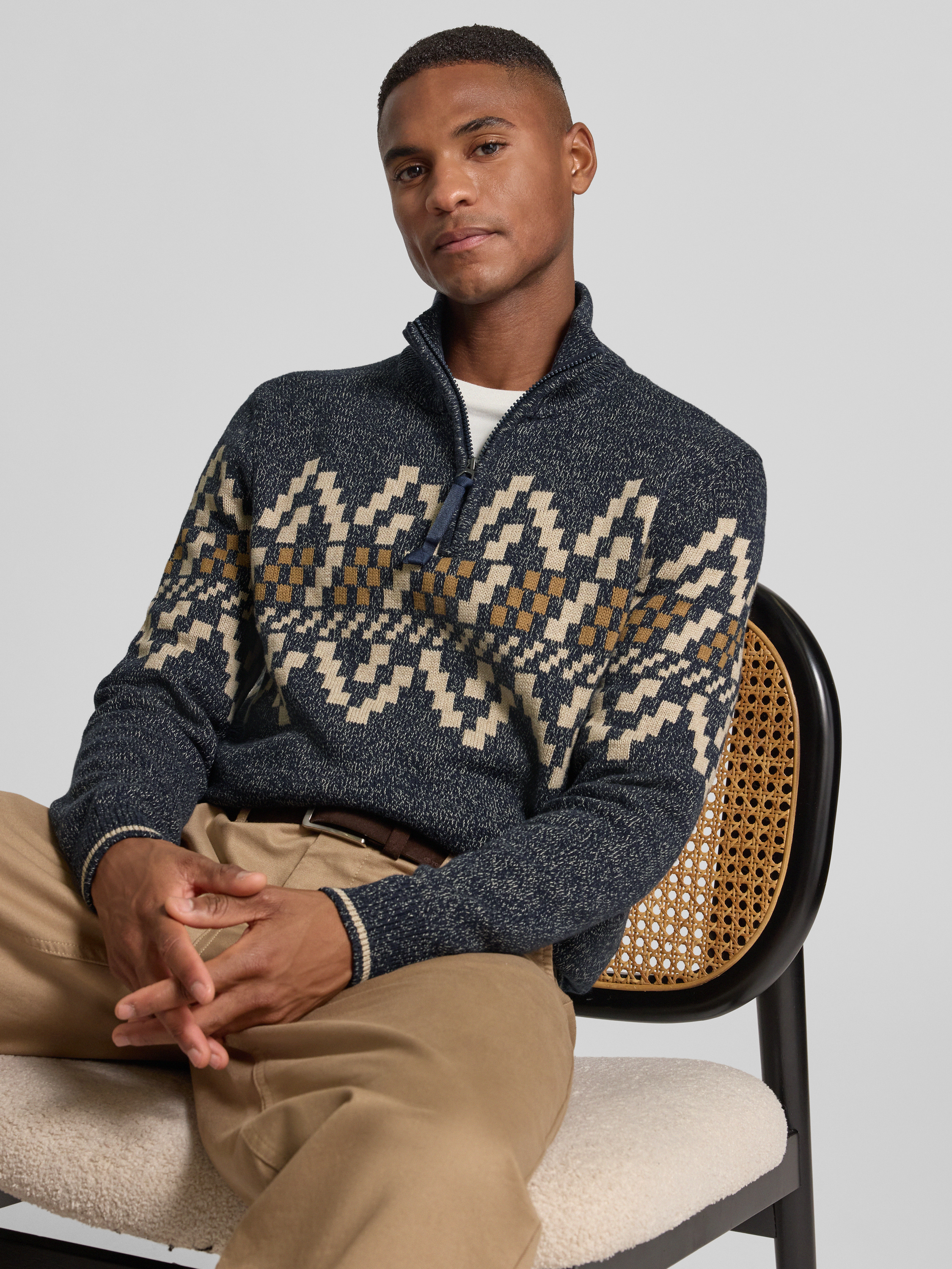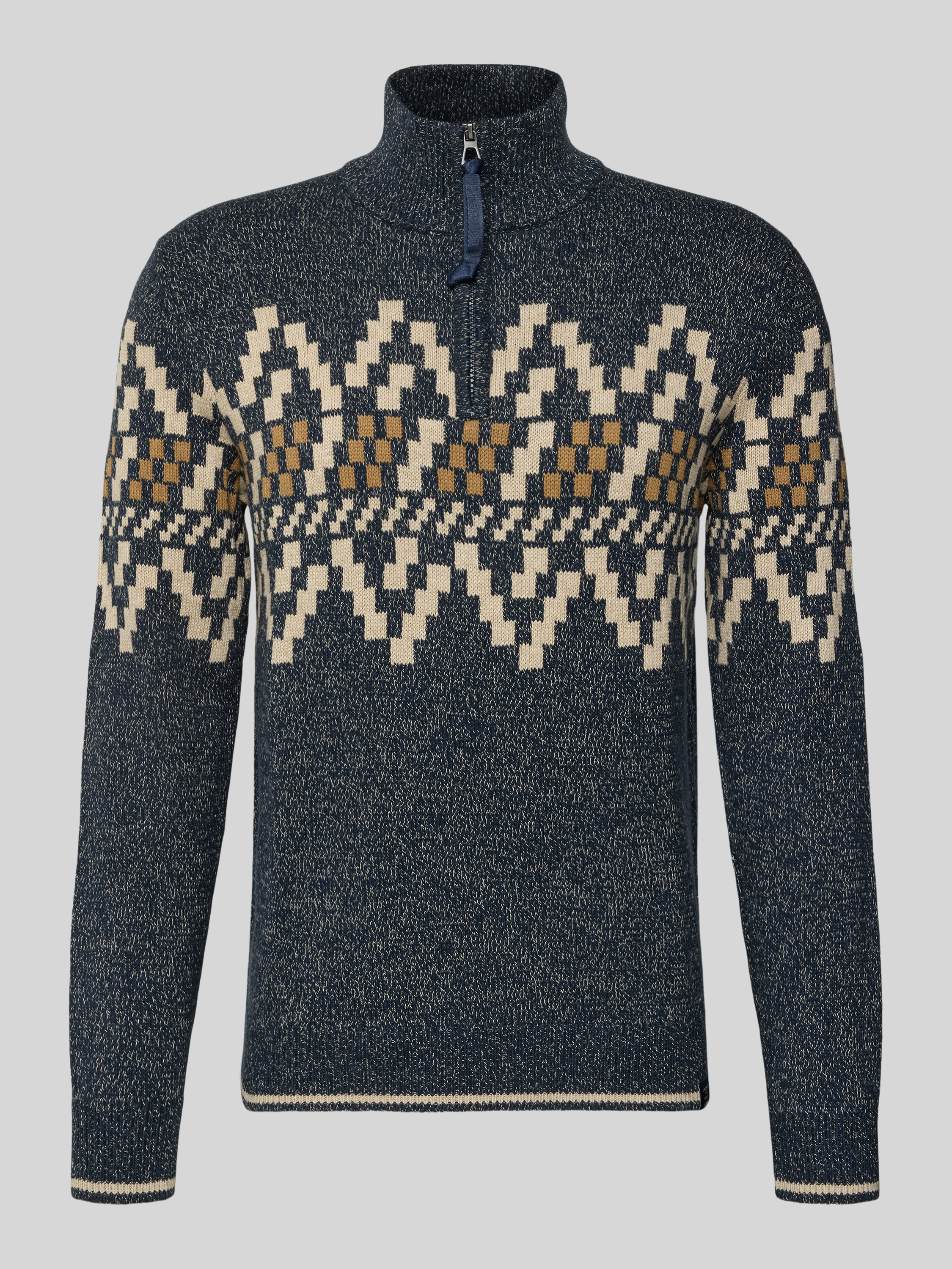 Sweter z dzianiny o kroju regular fit z kołnierzem zapinanym - ciemnoniebieski
