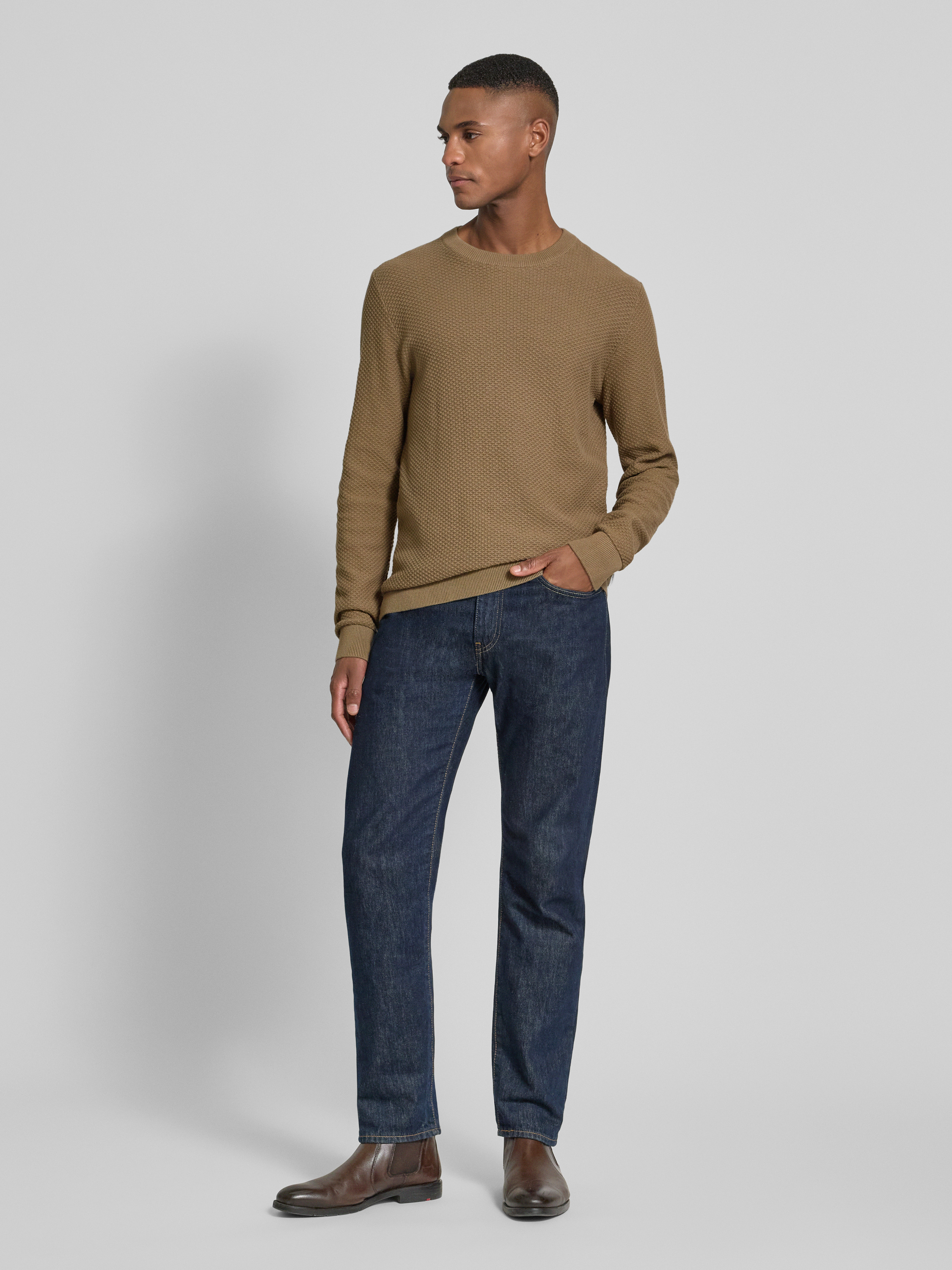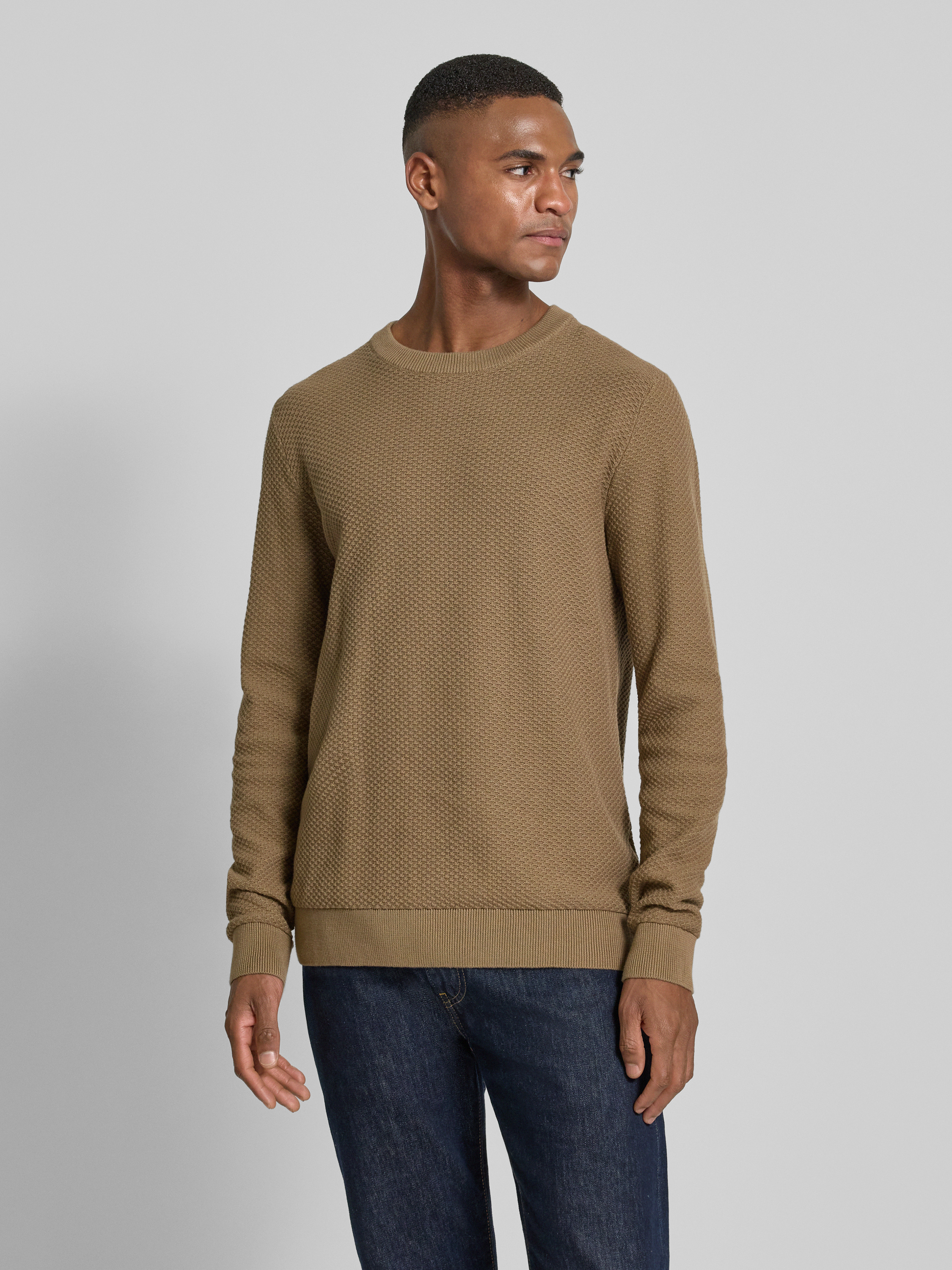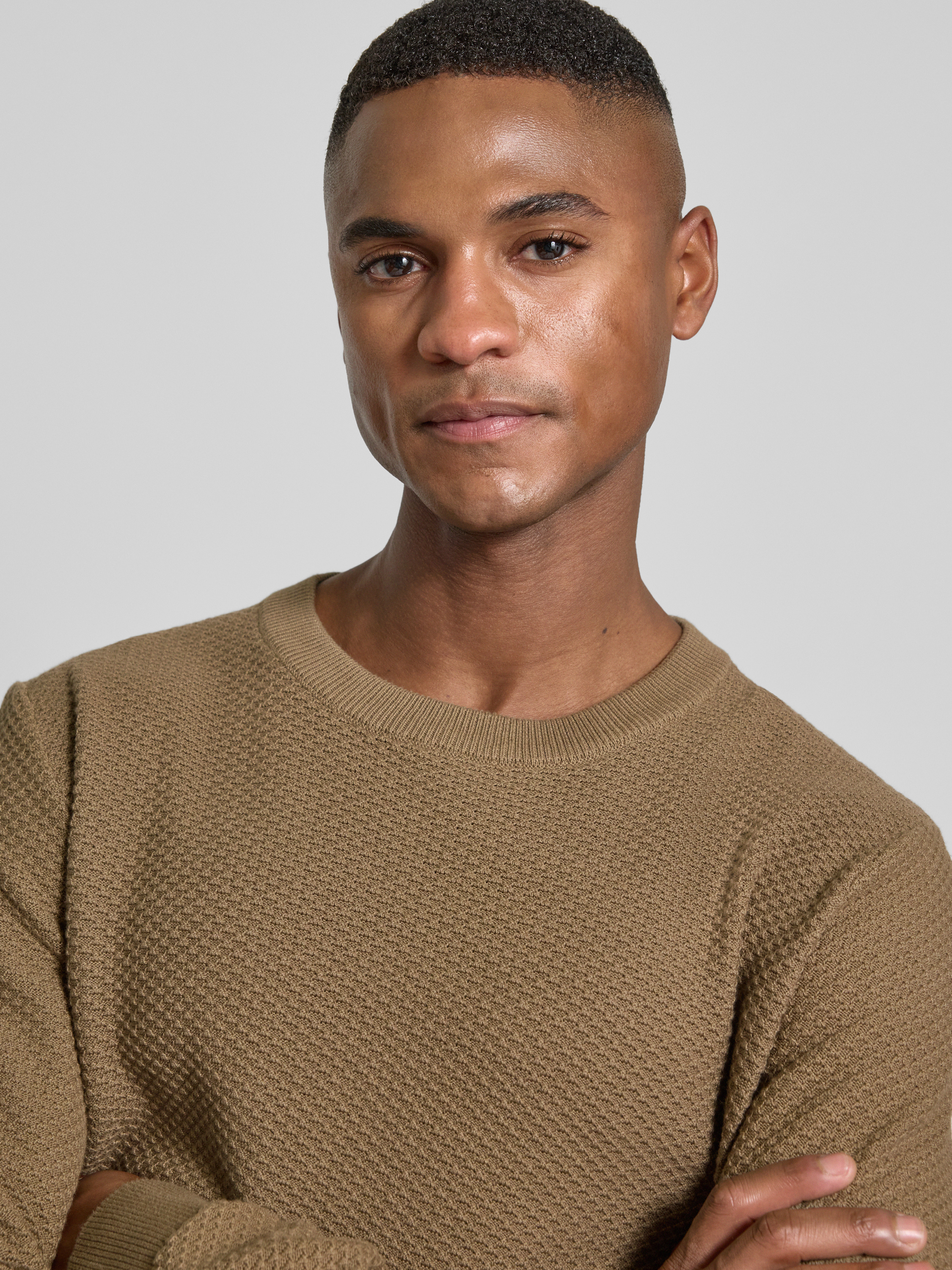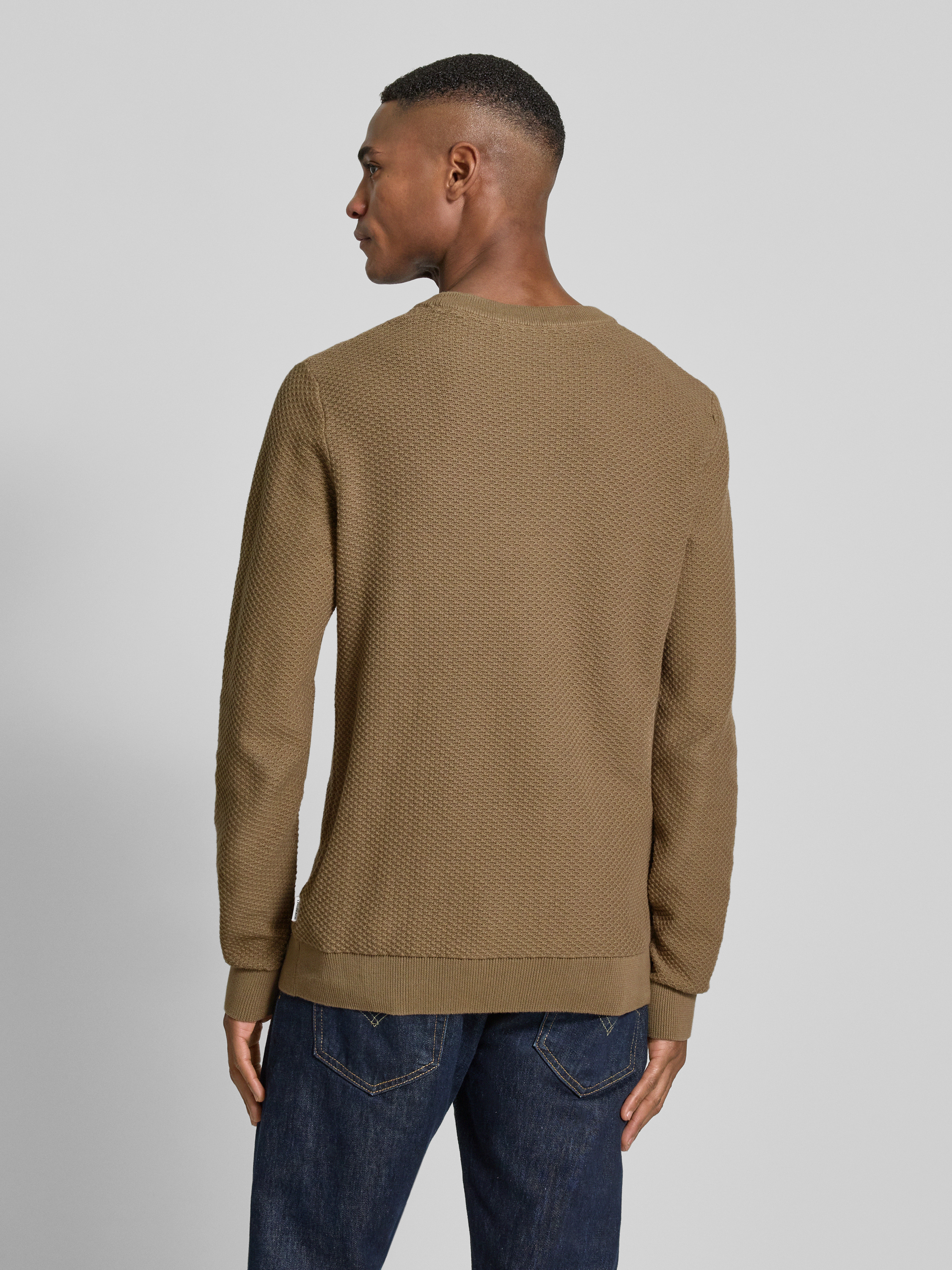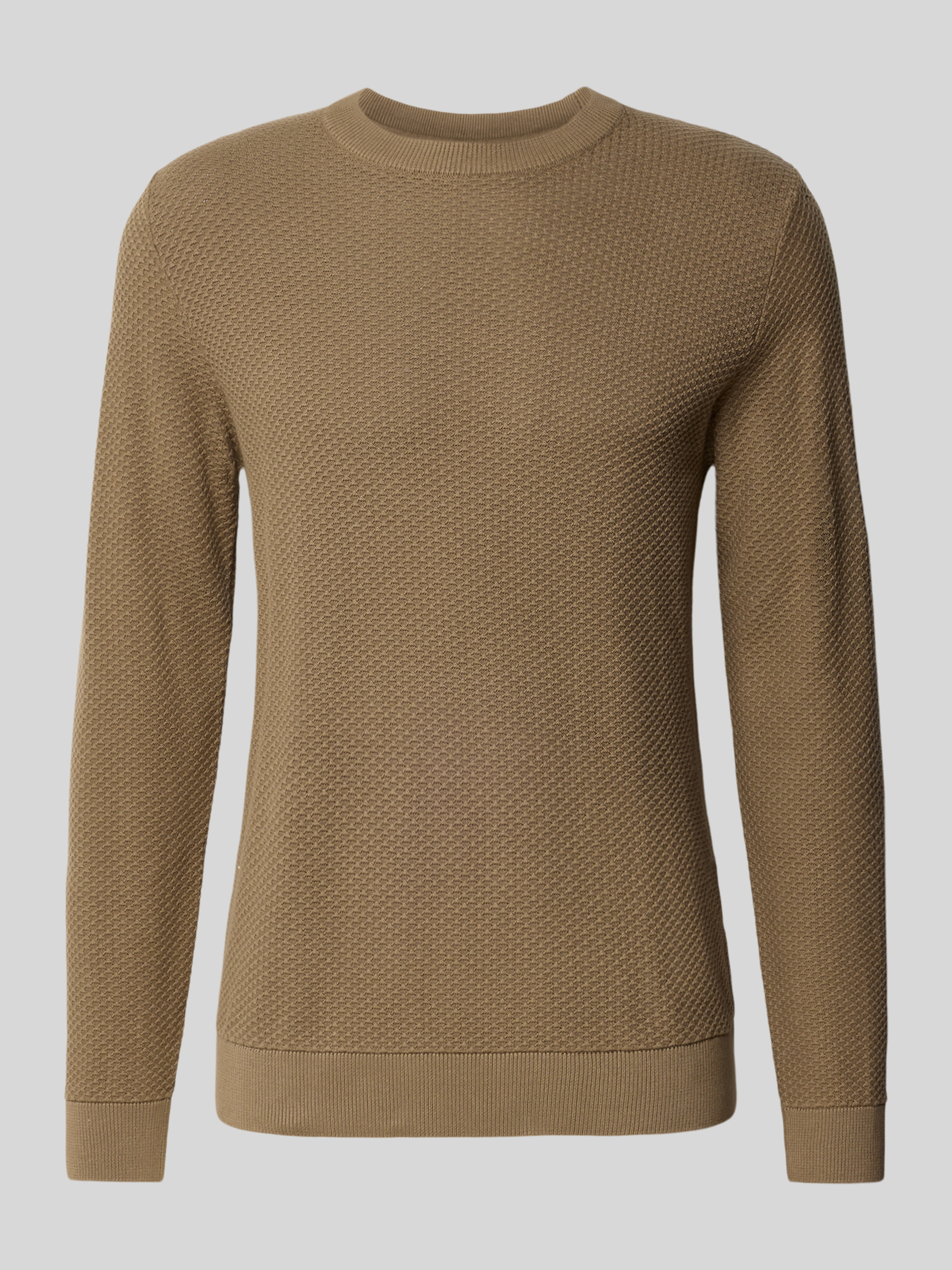 Sweter z dzianiny z fakturowanym wzorem i okrągłym dekoltem - camel
