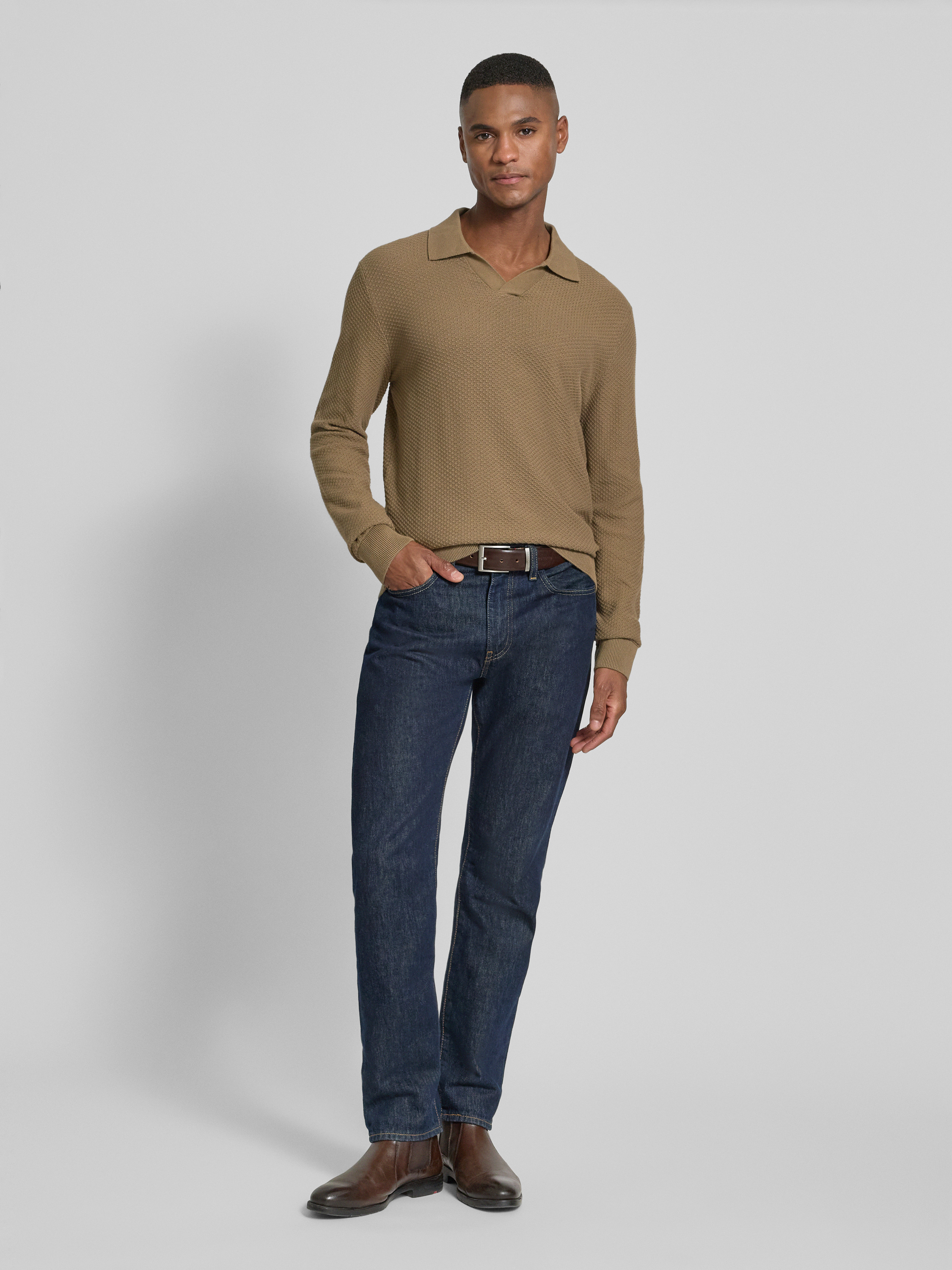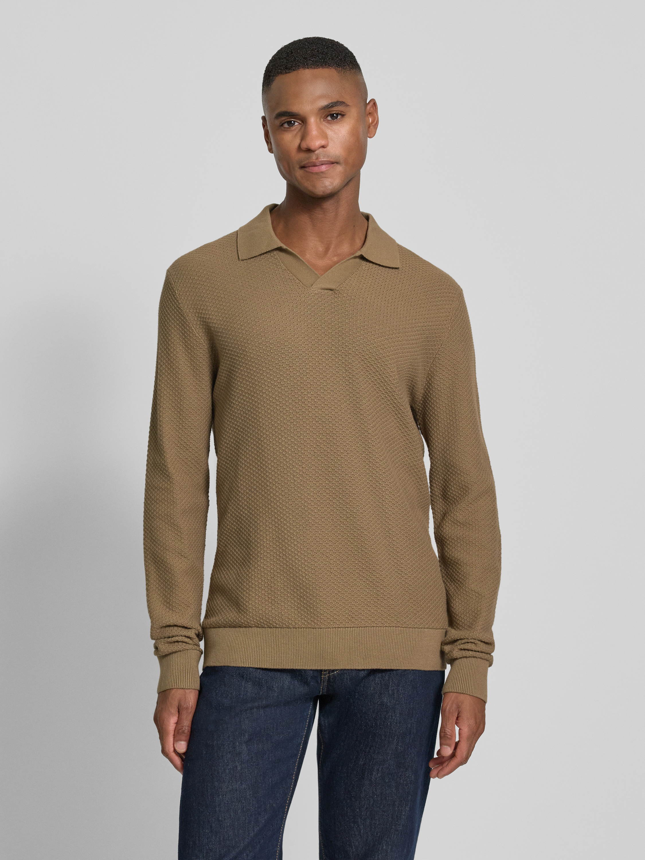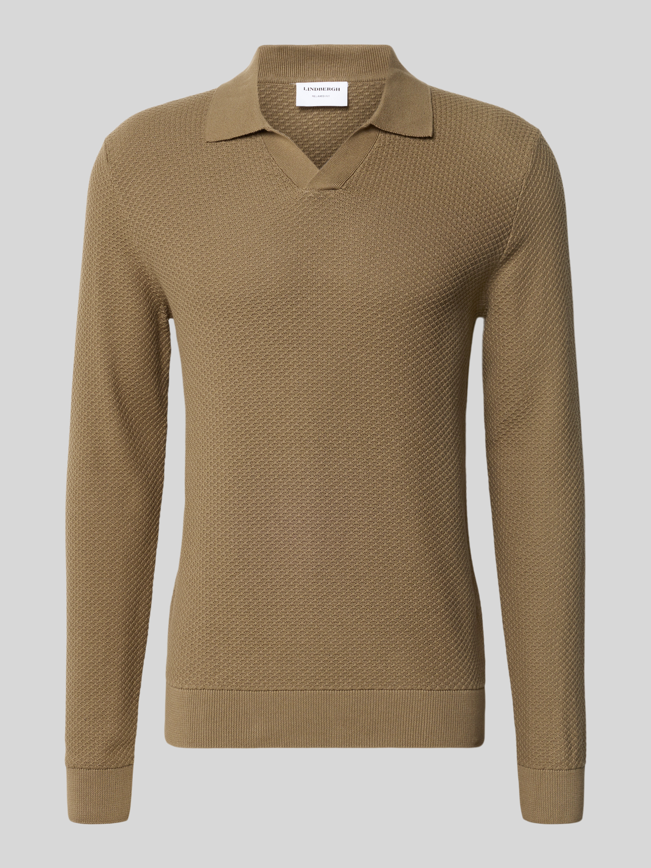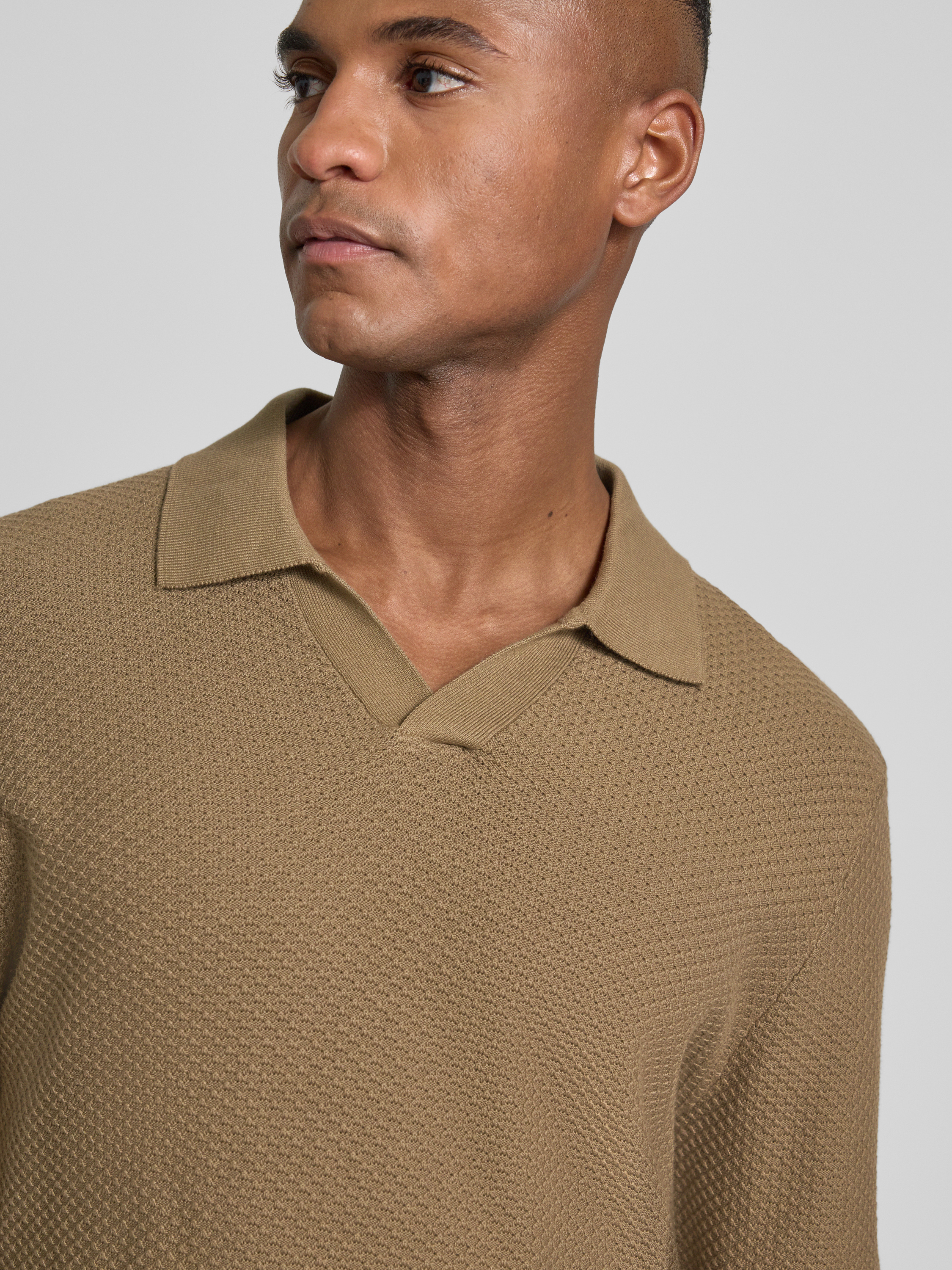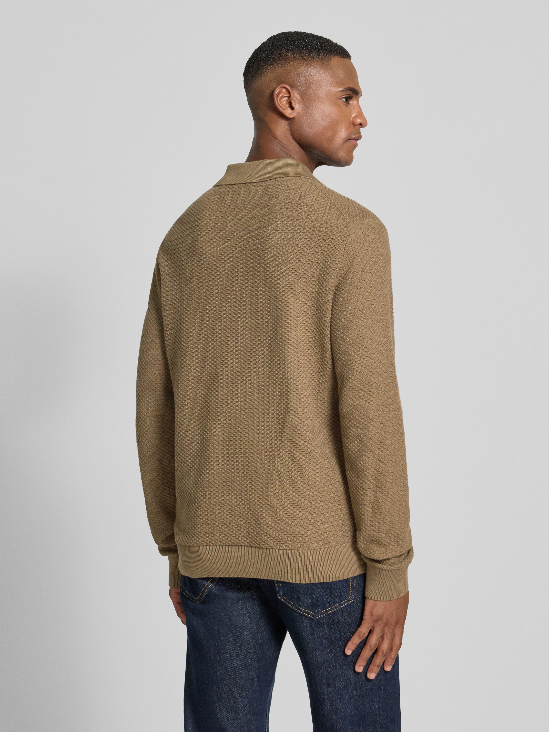 Sweter z dzianiny z fakturowanym wzorem i wykładanym kołnierzem - camel