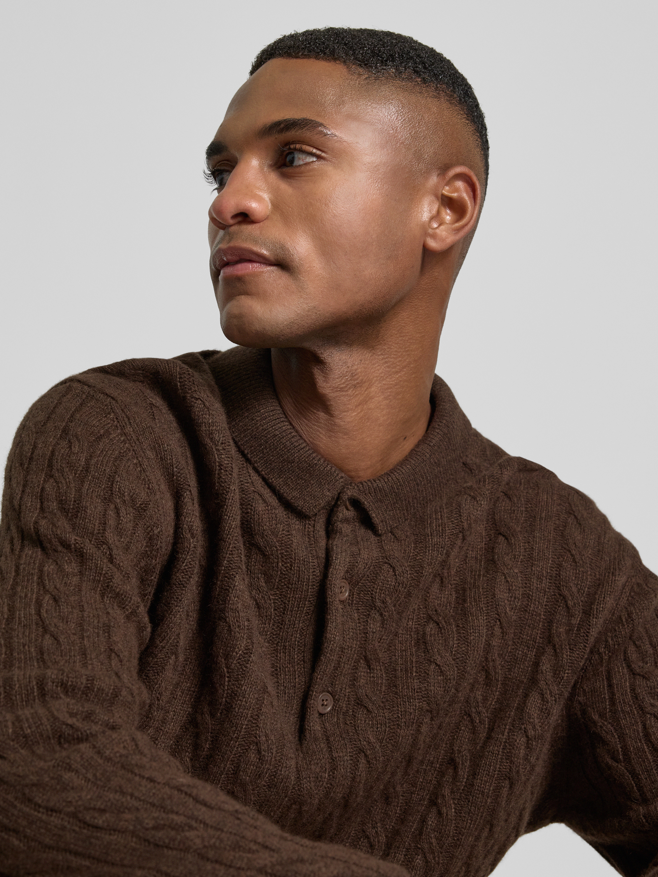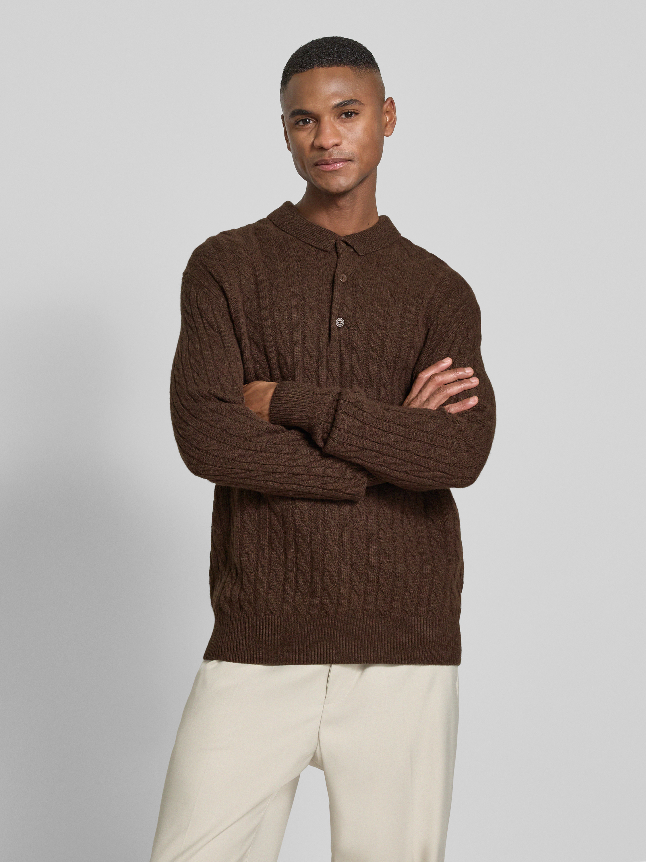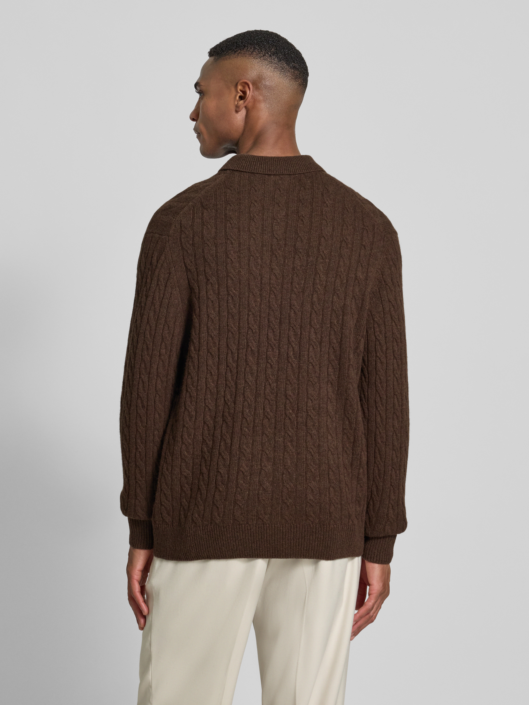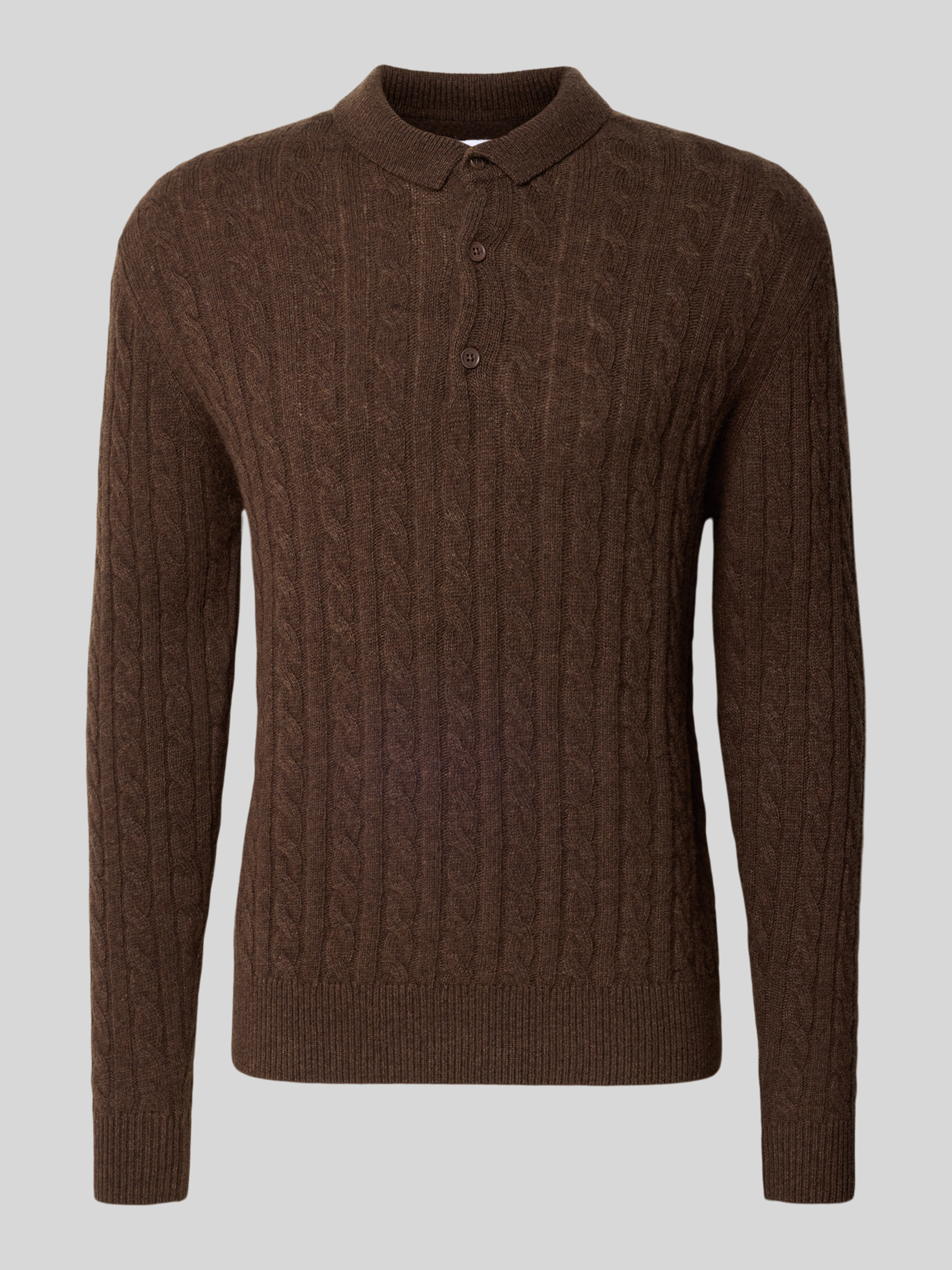 Sweter z dzianiny z mieszanki lnu z kołnierzykiem polo - ciemnobrązowy
