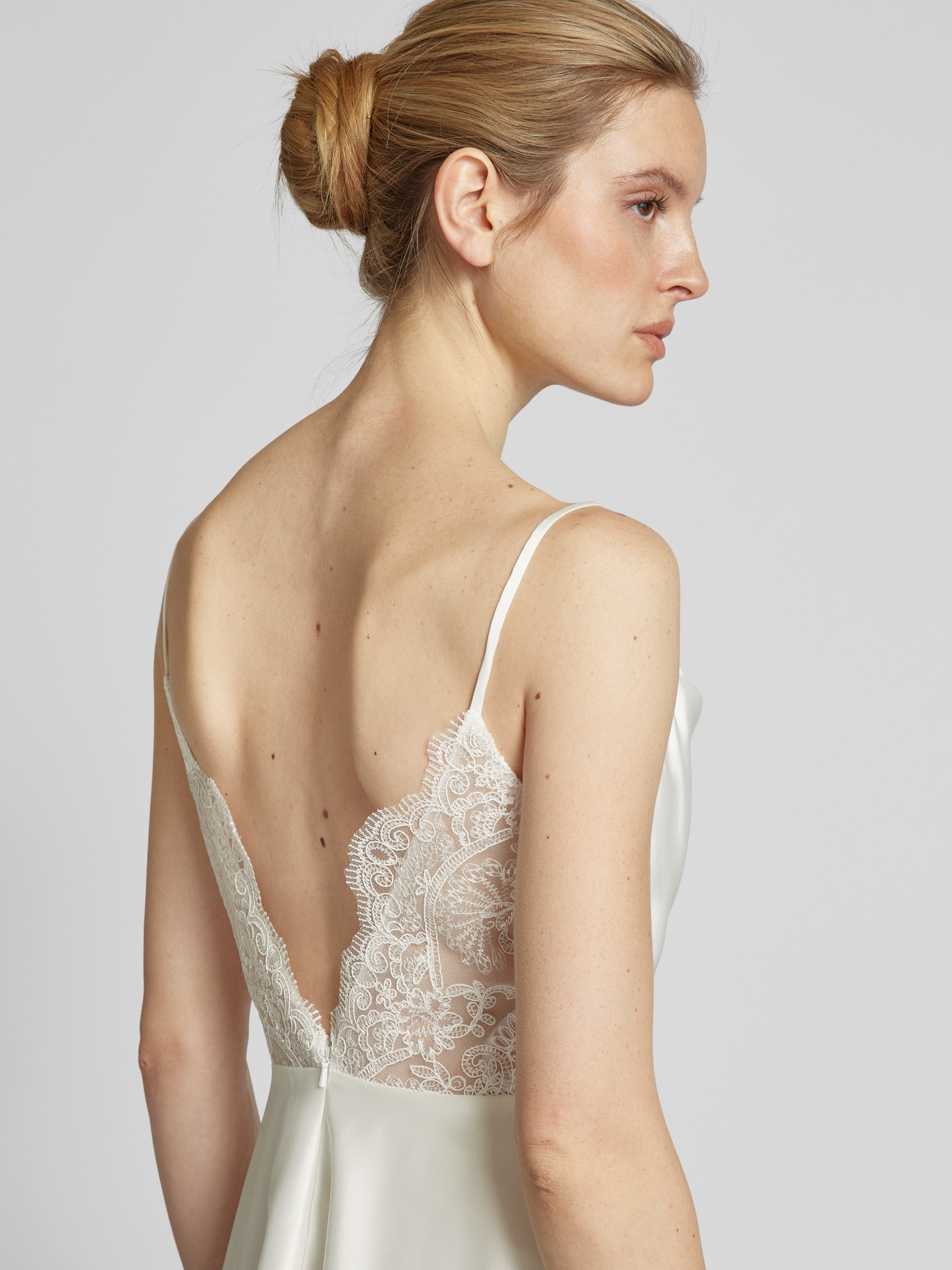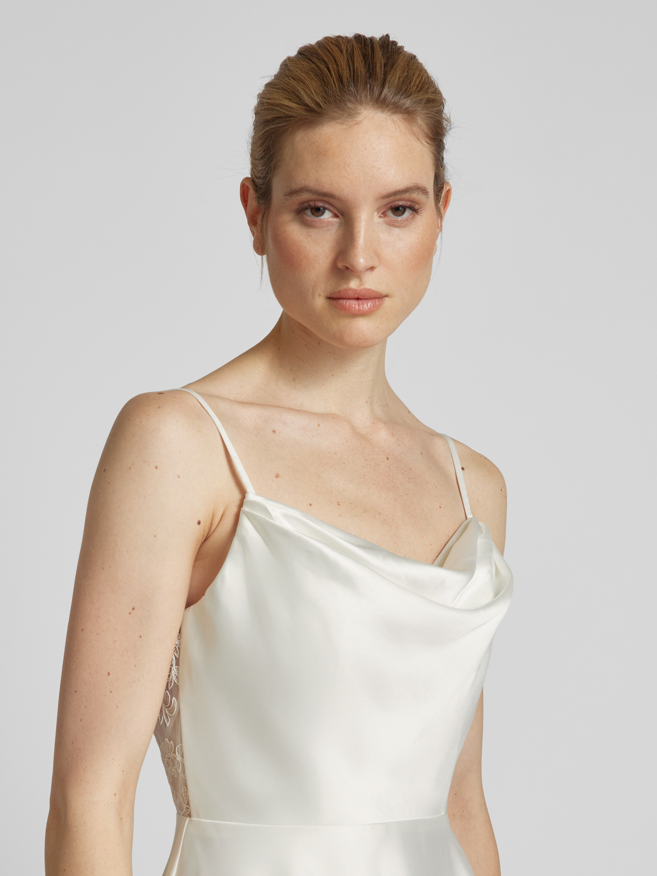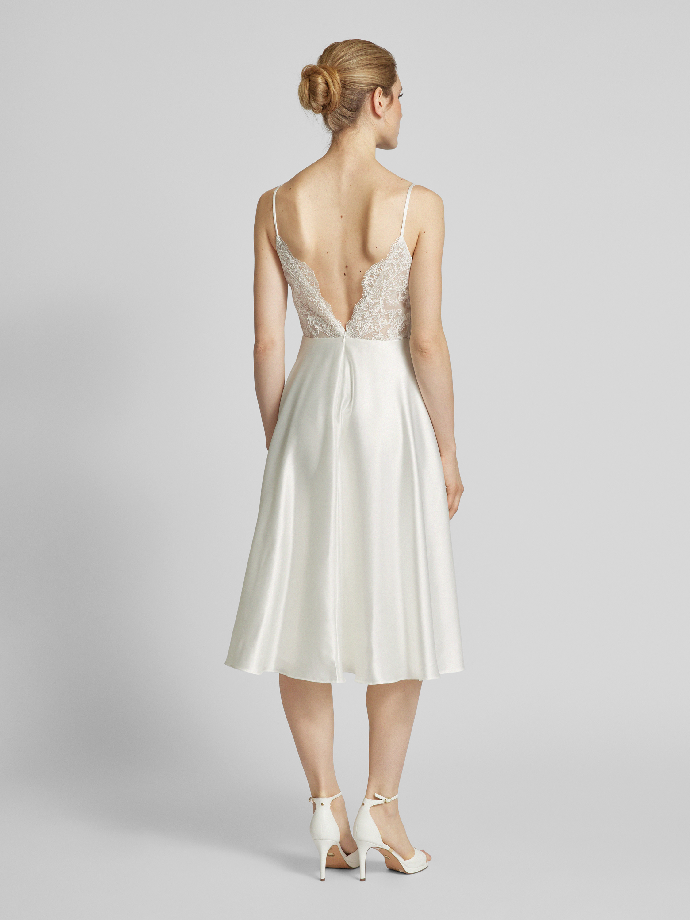 Sukienka koktajlowa suknia ślubna o długości do kolan z lejącym dekoltem - złamany biały