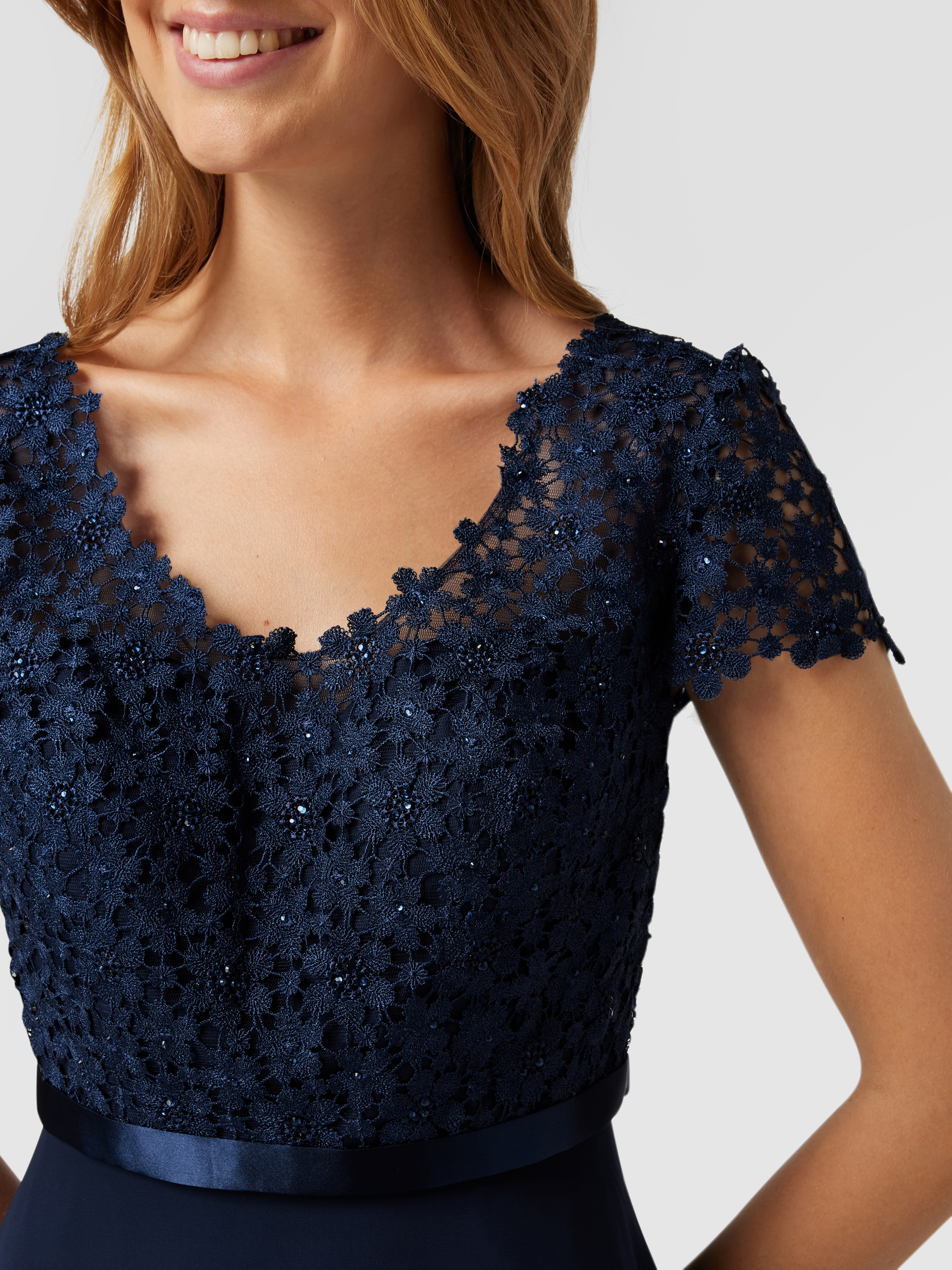 Sukienka koktajlowa z ozdobnymi kamieniami i kwiatowymi haftami - ciemnoniebieski