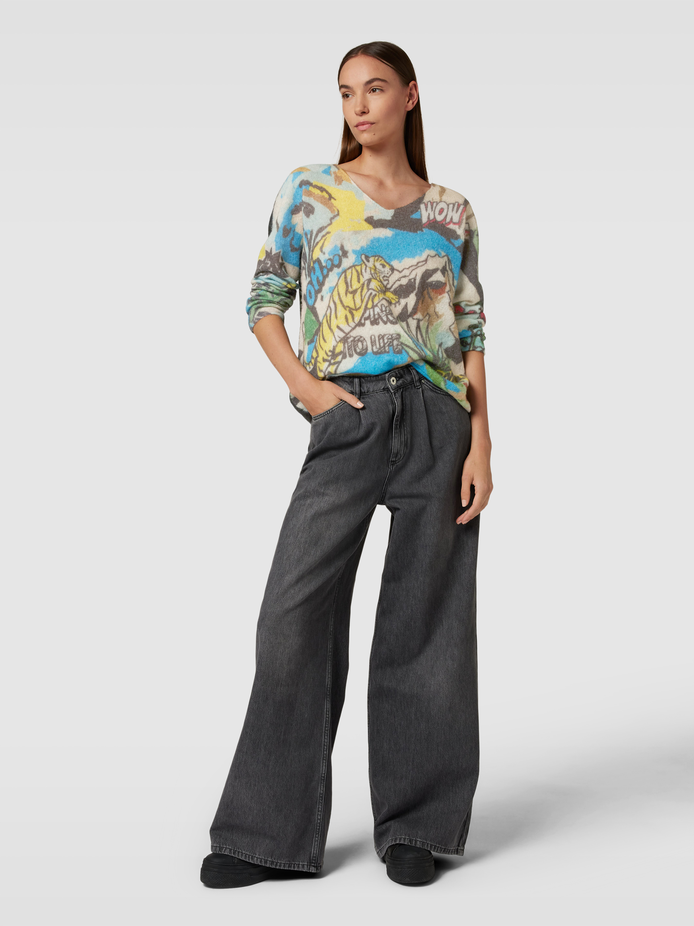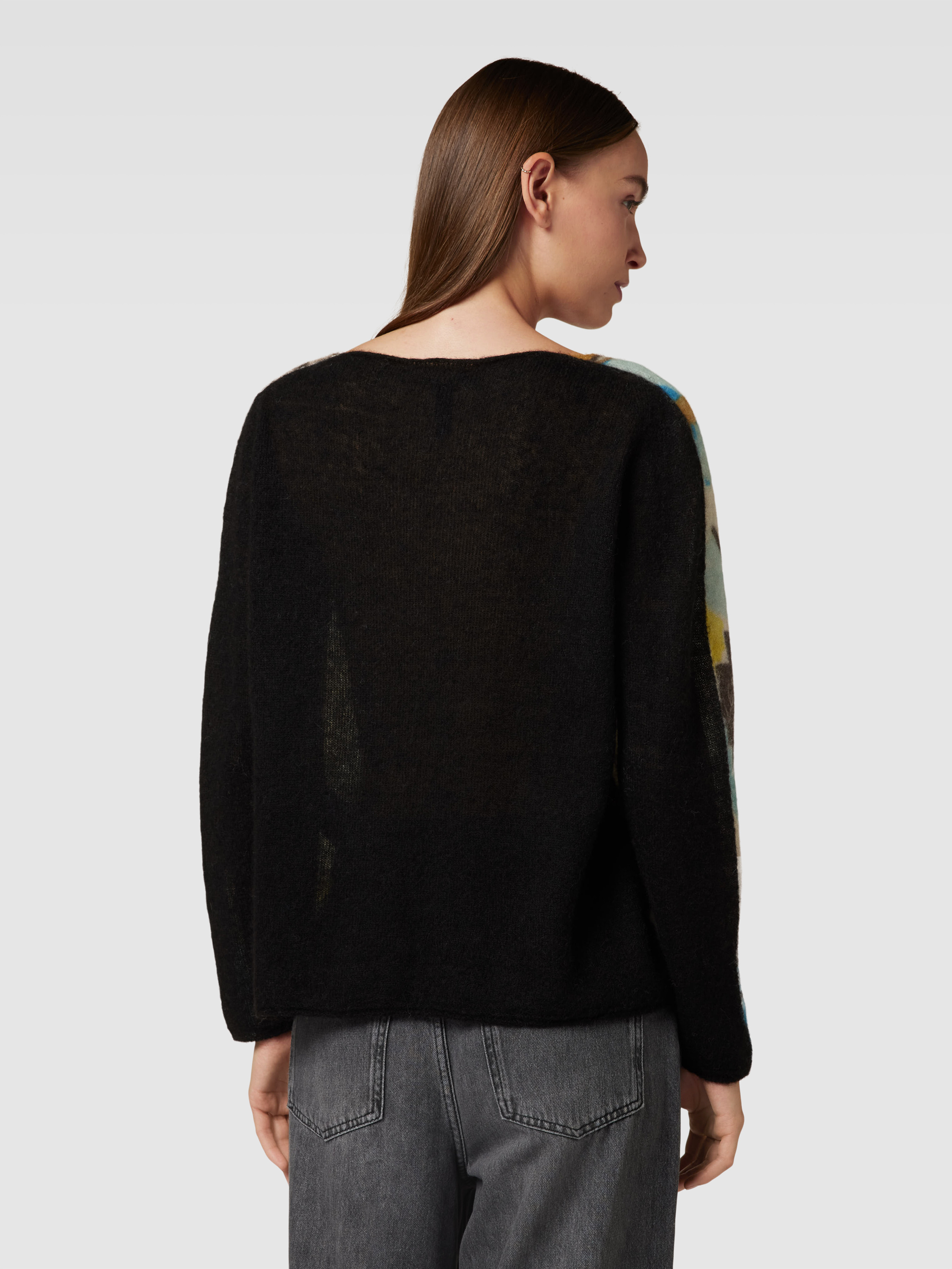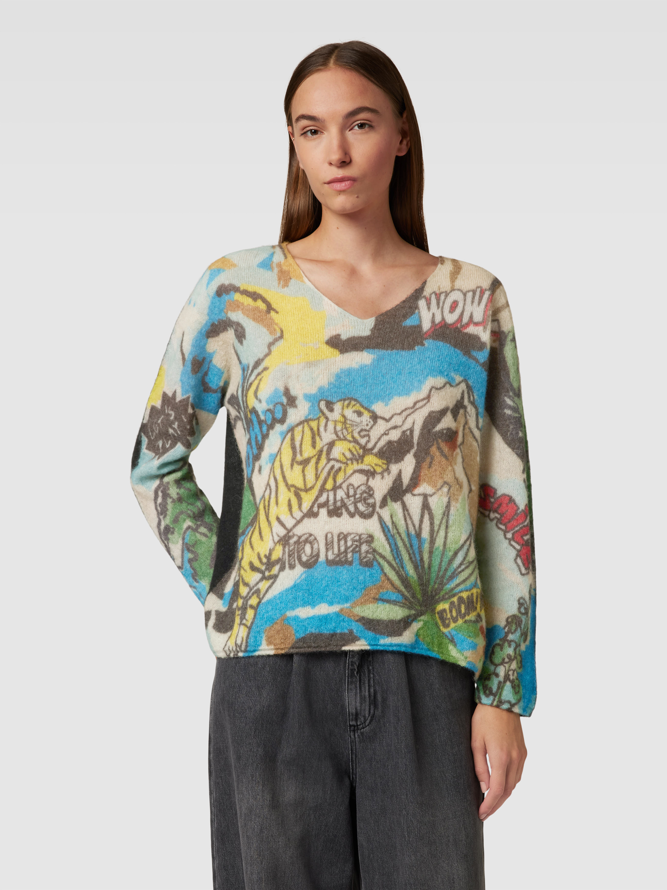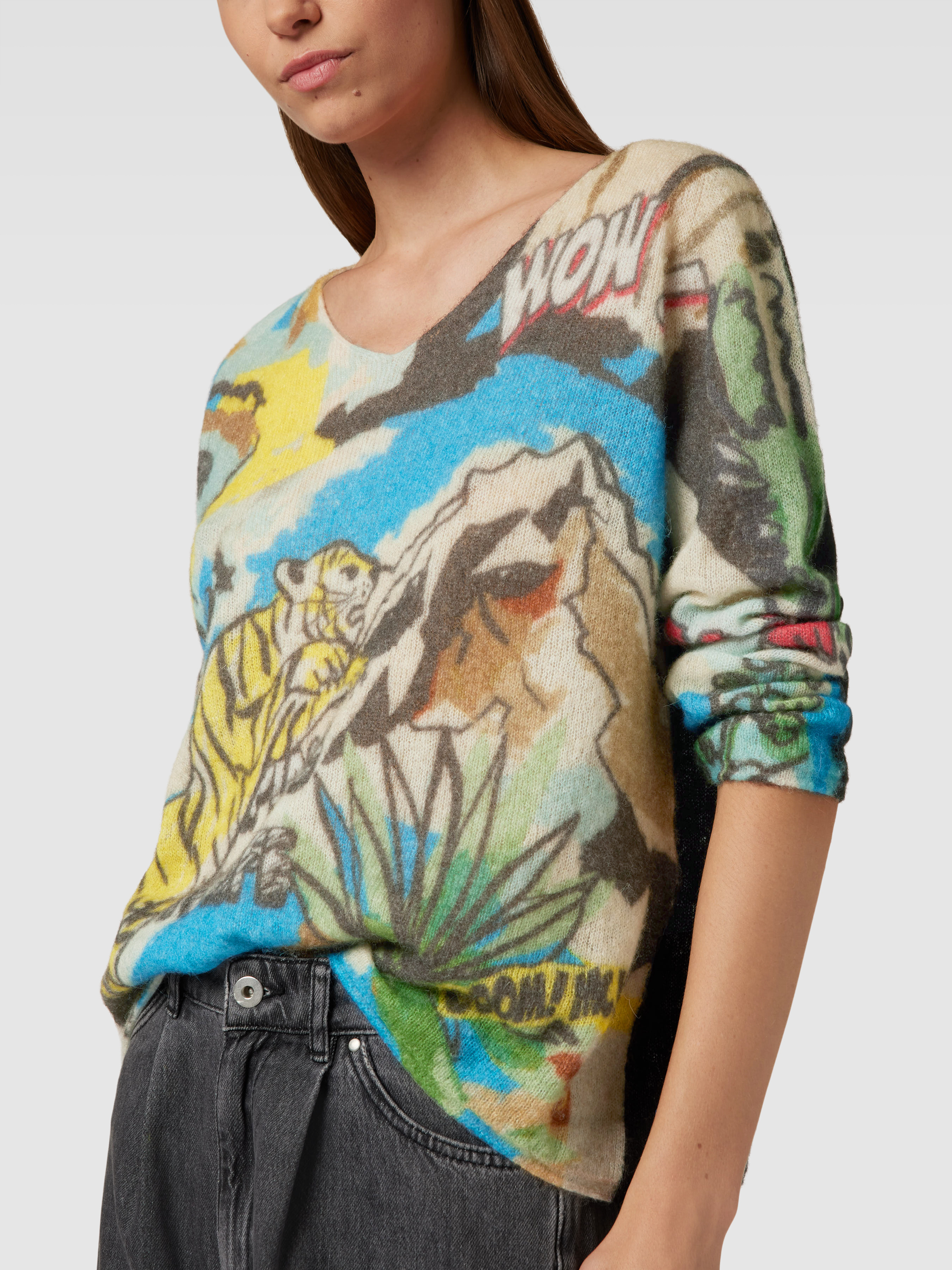 Sweter z dzianiny z nadrukiem z motywem na całej powierzchni - petrol