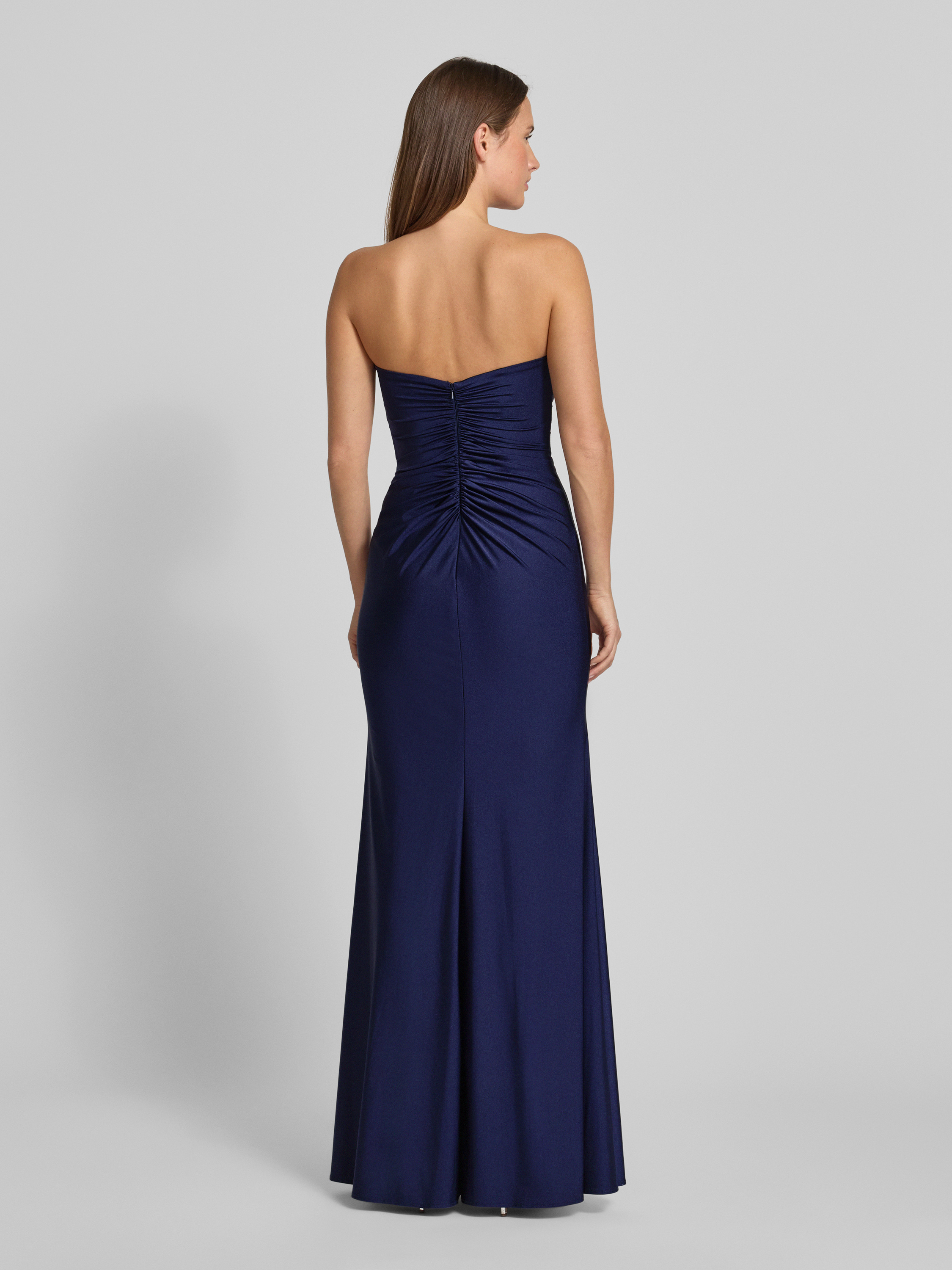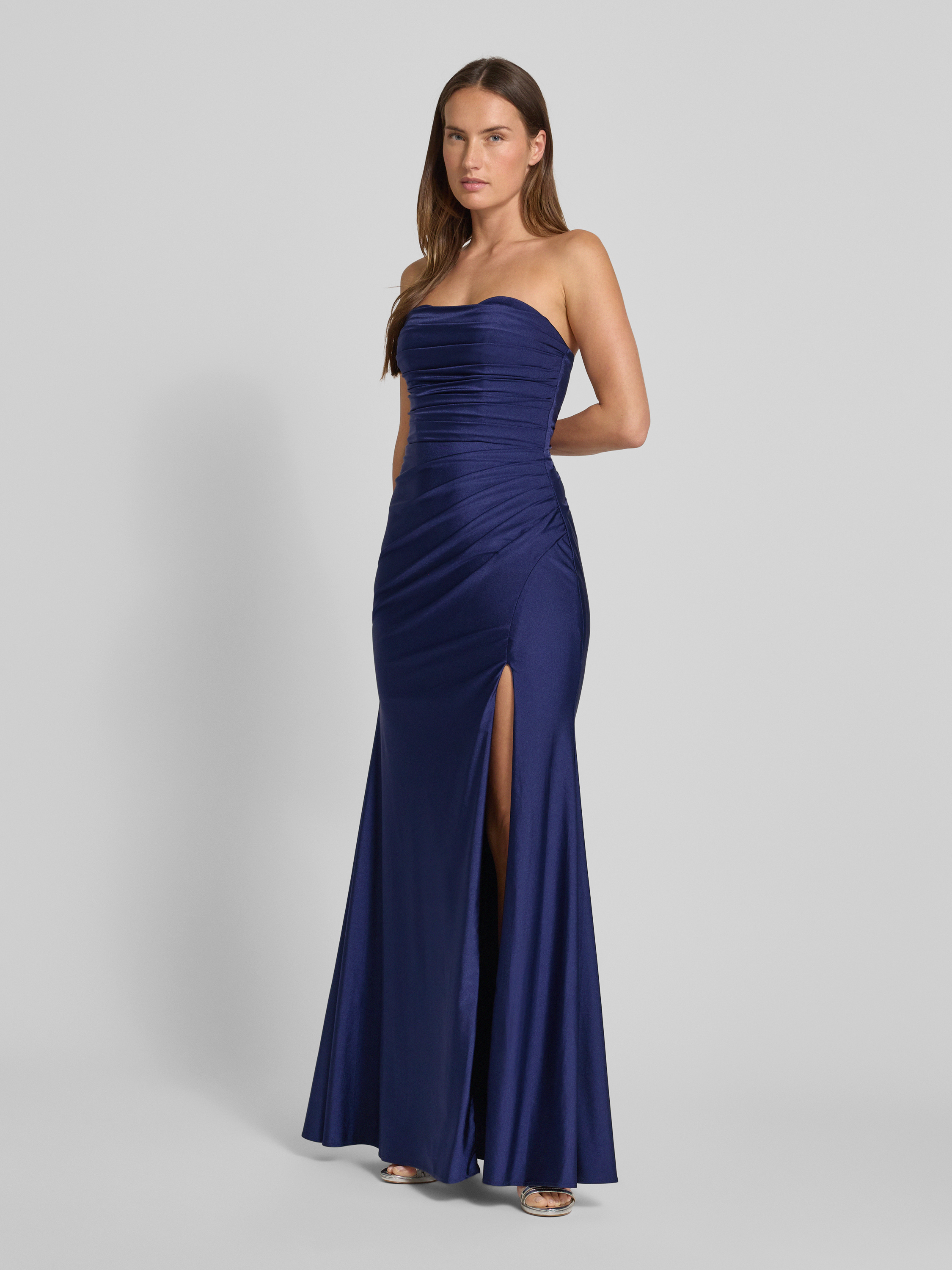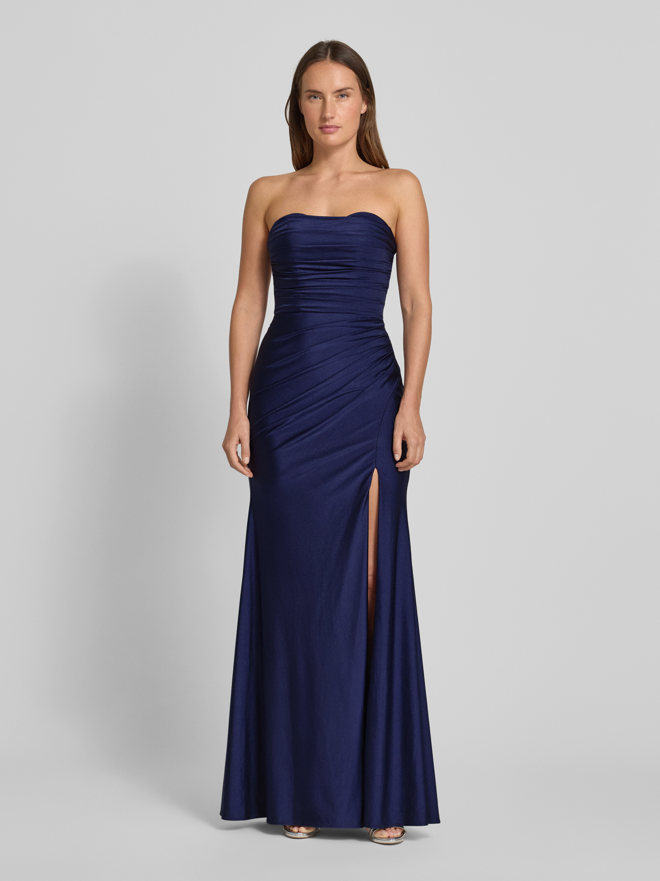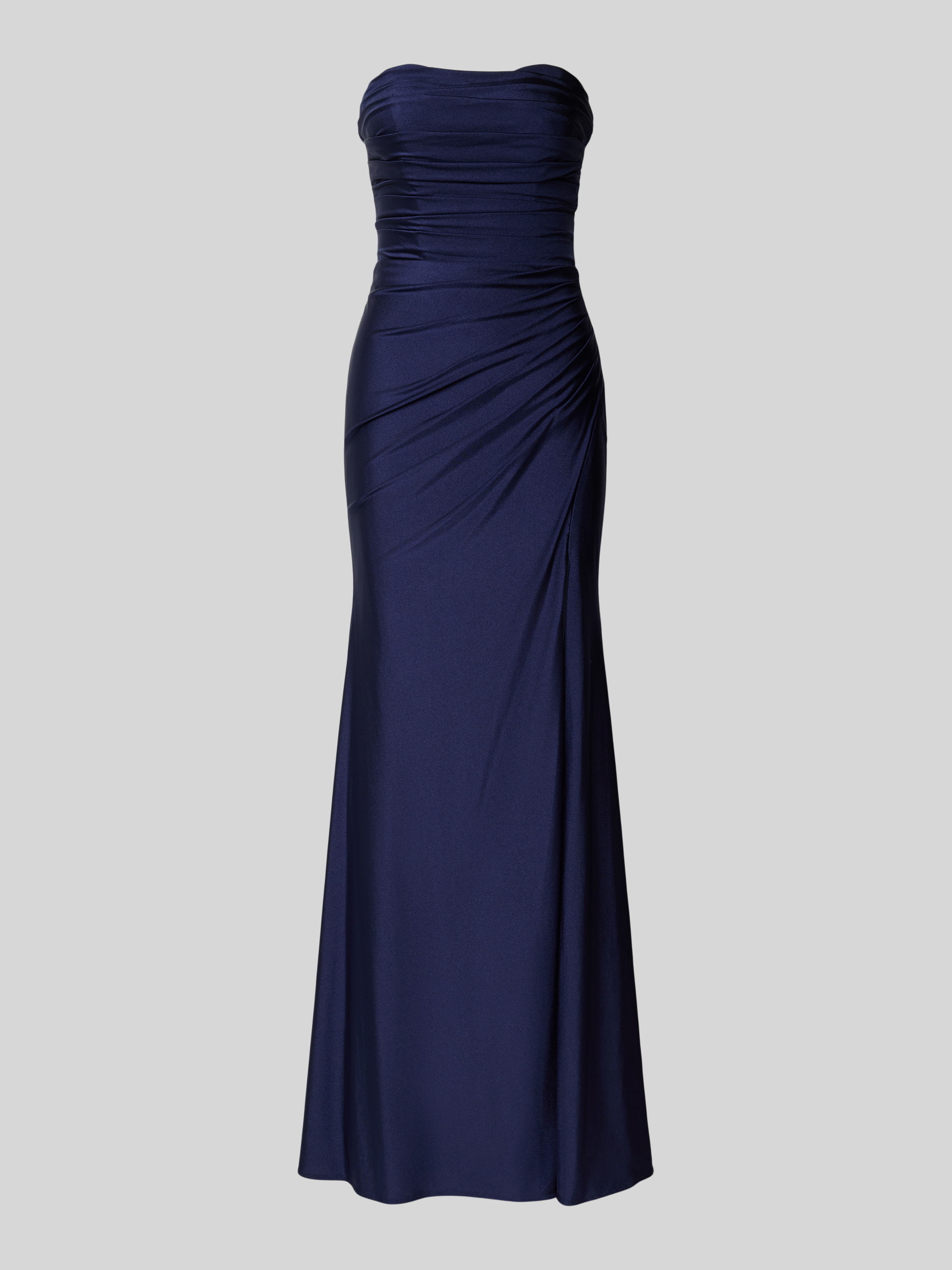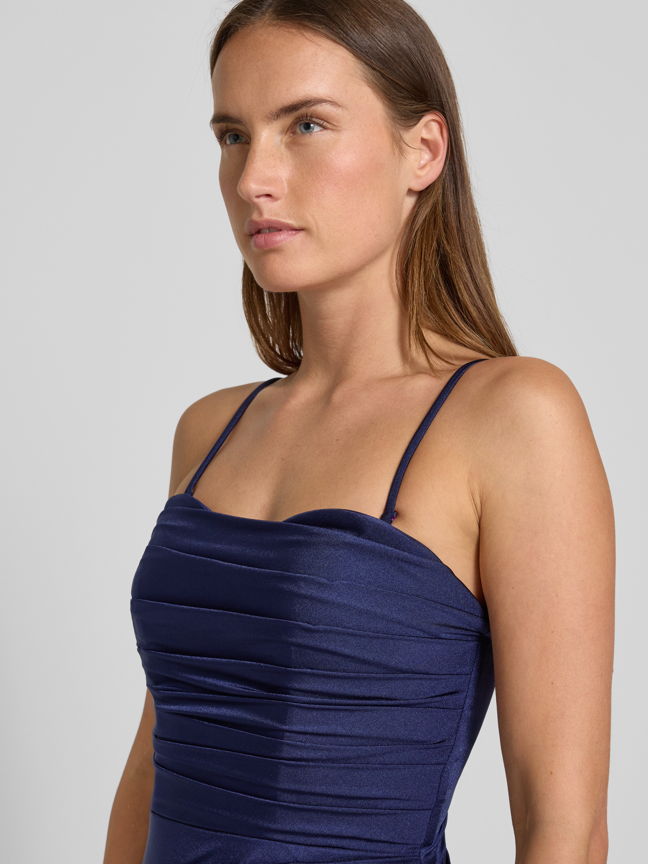Sukienka wieczorowa z przedłużonymi plecami i falbanami - granatowy