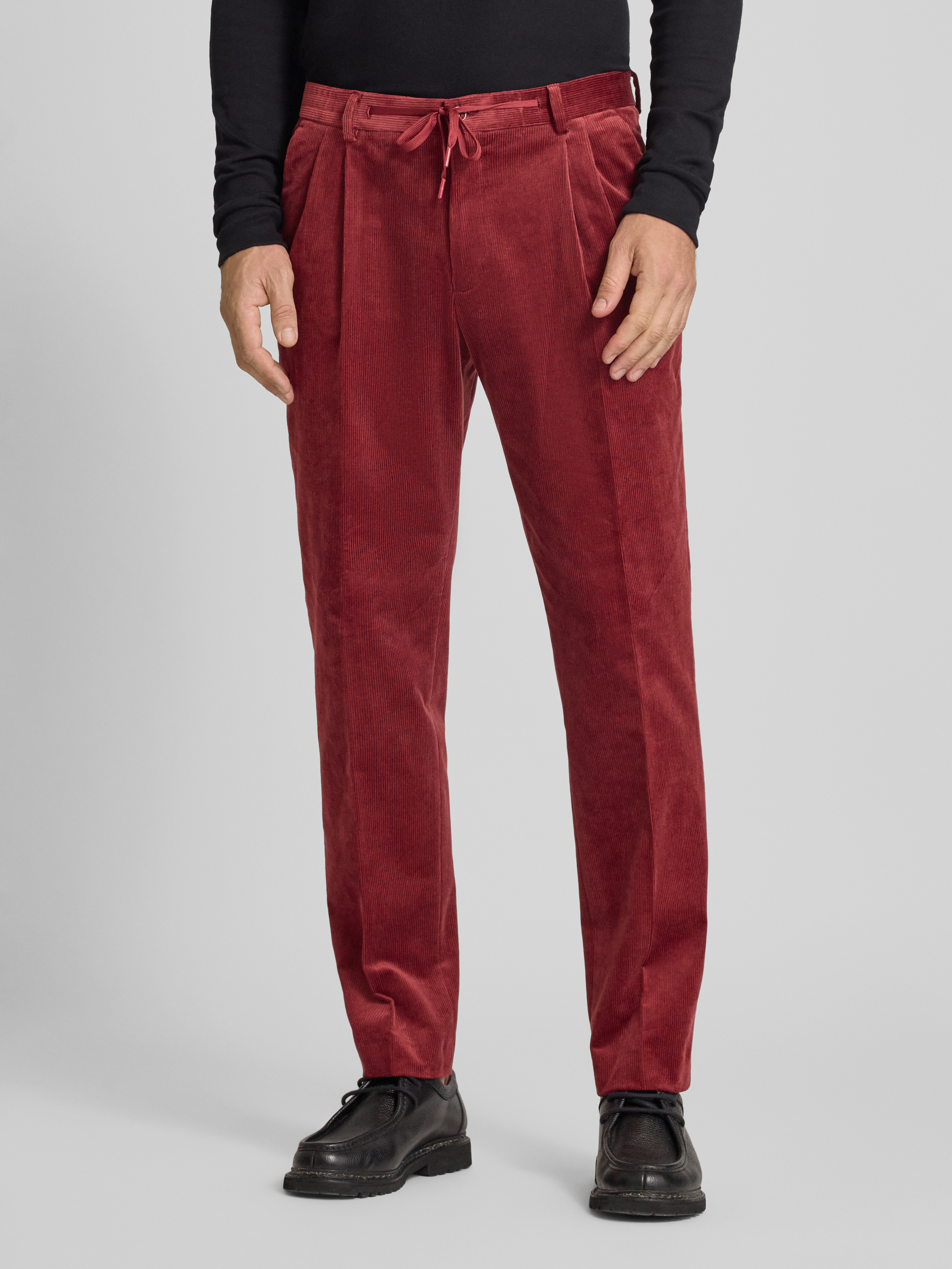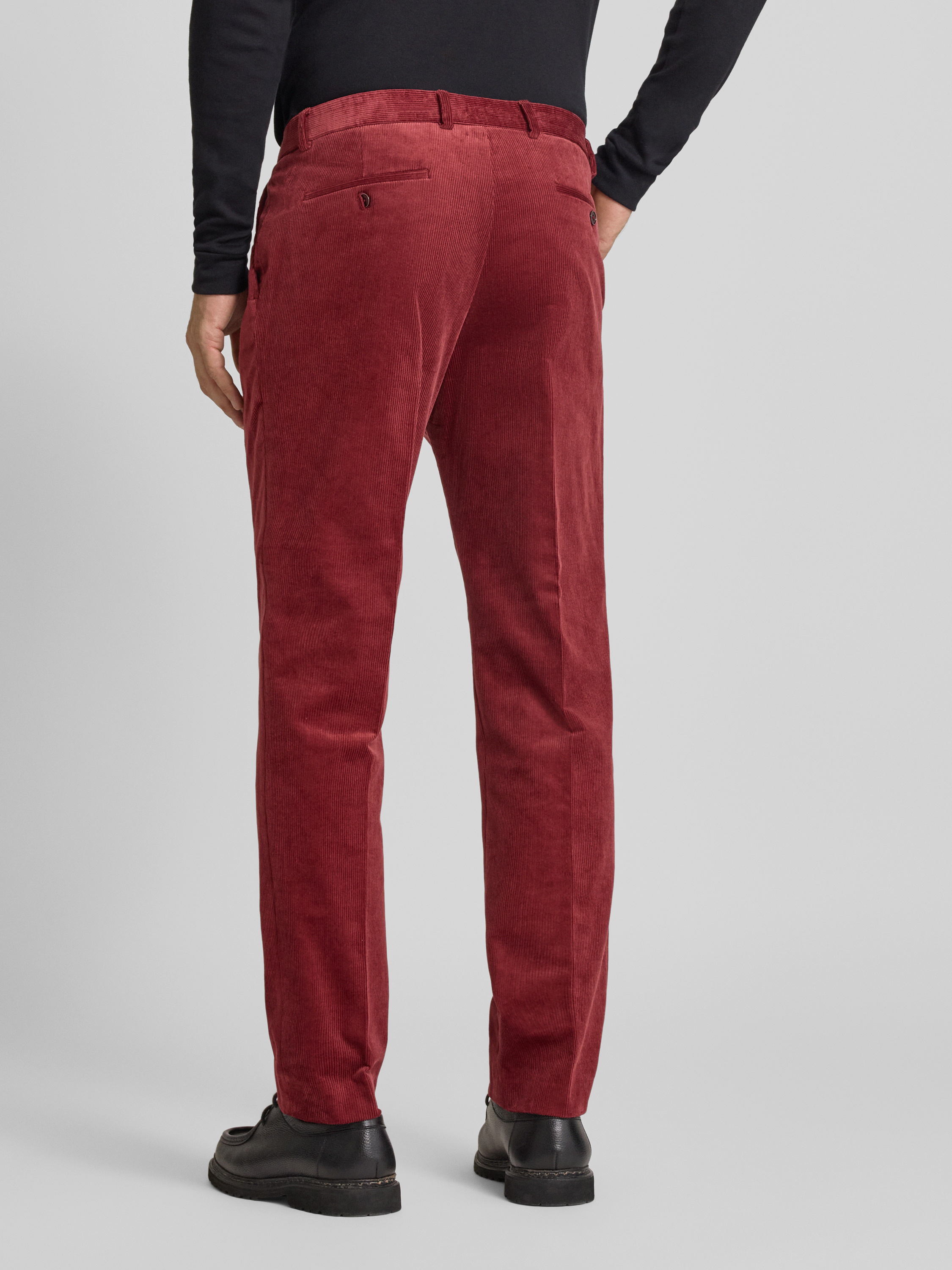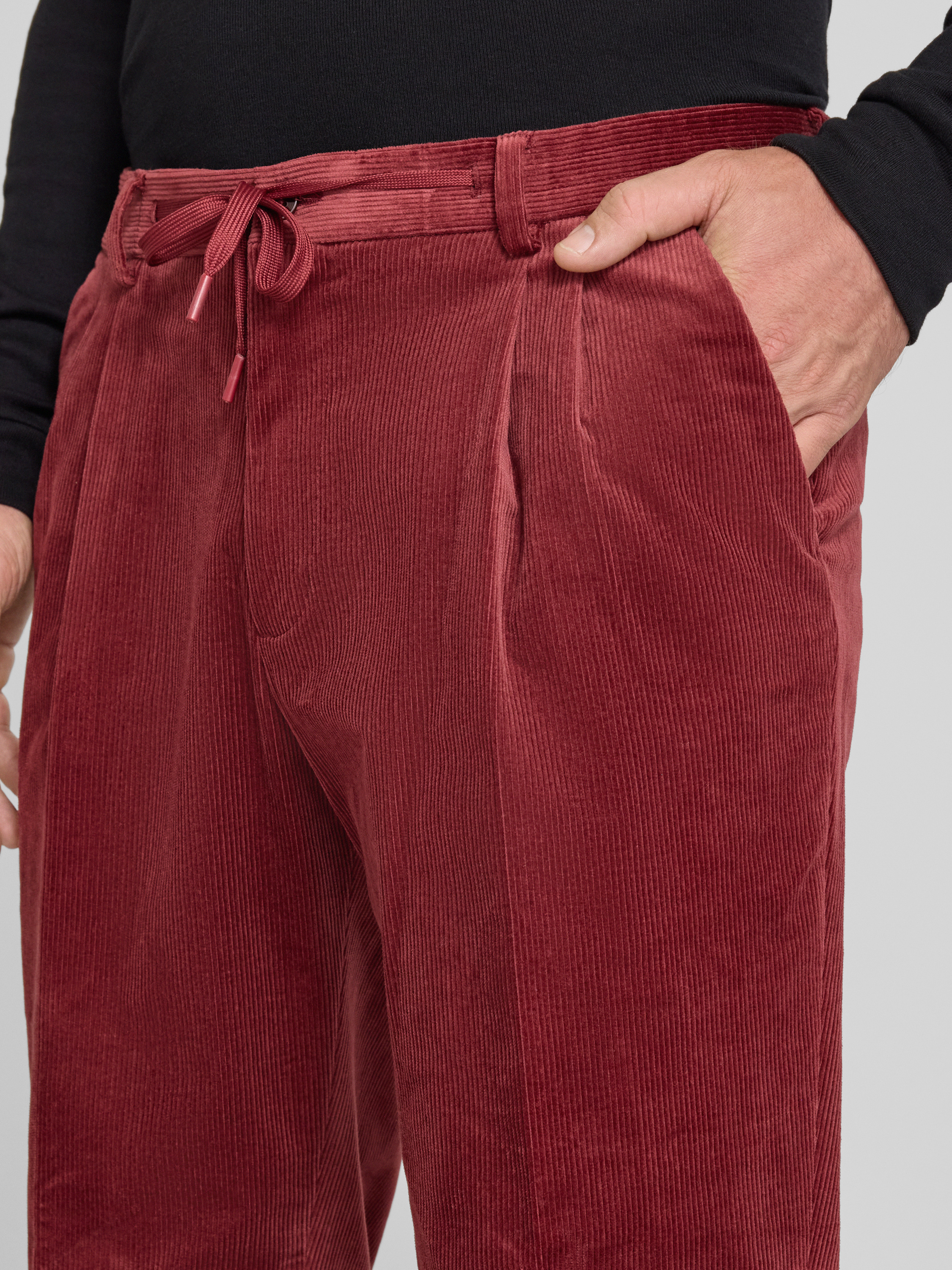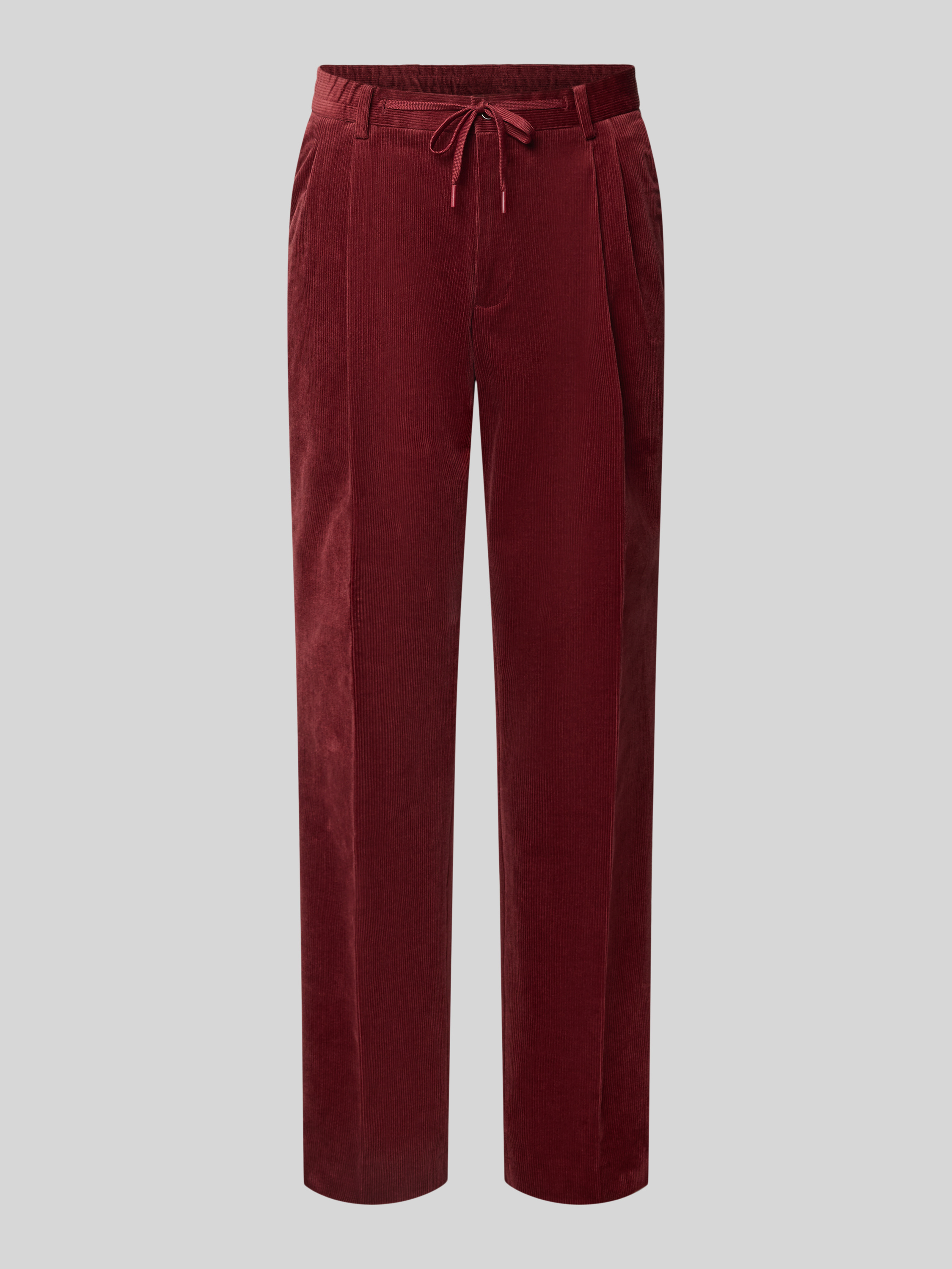 Spodnie sztruksowe o kroju regular fit z zakładkami w pasie - ciemnoczerwony