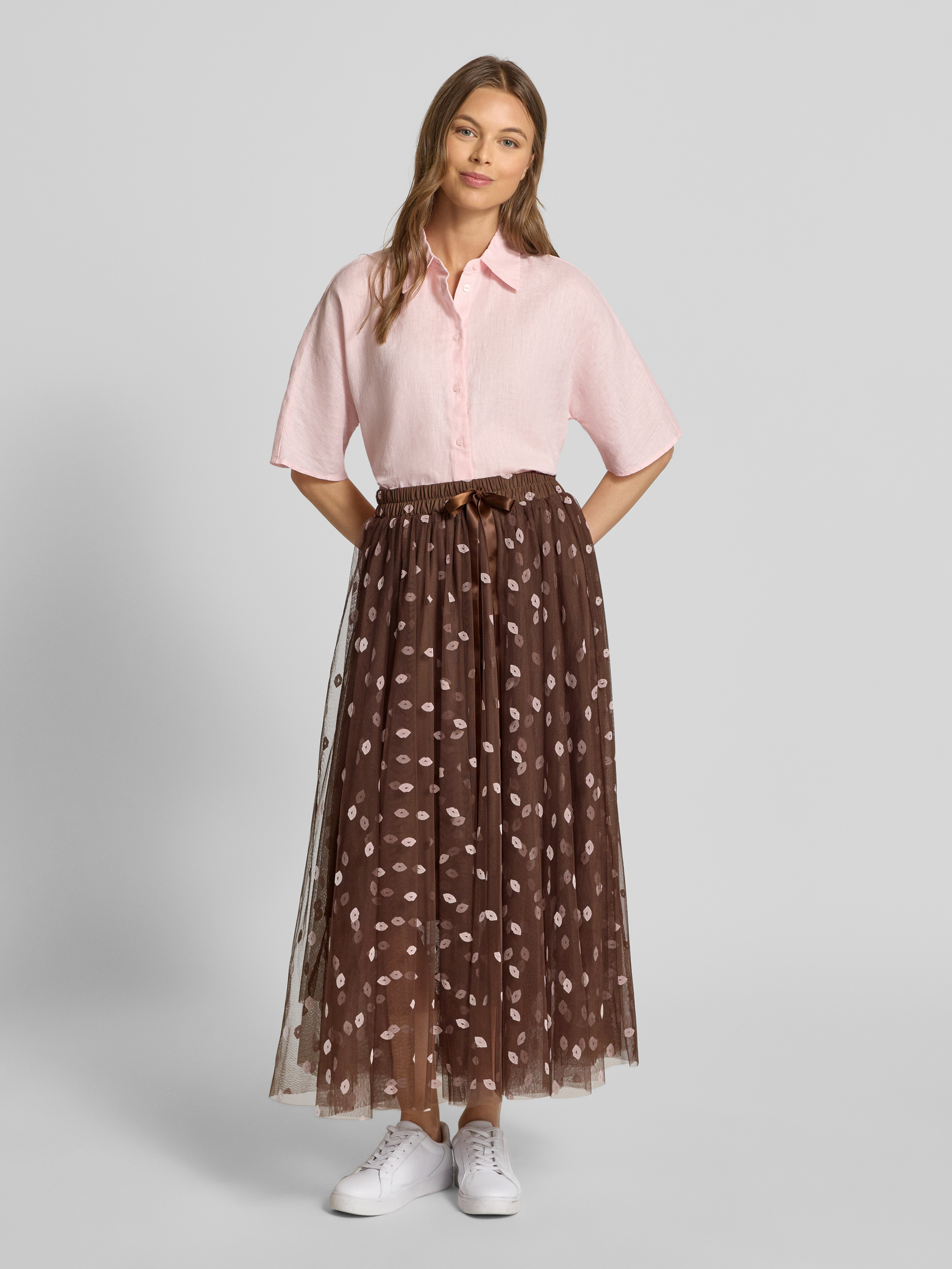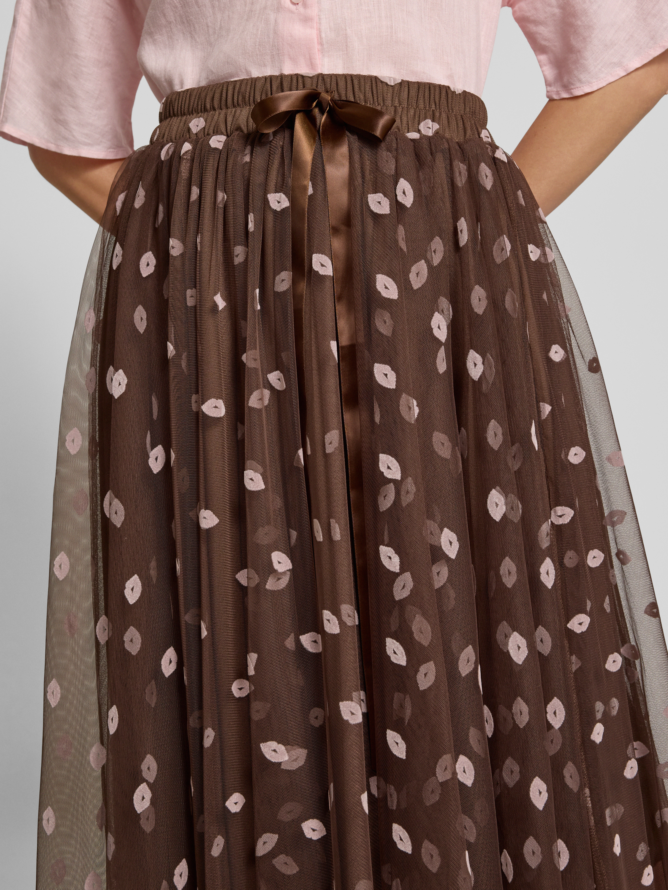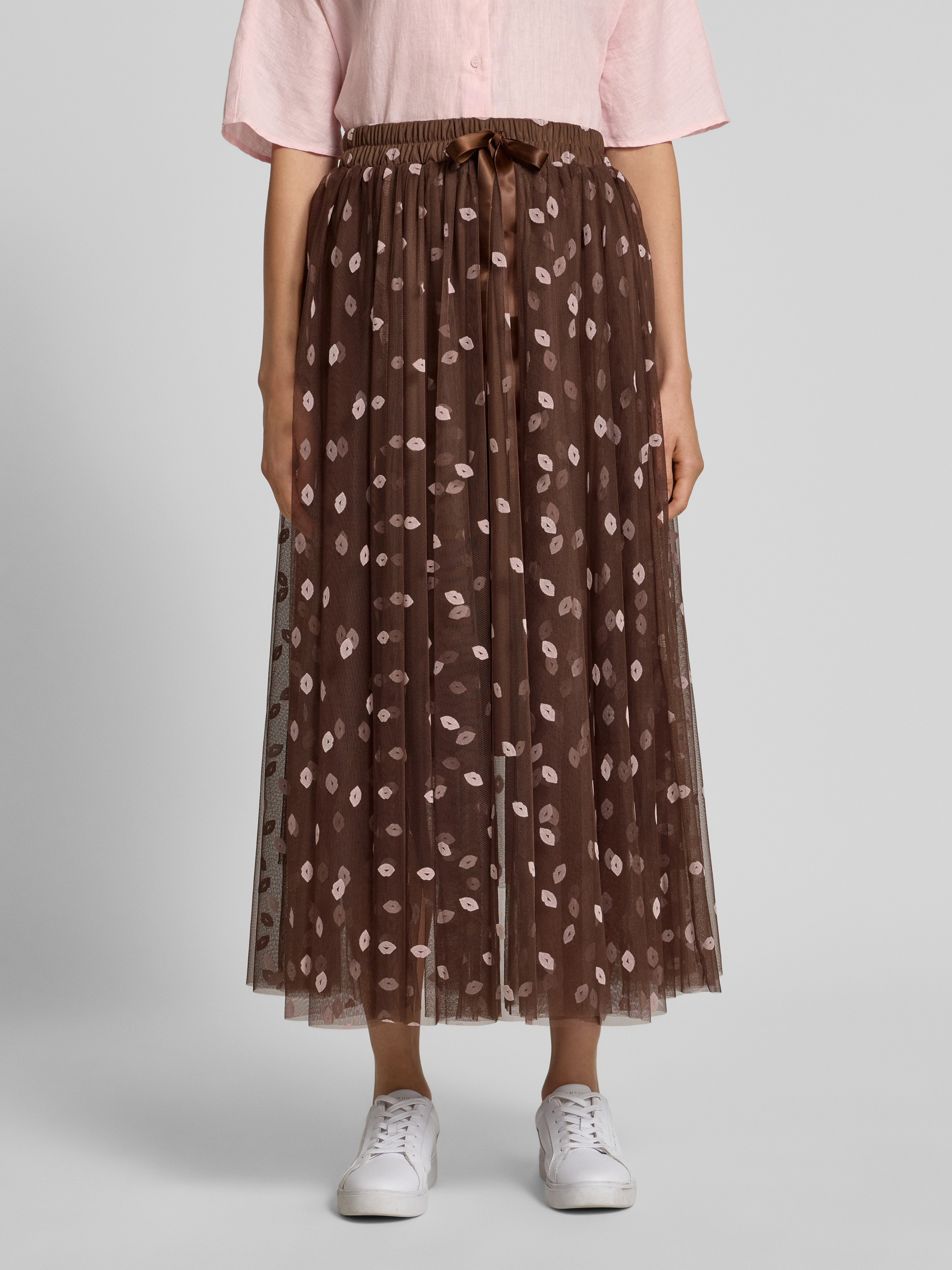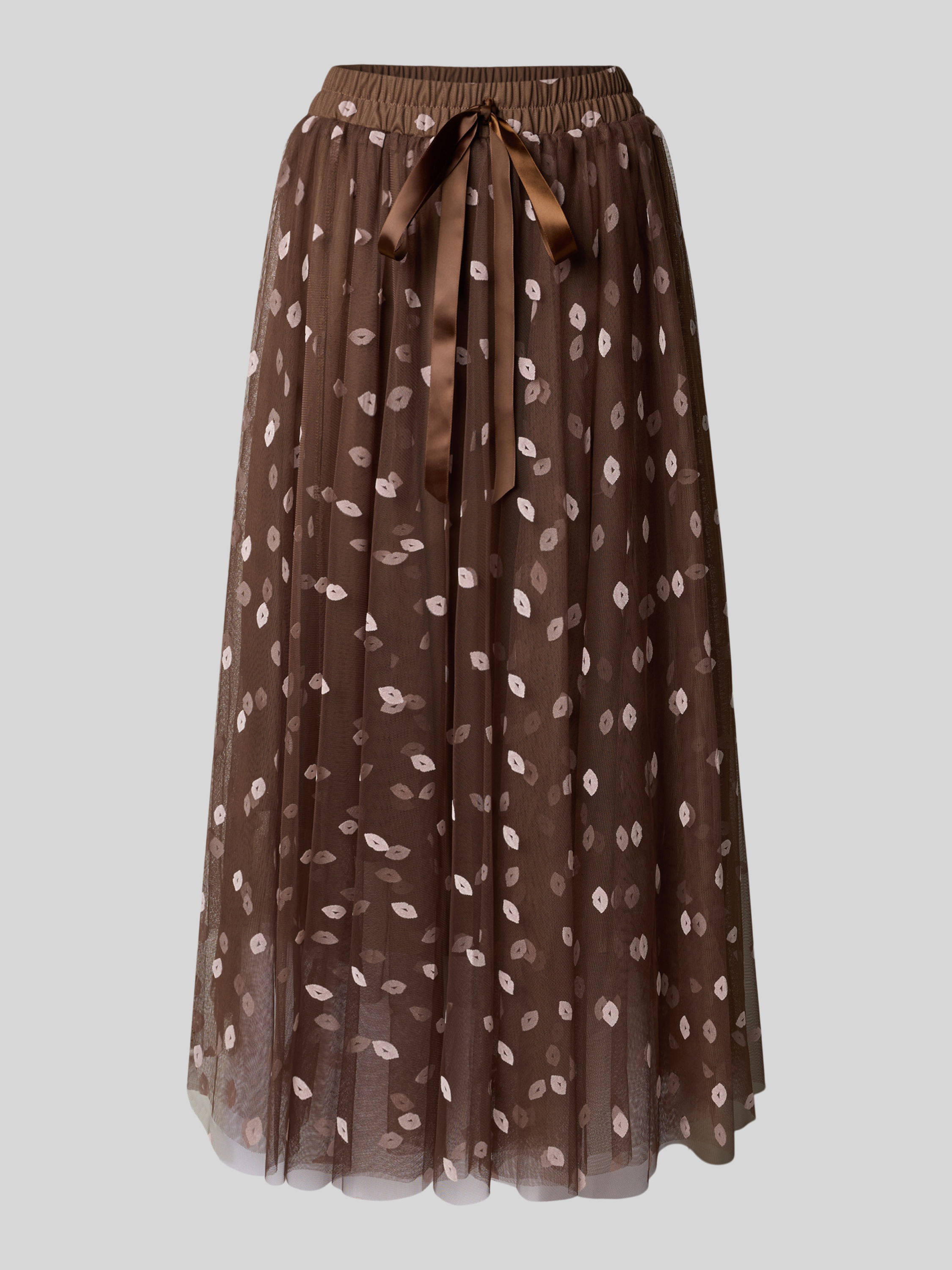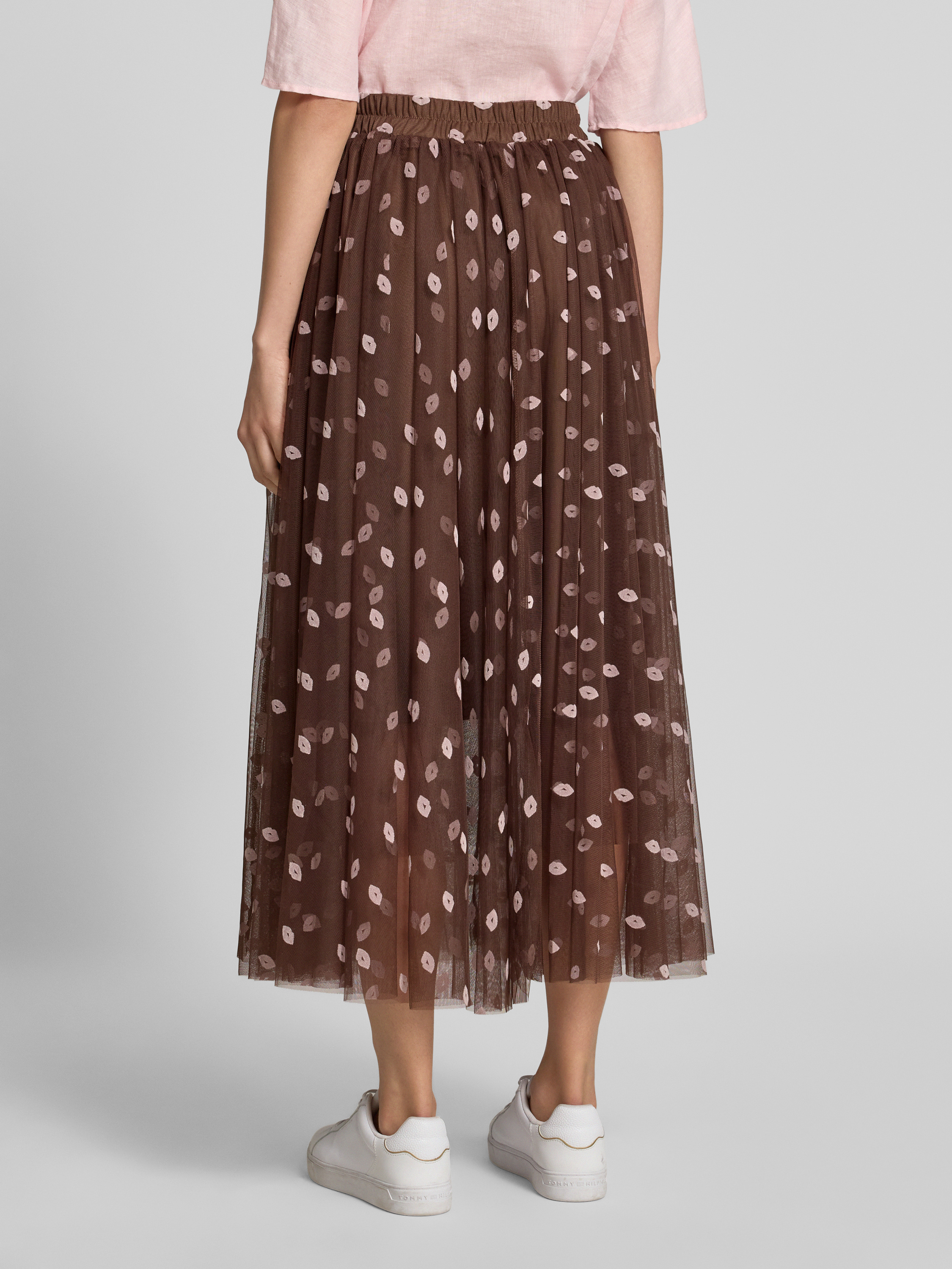 Długa spódnica ze wzorem na całej powierzchni i elastycznym pasem - czekoladowy