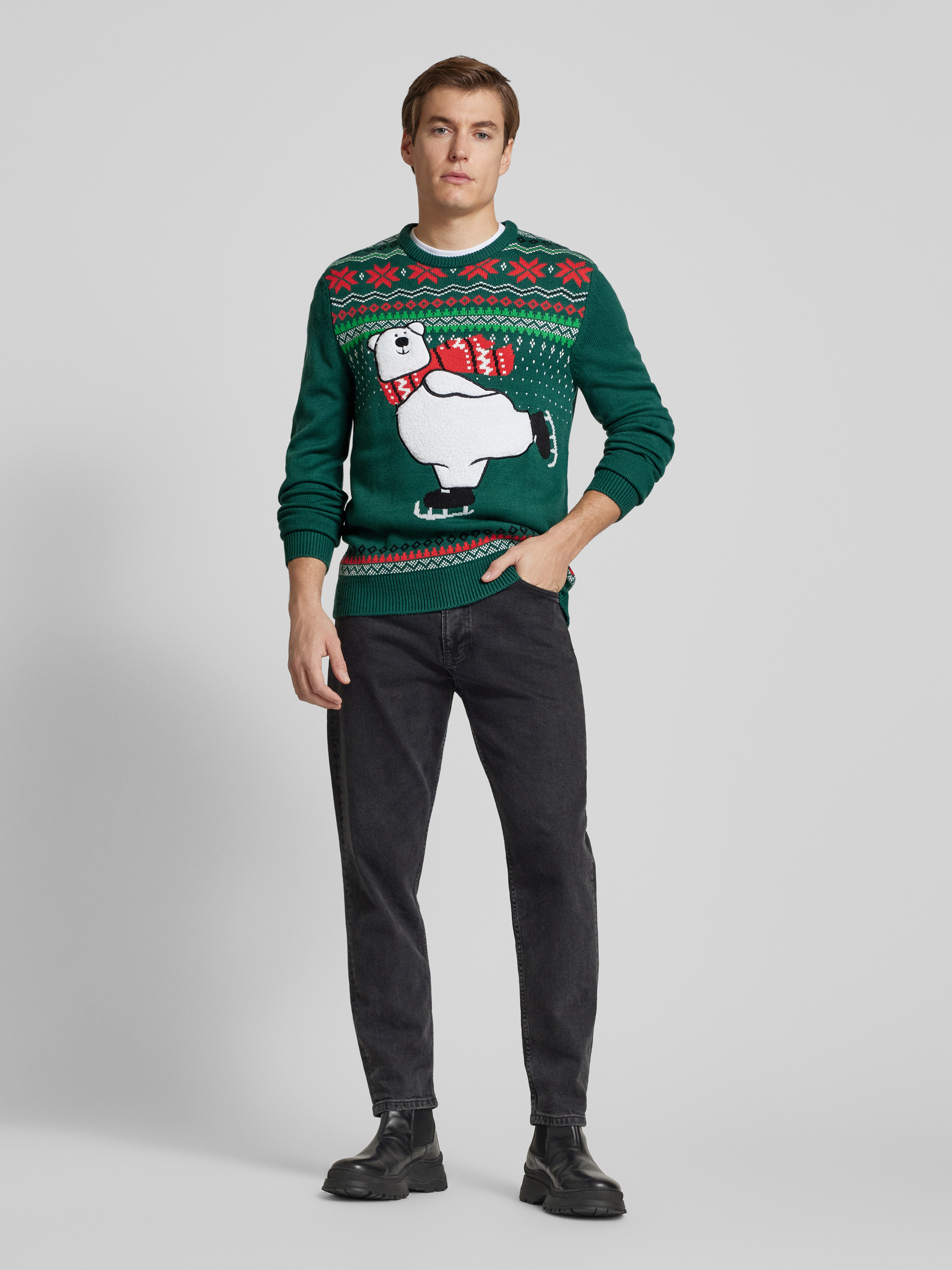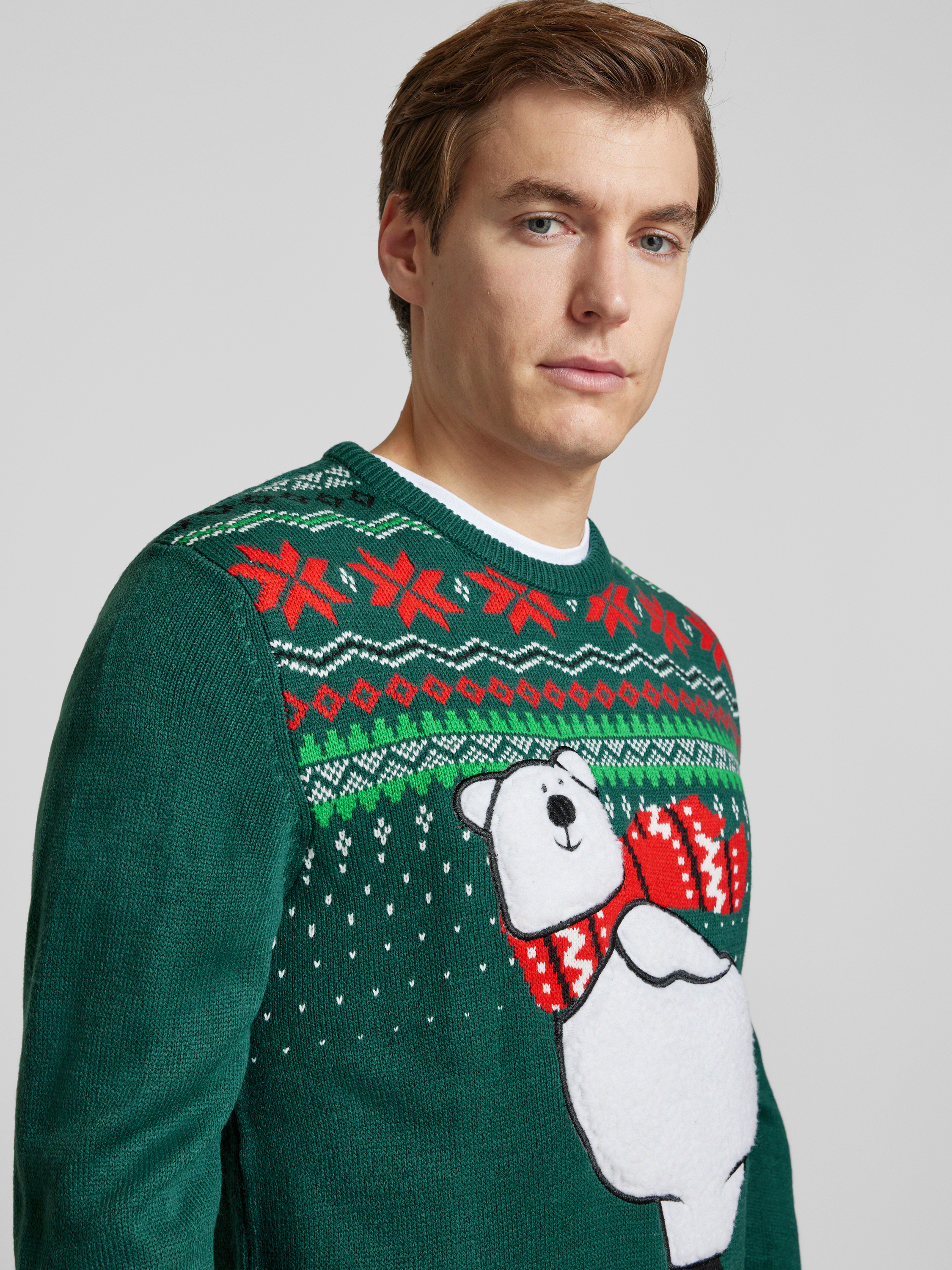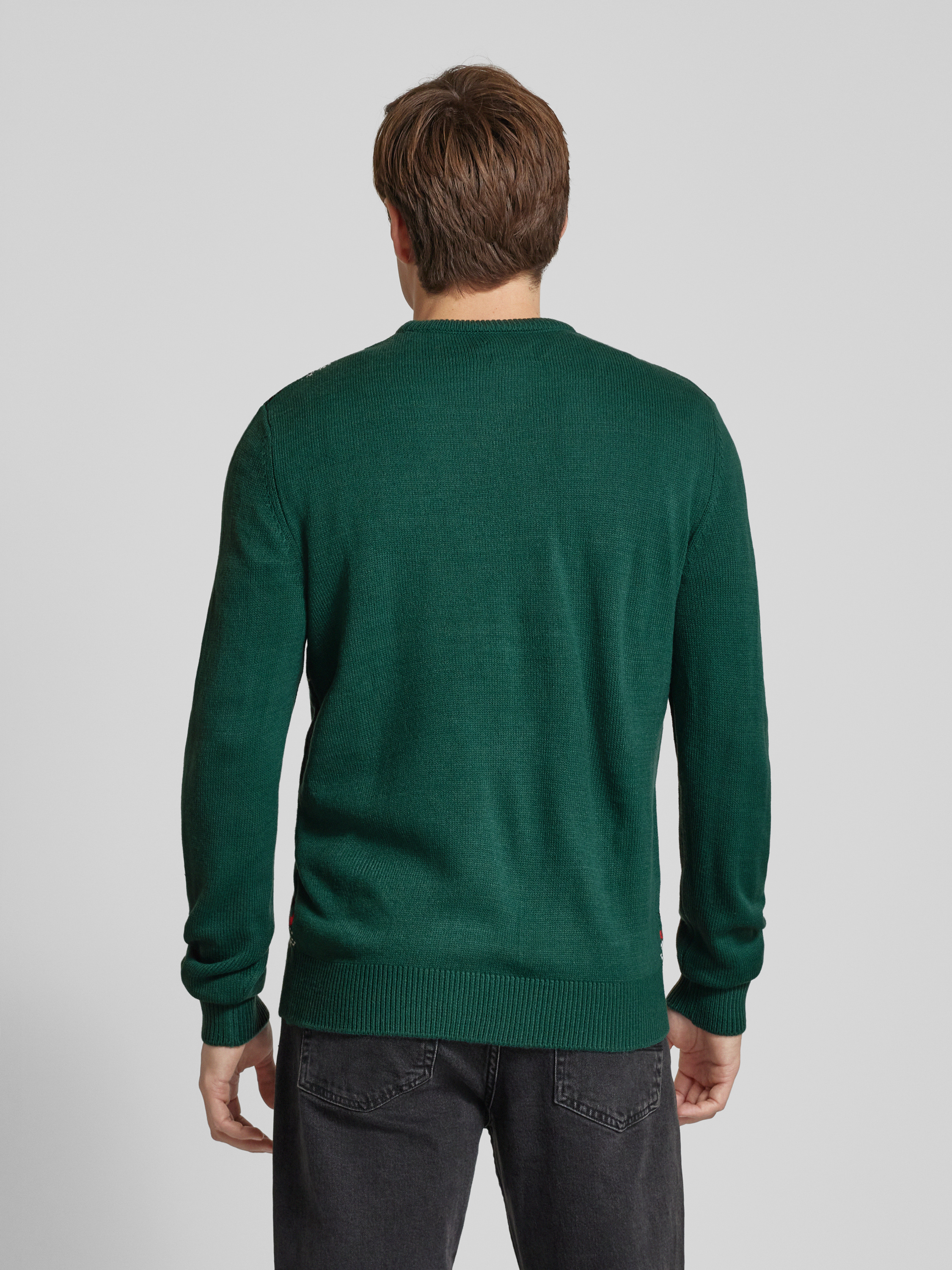 Sweter z dzianiny z okrągłym dekoltem model ‘Ice bear’ - butelkowy zielony