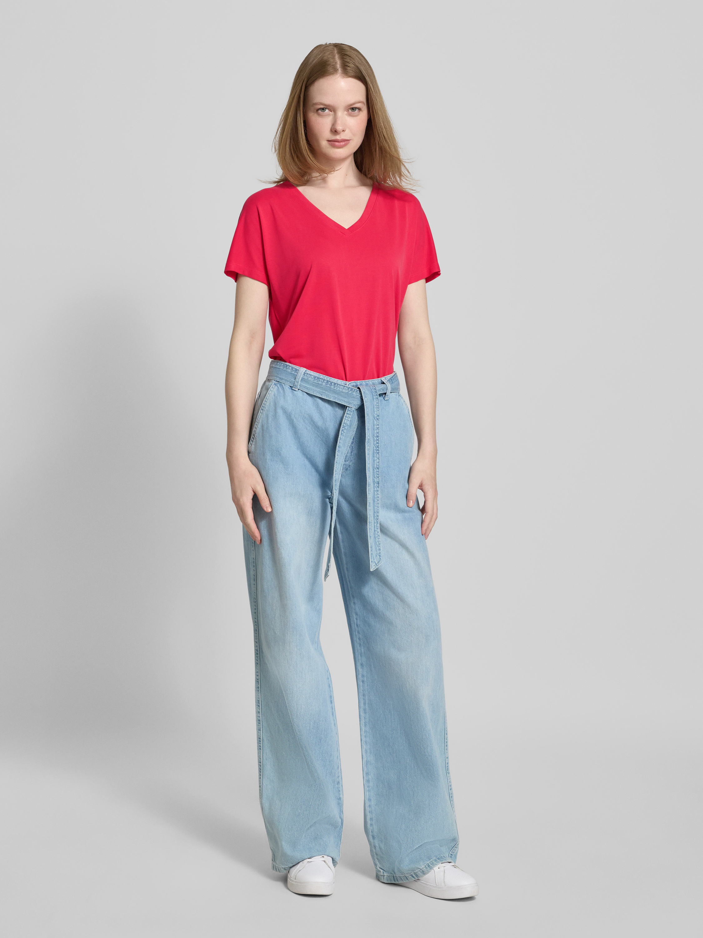 T-shirt z dekoltem w serek model ‘Fenya’ - mocnoróżowy