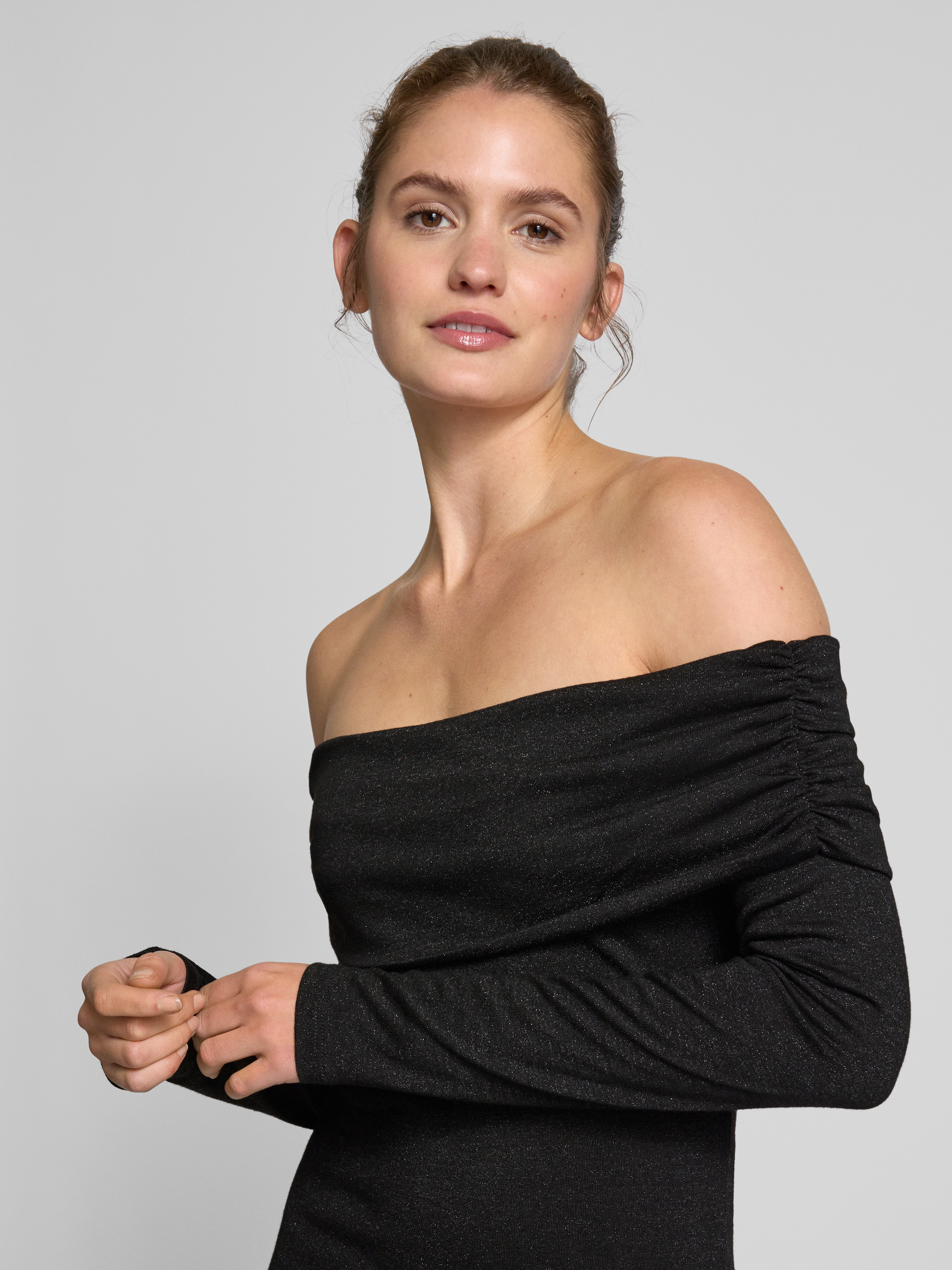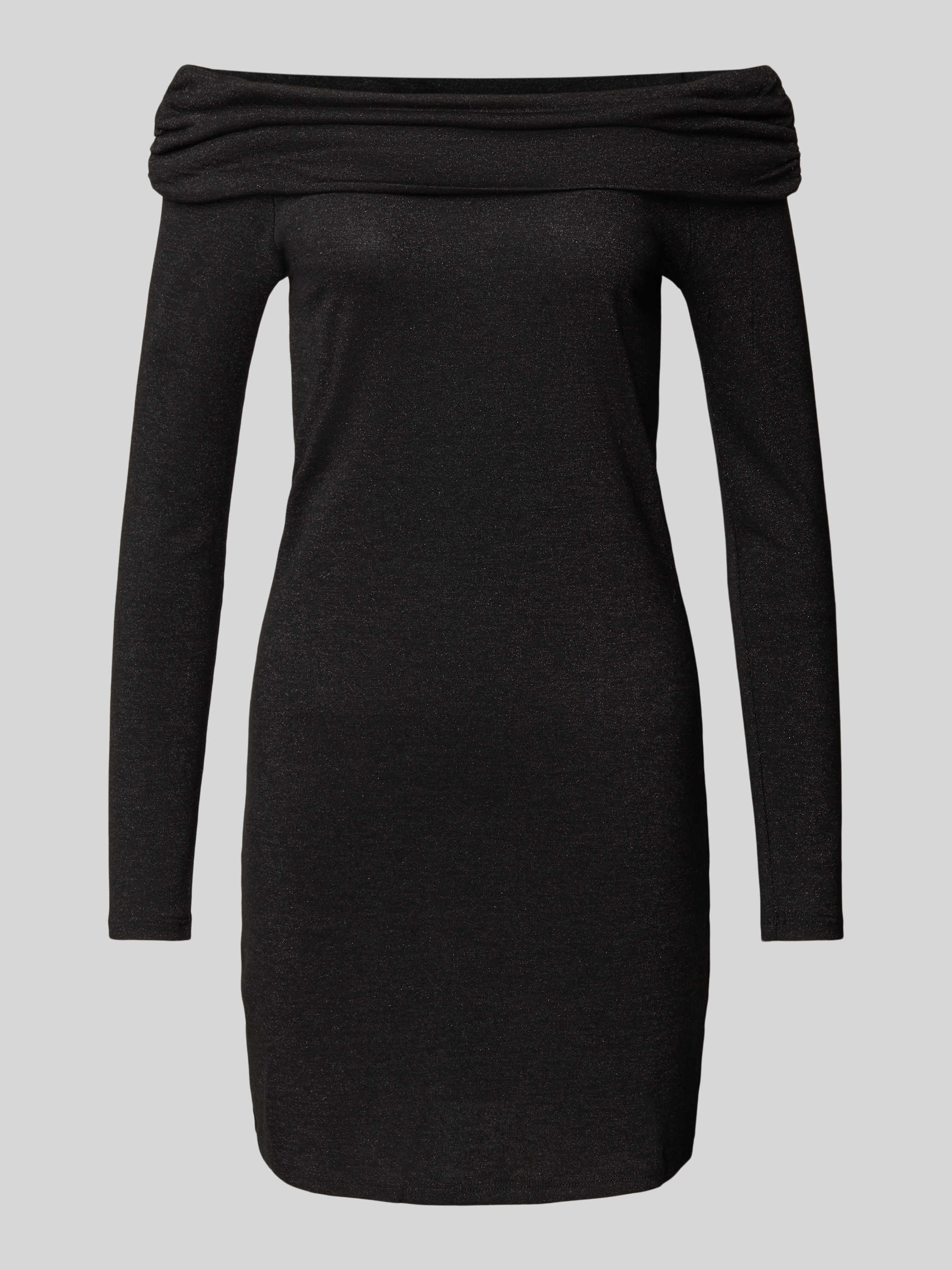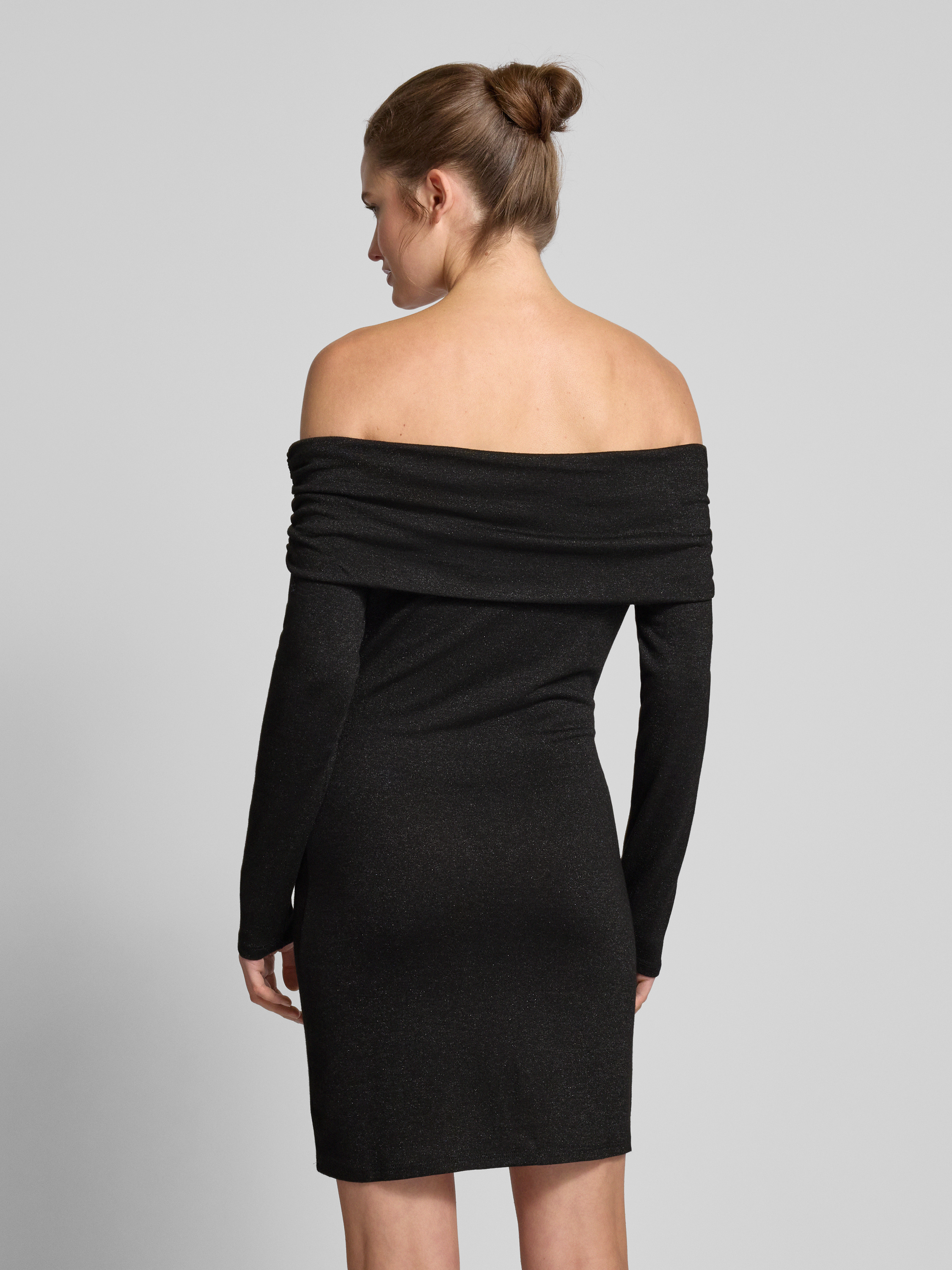 Sukienka mini z dekoltem carmen i błyszczącą nicią model ‘ROMA’ - metaliczny czarny