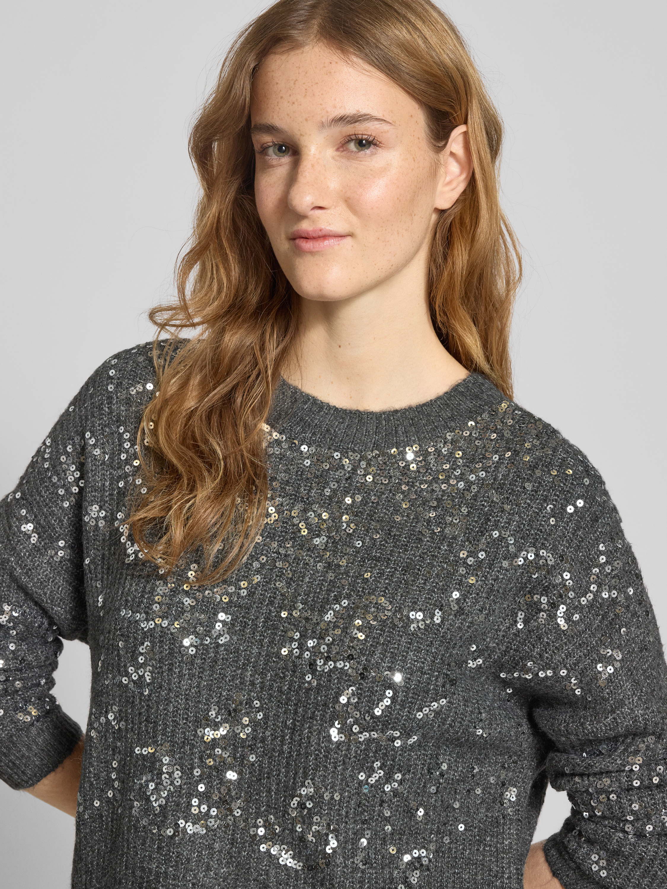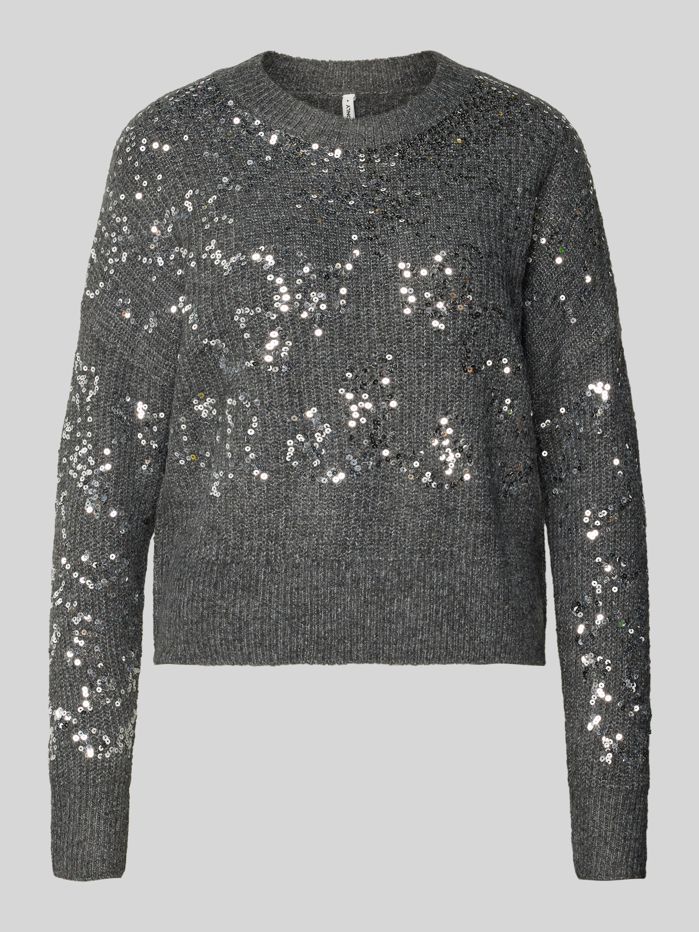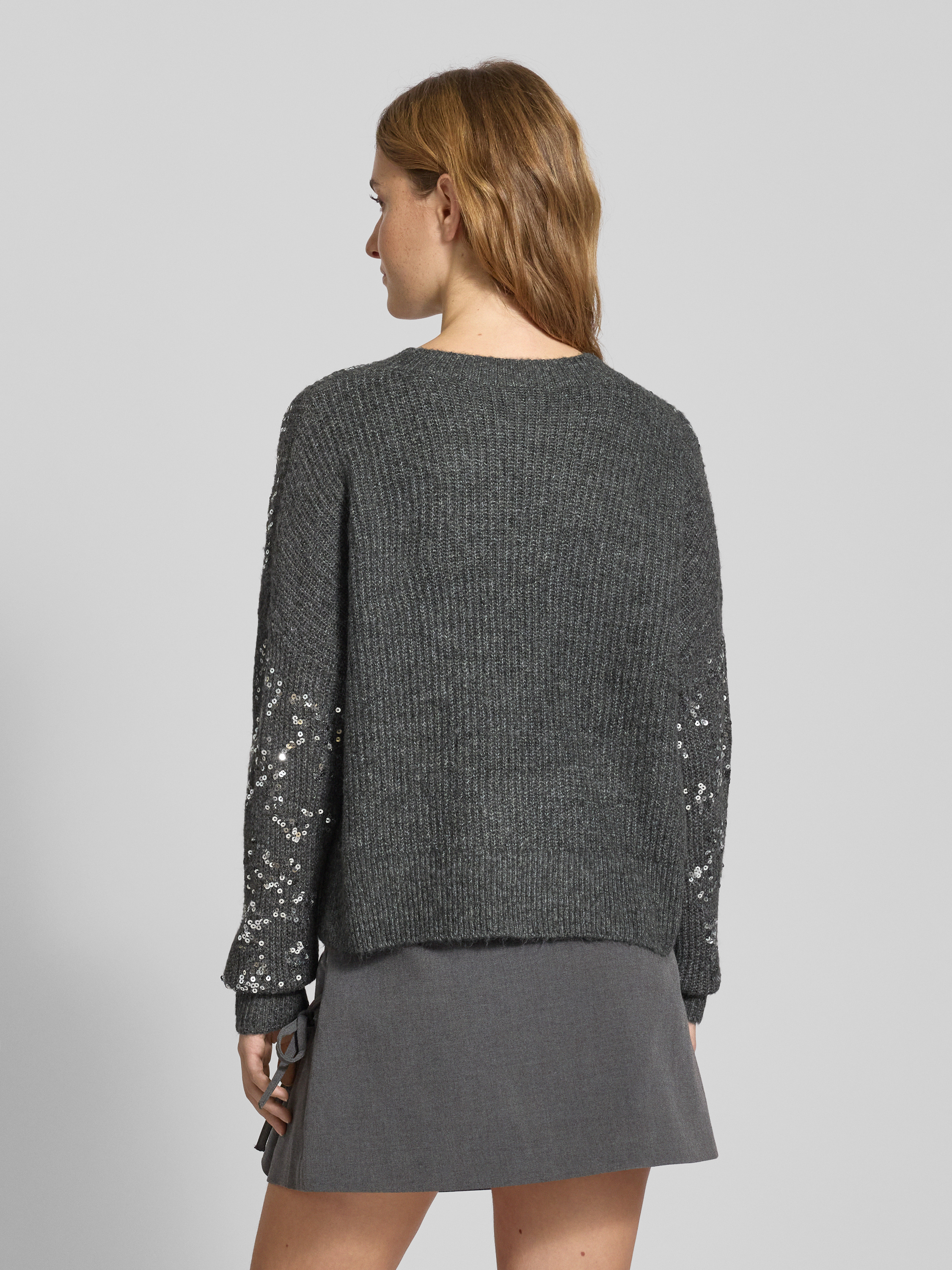 Sweter z dzianiny o kroju relaxed fit z cekinowym obszyciem model ‘LALTA’ - antracytowy melanż