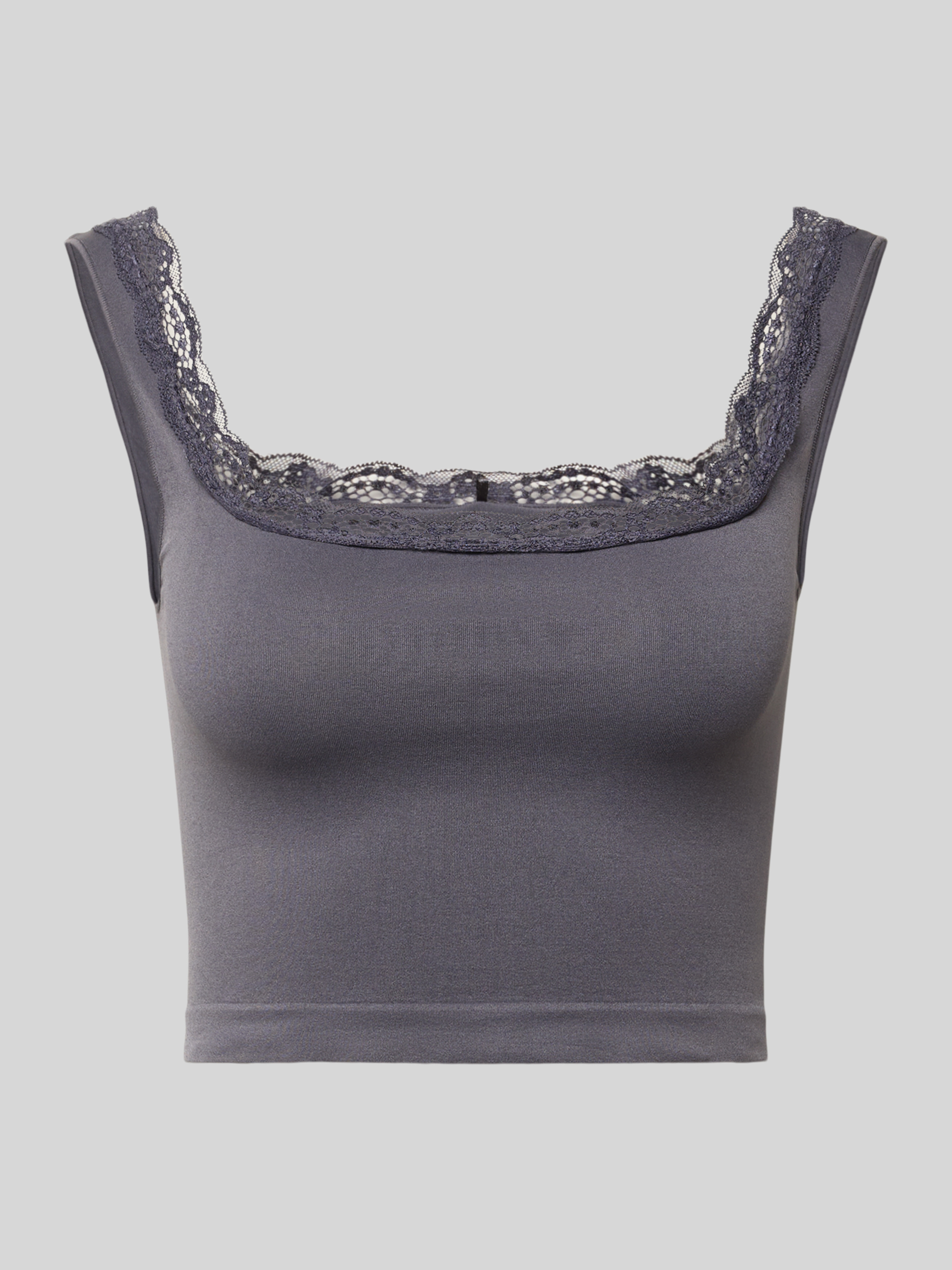 Top krótki o kroju slim fit z obszyciem koronką model ‘VICKY’ - szaroniebieski