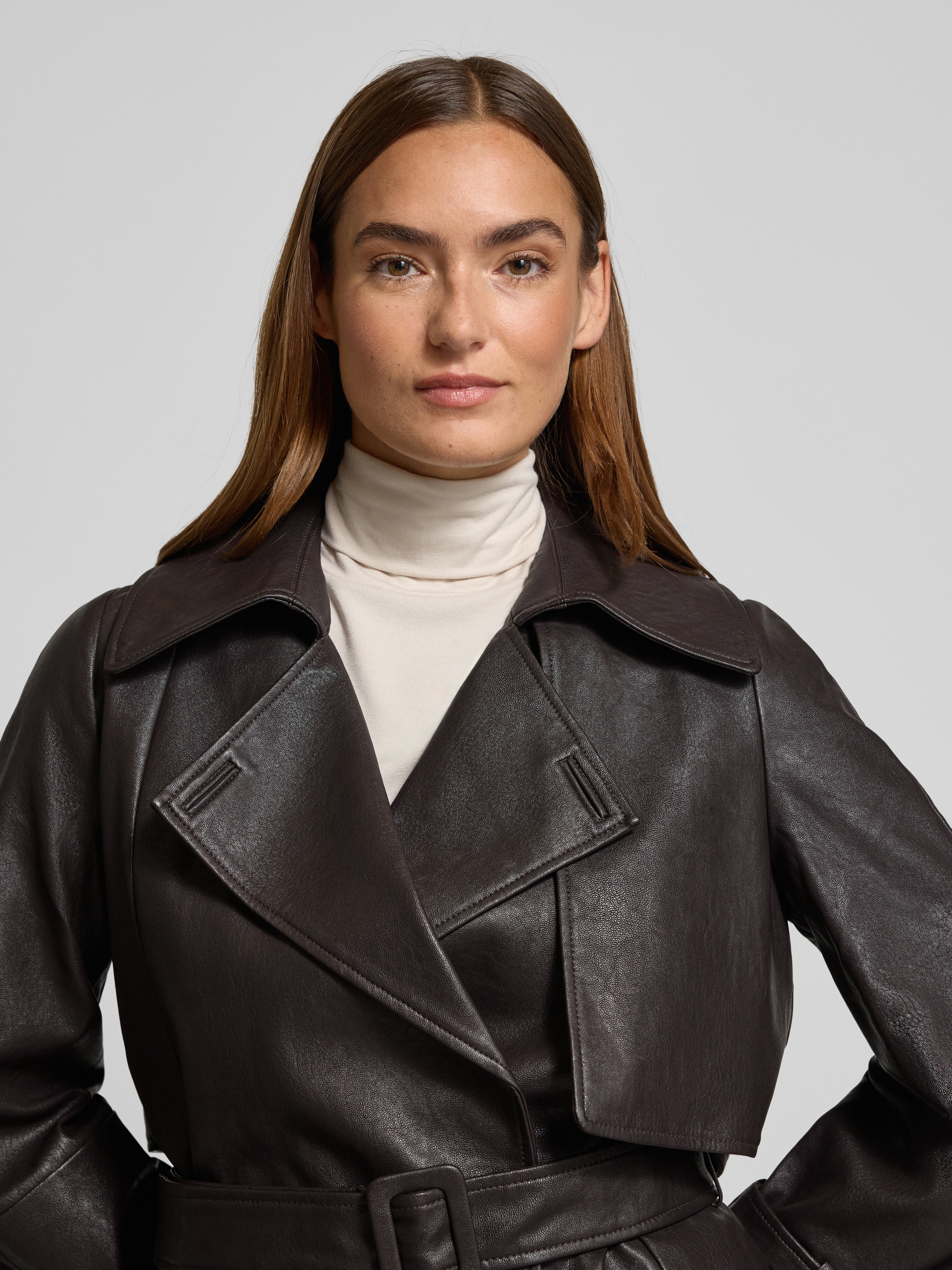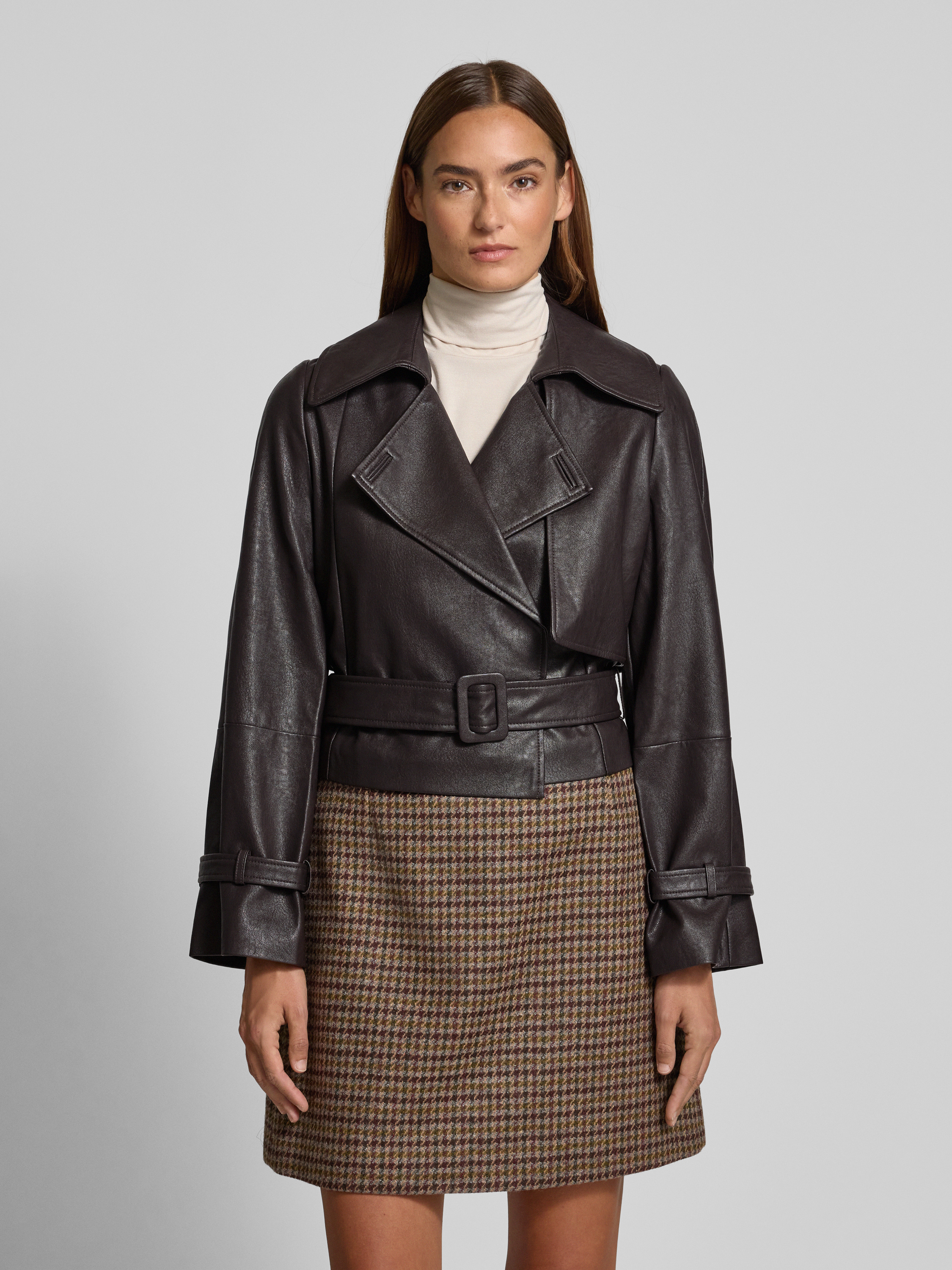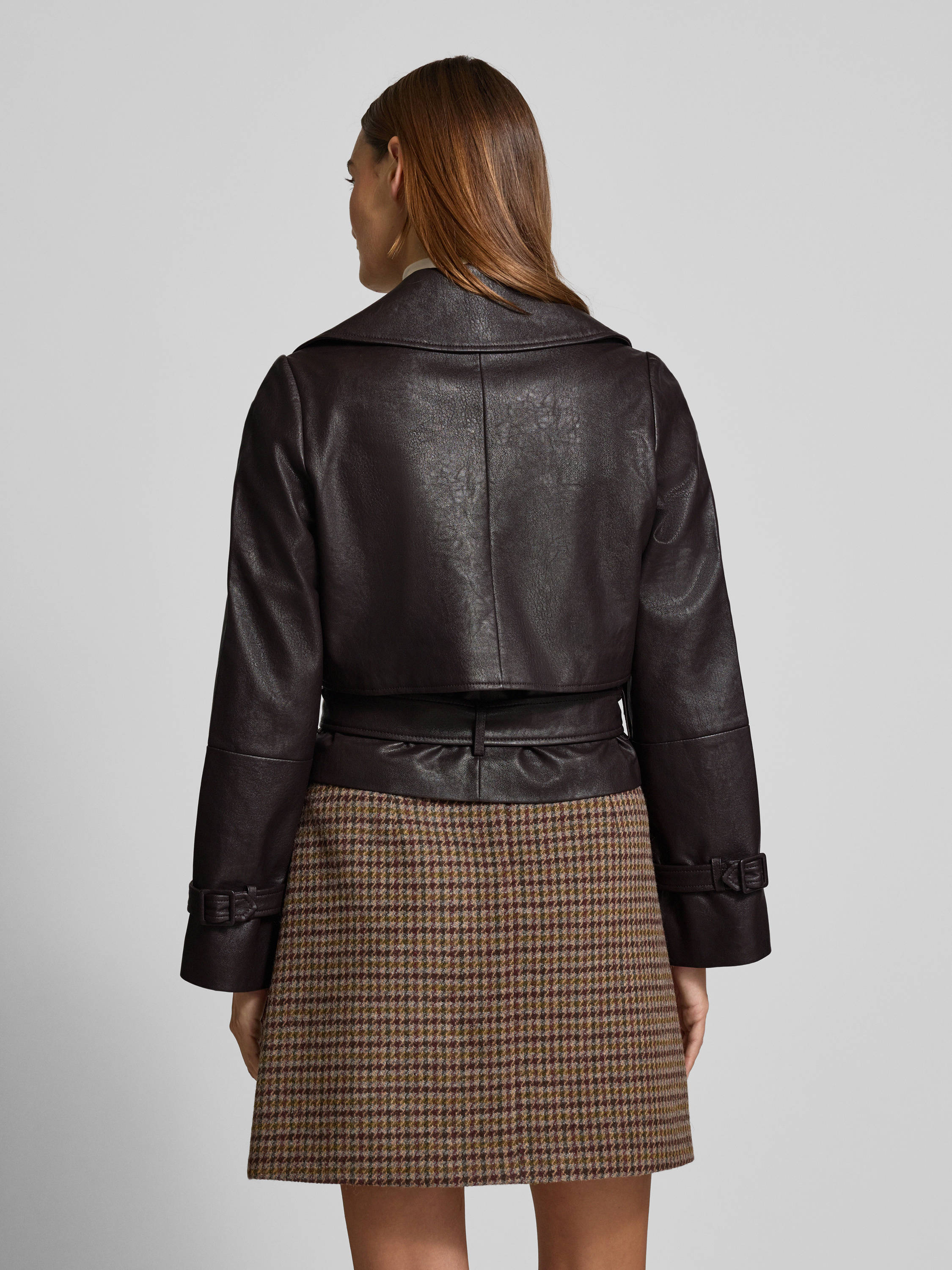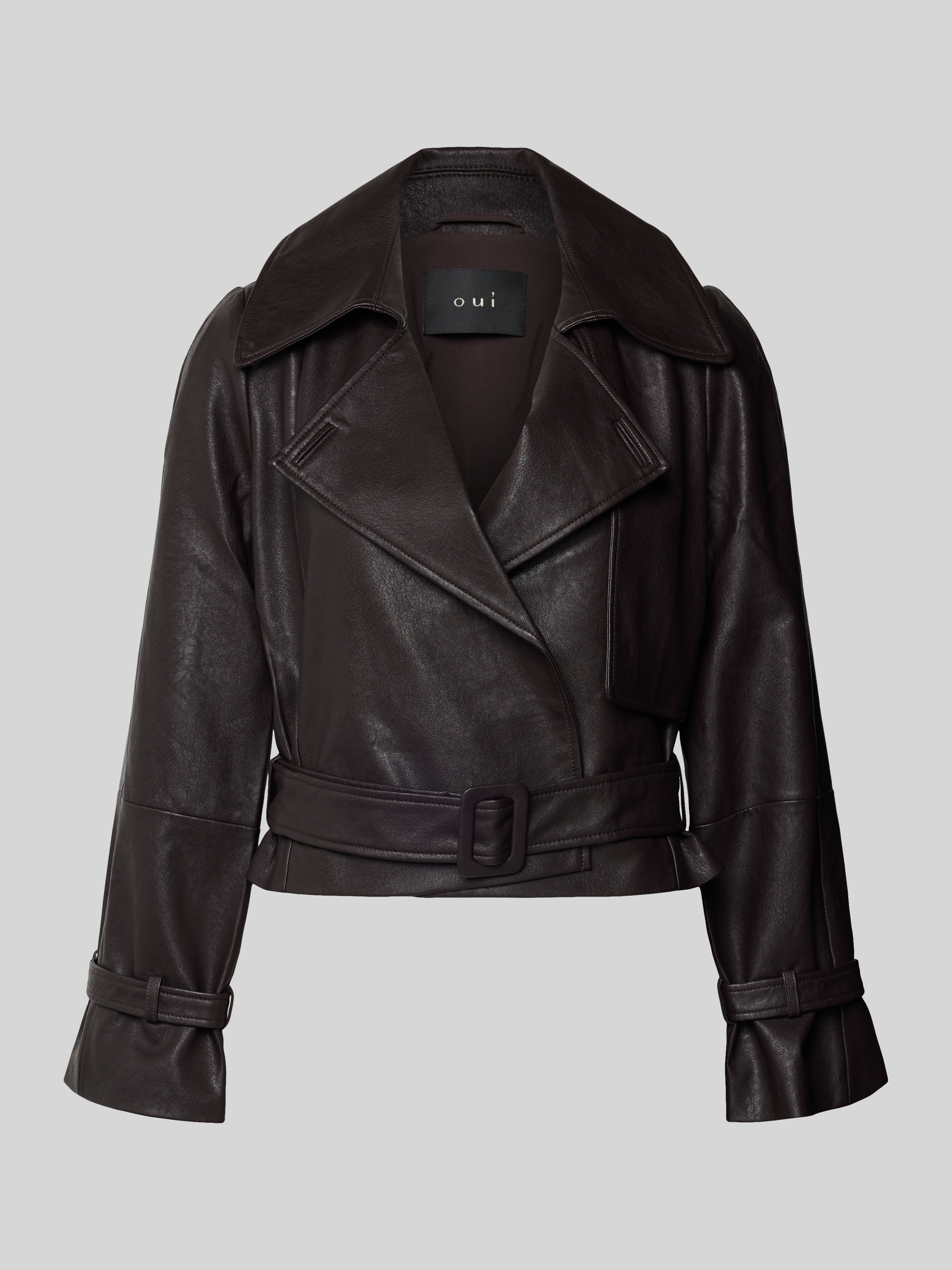 Kurtka z imitacji skóry z kołnierzem z połami i paskiem - ciemnobrązowy