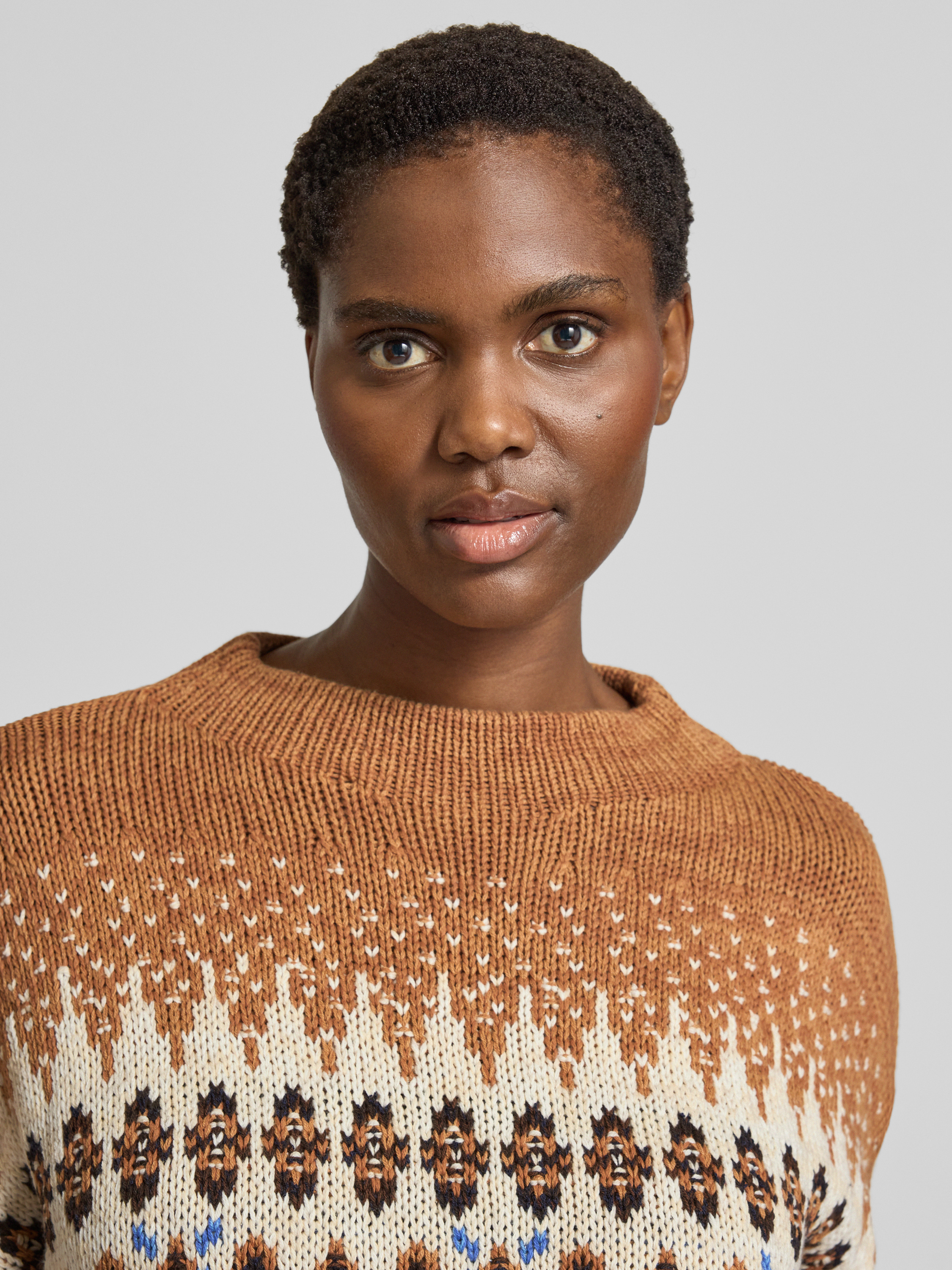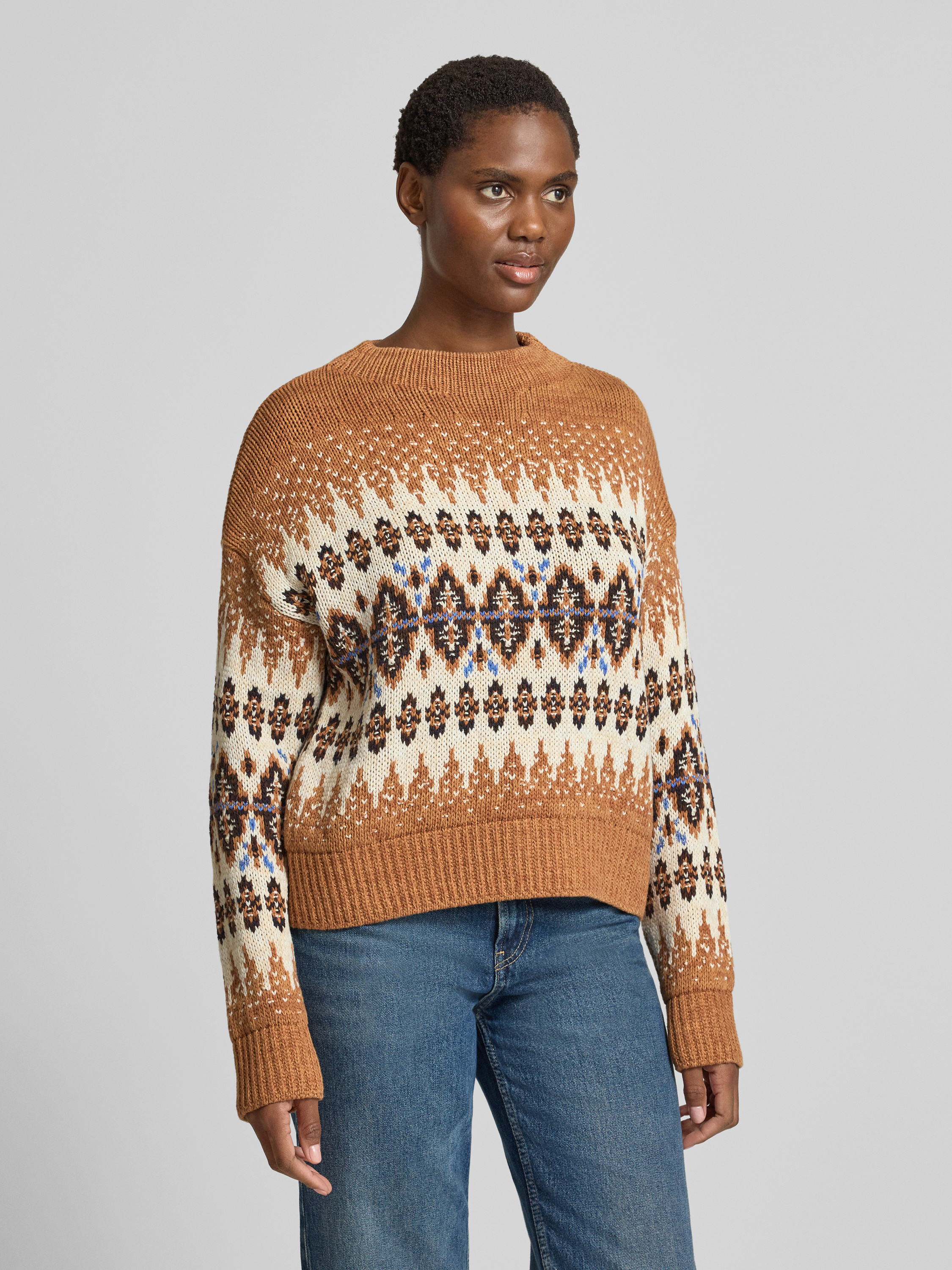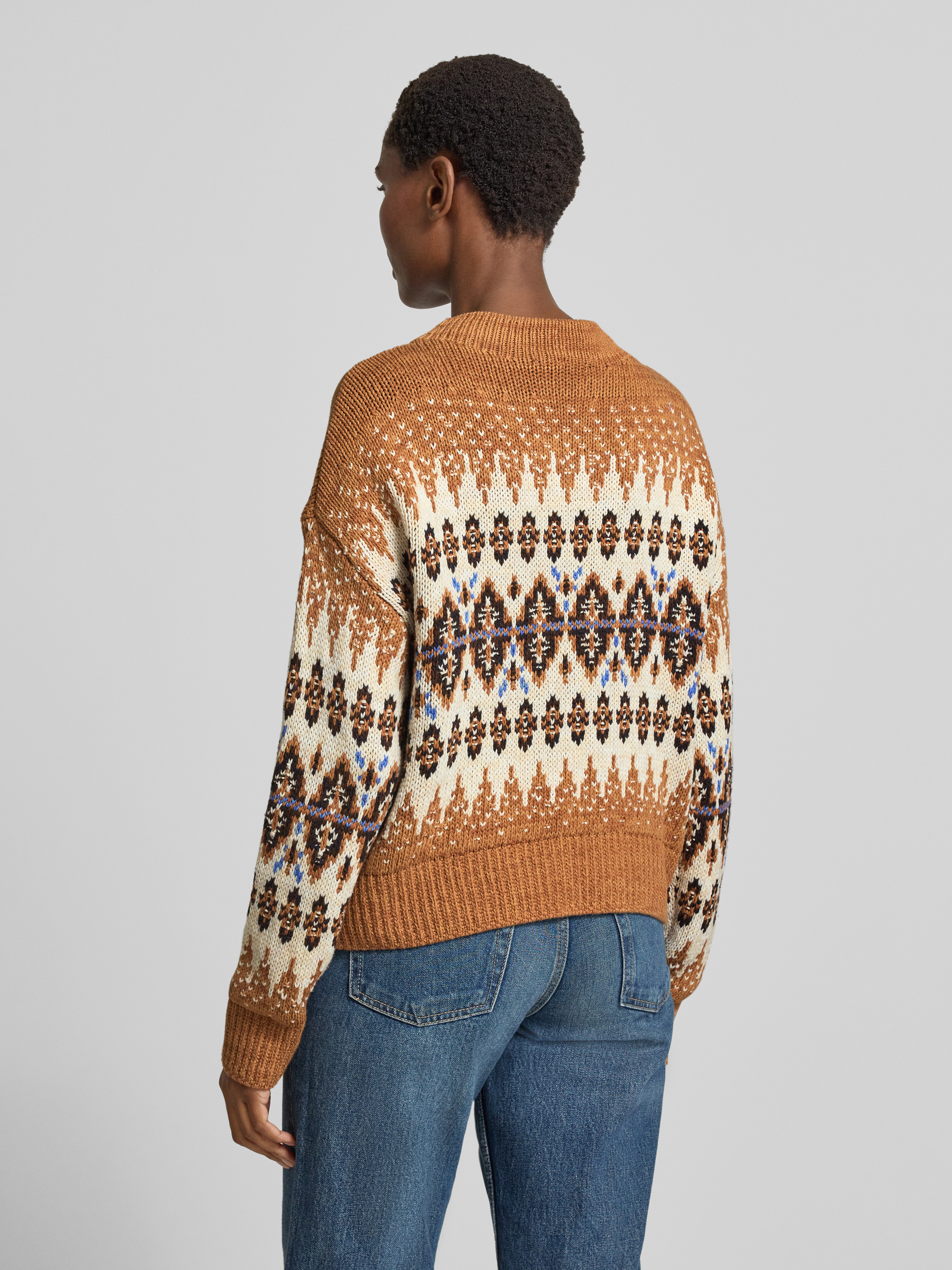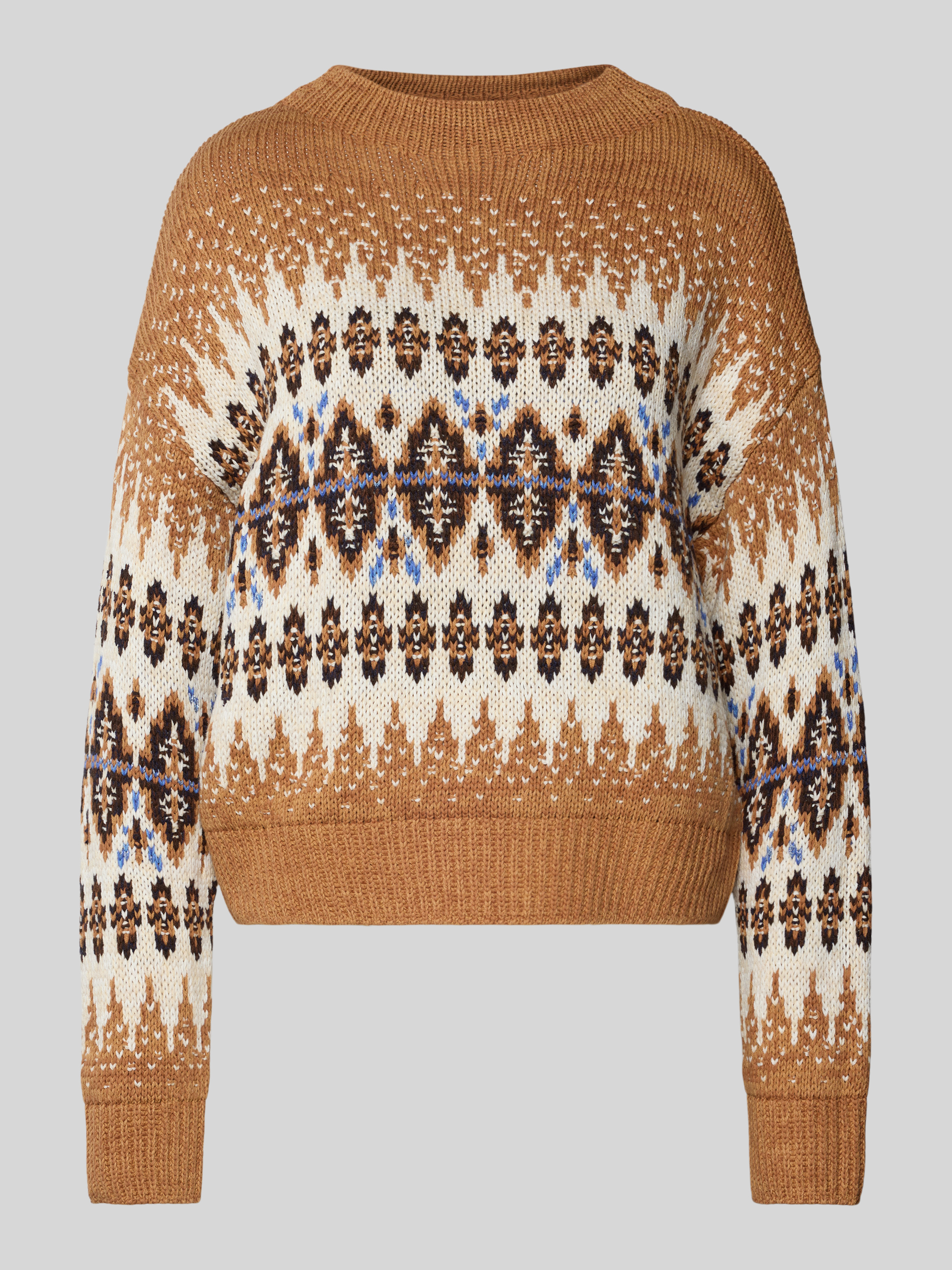 Sweter z norweskim wzorem i okrągłym dekoltem - camel