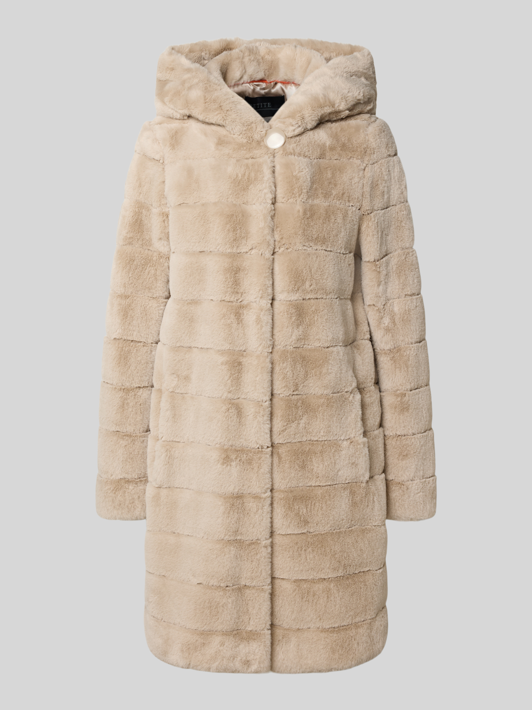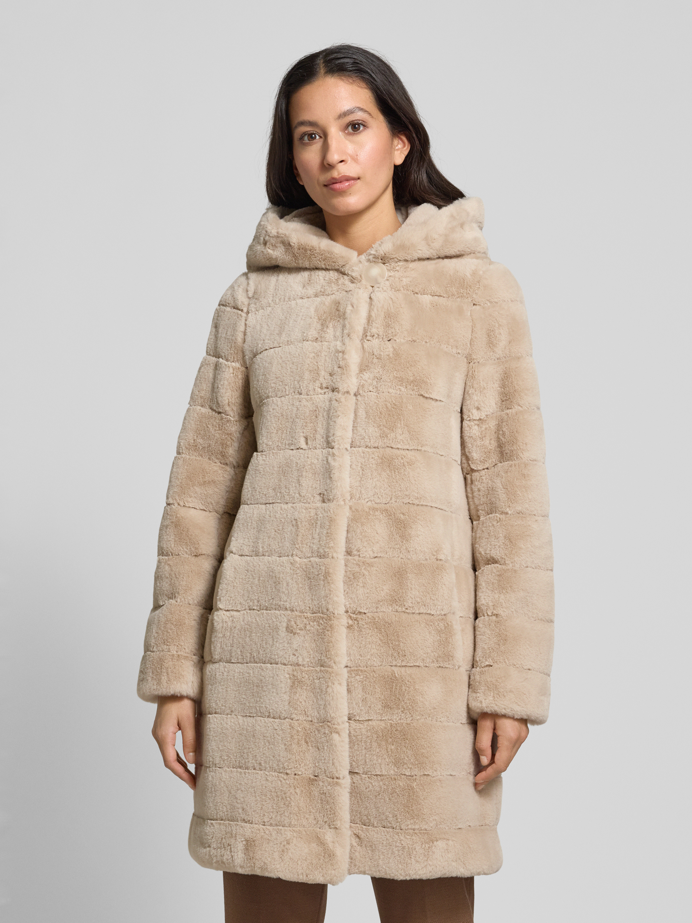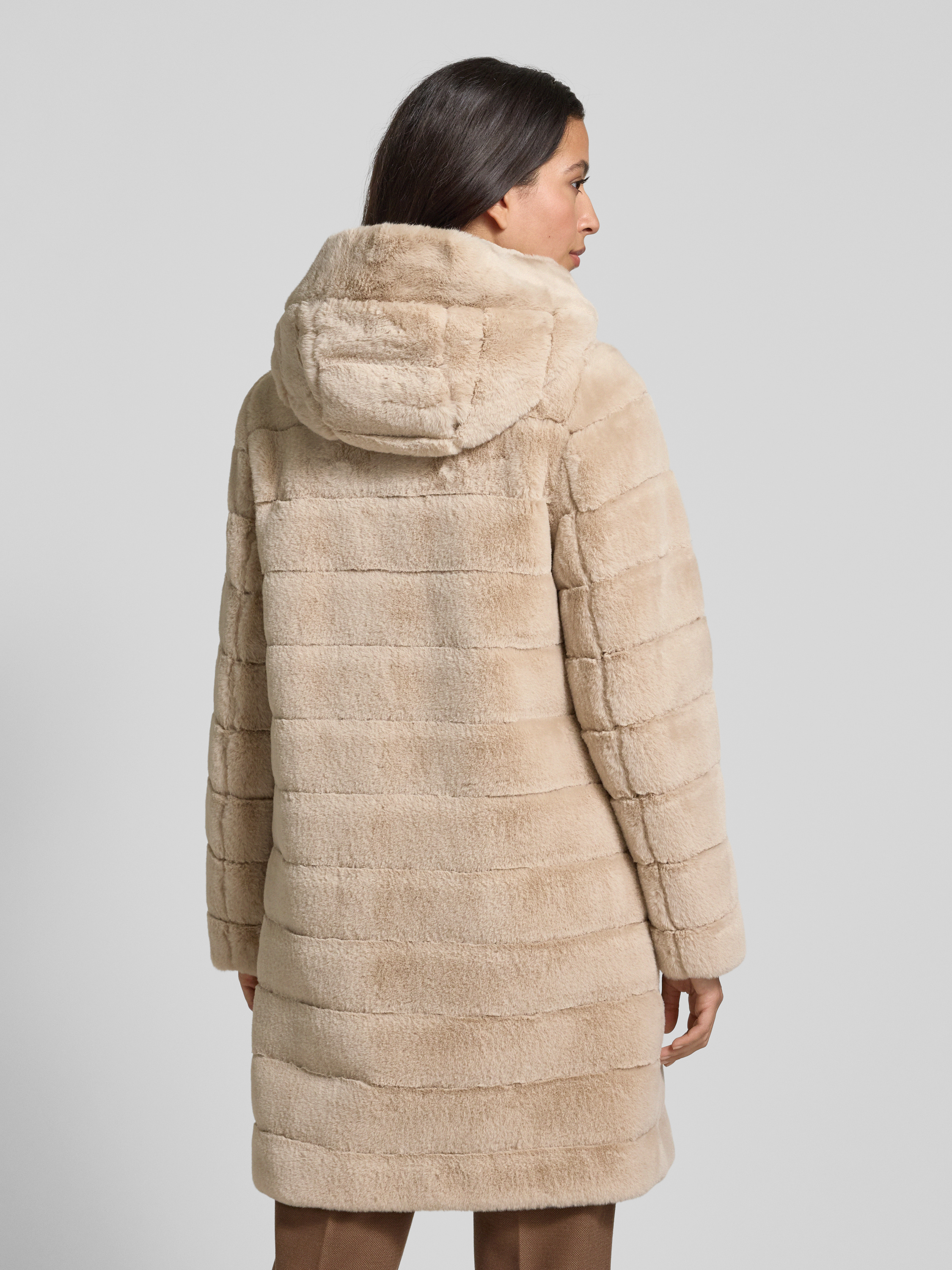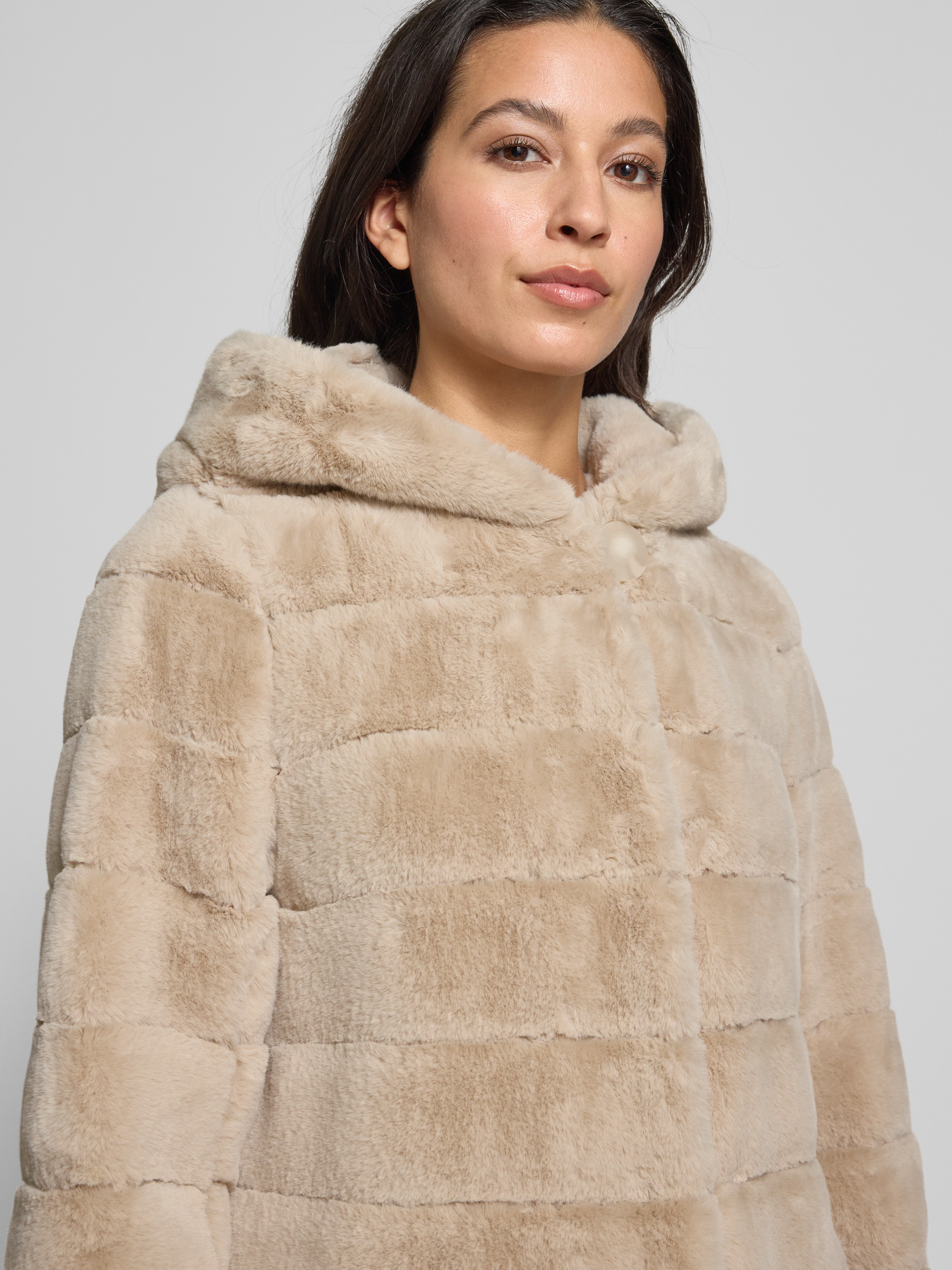 Płaszcz ze sztucznego futra z kapturem i wpuszczanymi kieszeniami - piaskowy