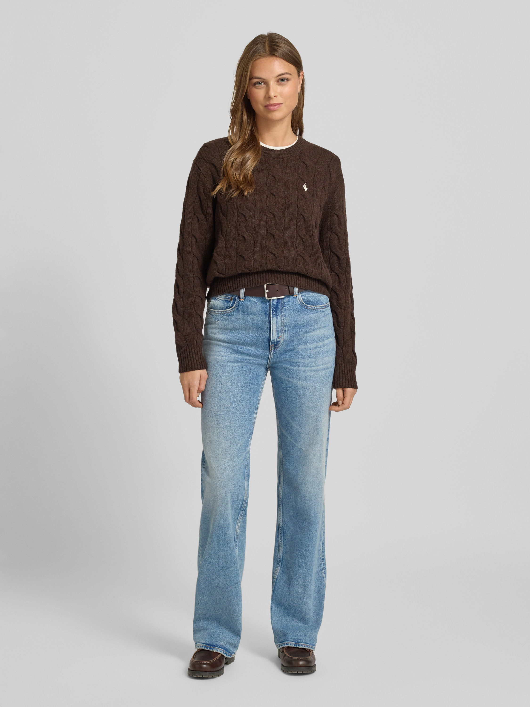 Sweter z dzianiny ze ściegiem warkoczowym i okrągłym dekoltem