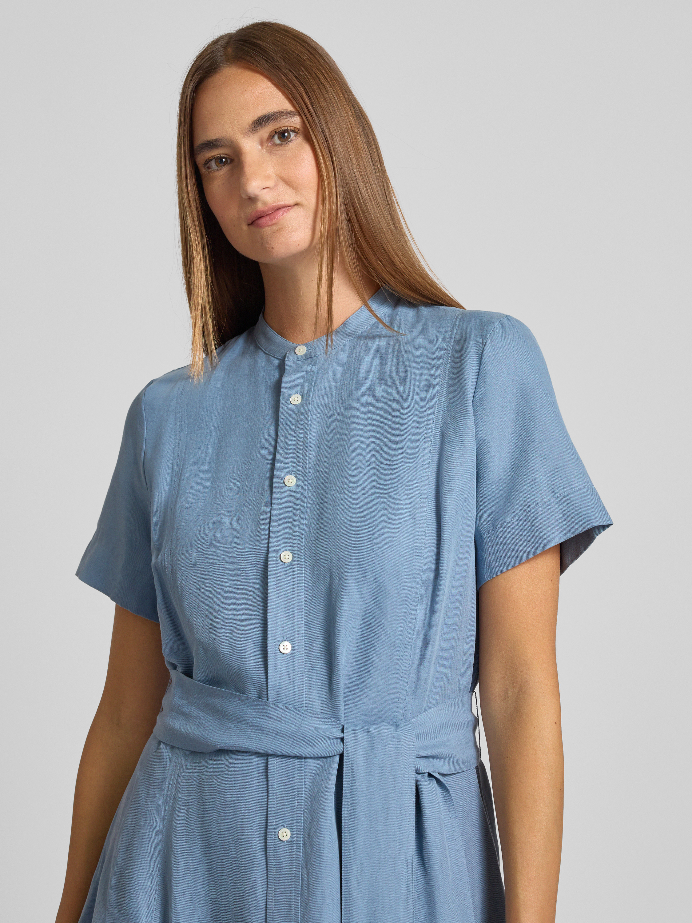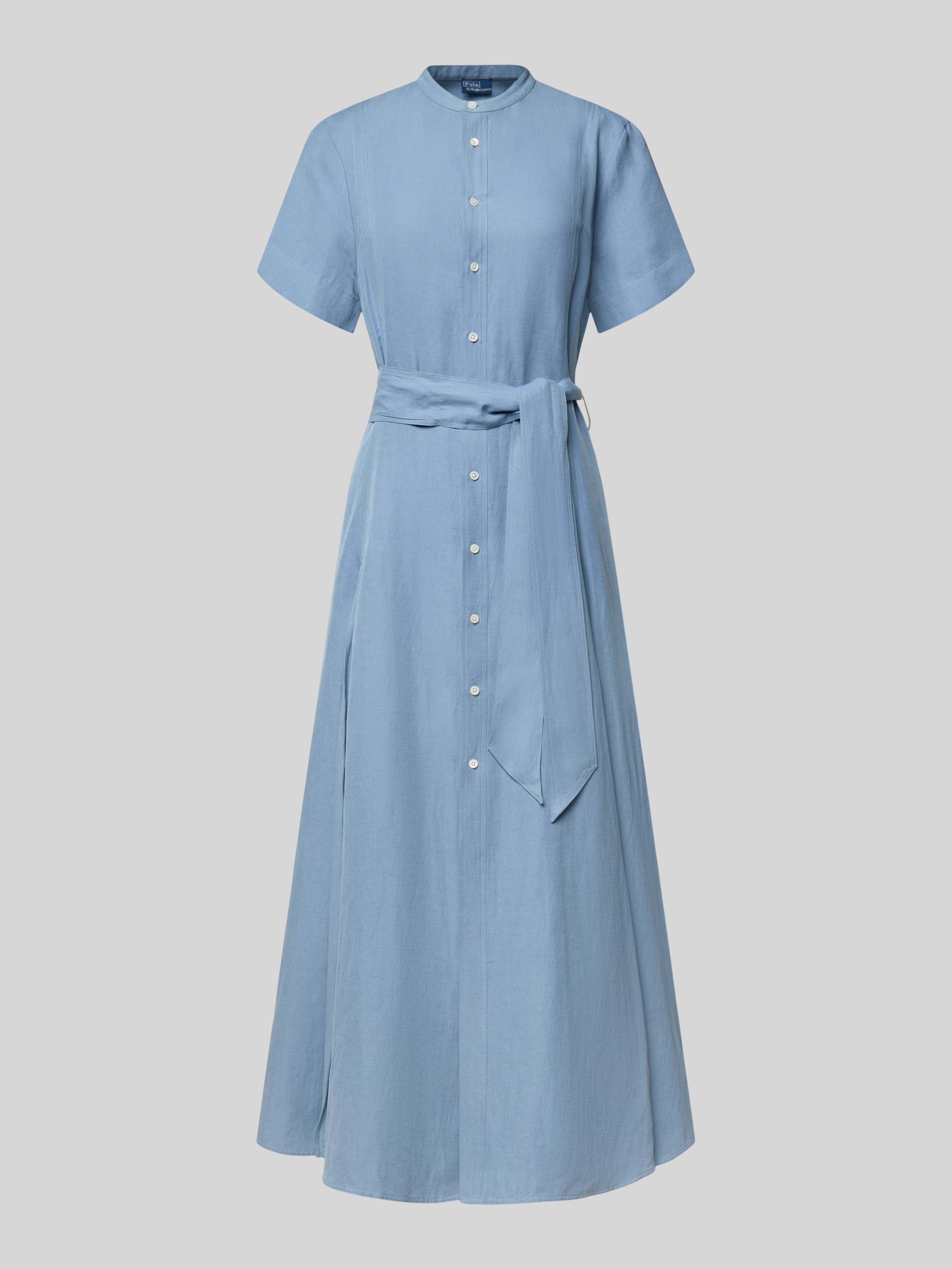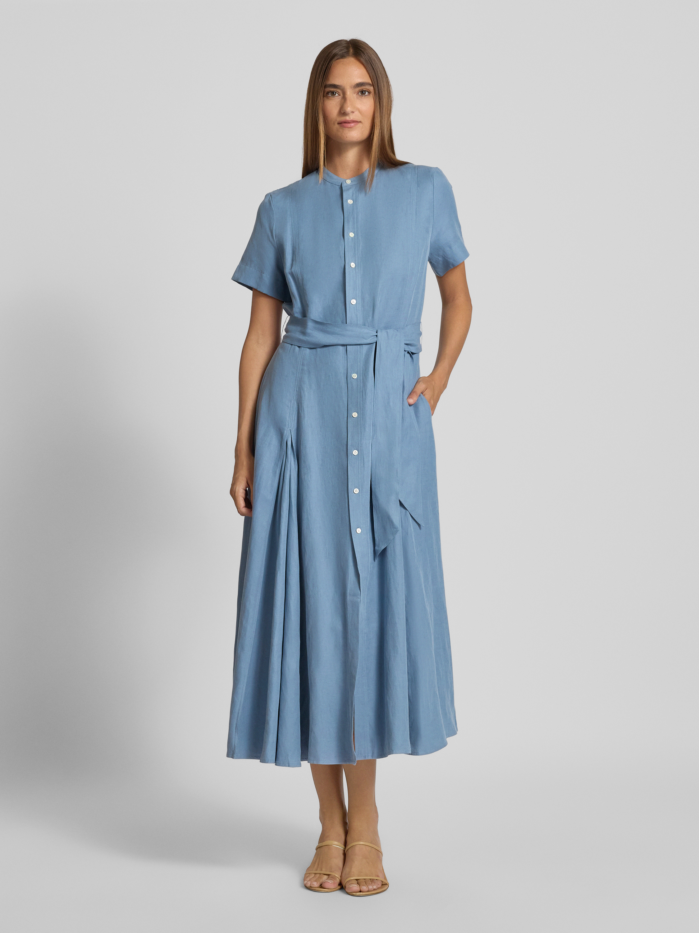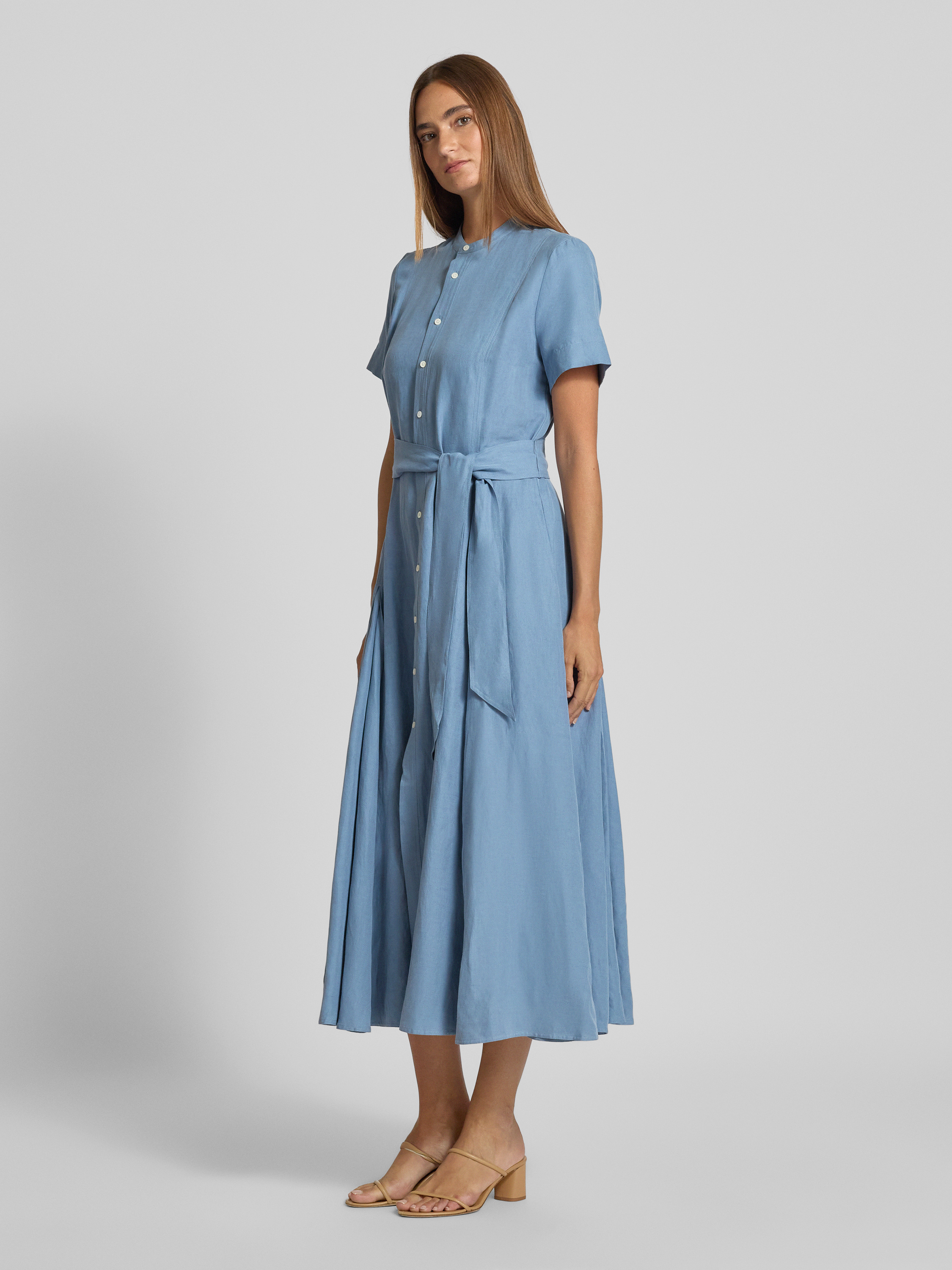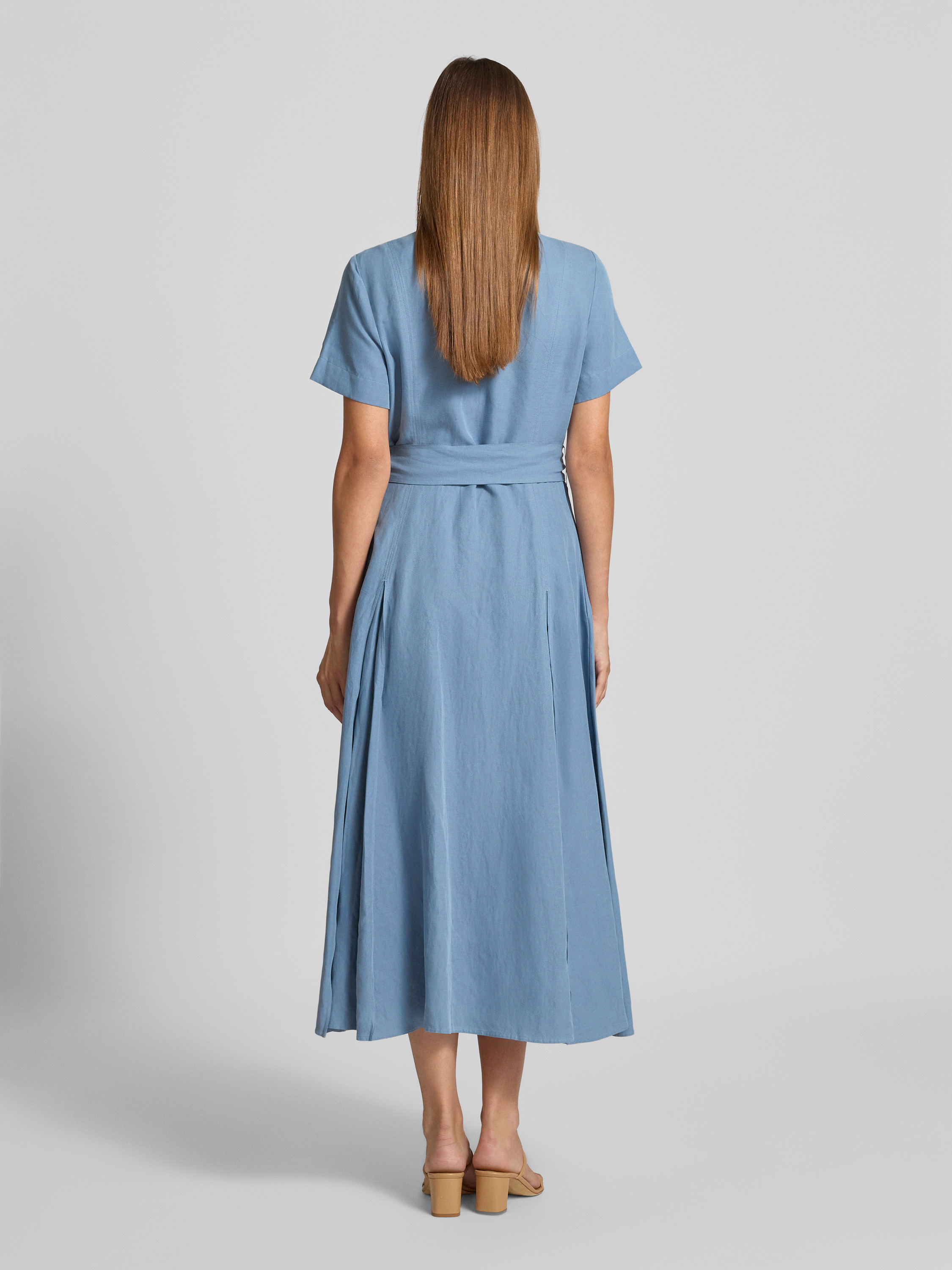 Sukienka midi taliowana z mieszanki jedwabiu i lnu z dodatkiem bawełny - błękitny