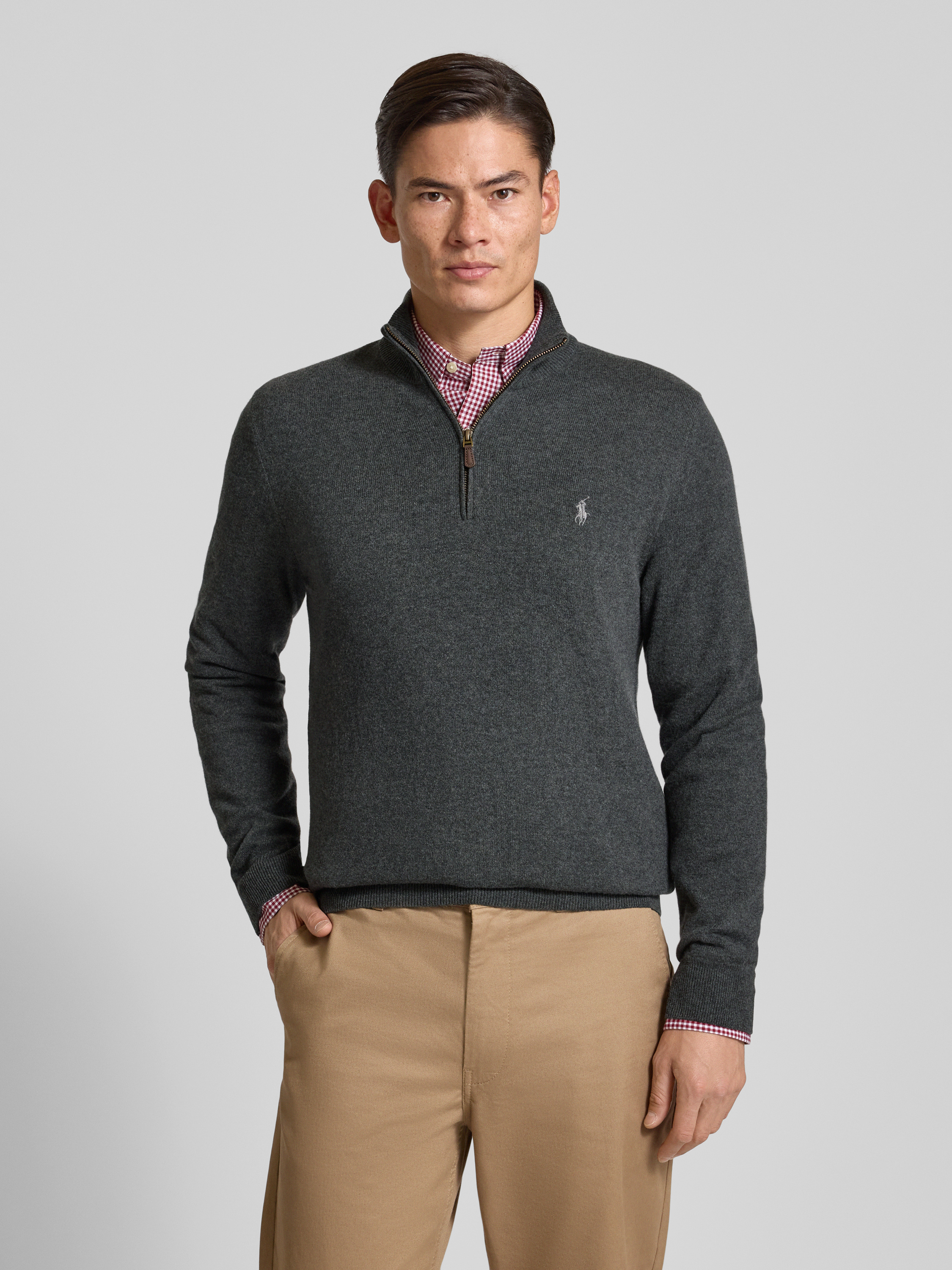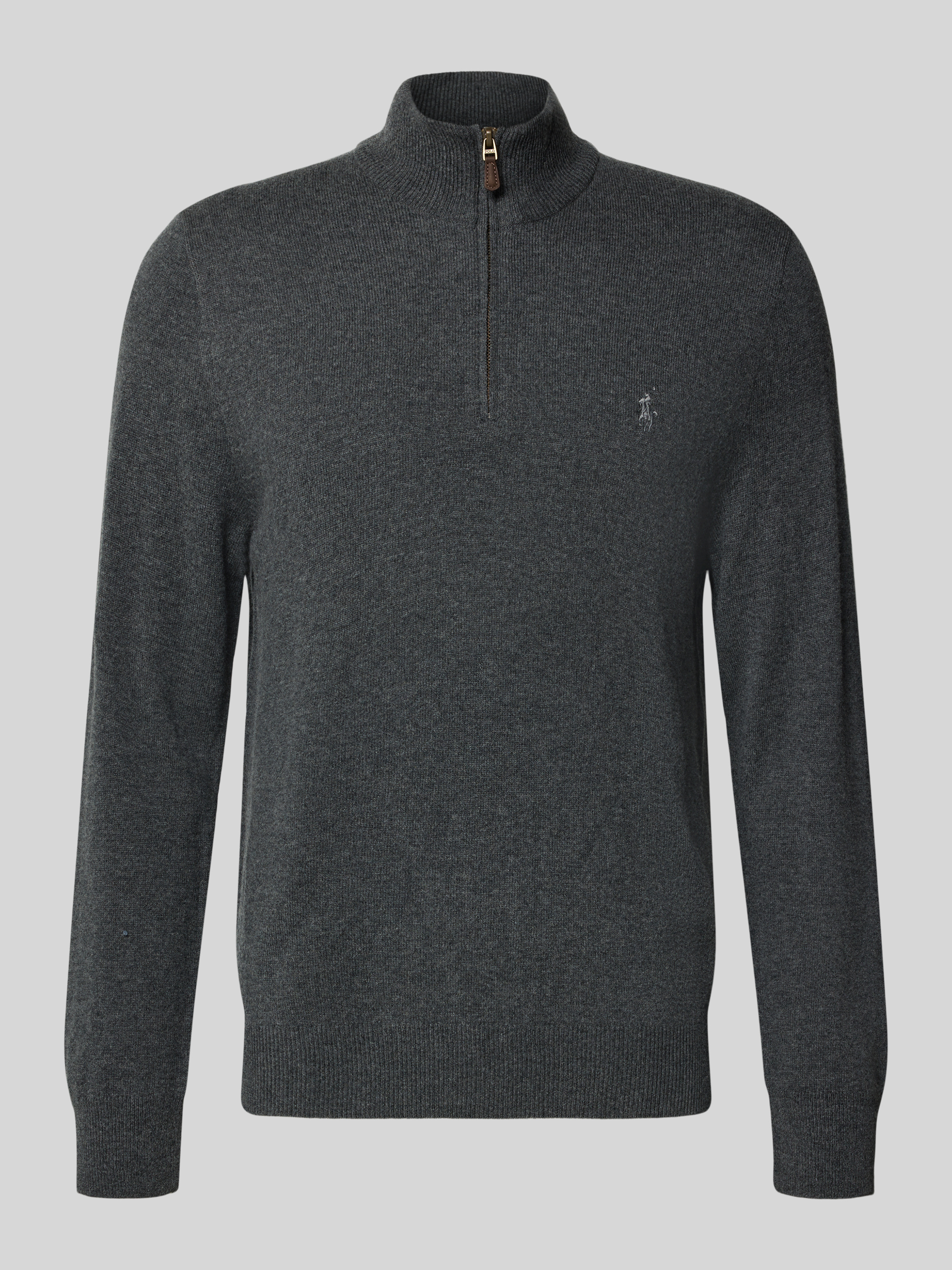 Sweter z dzianiny z wełny ze stójką i zamkiem błyskawicznym - ciemnobrązowy