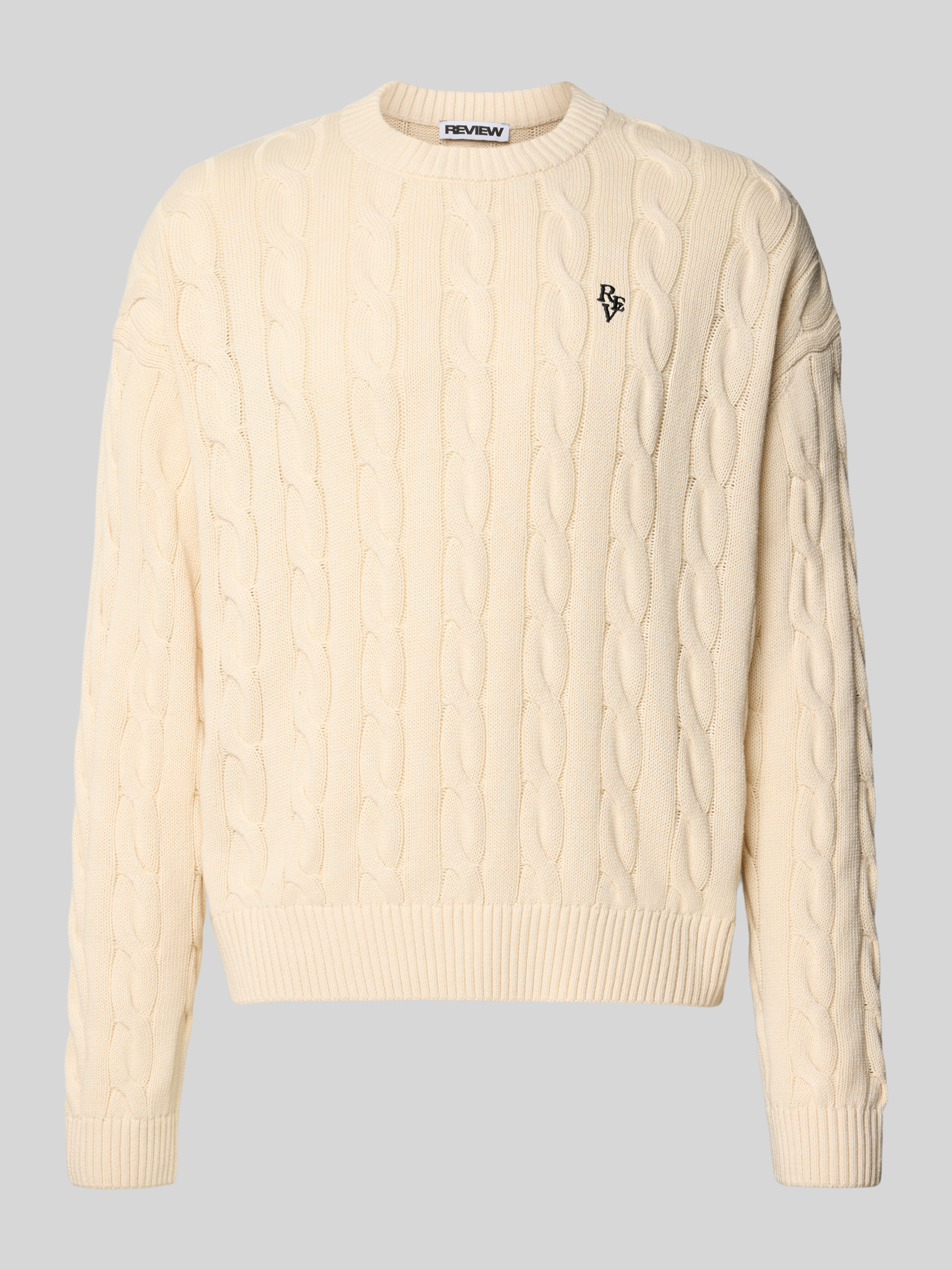 Sweter z dzianiny ze ściegiem warkoczowym i wyhaftowanym logo - écru