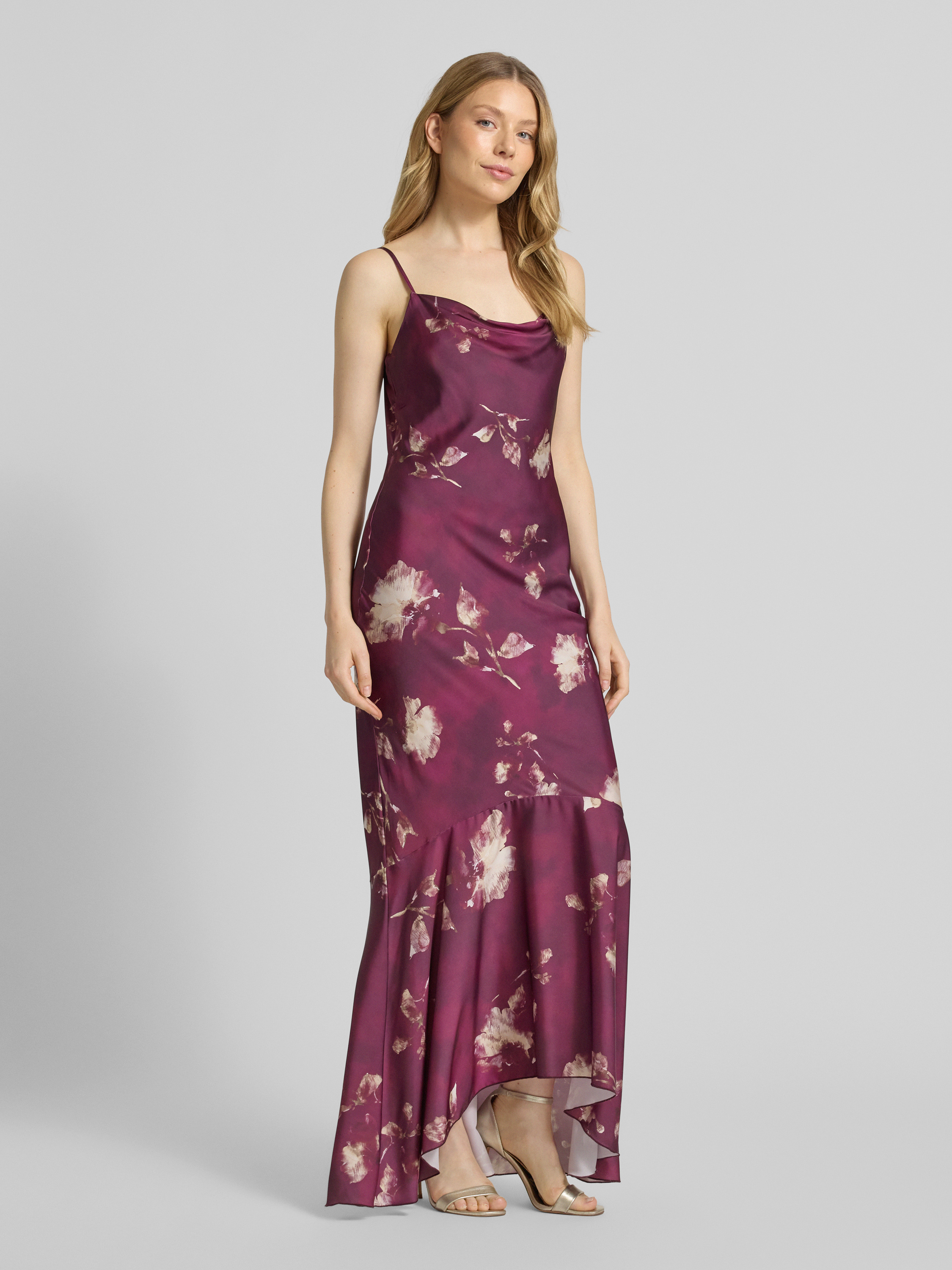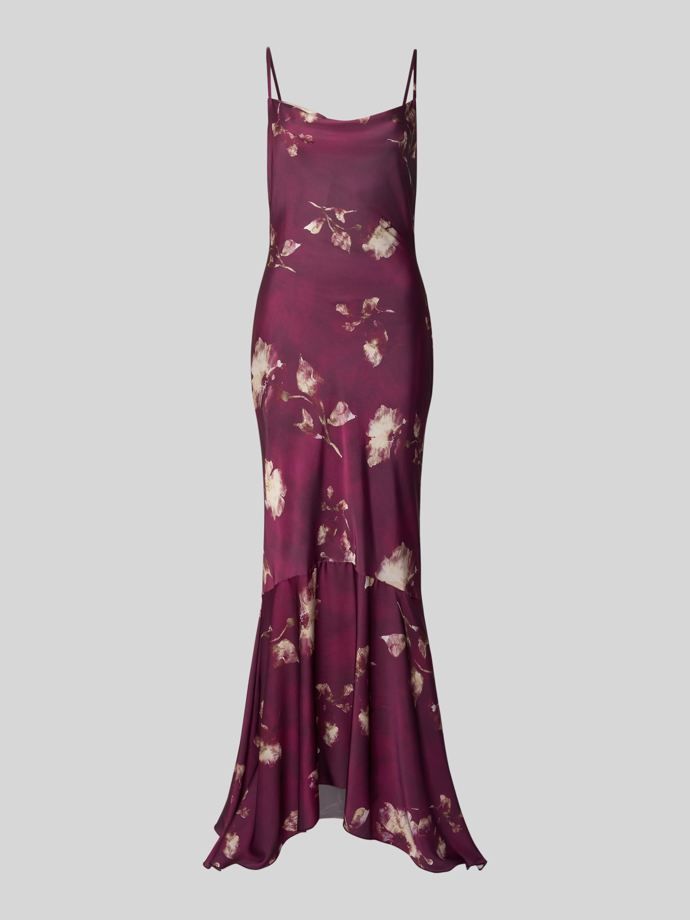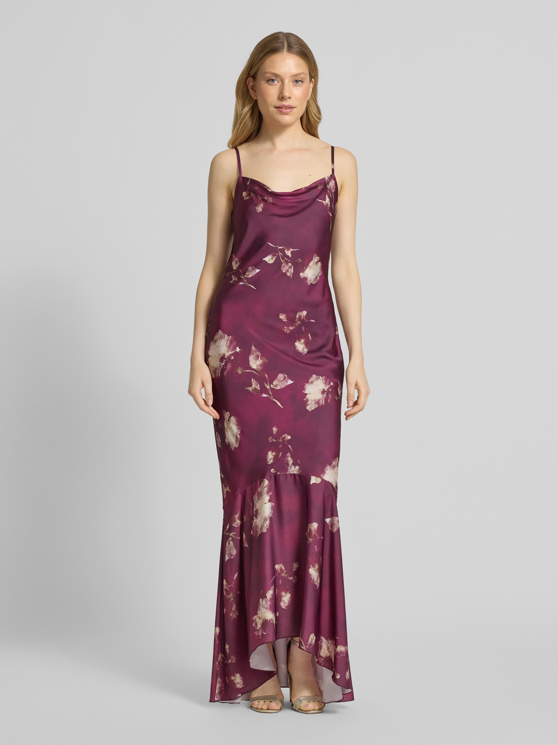 Sukienka wieczorowa z cienkimi ramiączkami i kwiatowym nadrukiem na całej powierzchni - bordowy