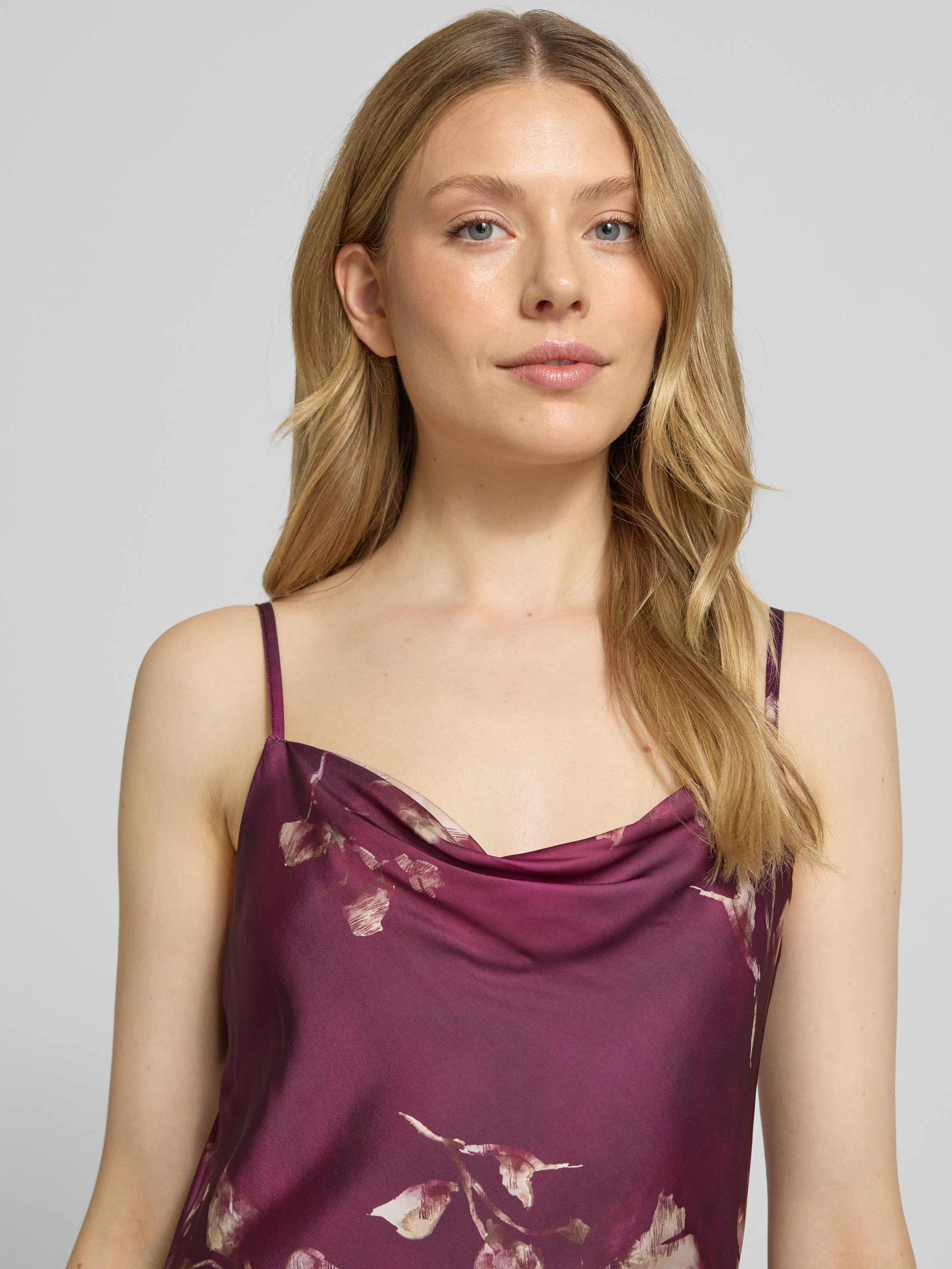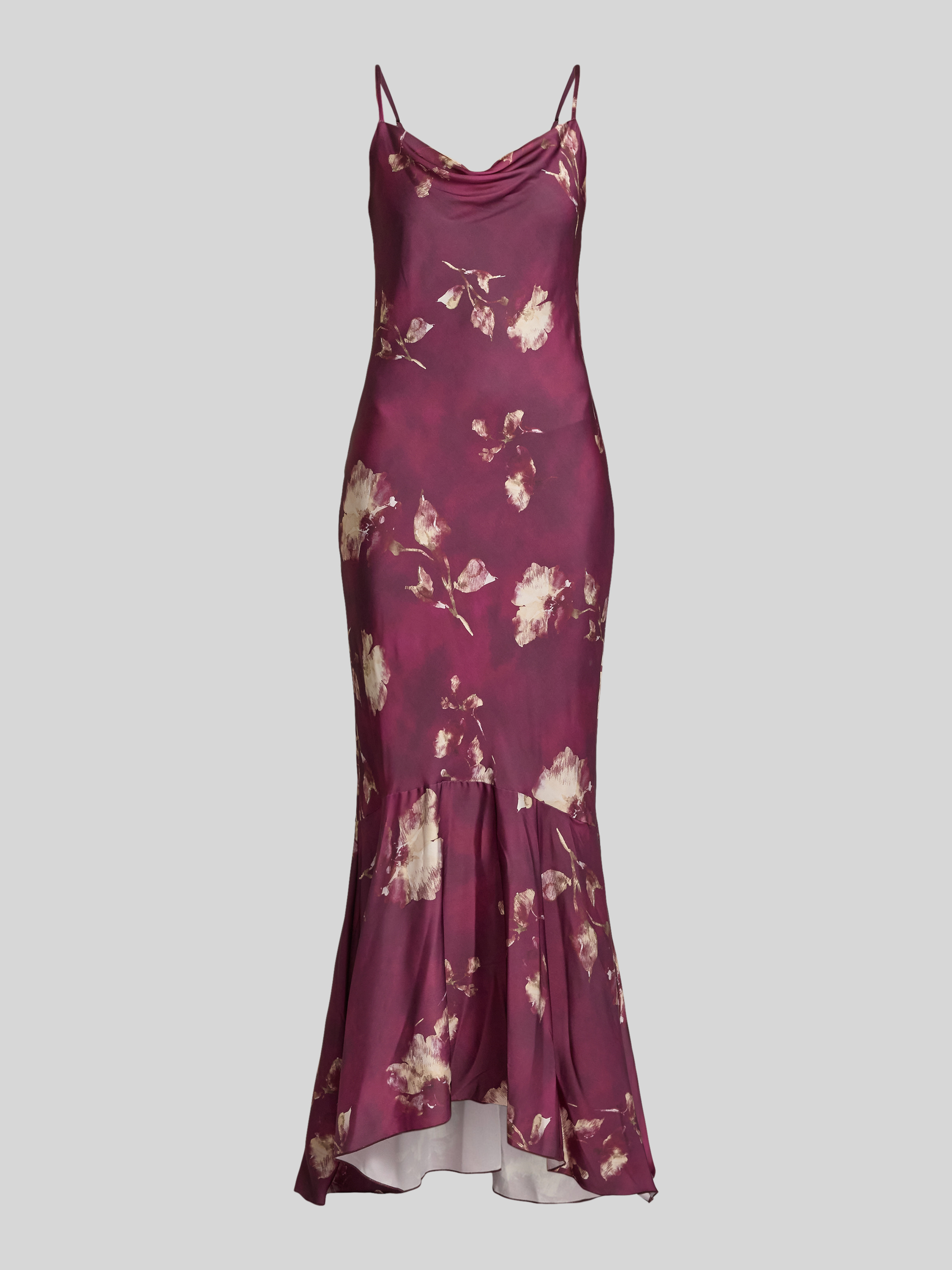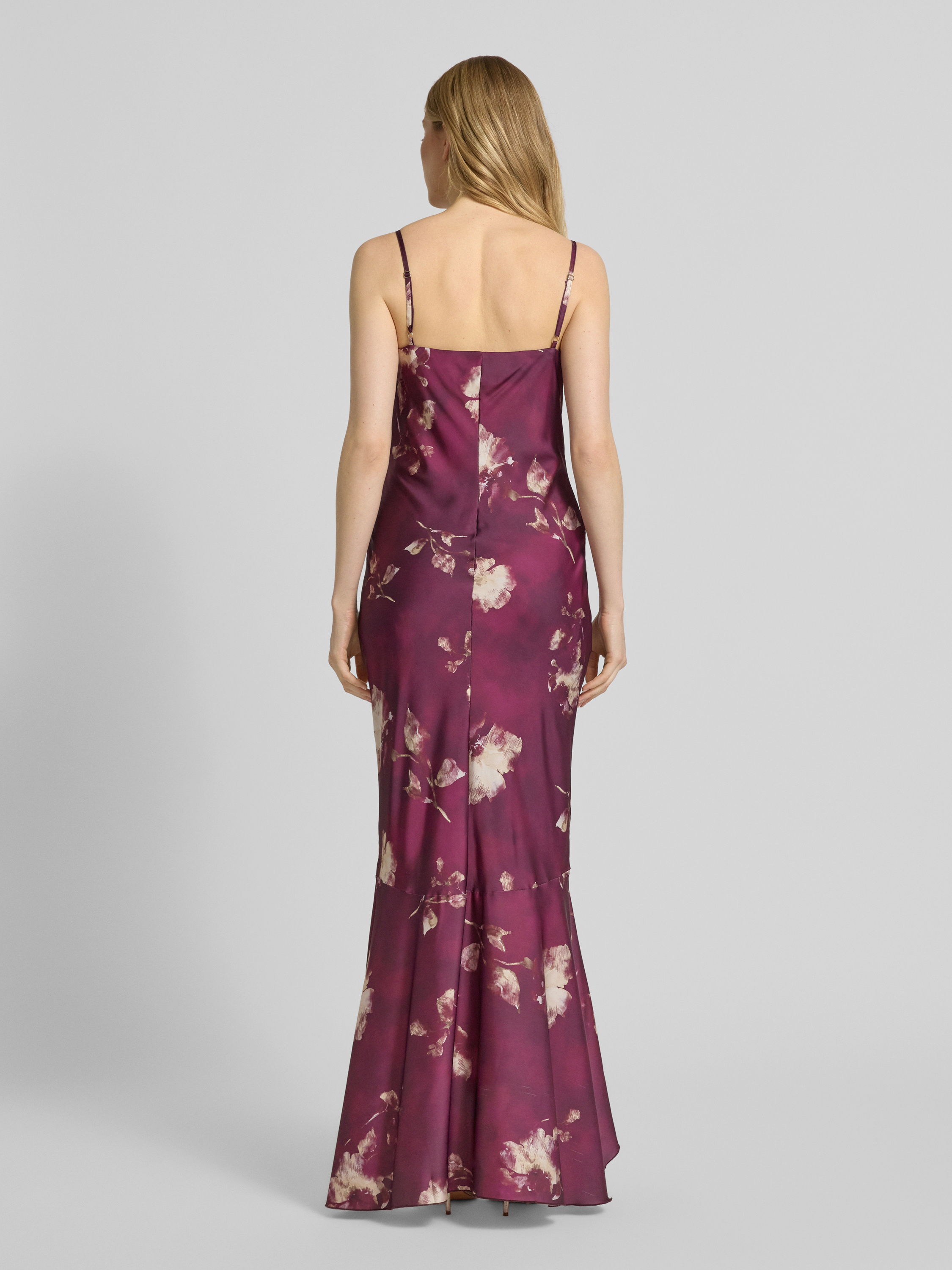 Sukienka wieczorowa z cienkimi ramiączkami i kwiatowym nadrukiem na całej powierzchni - bordowy