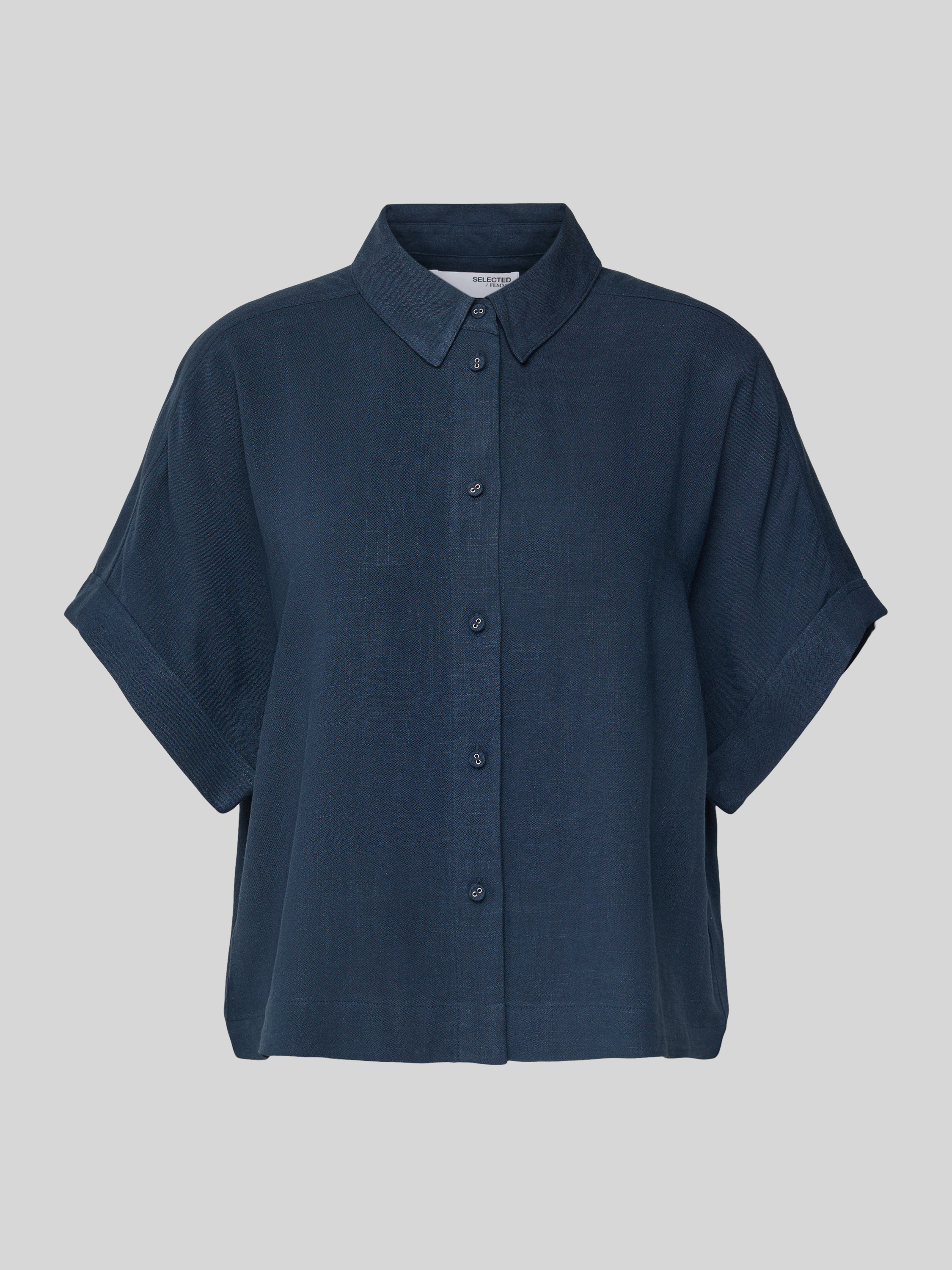 Bluzka o kroju relaxed fit z mieszanki wiskozy i lnu model ‘VIVA’ - ciemnoniebieski