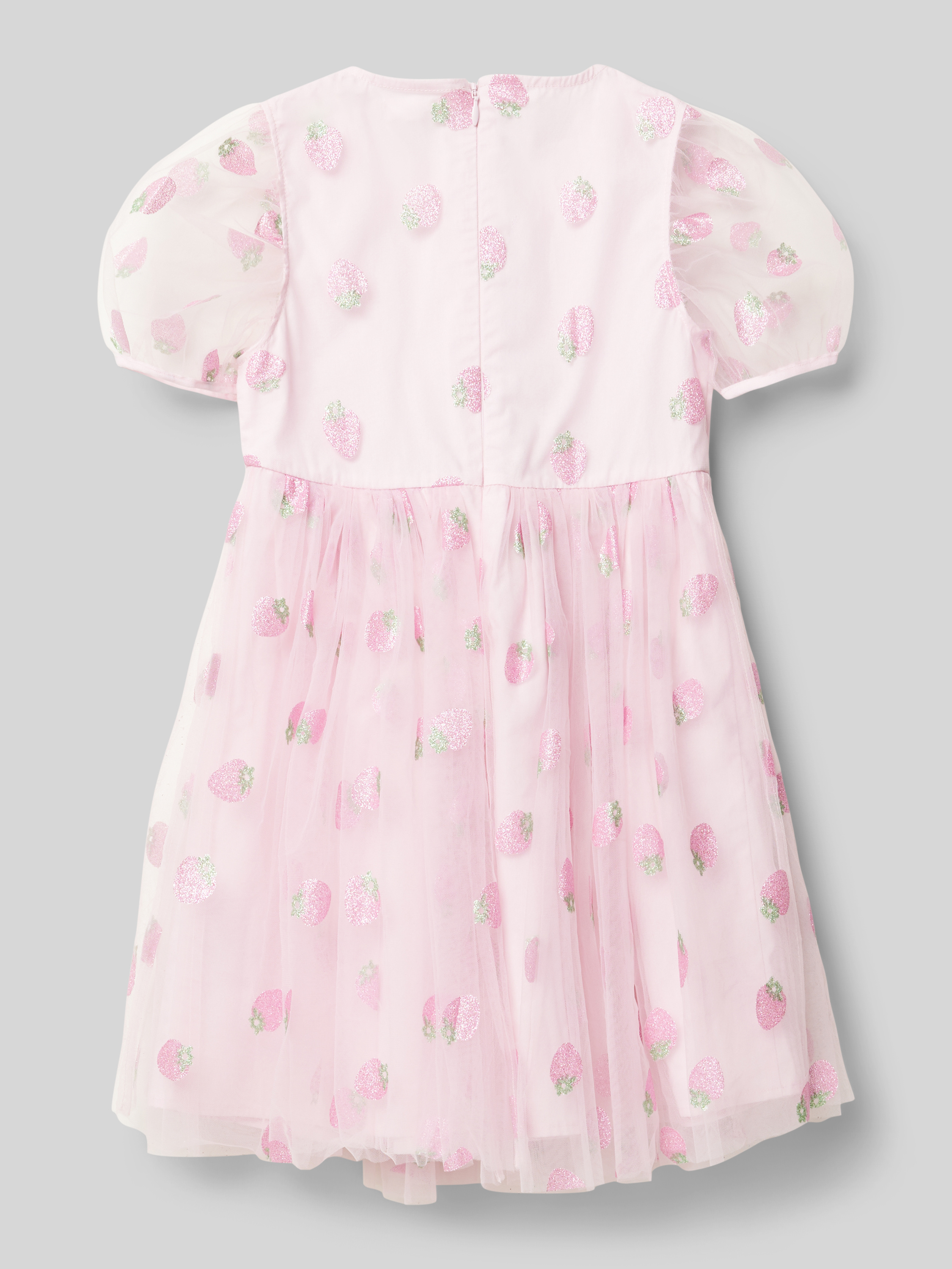 Sukienka siateczkowa rozkloszowana z błyszczącym nadrukiem i bufiastymi rękawami - jasnoróżowy