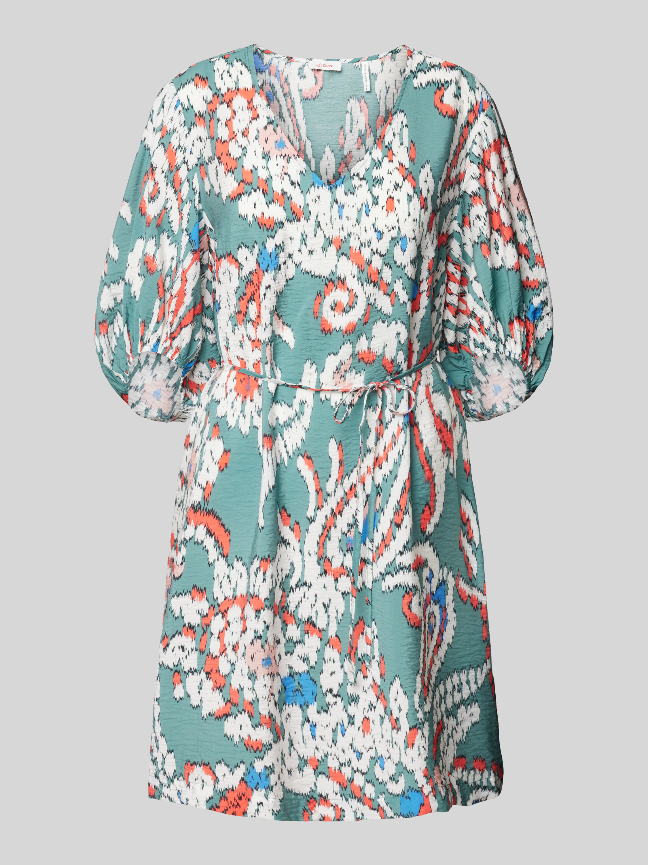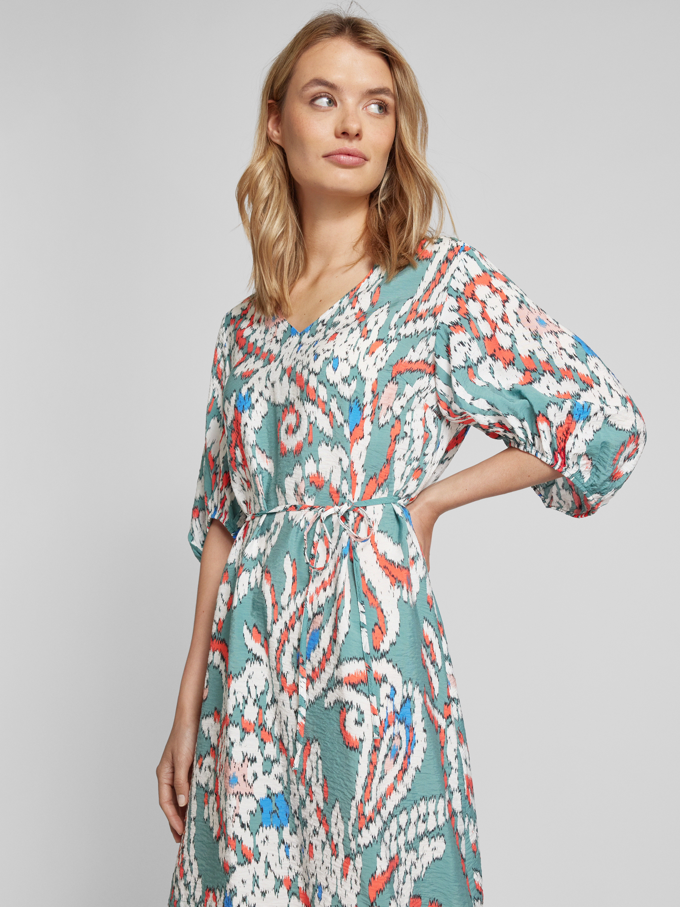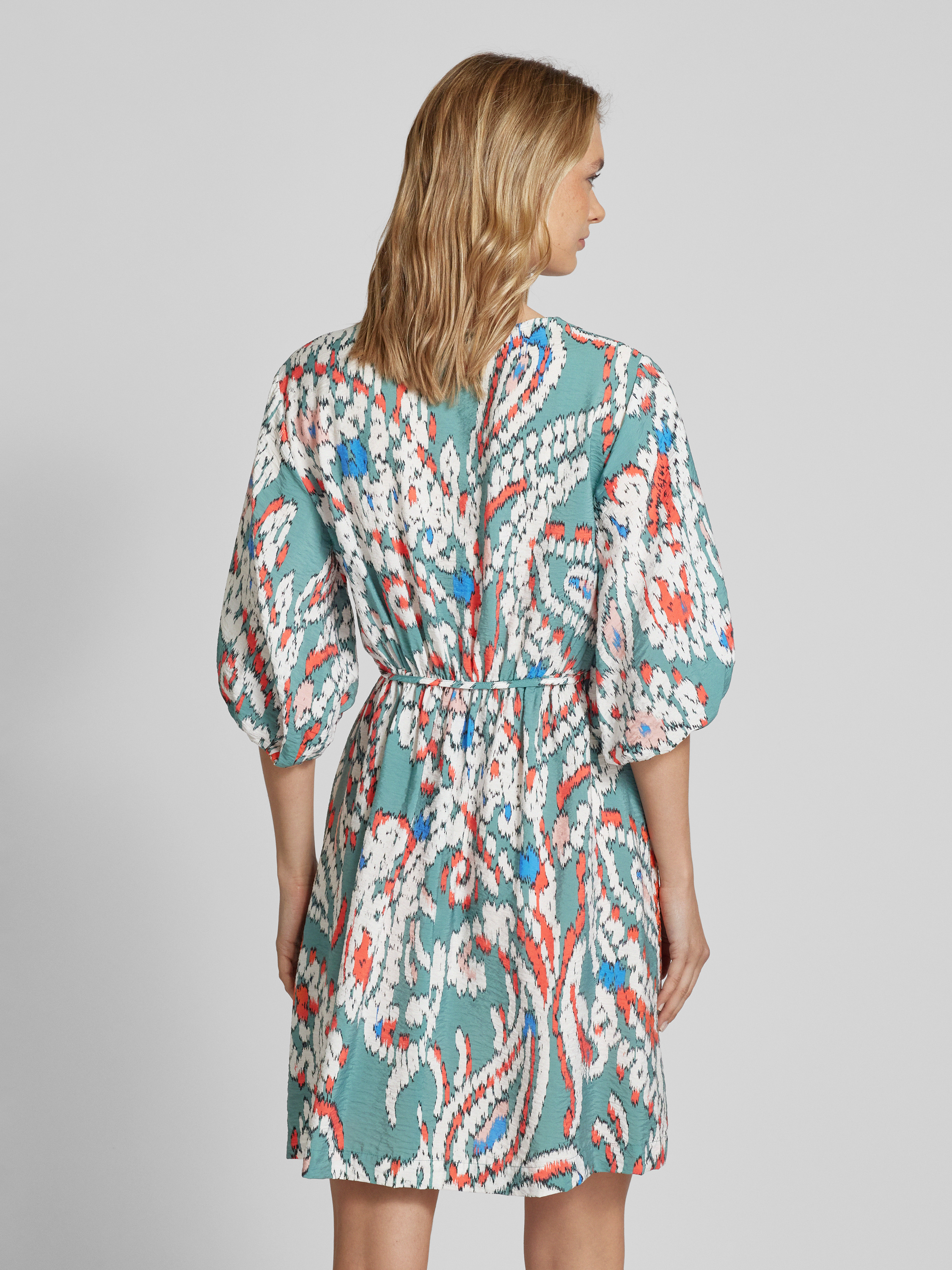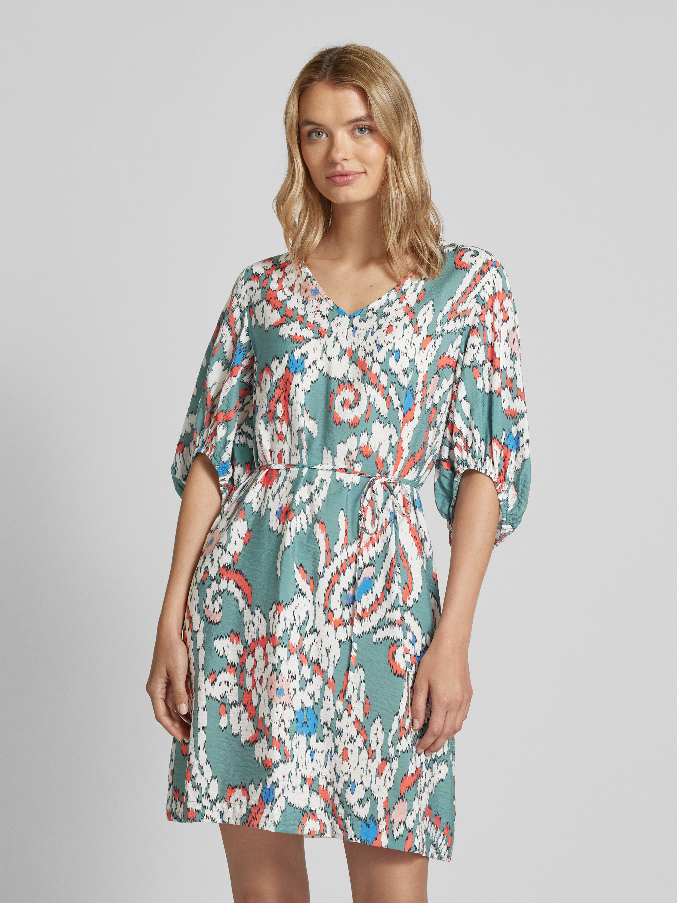 Sukienka tunikowa z wiązanym paskiem i wzorem na całej powierzchni - butelkowy zielony