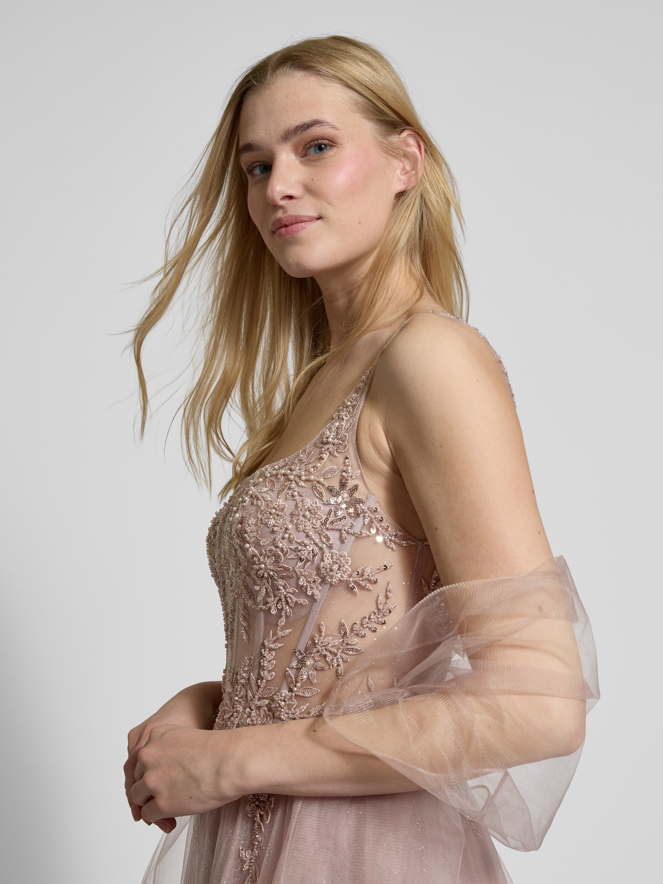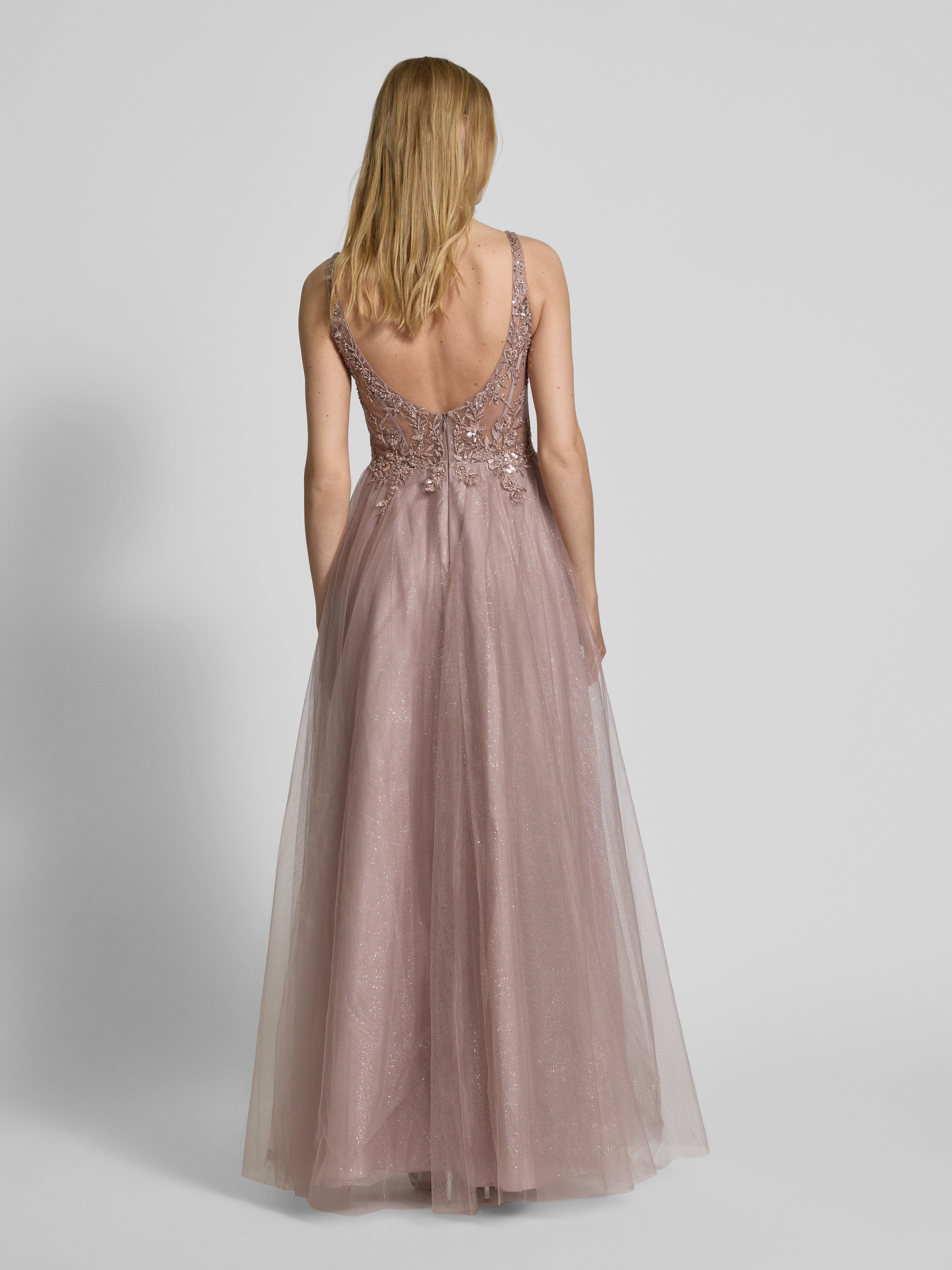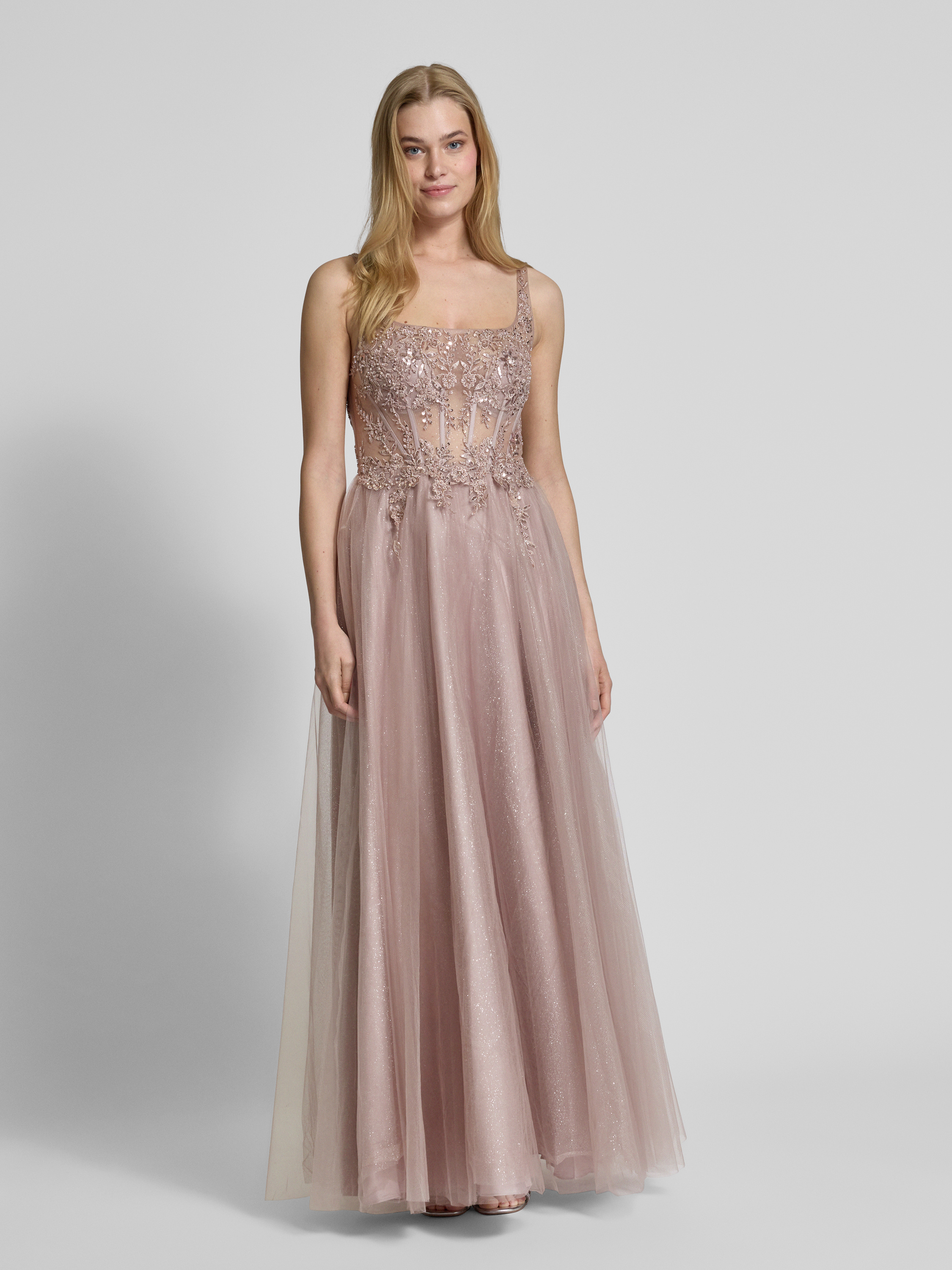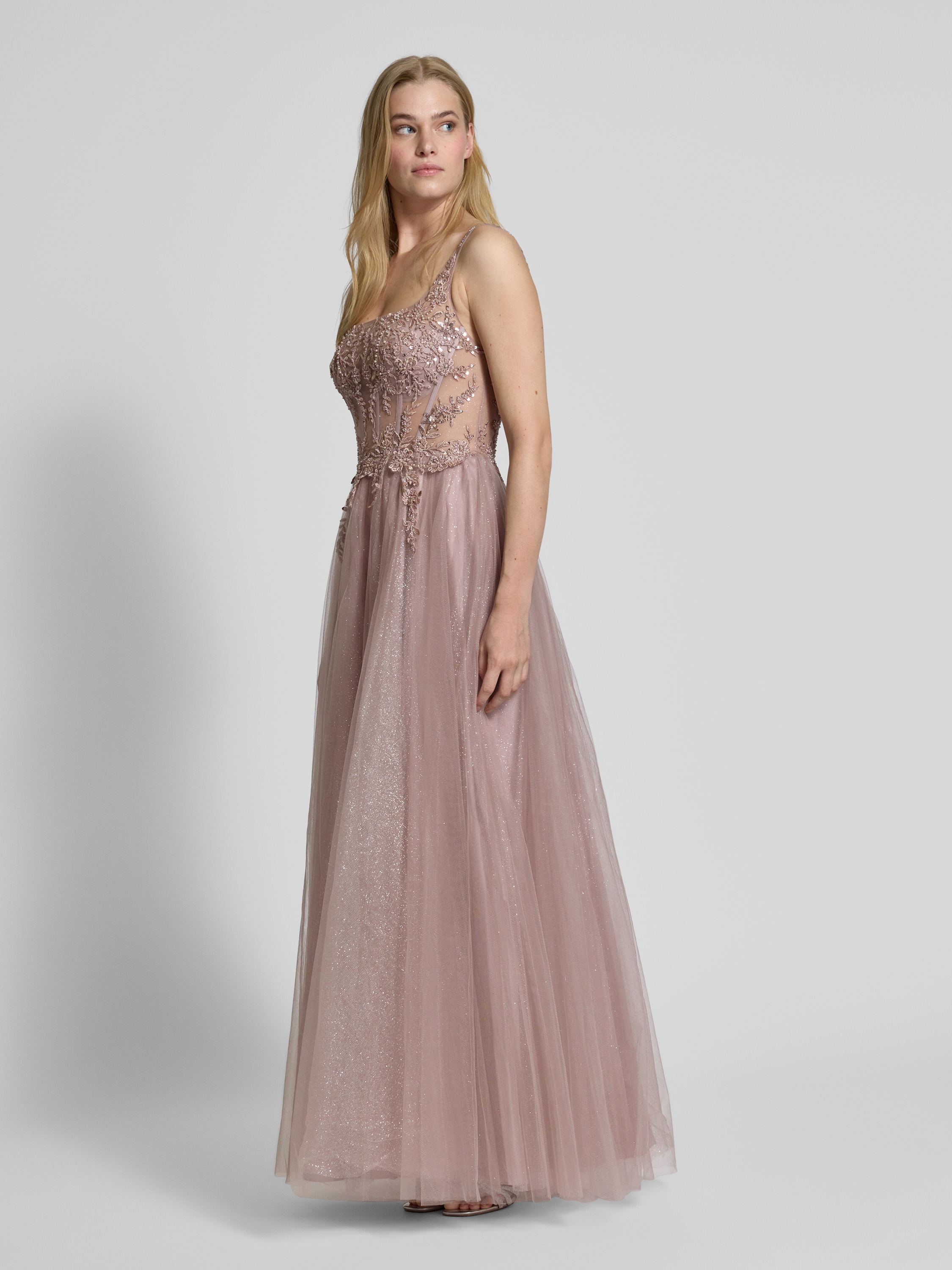 Sukienka wieczorowa z koronkowym obszyciem - różowawy